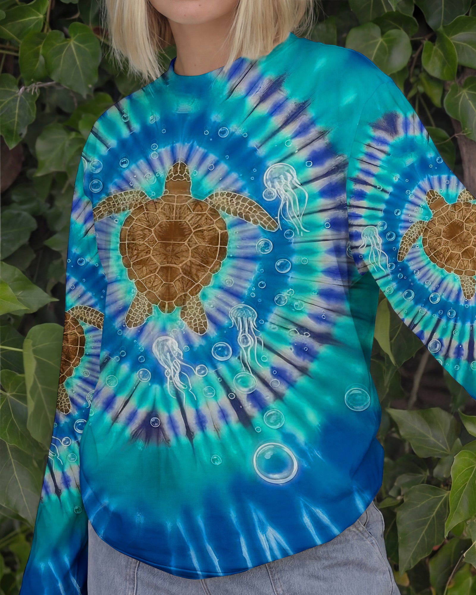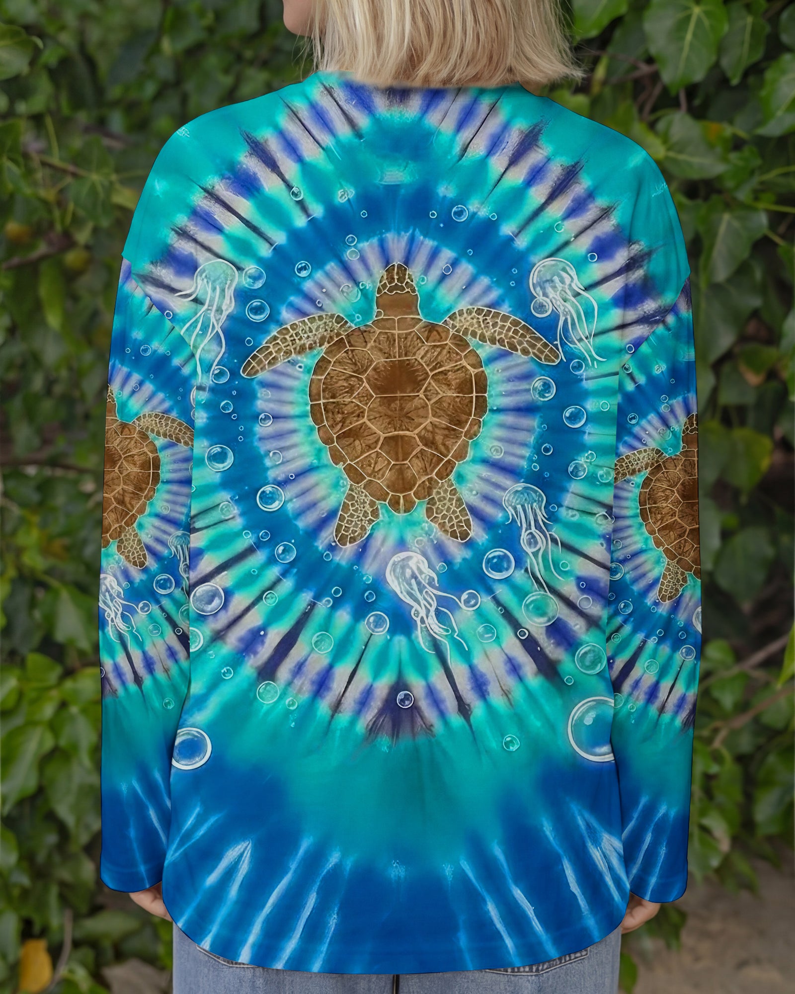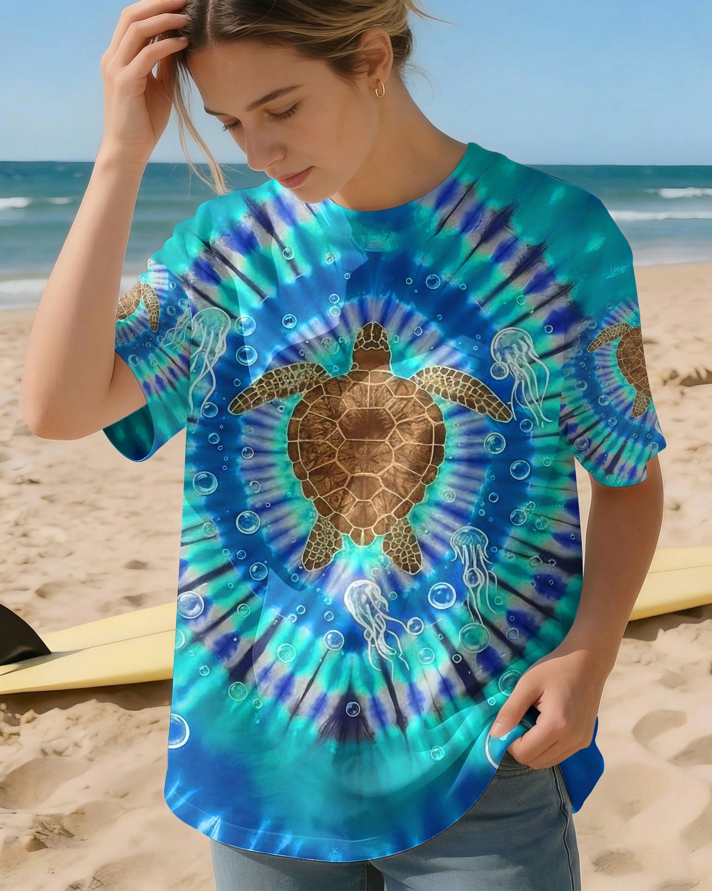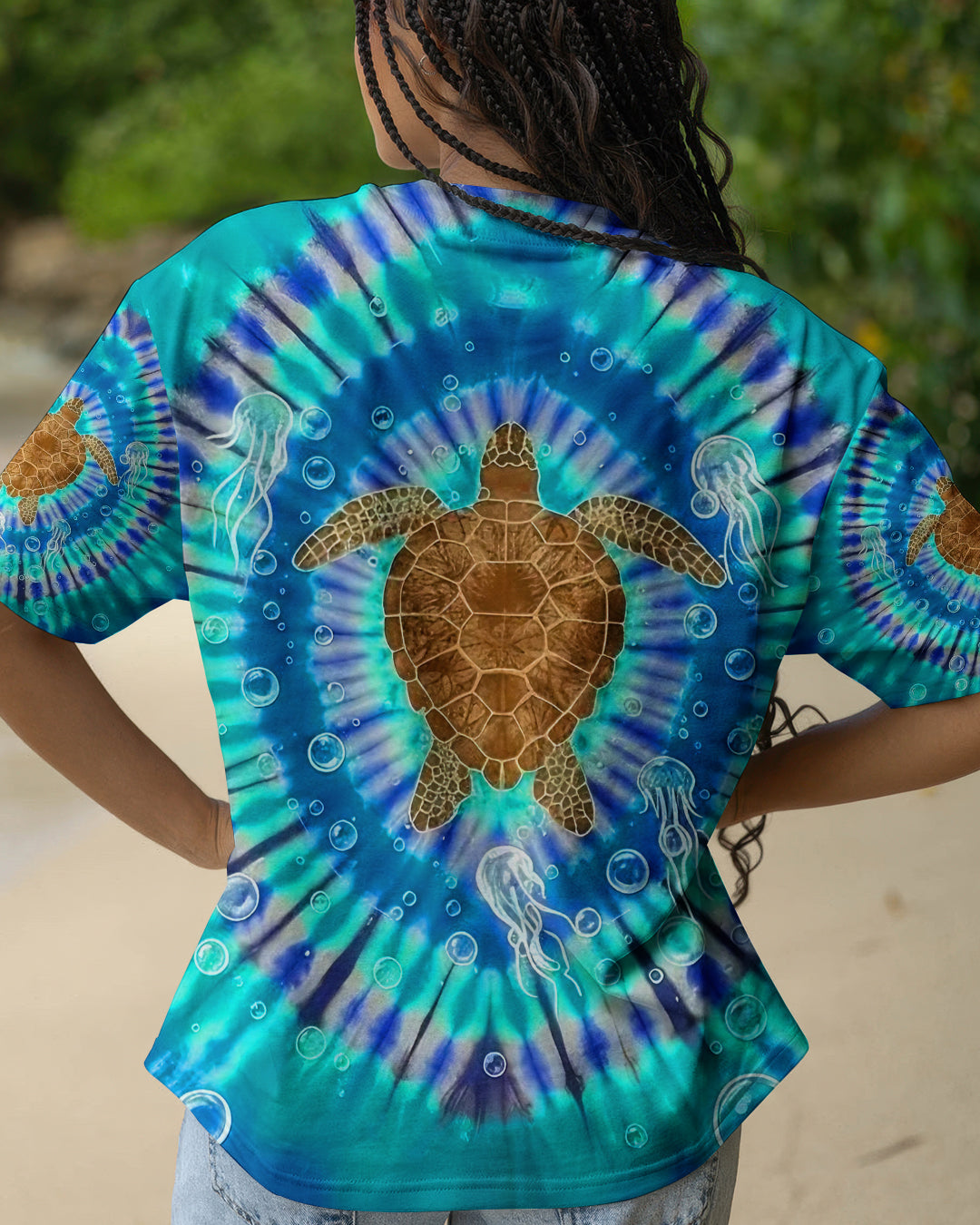 Immerse yourself in oceanic vitality with this dynamic all-over print showcasing a commanding turtle surrounded by dynamic water splashes and ethereal jellyfish, all set against a vibrant tie-dye backdrop bursting with ocean energy. The design captures the essence of aquatic freedom and the quiet power found in nature's rhythms. This piece speaks to ocean devotees and liberated spirits who understand that the sea teaches profound lessons about patience, resilience, and surrender. Perfect for those seeking daily reminders to decelerate, trust in life's natural flow, and allow the ocean's ancient wisdom to guide their journey. A bold celebration of the healing connection between soul and sea, where strength emerges not from resistance but from moving gracefully with the tide.