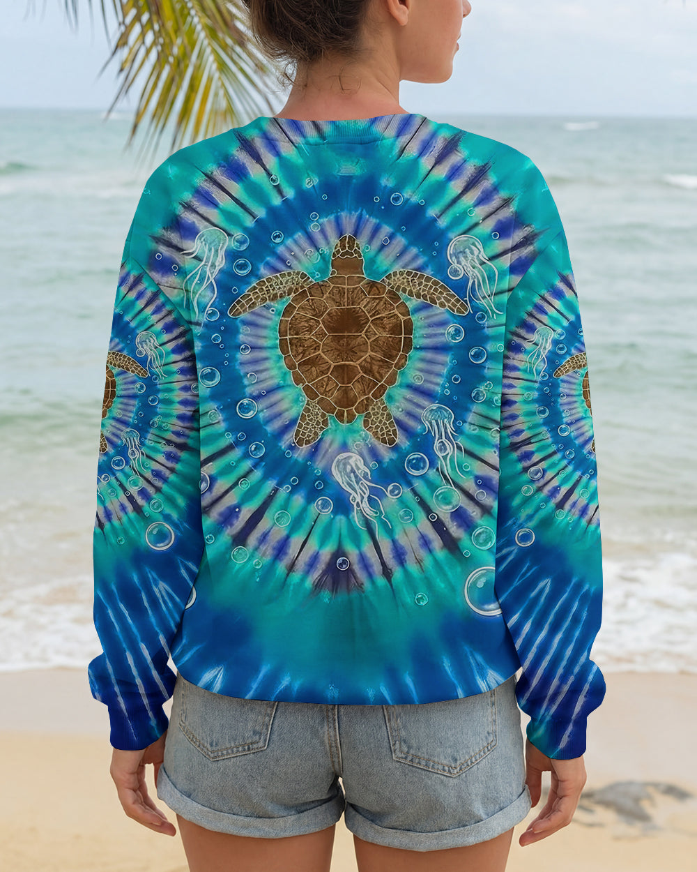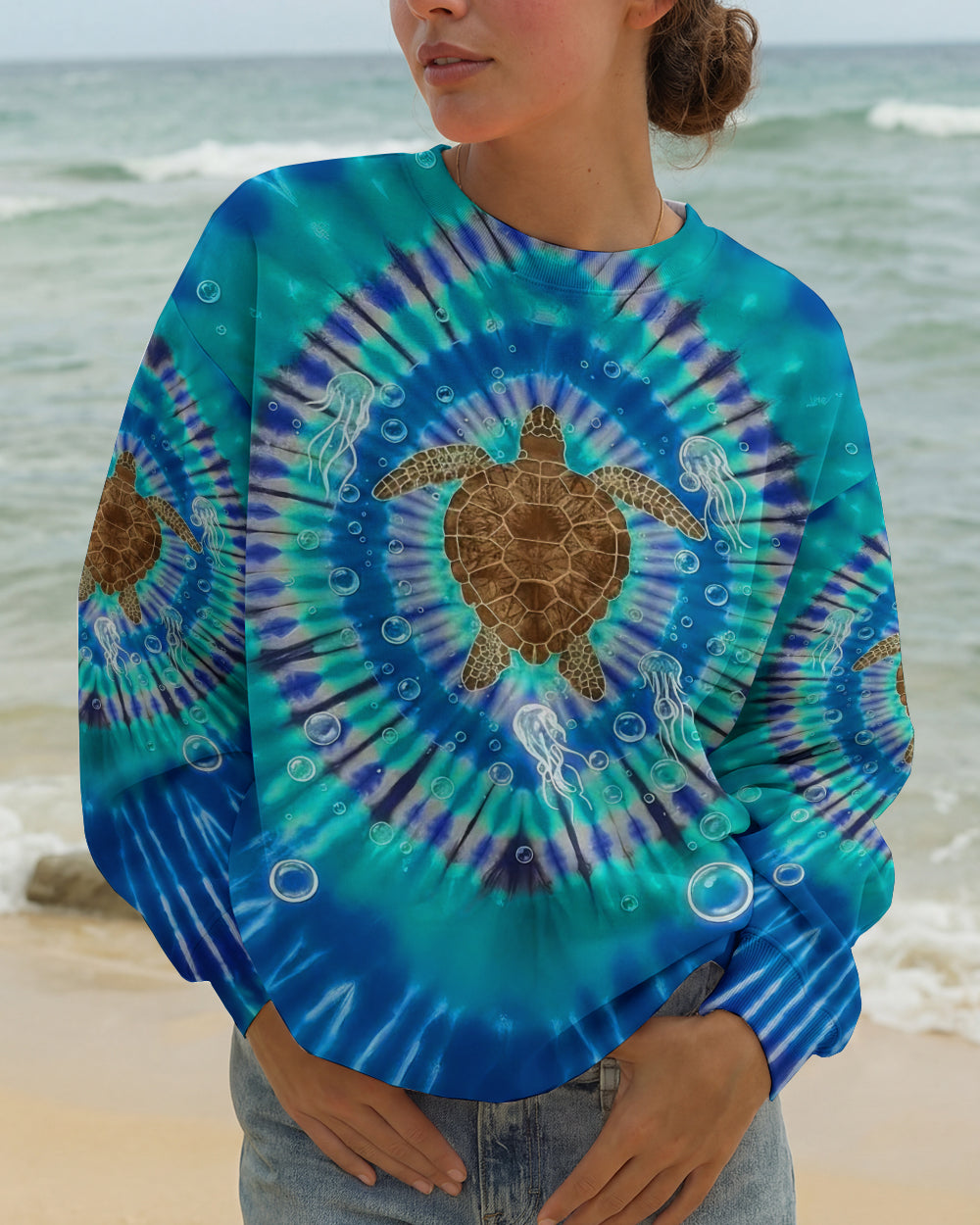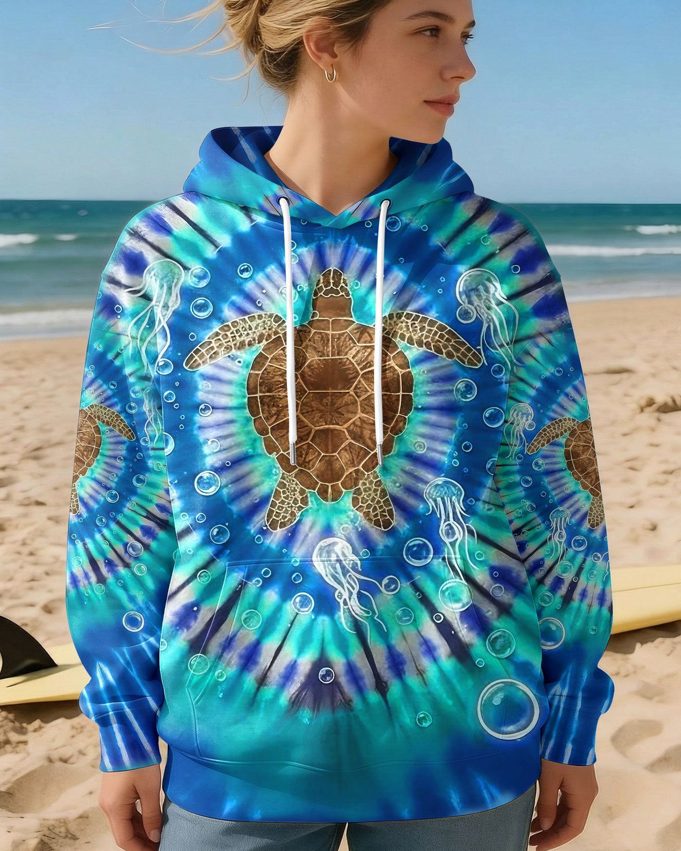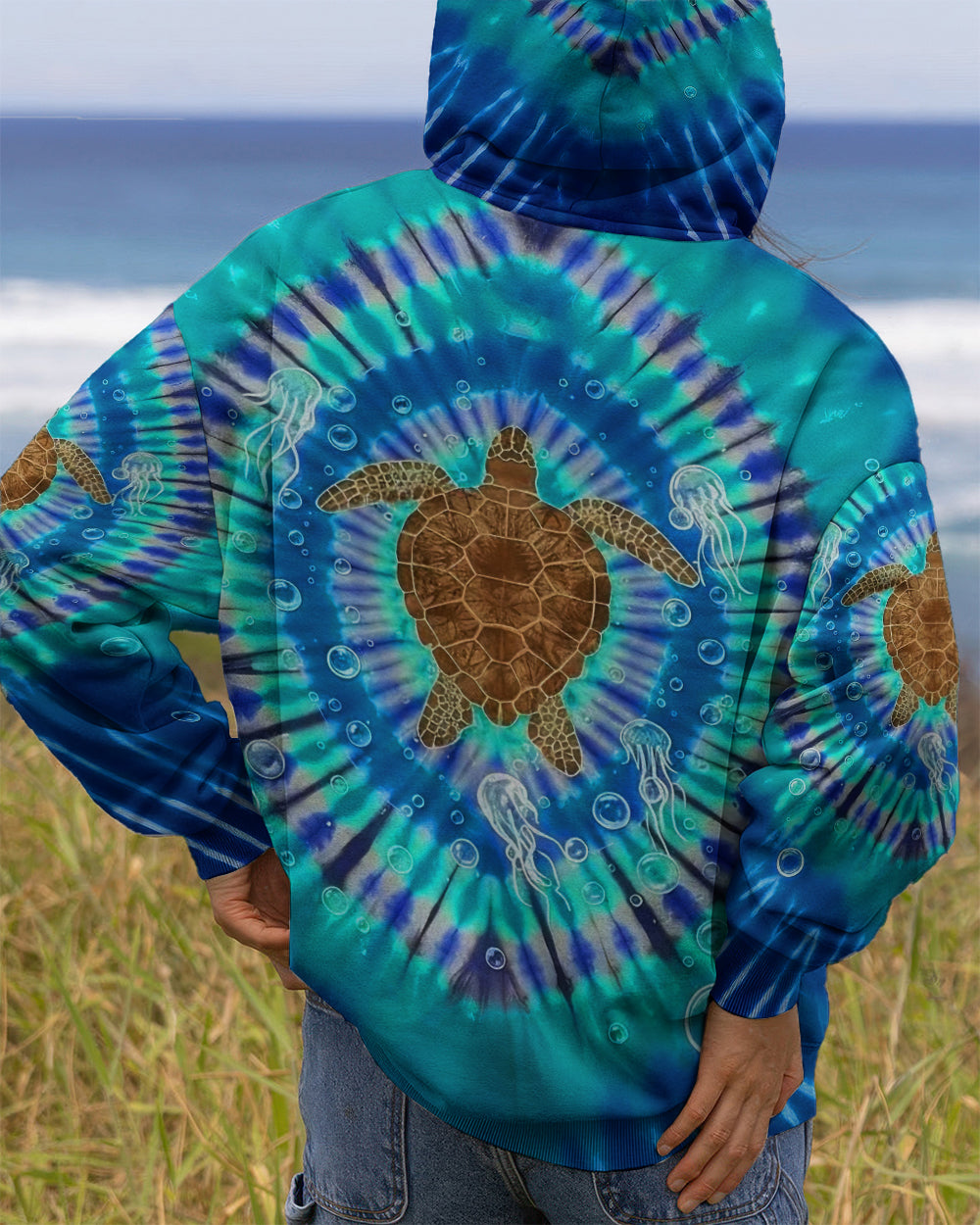 Immerse yourself in oceanic vitality with this dynamic all-over print showcasing a commanding turtle surrounded by dynamic water splashes and ethereal jellyfish, all set against a vibrant tie-dye backdrop bursting with ocean energy. The design captures the essence of aquatic freedom and the quiet power found in nature's rhythms. This piece speaks to ocean devotees and liberated spirits who understand that the sea teaches profound lessons about patience, resilience, and surrender. Perfect for those seeking daily reminders to decelerate, trust in life's natural flow, and allow the ocean's ancient wisdom to guide their journey. A bold celebration of the healing connection between soul and sea, where strength emerges not from resistance but from moving gracefully with the tide.