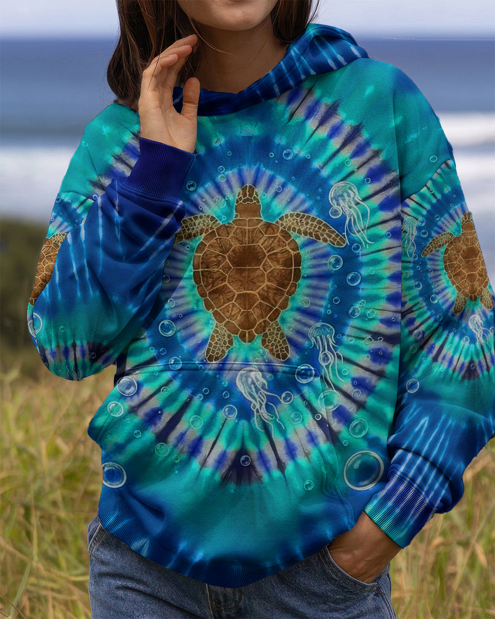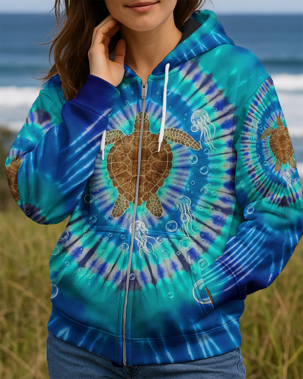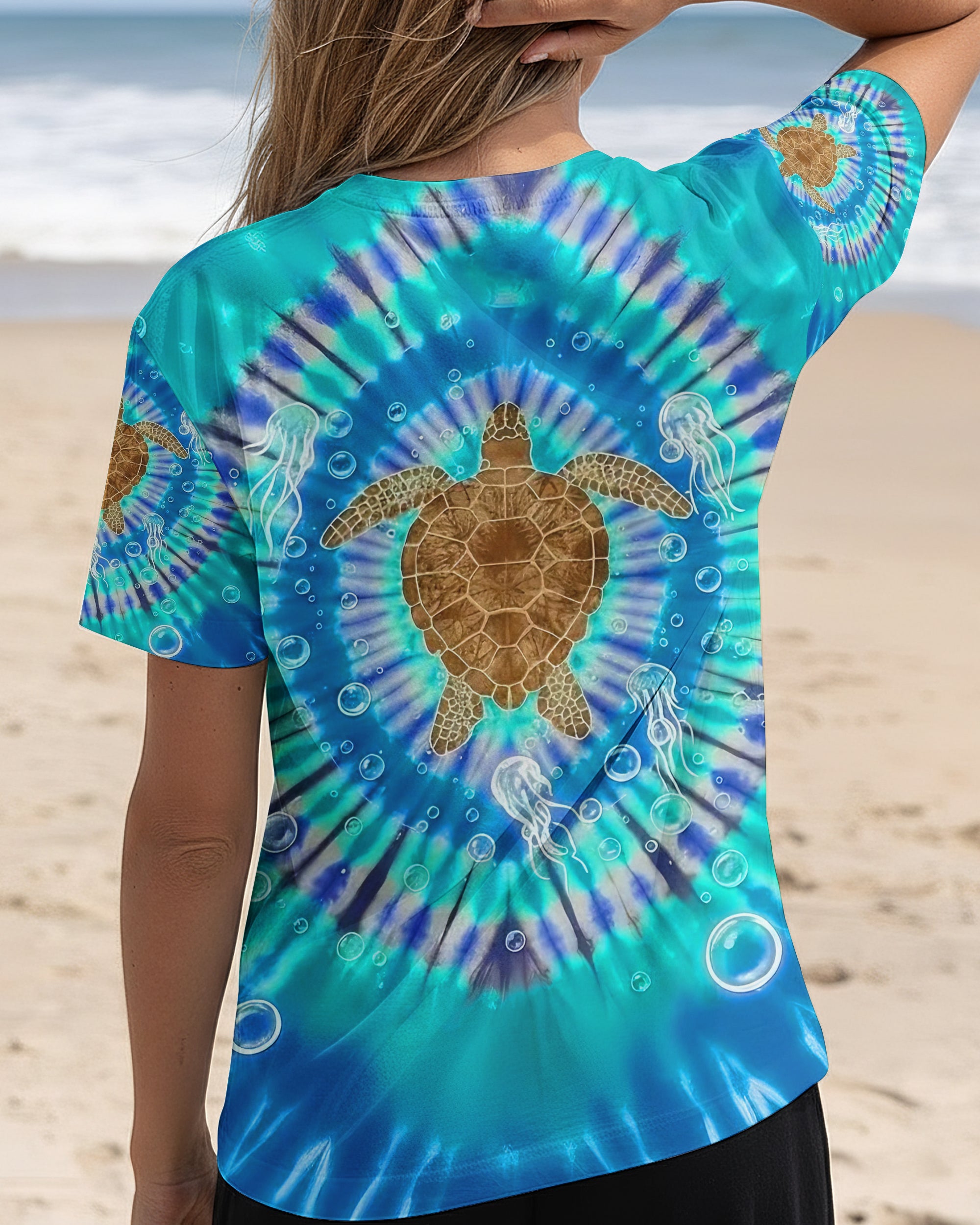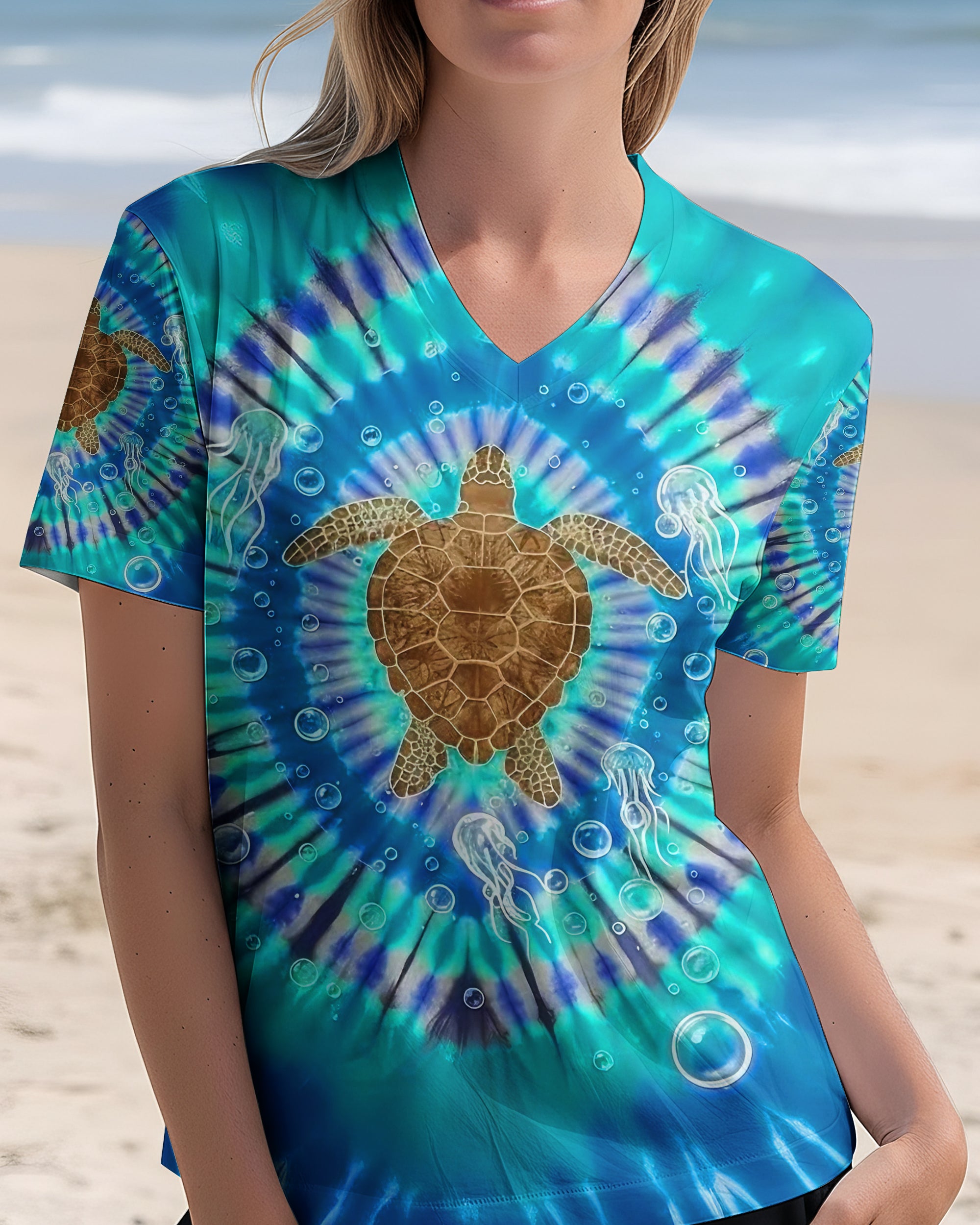 Immerse yourself in oceanic vitality with this dynamic all-over print showcasing a commanding turtle surrounded by dynamic water splashes and ethereal jellyfish, all set against a vibrant tie-dye backdrop bursting with ocean energy. The design captures the essence of aquatic freedom and the quiet power found in nature's rhythms. This piece speaks to ocean devotees and liberated spirits who understand that the sea teaches profound lessons about patience, resilience, and surrender. Perfect for those seeking daily reminders to decelerate, trust in life's natural flow, and allow the ocean's ancient wisdom to guide their journey. A bold celebration of the healing connection between soul and sea, where strength emerges not from resistance but from moving gracefully with the tide.