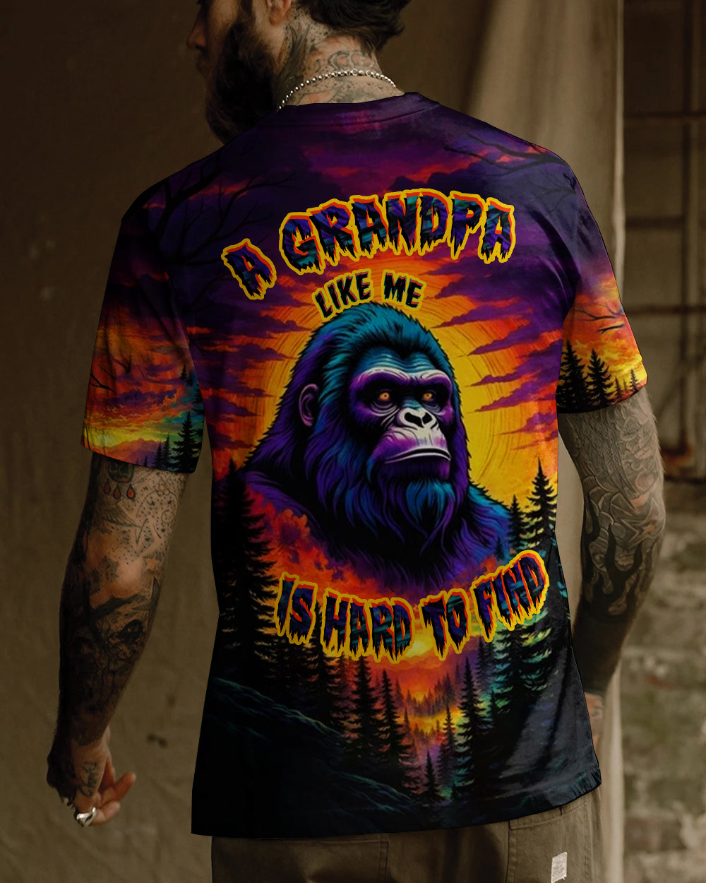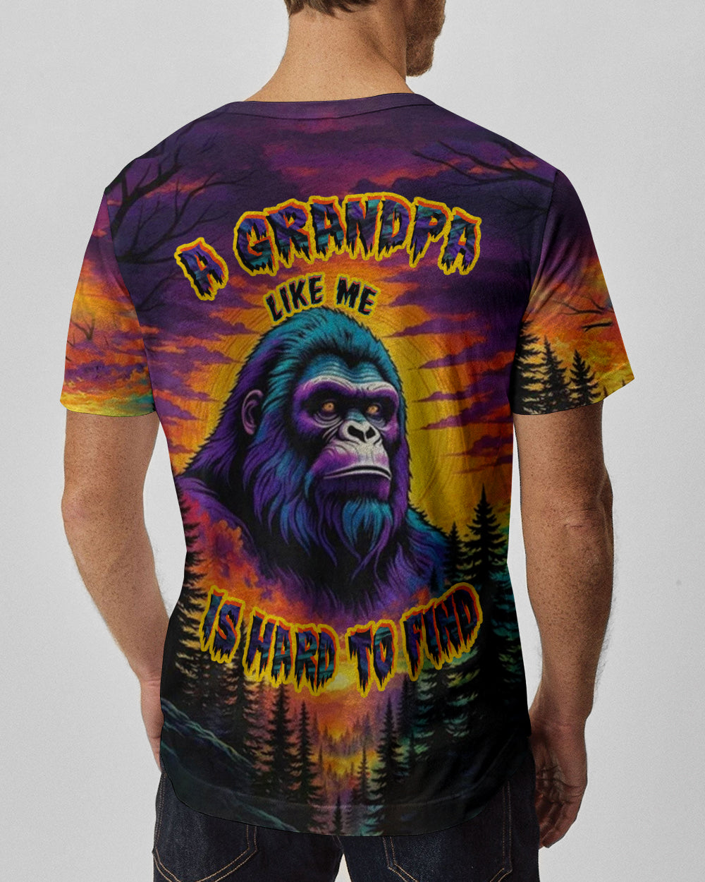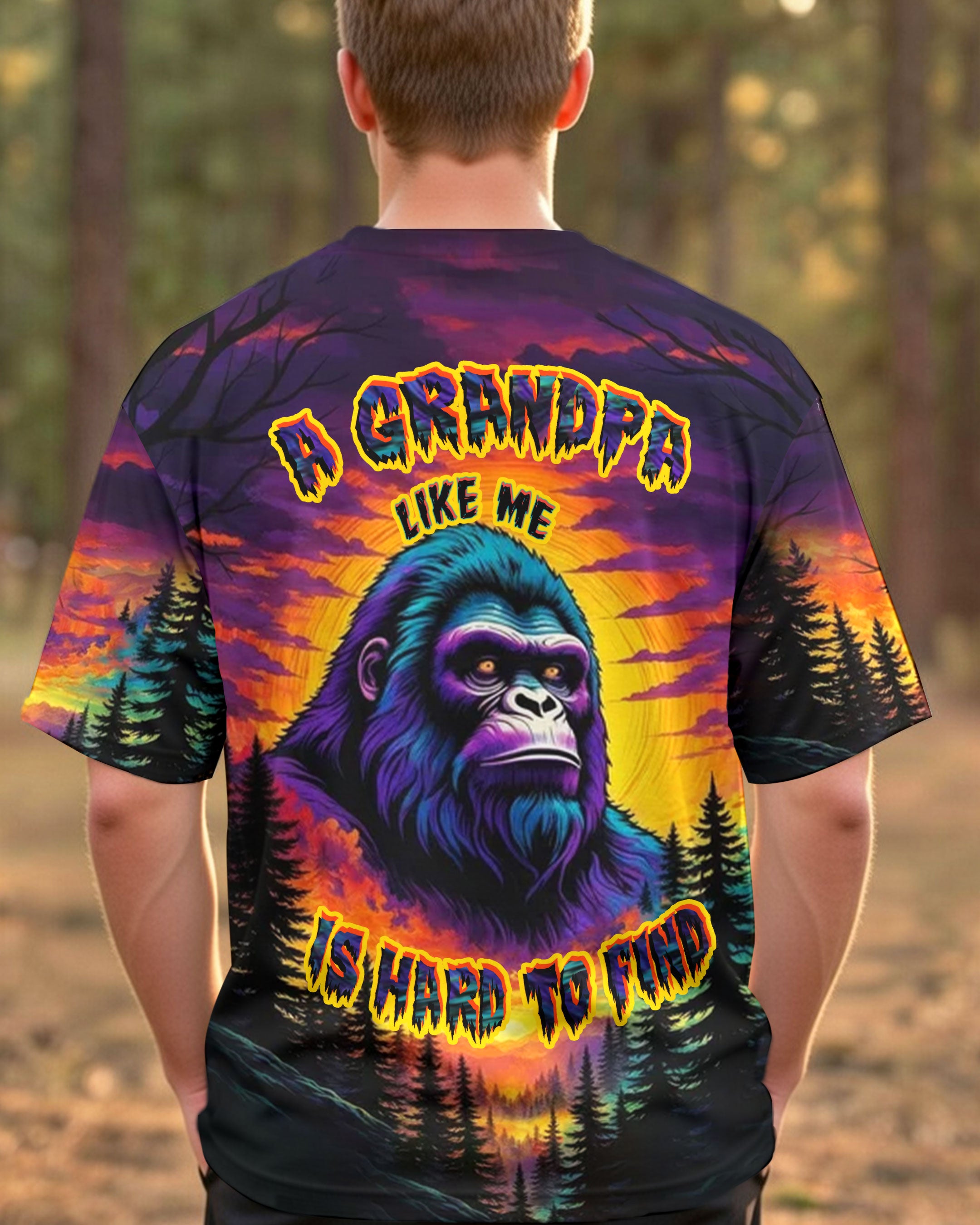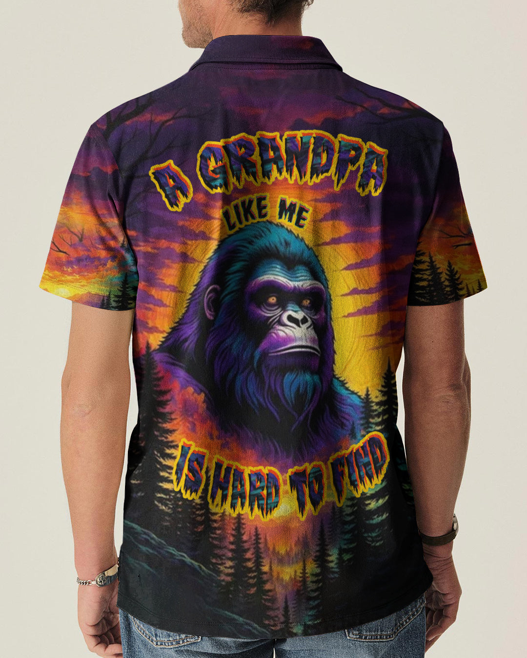 Celebrate the one-of-a-kind grandpa with this bold all-over print shirt featuring a striking Bigfoot silhouette against a vibrant sunset forest backdrop. The playful design captures the rare, legendary spirit of a grandpa who's impossible to replace—perfect for those who embrace their fun personality and aren't afraid to stand out. Crafted from a premium cotton/polyester and spandex blend, this shirt combines comfort with durability. Each panel is individually printed, cut, and sewn using advanced dye-sublimation techniques, delivering crisp, high-definition graphics that look like wearable art. The meticulous construction ensures flawless color vibrancy and sharp details from every angle. A tribute to grandpas with legendary vibes and unforgettable charm.
