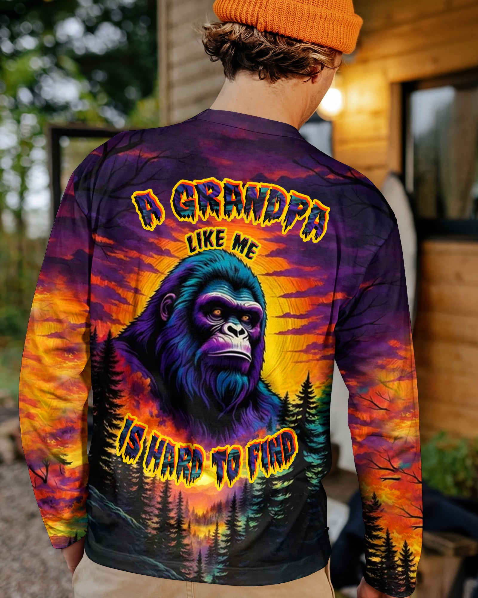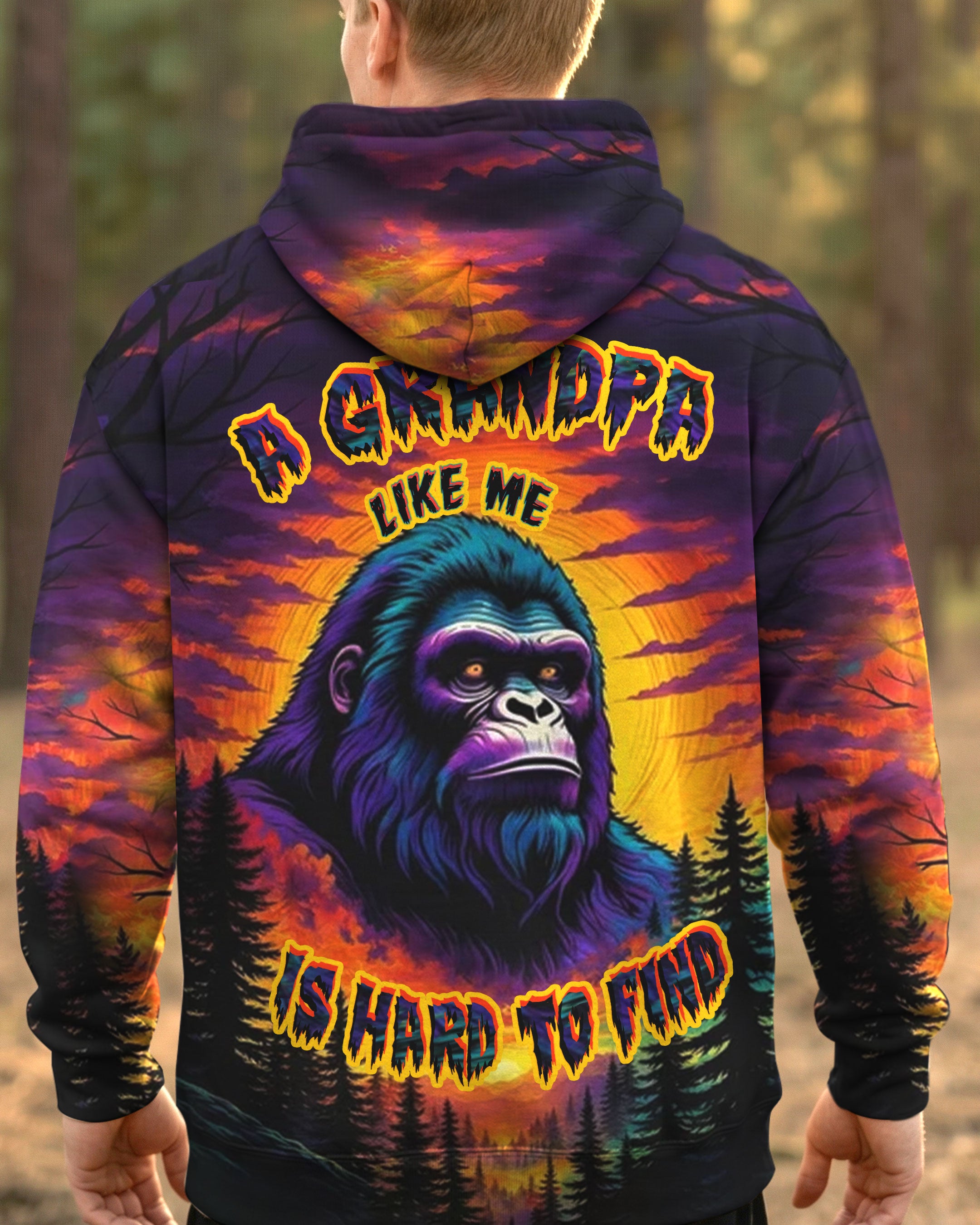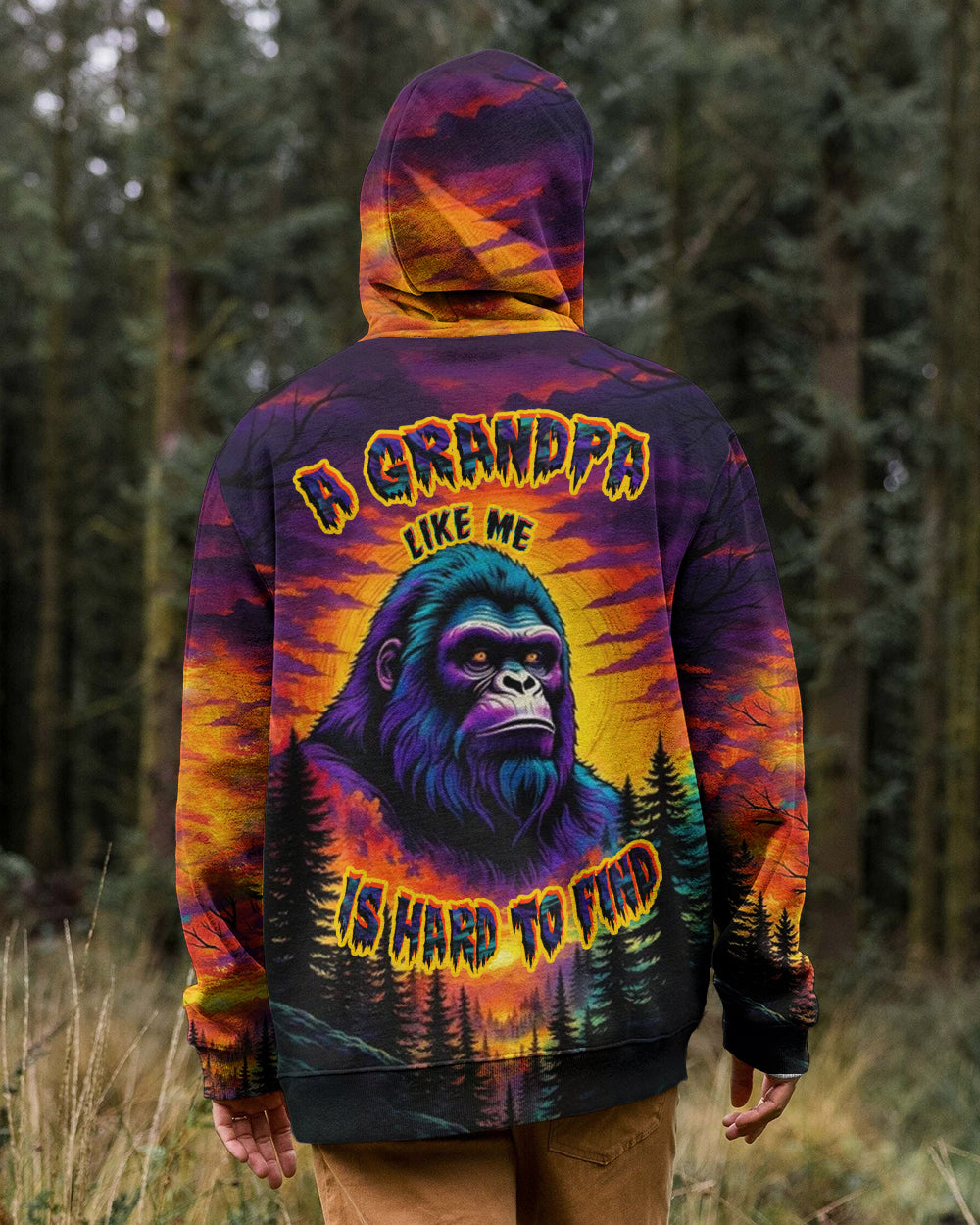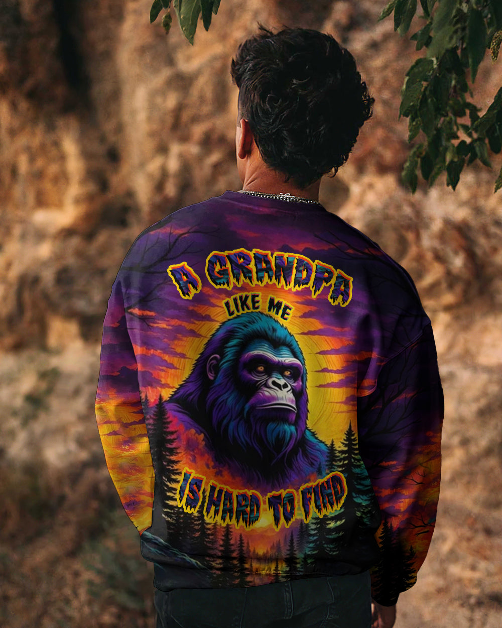 Celebrate the one-of-a-kind grandpa with this bold all-over print shirt featuring a striking Bigfoot silhouette against a vibrant sunset forest backdrop. The playful design captures the rare, legendary spirit of a grandpa who's impossible to replace—perfect for those who embrace their fun personality and aren't afraid to stand out. Crafted from a premium cotton/polyester and spandex blend, this shirt combines comfort with durability. Each panel is individually printed, cut, and sewn using advanced dye-sublimation techniques, delivering crisp, high-definition graphics that look like wearable art. The meticulous construction ensures flawless color vibrancy and sharp details from every angle. A tribute to grandpas with legendary vibes and unforgettable charm.