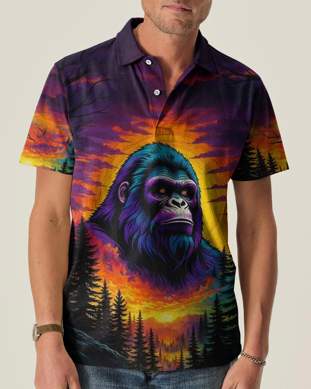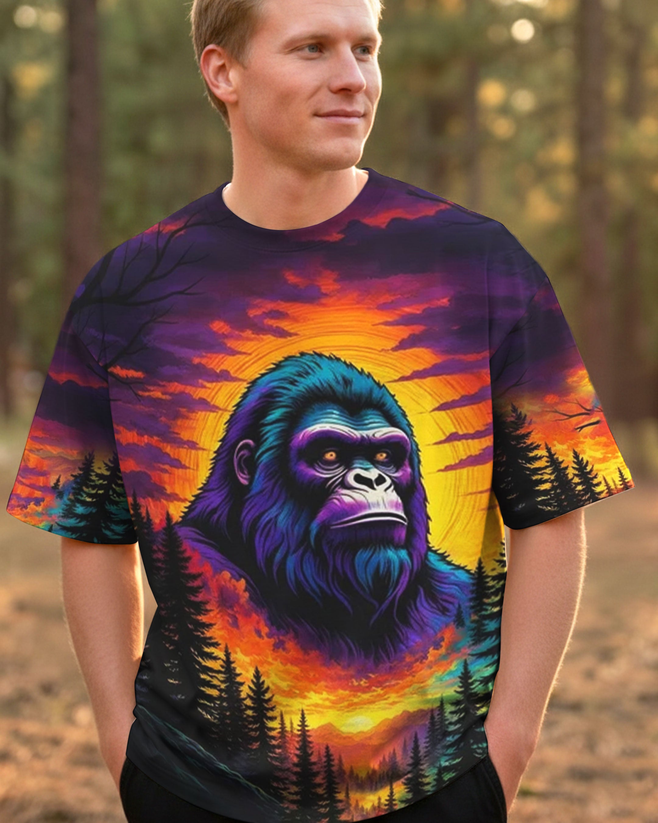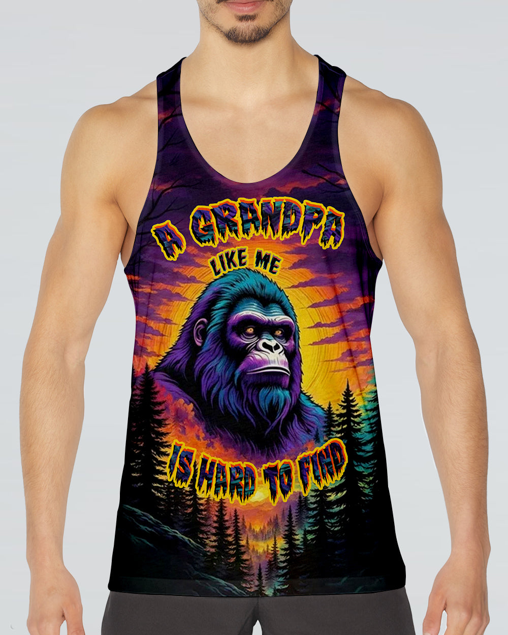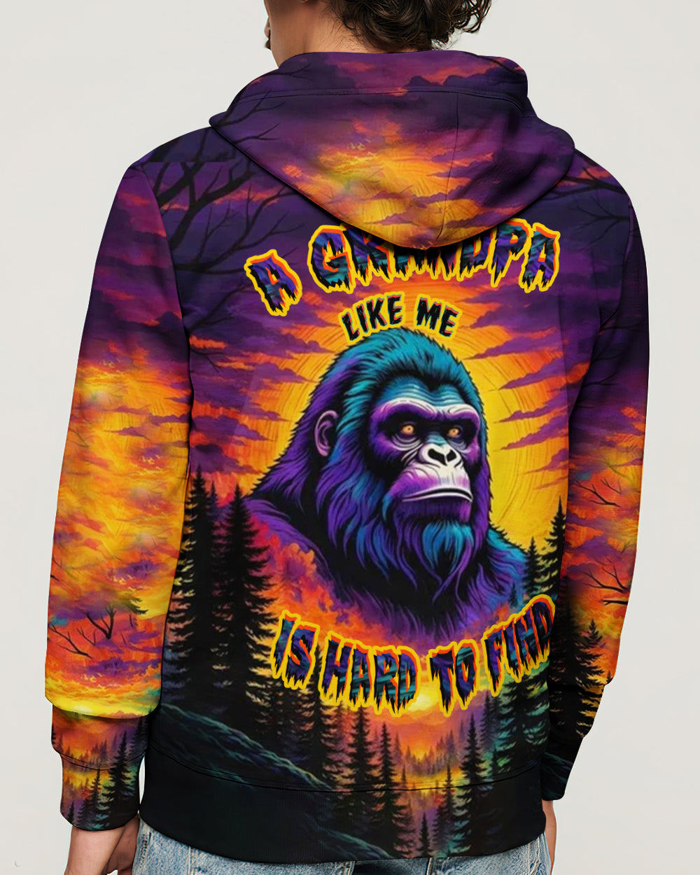 Celebrate the one-of-a-kind grandpa with this bold all-over print shirt featuring a striking Bigfoot silhouette against a vibrant sunset forest backdrop. The playful design captures the rare, legendary spirit of a grandpa who's impossible to replace—perfect for those who embrace their fun personality and aren't afraid to stand out. Crafted from a premium cotton/polyester and spandex blend, this shirt combines comfort with durability. Each panel is individually printed, cut, and sewn using advanced dye-sublimation techniques, delivering crisp, high-definition graphics that look like wearable art. The meticulous construction ensures flawless color vibrancy and sharp details from every angle. A tribute to grandpas with legendary vibes and unforgettable charm.