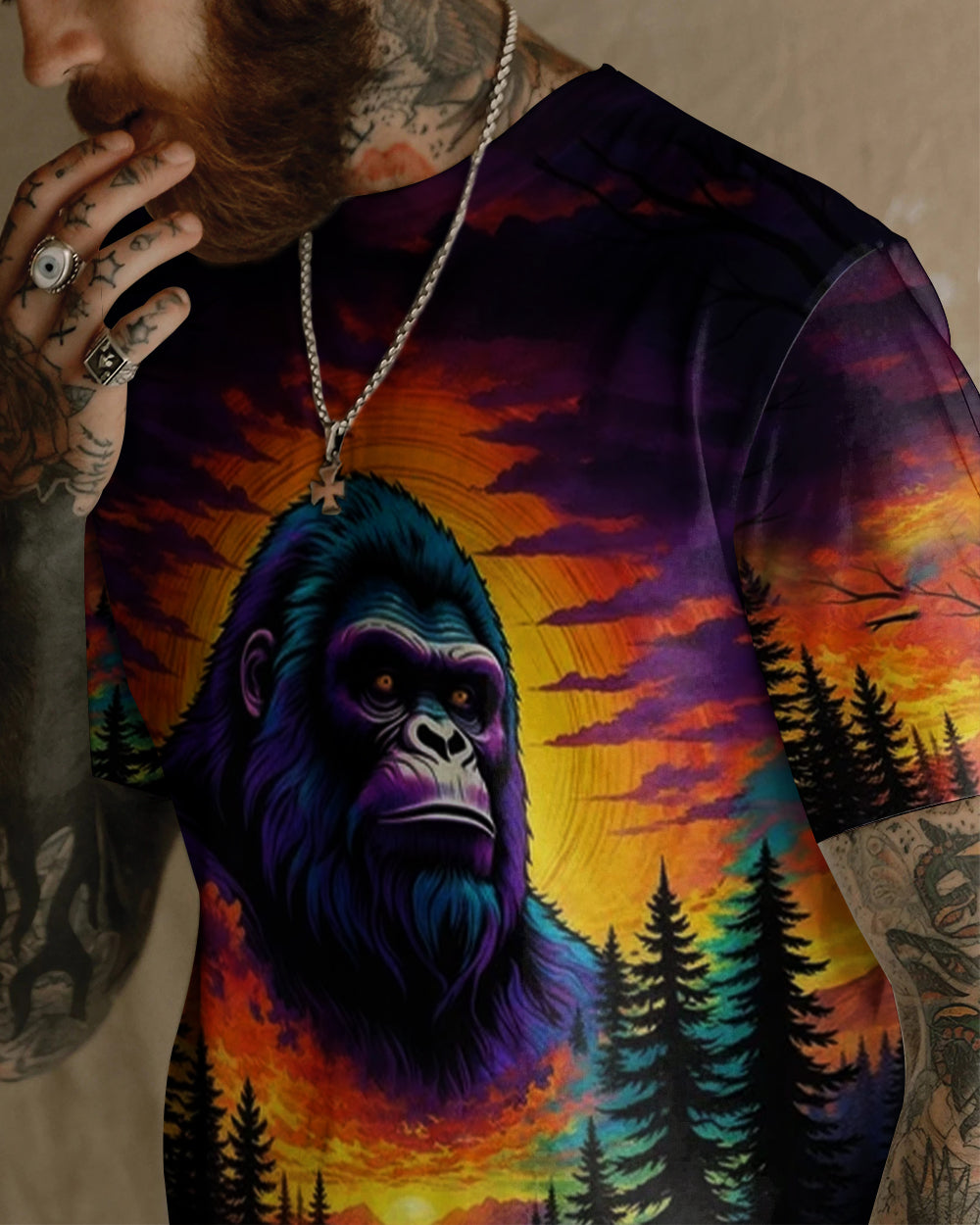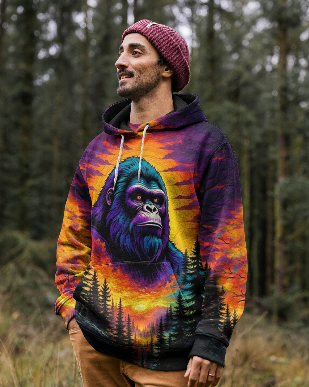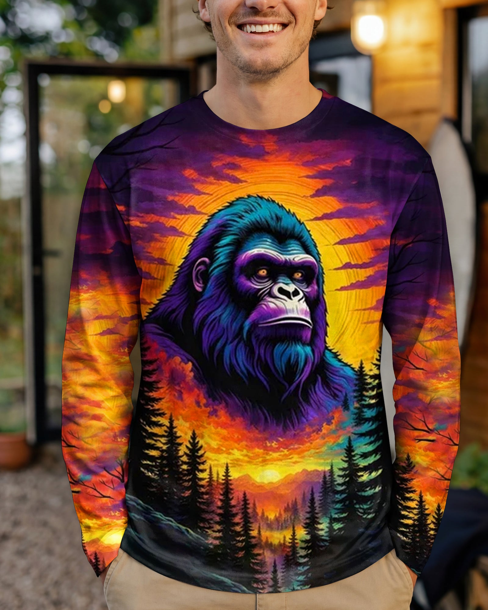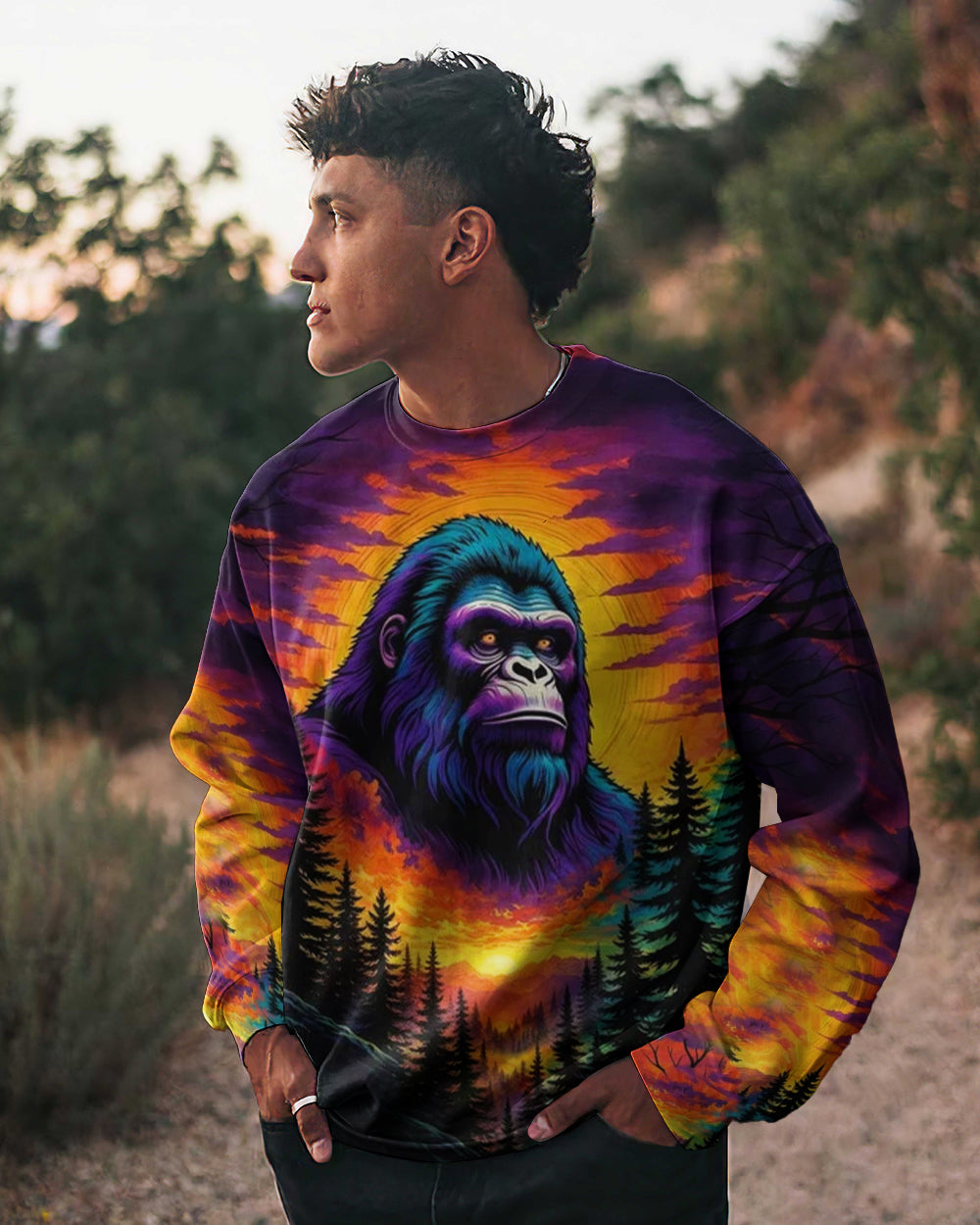 Celebrate the one-of-a-kind grandpa with this bold all-over print shirt featuring a striking Bigfoot silhouette against a vibrant sunset forest backdrop. The playful design captures the rare, legendary spirit of a grandpa who's impossible to replace—perfect for those who embrace their fun personality and aren't afraid to stand out. Crafted from a premium cotton/polyester and spandex blend, this shirt combines comfort with durability. Each panel is individually printed, cut, and sewn using advanced dye-sublimation techniques, delivering crisp, high-definition graphics that look like wearable art. The meticulous construction ensures flawless color vibrancy and sharp details from every angle. A tribute to grandpas with legendary vibes and unforgettable charm.