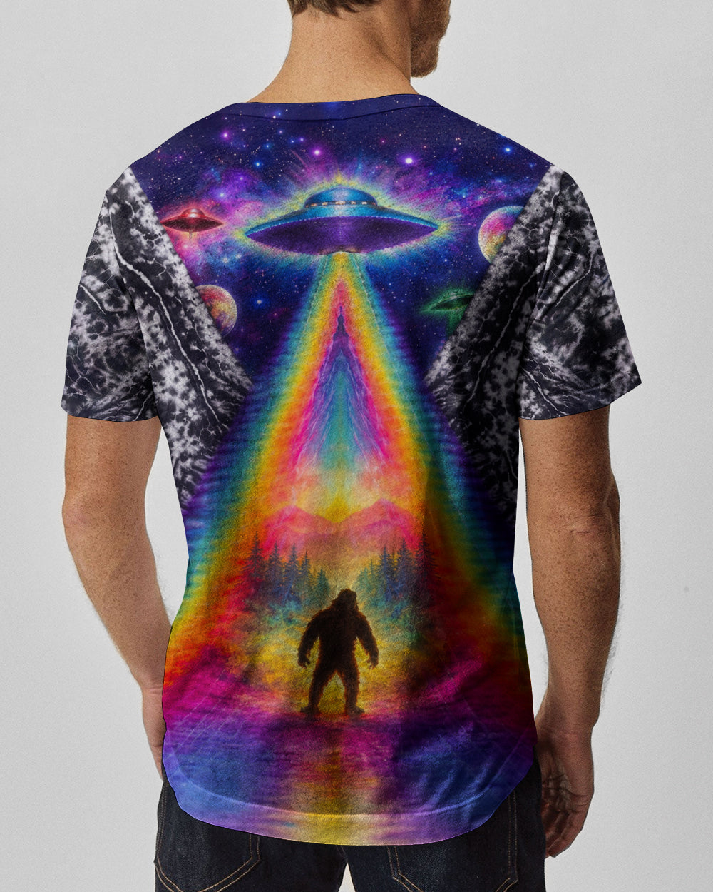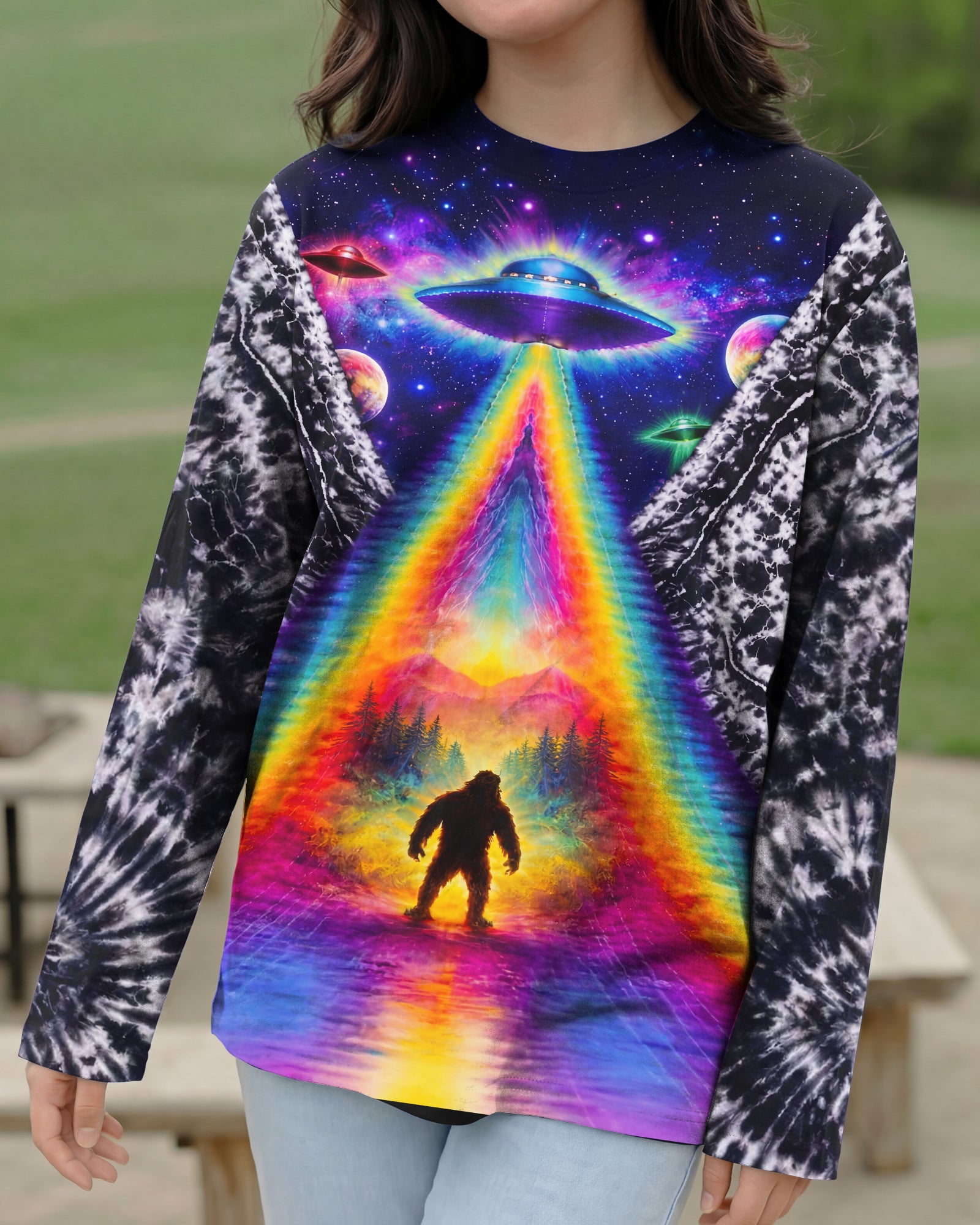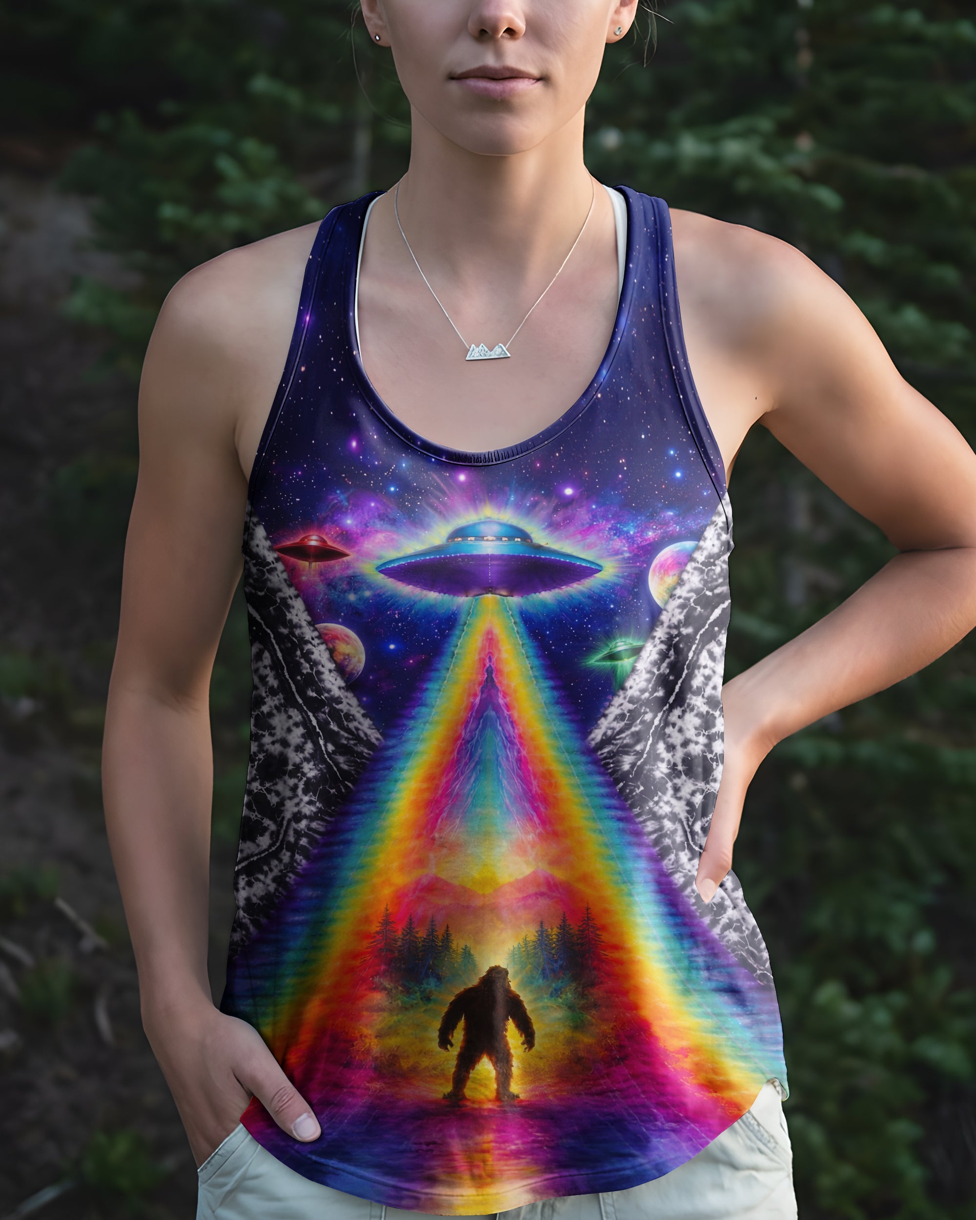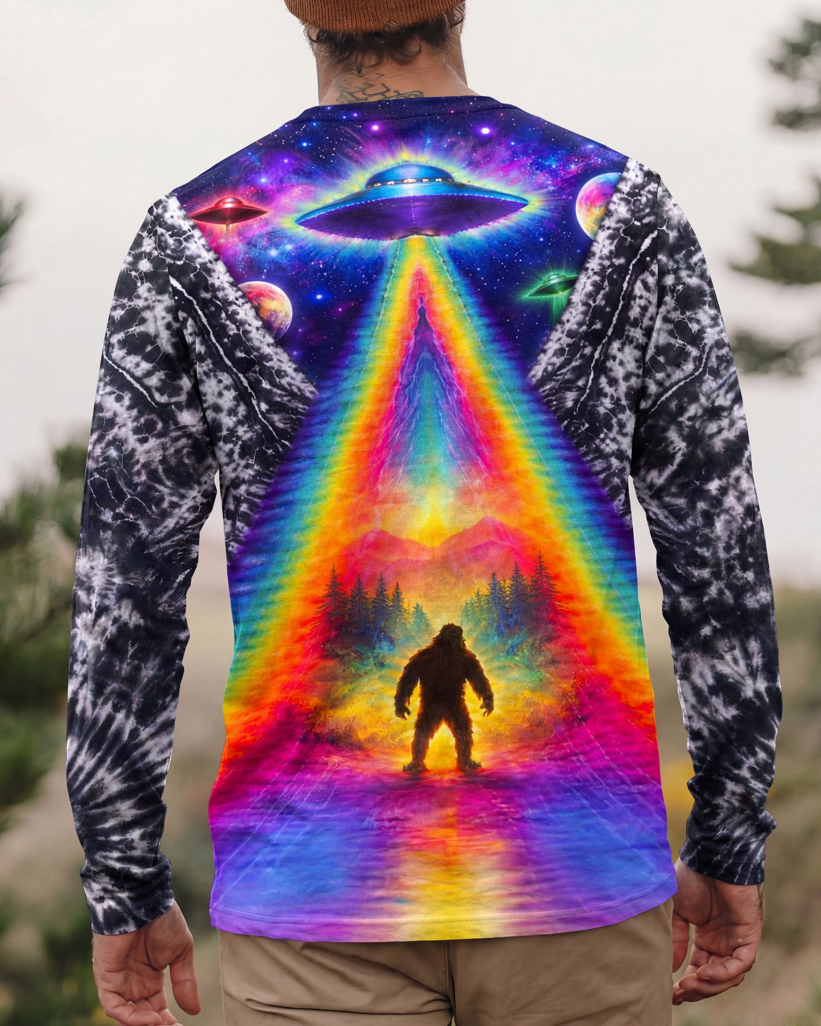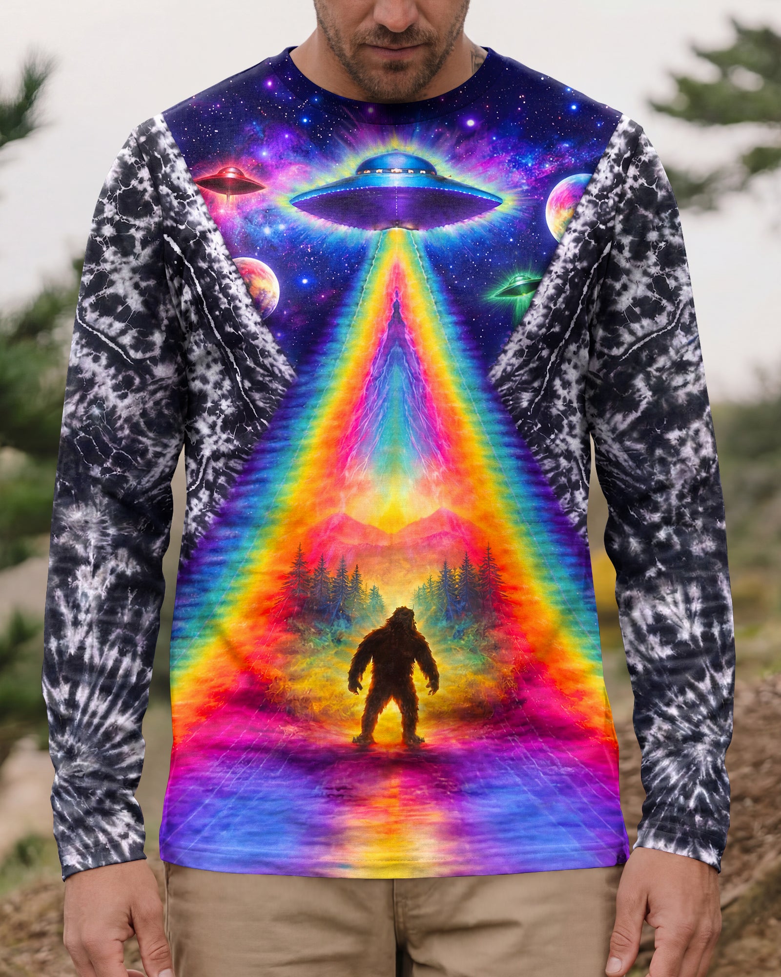 This striking all-over print design merges outdoor adventure with cosmic intrigue, featuring a UFO projecting a luminous rainbow beam across a solitary Bigfoot silhouette nestled within dense forest. The composition layers a glowing spacecraft against a mysterious night sky and wilderness landscape, creating a narrative that captivates both nature enthusiasts and those drawn to unexplained phenomena. The design speaks to a specific audience—seasoned campers, nocturnal explorers, and those fascinated by cryptid lore—offering wearable storytelling that celebrates the intersection of wilderness exploration and the enigmatic unknown. Perfect for anyone who appreciates outdoor culture with an imaginative, otherworldly edge.