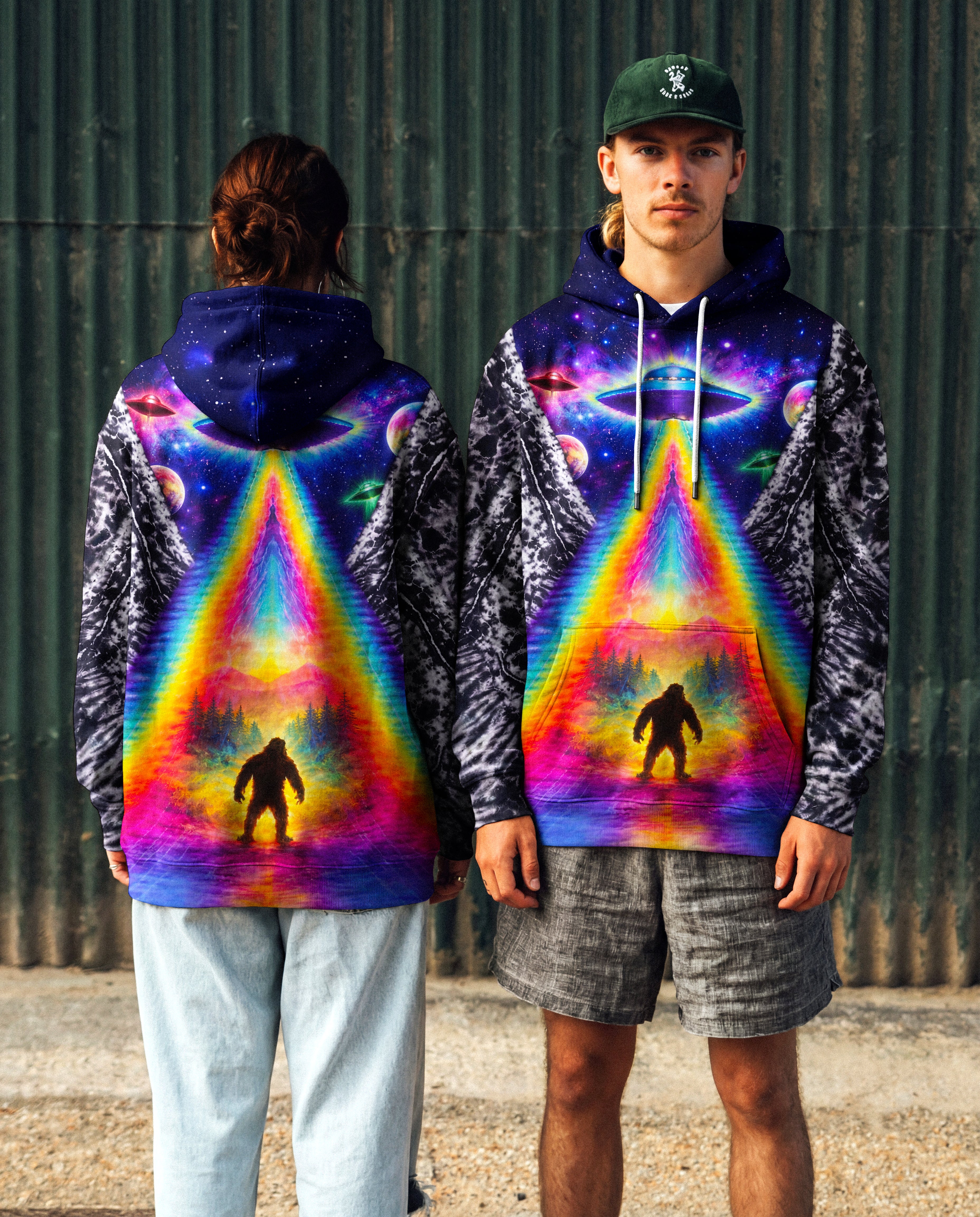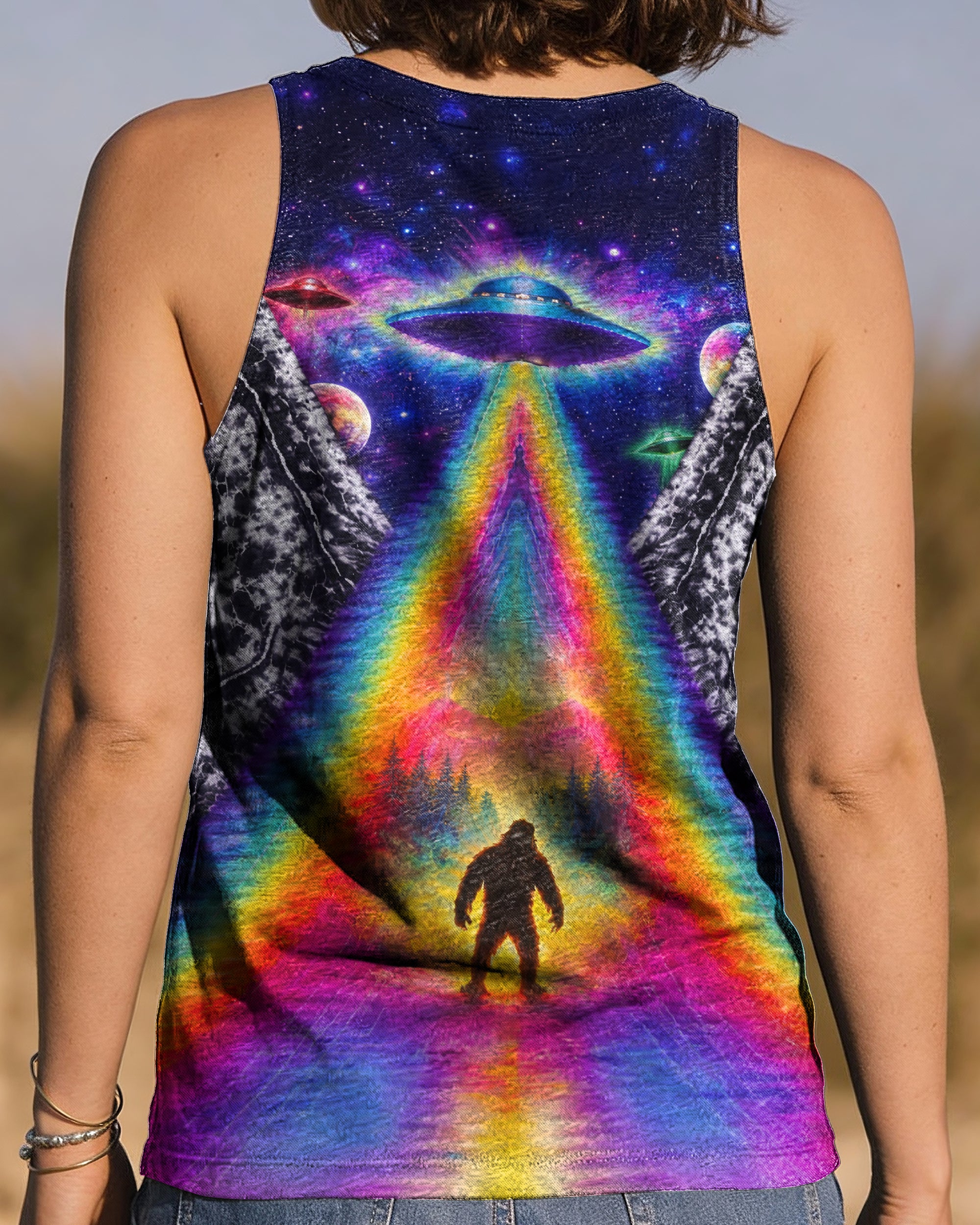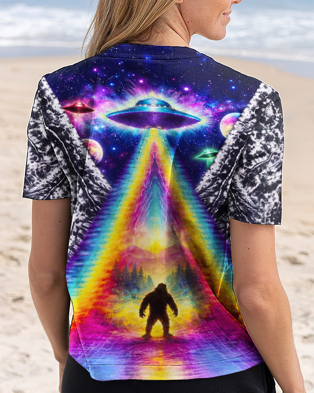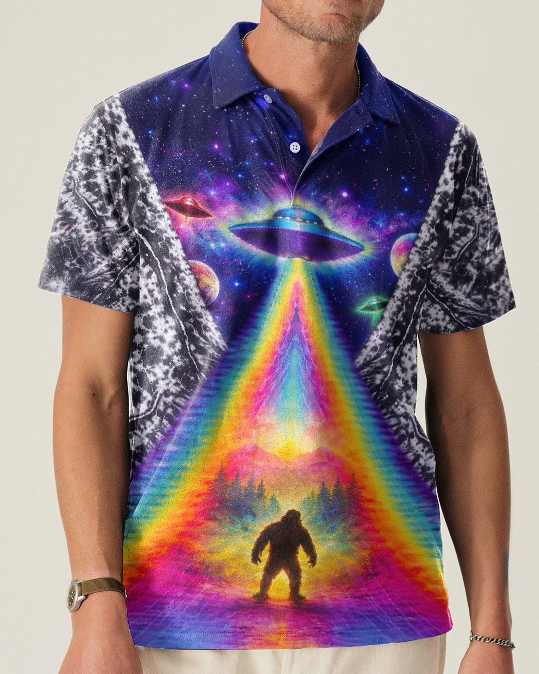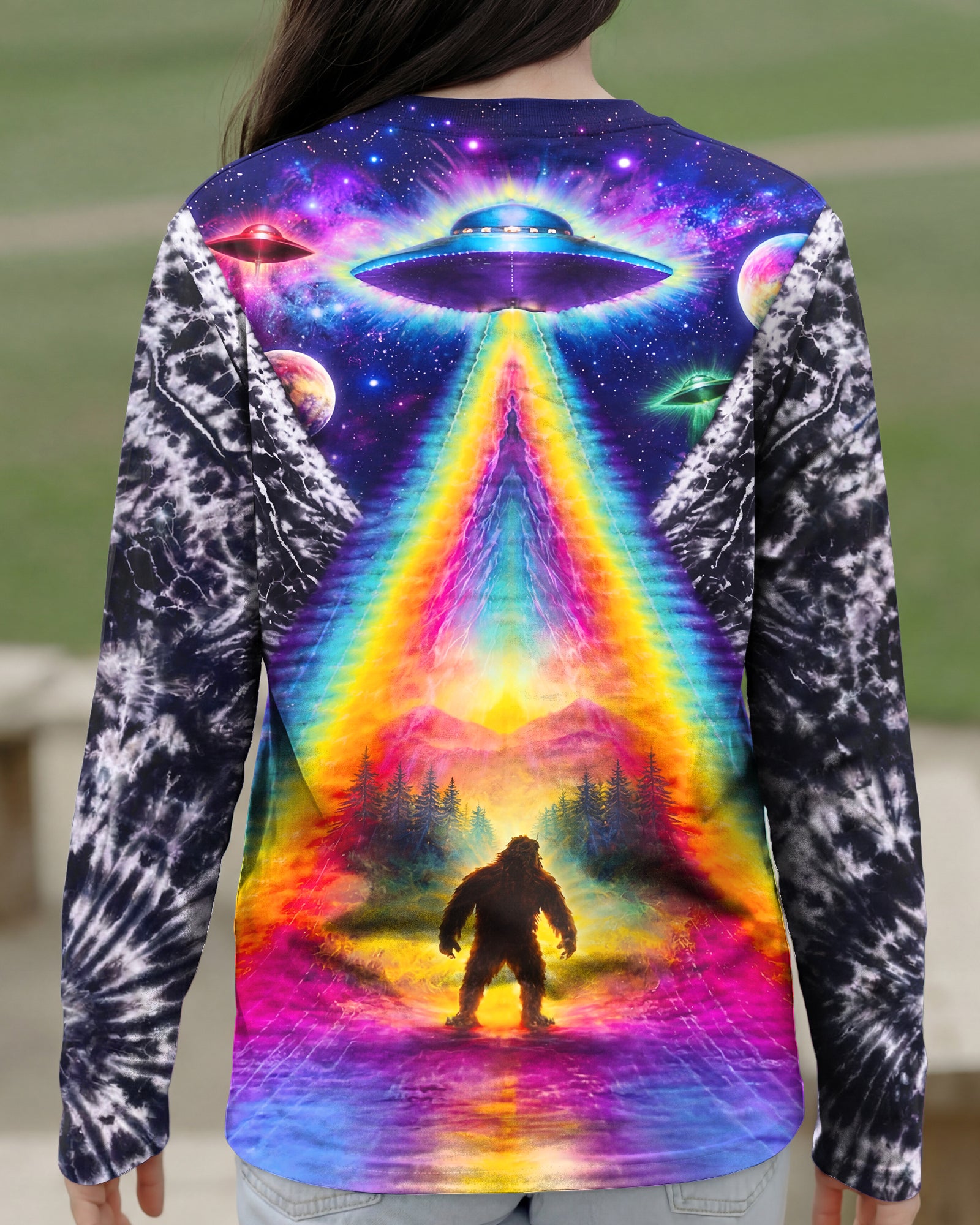 This striking all-over print design merges outdoor adventure with cosmic intrigue, featuring a UFO projecting a luminous rainbow beam across a solitary Bigfoot silhouette nestled within dense forest. The composition layers a glowing spacecraft against a mysterious night sky and wilderness landscape, creating a narrative that captivates both nature enthusiasts and those drawn to unexplained phenomena. The design speaks to a specific audience—seasoned campers, nocturnal explorers, and those fascinated by cryptid lore—offering wearable storytelling that celebrates the intersection of wilderness exploration and the enigmatic unknown. Perfect for anyone who appreciates outdoor culture with an imaginative, otherworldly edge.