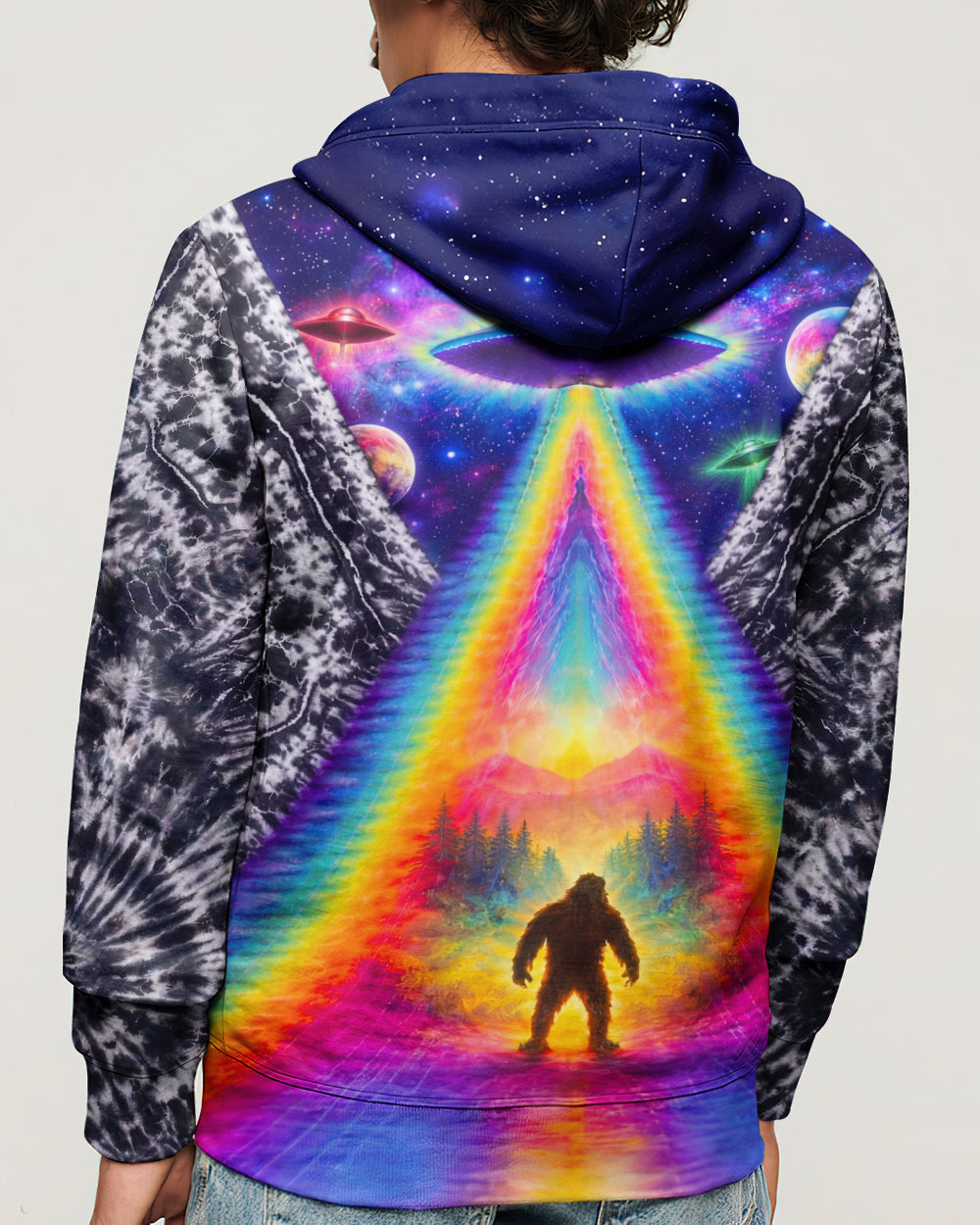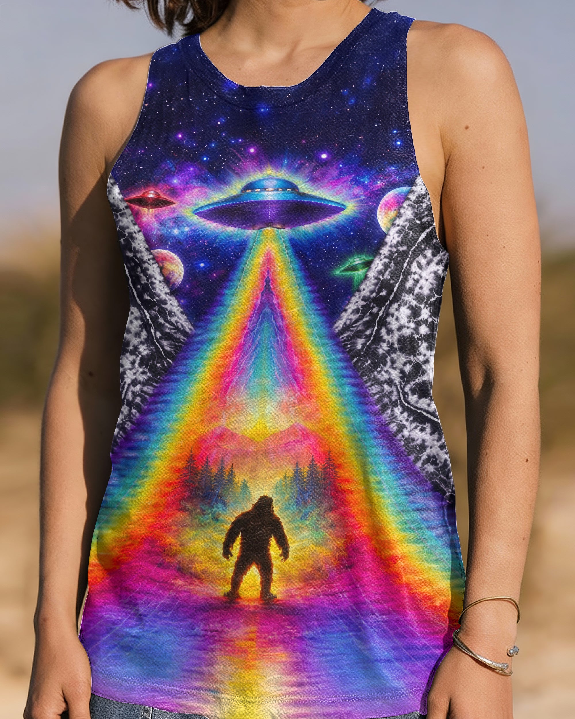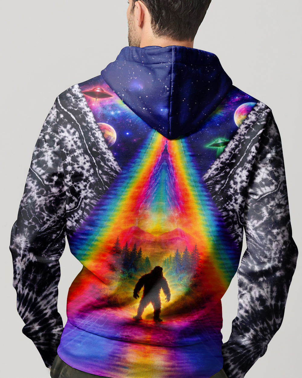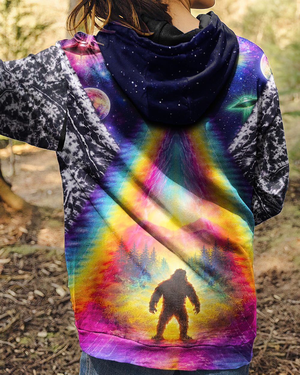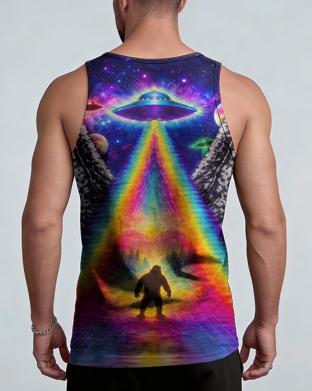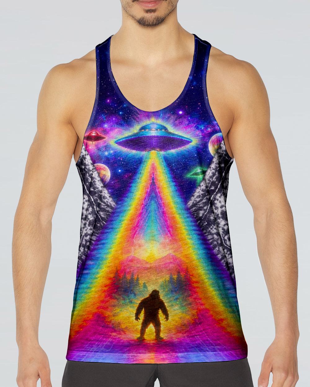 This striking all-over print design merges outdoor adventure with cosmic intrigue, featuring a UFO projecting a luminous rainbow beam across a solitary Bigfoot silhouette nestled within dense forest. The composition layers a glowing spacecraft against a mysterious night sky and wilderness landscape, creating a narrative that captivates both nature enthusiasts and those drawn to unexplained phenomena. The design speaks to a specific audience—seasoned campers, nocturnal explorers, and those fascinated by cryptid lore—offering wearable storytelling that celebrates the intersection of wilderness exploration and the enigmatic unknown. Perfect for anyone who appreciates outdoor culture with an imaginative, otherworldly edge.