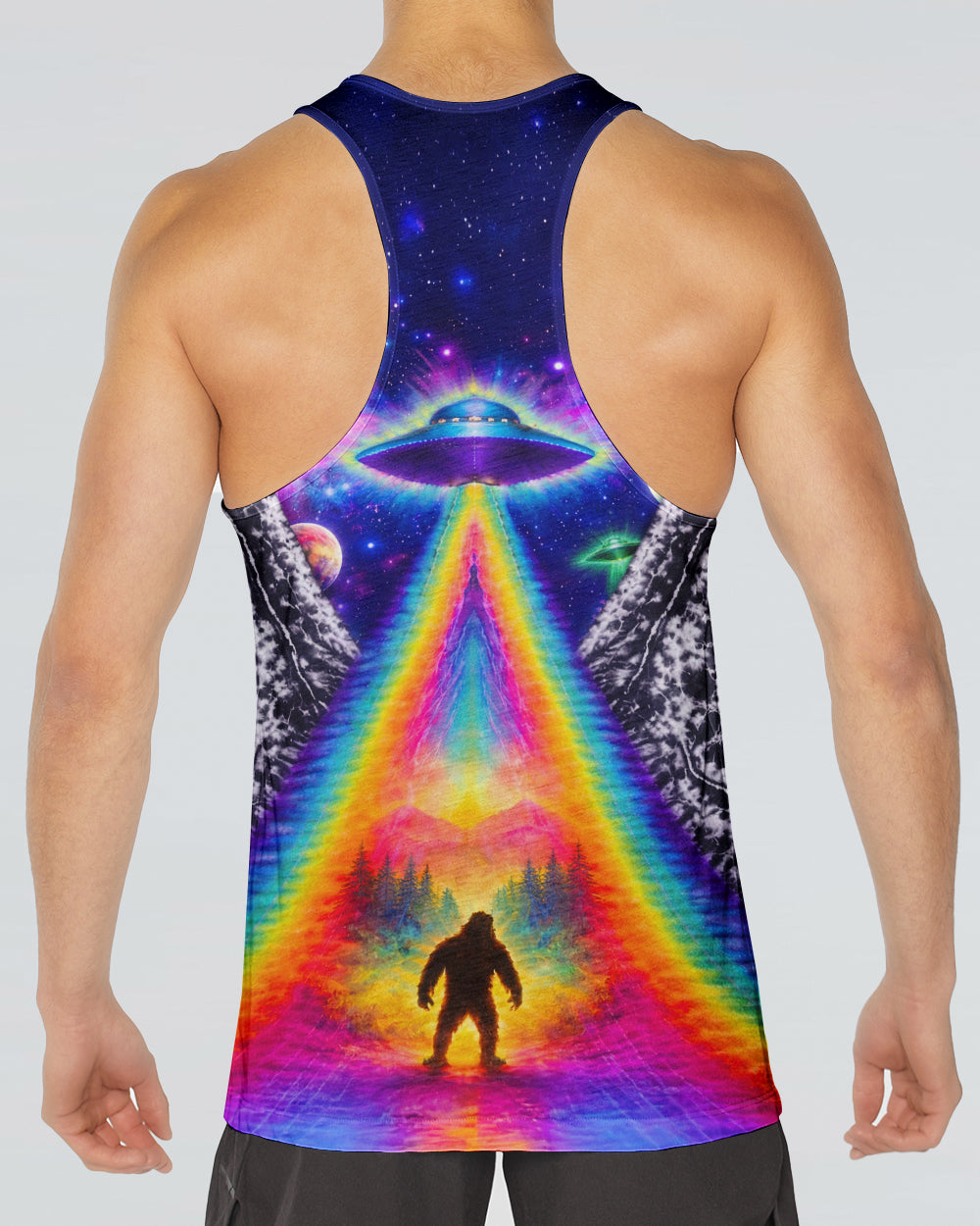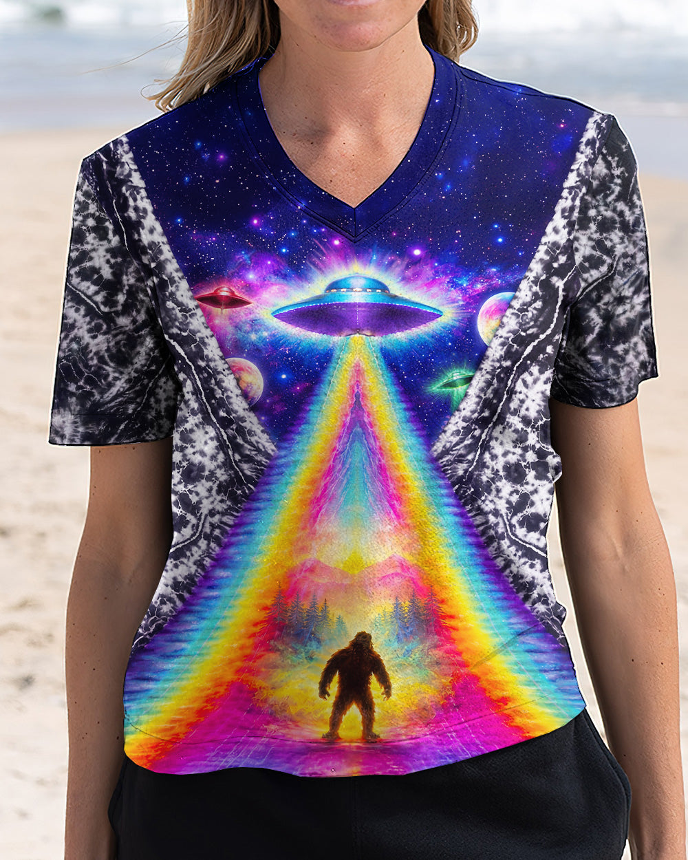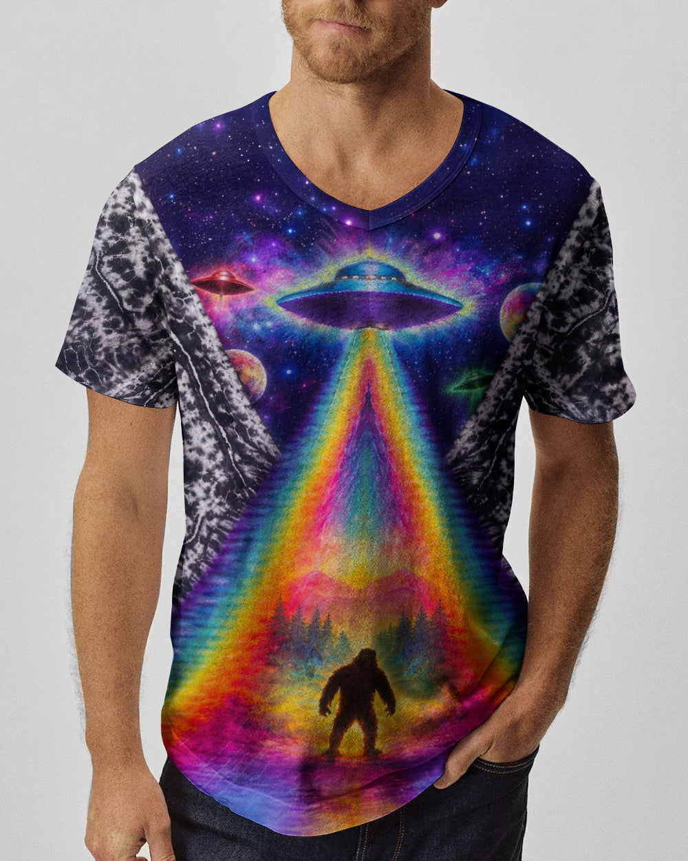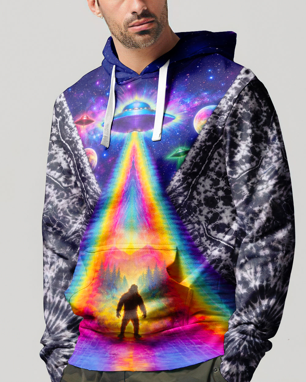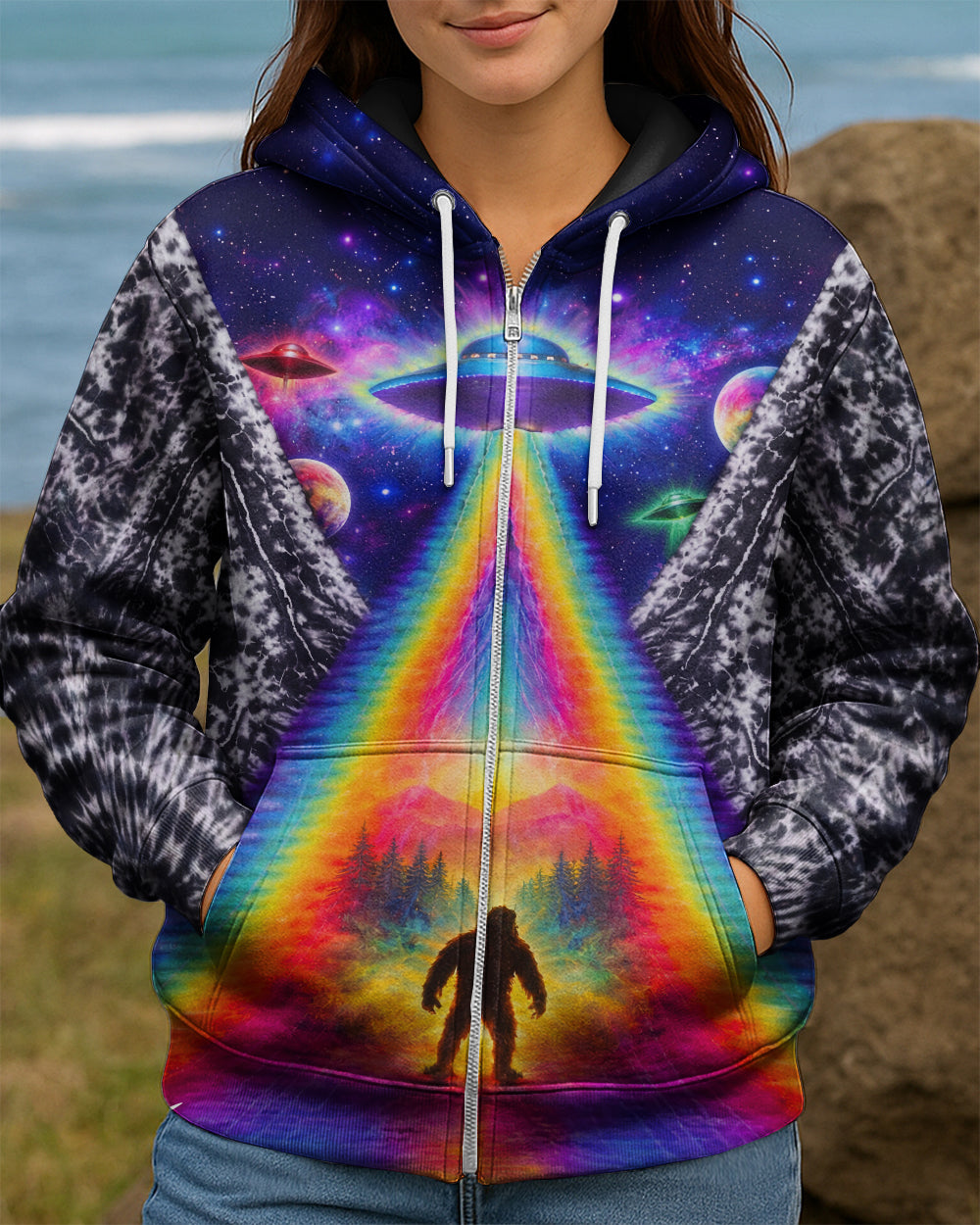 This striking all-over print design merges outdoor adventure with cosmic intrigue, featuring a UFO projecting a luminous rainbow beam across a solitary Bigfoot silhouette nestled within dense forest. The composition layers a glowing spacecraft against a mysterious night sky and wilderness landscape, creating a narrative that captivates both nature enthusiasts and those drawn to unexplained phenomena. The design speaks to a specific audience—seasoned campers, nocturnal explorers, and those fascinated by cryptid lore—offering wearable storytelling that celebrates the intersection of wilderness exploration and the enigmatic unknown. Perfect for anyone who appreciates outdoor culture with an imaginative, otherworldly edge.