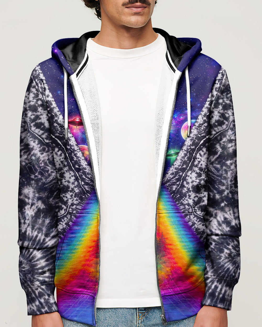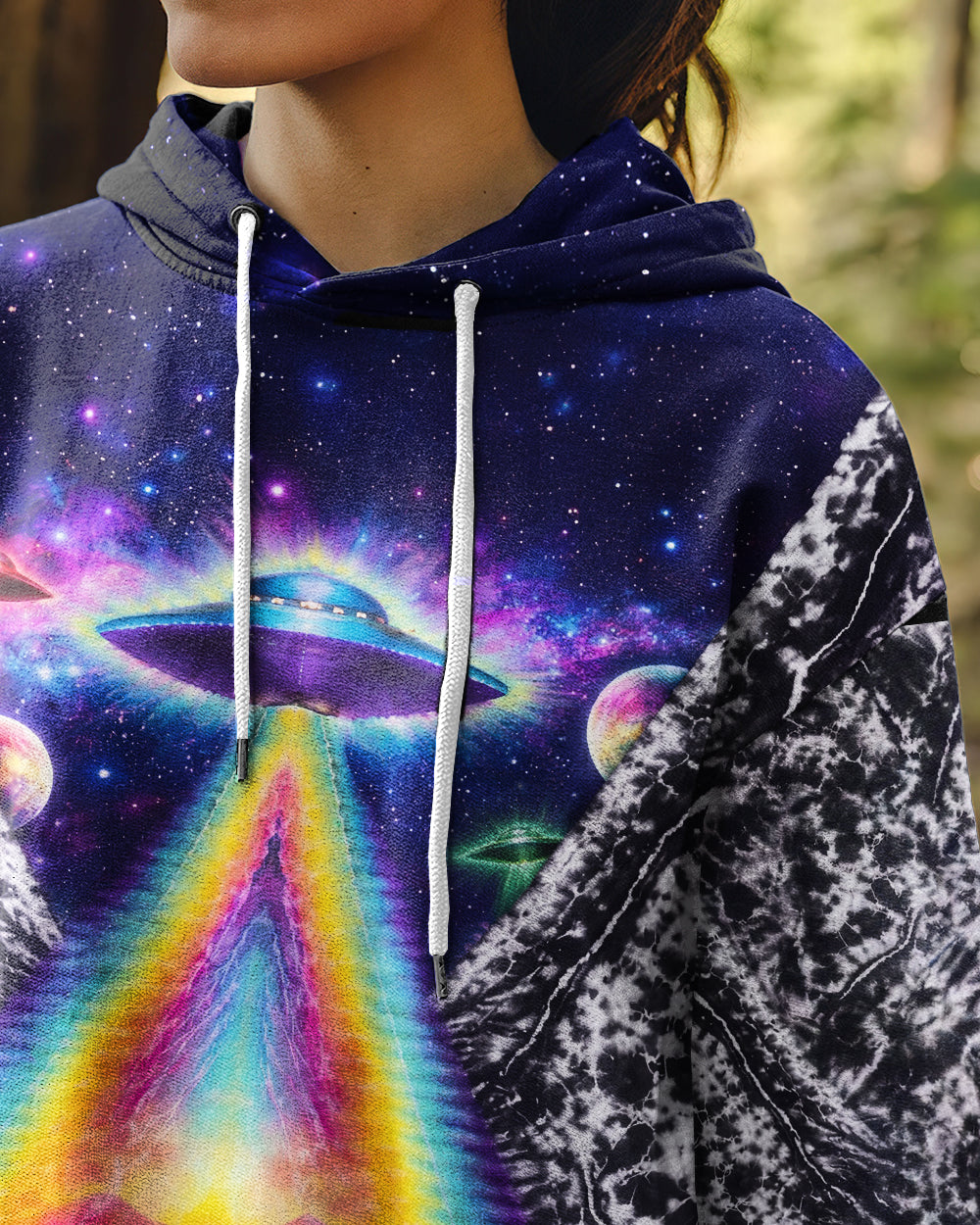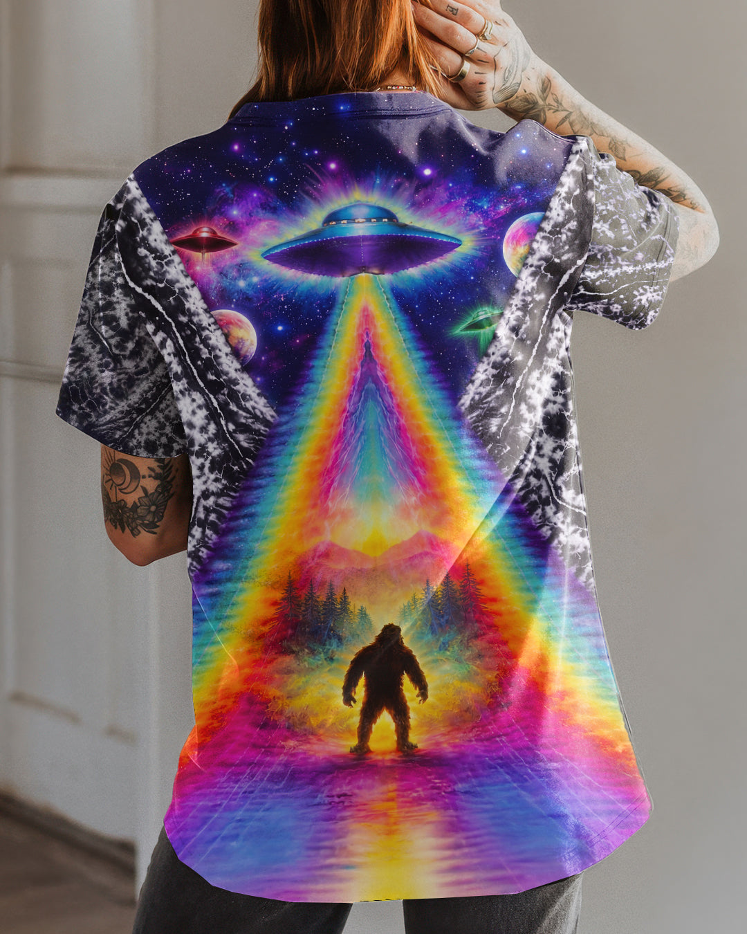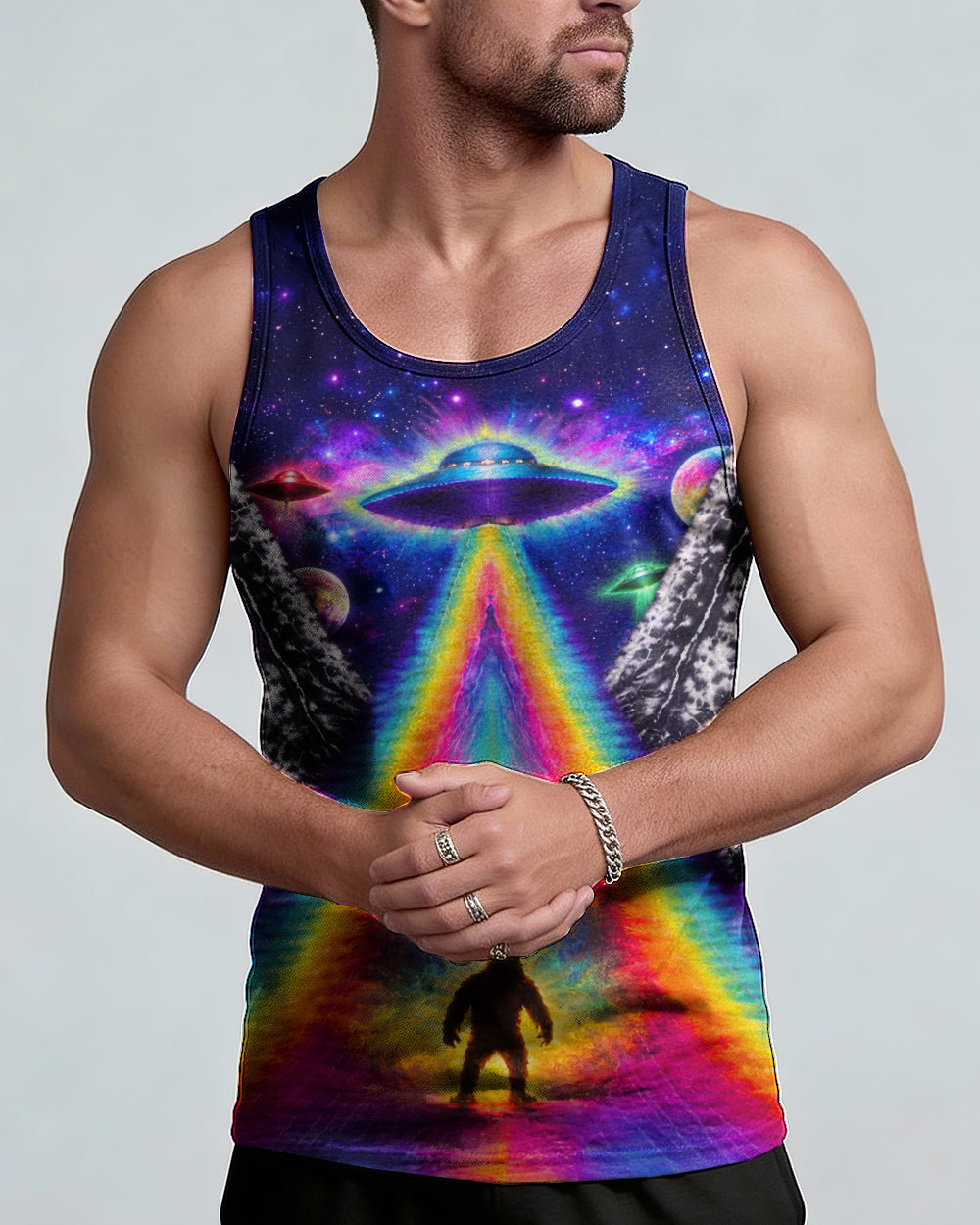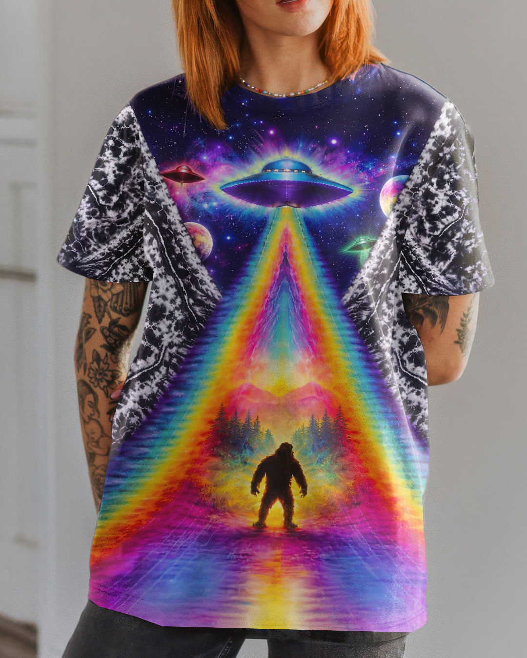 This striking all-over print design merges outdoor adventure with cosmic intrigue, featuring a UFO projecting a luminous rainbow beam across a solitary Bigfoot silhouette nestled within dense forest. The composition layers a glowing spacecraft against a mysterious night sky and wilderness landscape, creating a narrative that captivates both nature enthusiasts and those drawn to unexplained phenomena. The design speaks to a specific audience—seasoned campers, nocturnal explorers, and those fascinated by cryptid lore—offering wearable storytelling that celebrates the intersection of wilderness exploration and the enigmatic unknown. Perfect for anyone who appreciates outdoor culture with an imaginative, otherworldly edge.