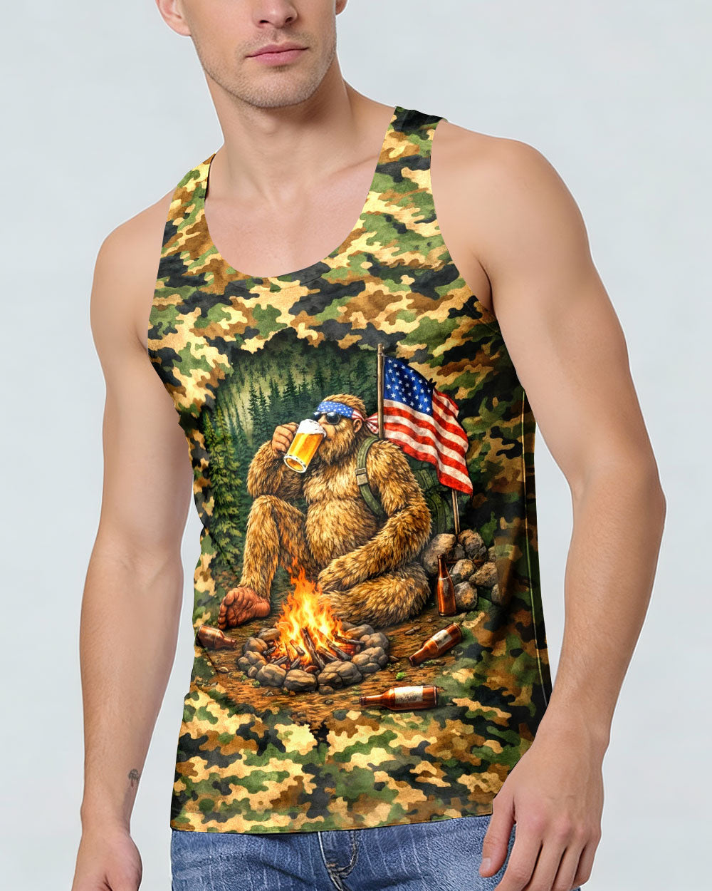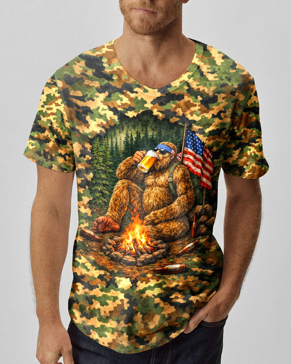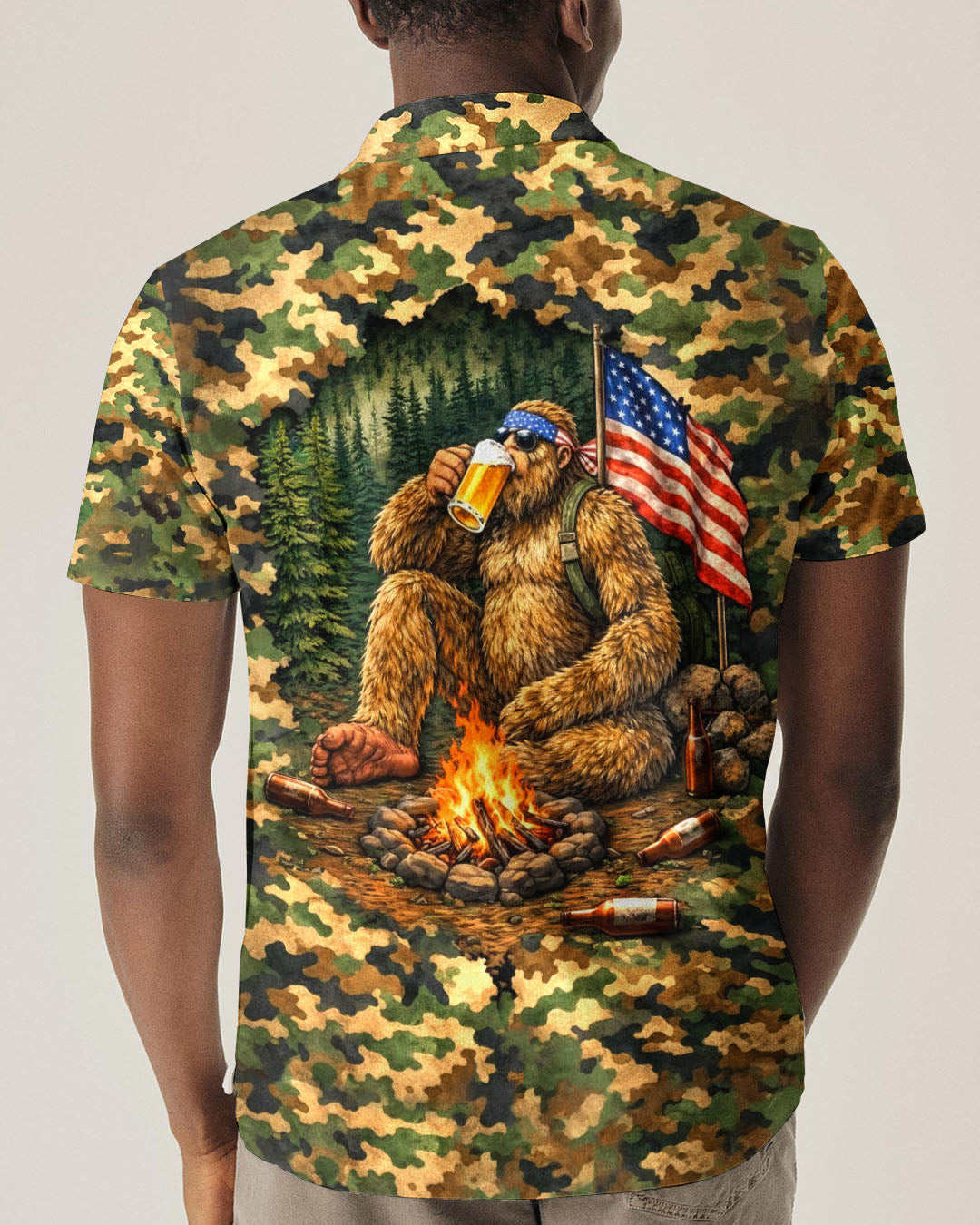 Embrace the wild with this bold all-over print shirt featuring Bigfoot relaxing by a campfire in striking camouflage design. Perfect for outdoor enthusiasts and adventure seekers, this tee combines humor, mystery, and rugged wilderness spirit. Crafted from a premium cotton/polyester and spandex blend, each shirt is individually printed and cut for vibrant, high-definition color that captures every detail. The dye-sublimation printing technique ensures durability and a comfortable fit that feels as good as it looks. Whether you're camping under the stars or celebrating the legendary tales of the woods, this shirt lets your outdoor pride shine through with style and personality.