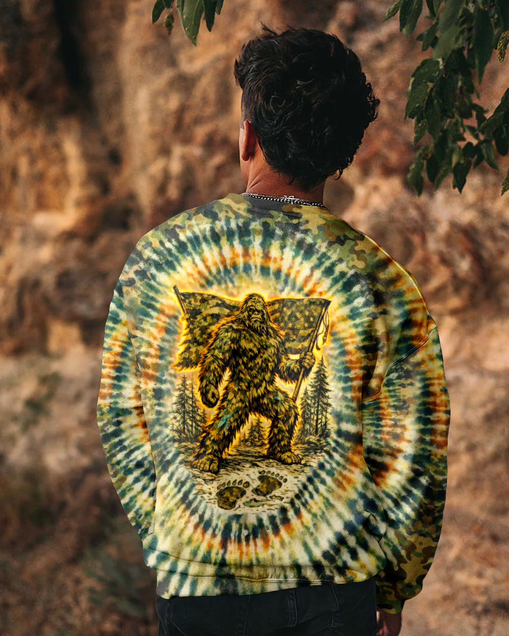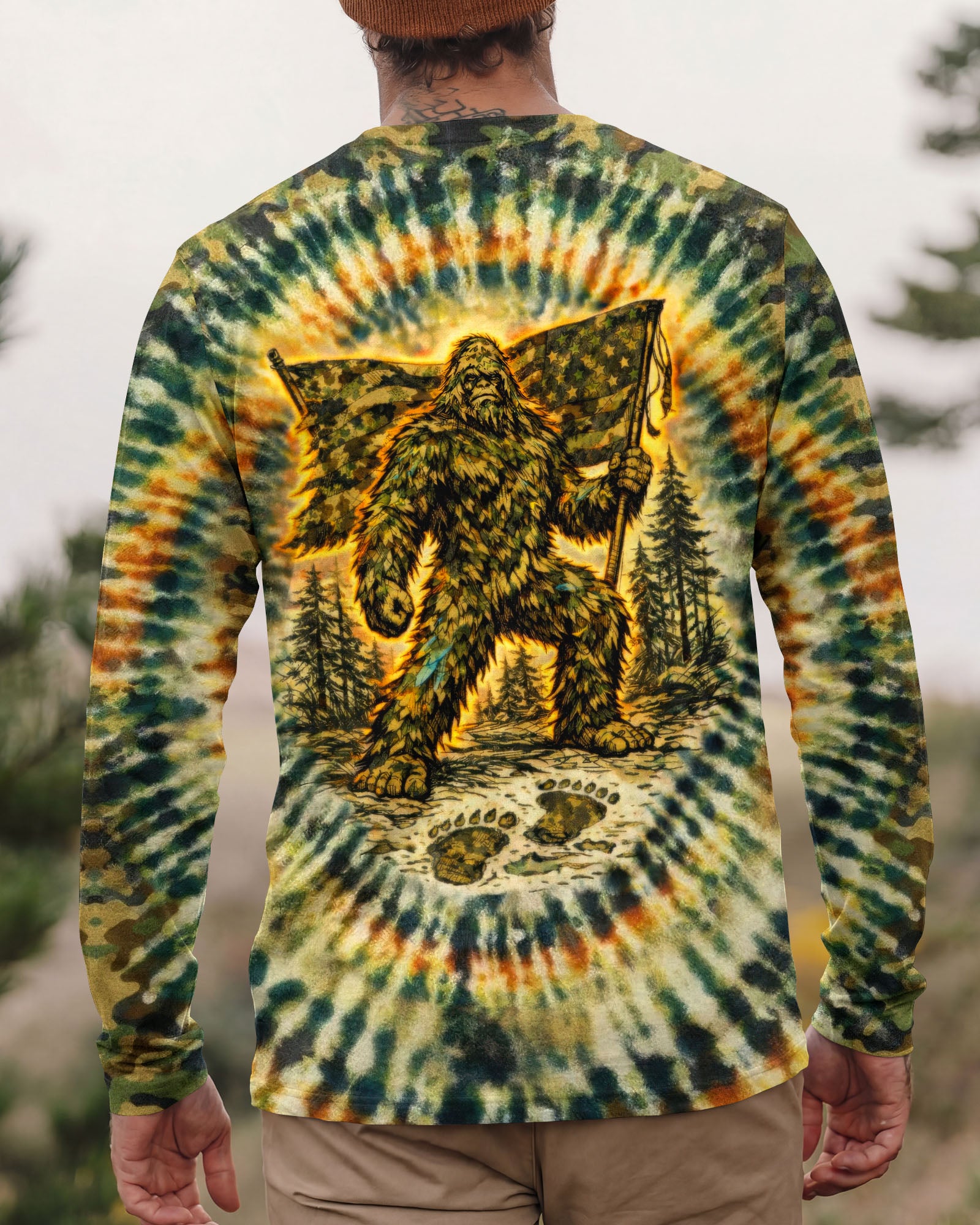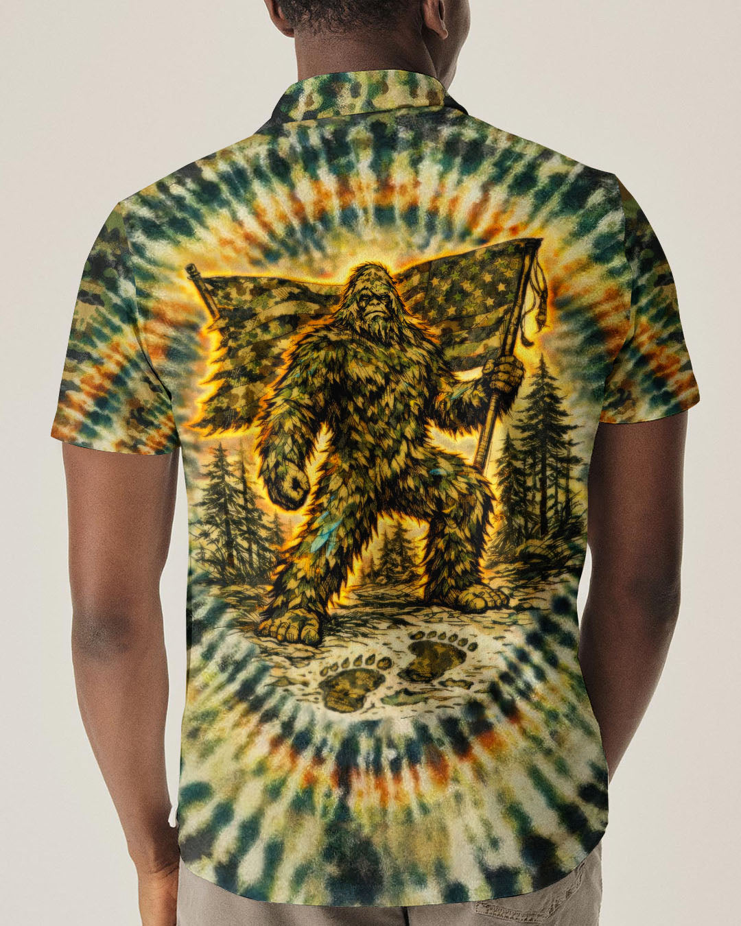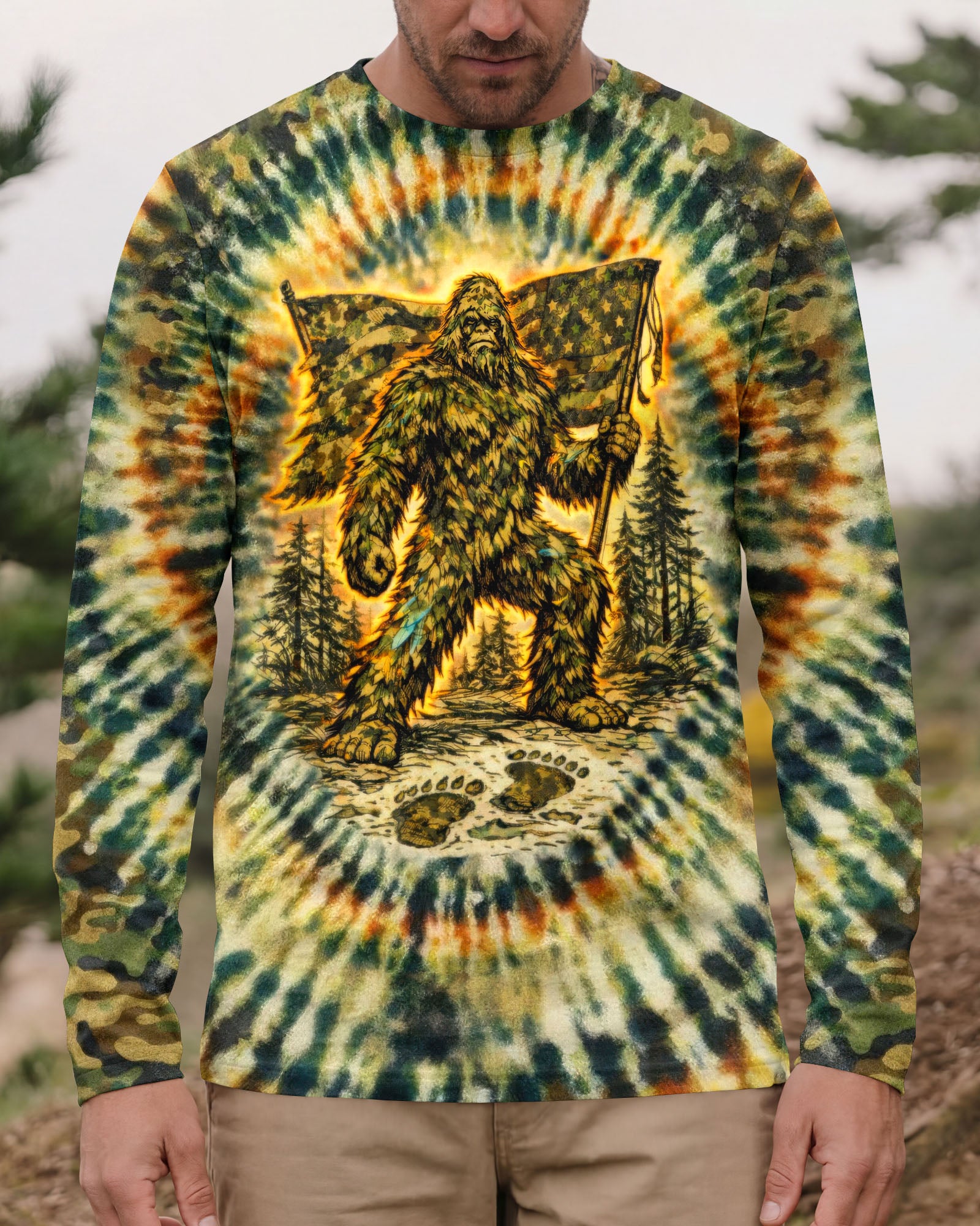 A legendary figure strides through the wild with bold patriotism, blending mystery and American pride in one striking design. Created for adventurous spirits, it celebrates freedom, independence, and a love for the untamed outdoors. The camouflage background adds a rugged edge, perfect for those who embrace both wilderness and country. The quote represents fearless individuality—standing tall, living free, and honoring what you believe in. Our all-over print shirts feature expertly crafted 3D dye-sublimation printing that brings vibrant, intricate designs to life. Each panel is individually printed, cut, and sewn for flawless graphics with no imperfections. Made from a premium cotton/polyester and spandex blend, these shirts deliver comfort, durability, and high-definition color that stands out wherever you go. Wear it like a work of art.