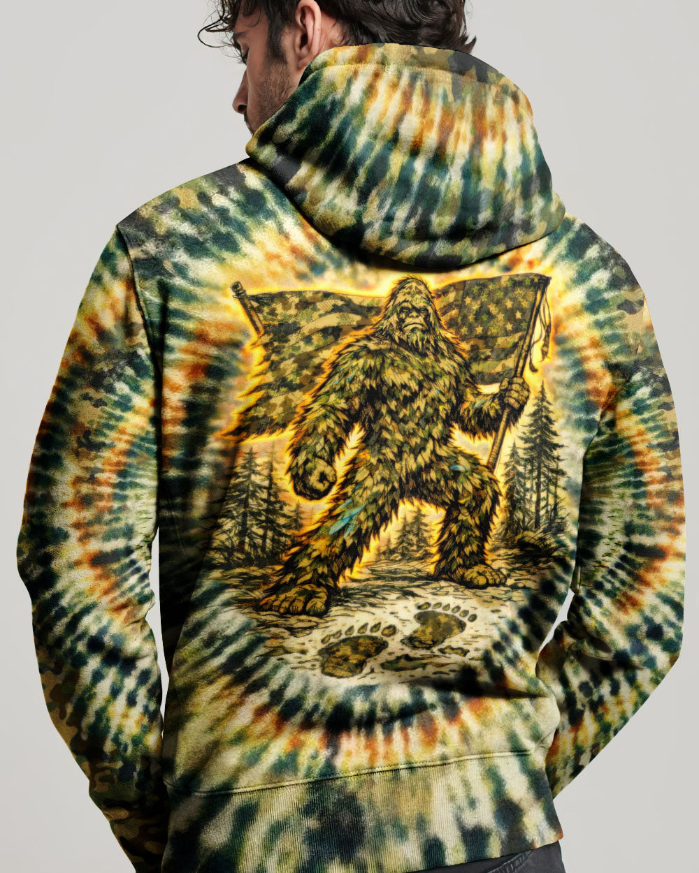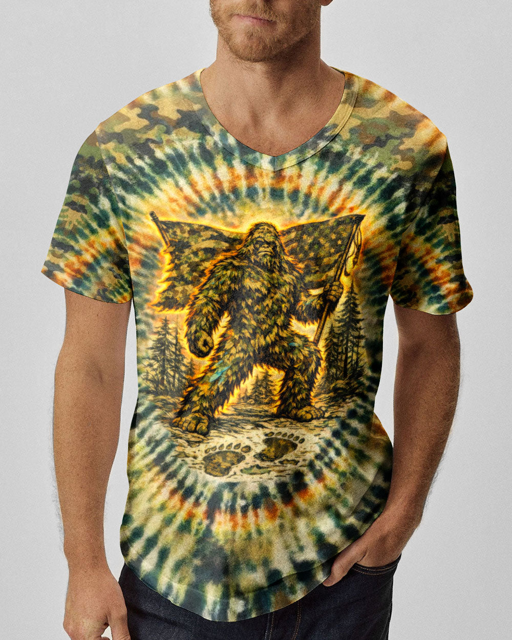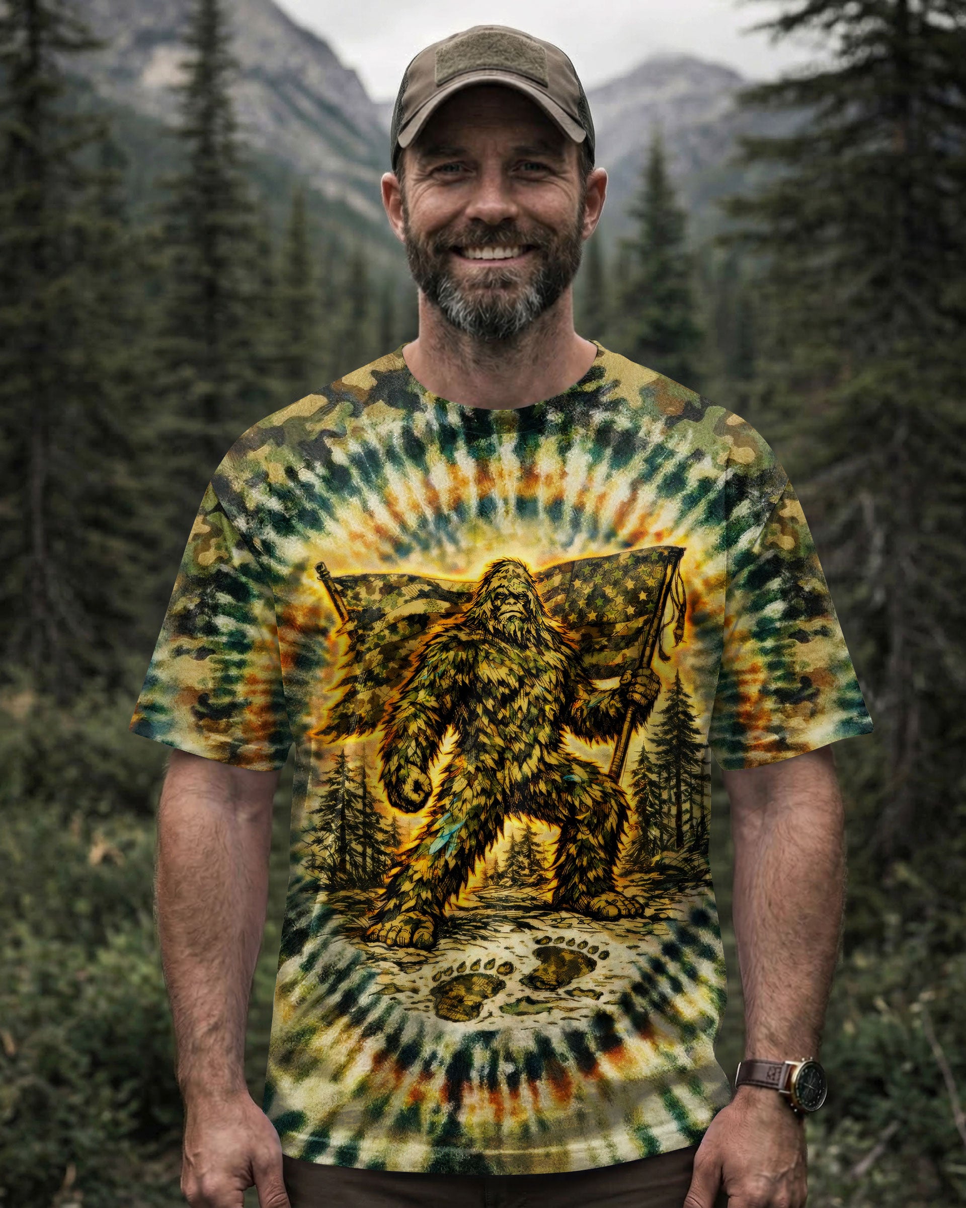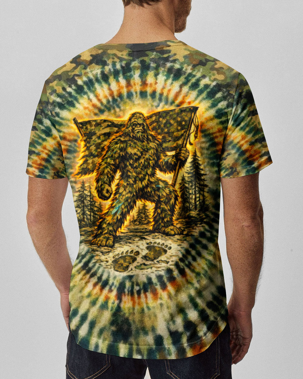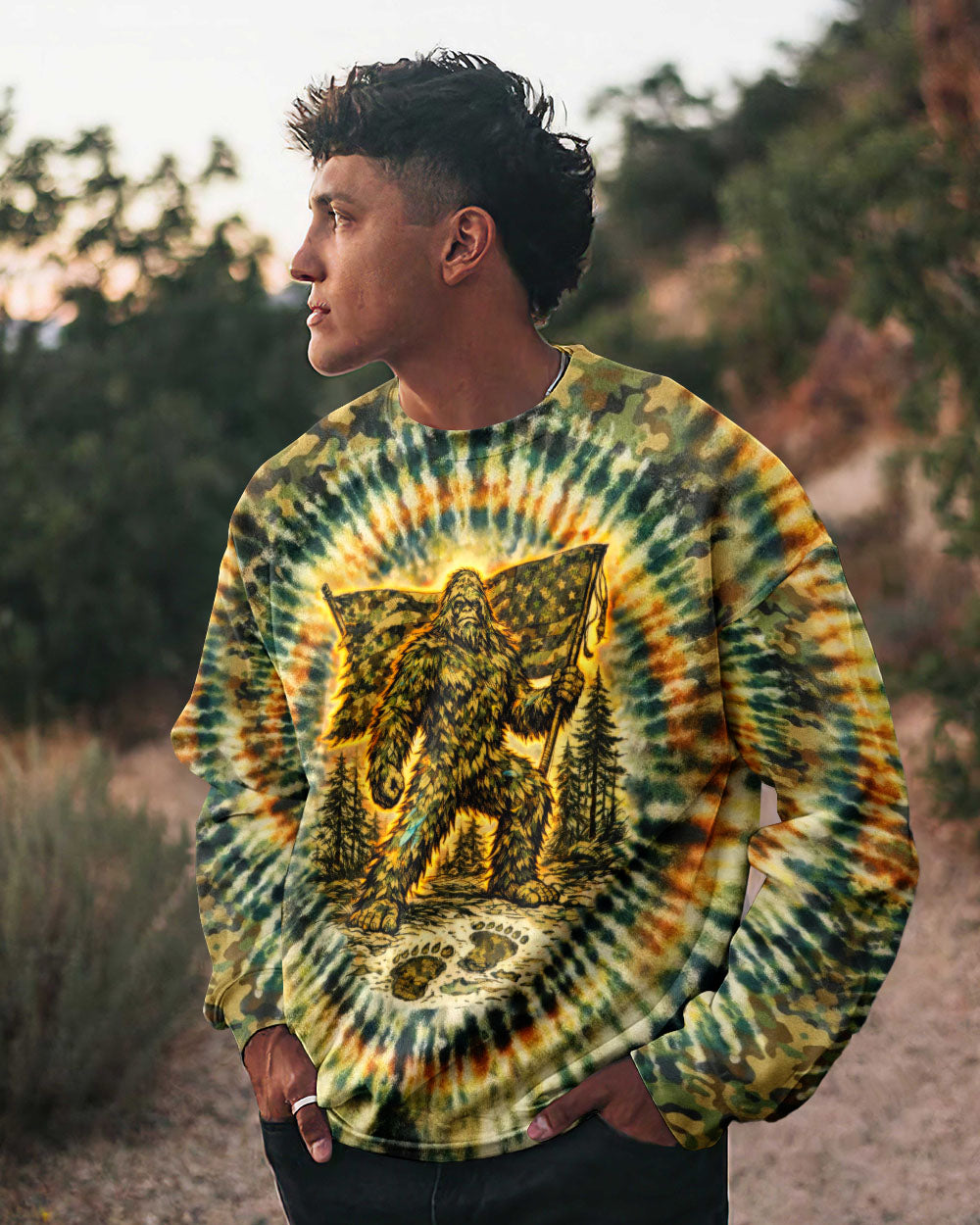 A legendary figure strides through the wild with bold patriotism, blending mystery and American pride in one striking design. Created for adventurous spirits, it celebrates freedom, independence, and a love for the untamed outdoors. The camouflage background adds a rugged edge, perfect for those who embrace both wilderness and country. The quote represents fearless individuality—standing tall, living free, and honoring what you believe in. Our all-over print shirts feature expertly crafted 3D dye-sublimation printing that brings vibrant, intricate designs to life. Each panel is individually printed, cut, and sewn for flawless graphics with no imperfections. Made from a premium cotton/polyester and spandex blend, these shirts deliver comfort, durability, and high-definition color that stands out wherever you go. Wear it like a work of art.