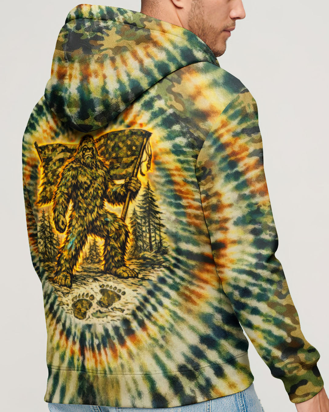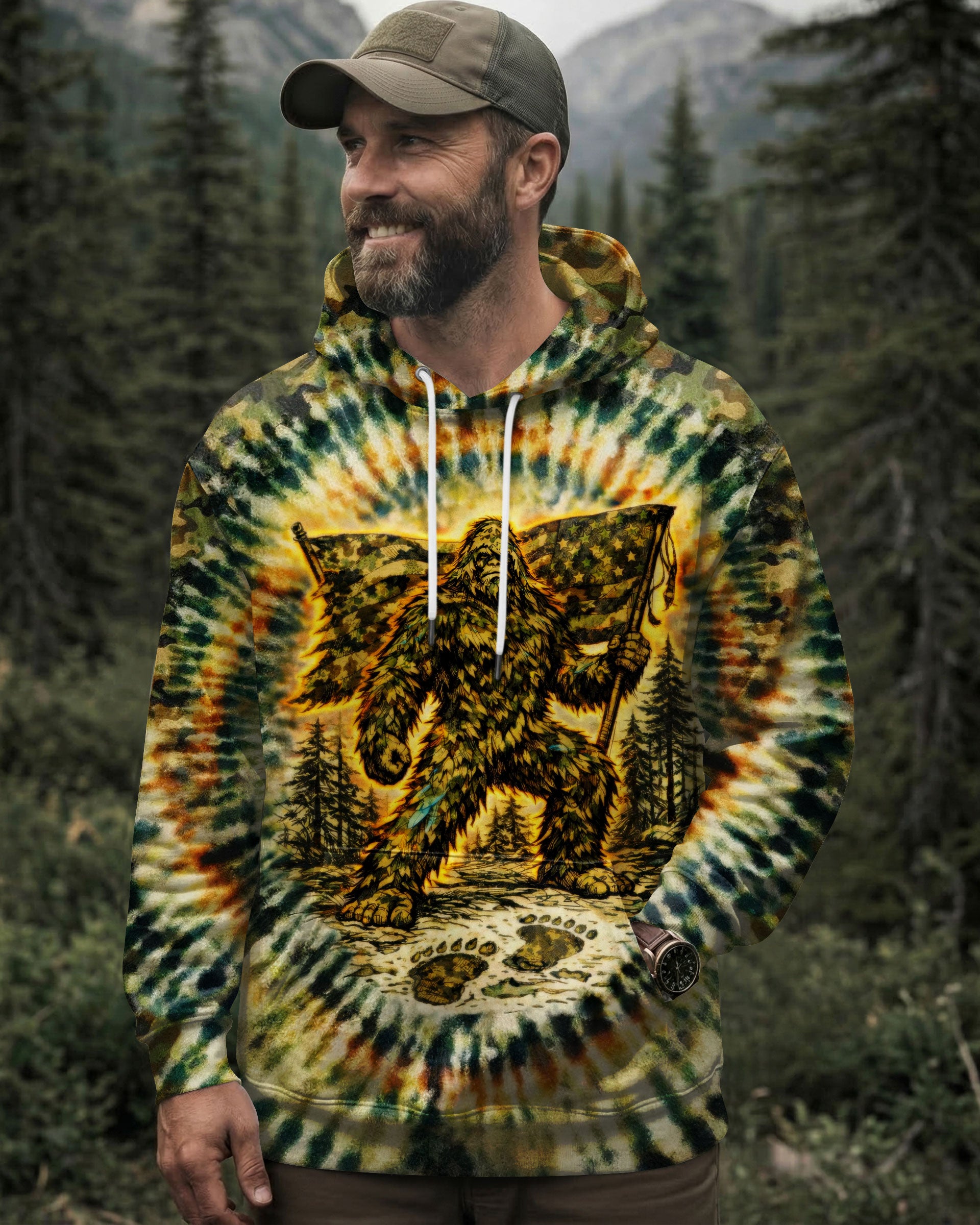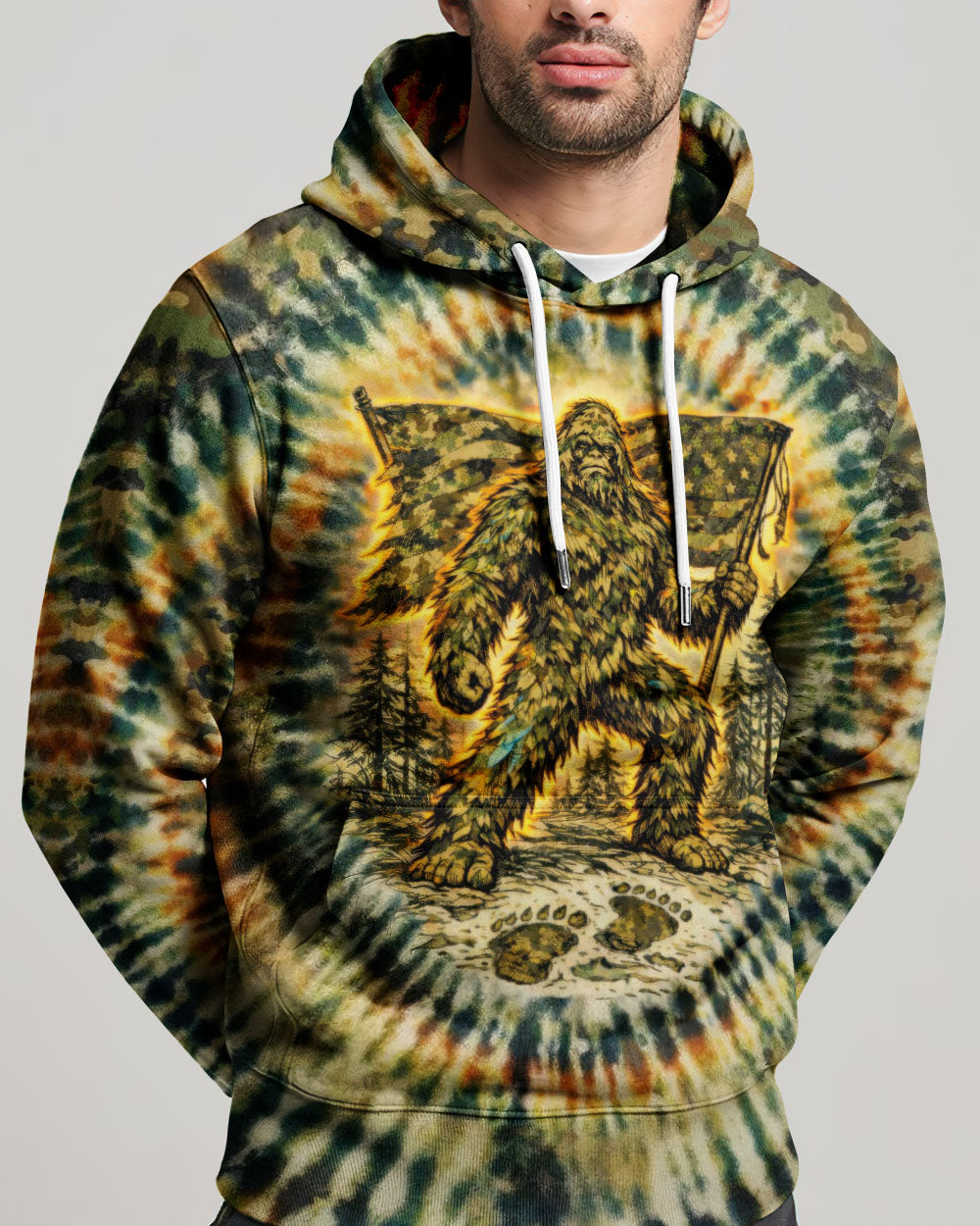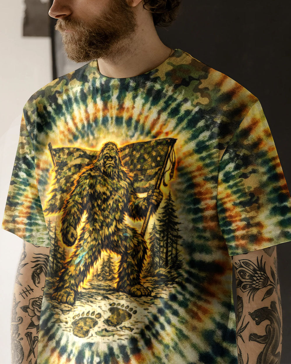 A legendary figure strides through the wild with bold patriotism, blending mystery and American pride in one striking design. Created for adventurous spirits, it celebrates freedom, independence, and a love for the untamed outdoors. The camouflage background adds a rugged edge, perfect for those who embrace both wilderness and country. The quote represents fearless individuality—standing tall, living free, and honoring what you believe in. Our all-over print shirts feature expertly crafted 3D dye-sublimation printing that brings vibrant, intricate designs to life. Each panel is individually printed, cut, and sewn for flawless graphics with no imperfections. Made from a premium cotton/polyester and spandex blend, these shirts deliver comfort, durability, and high-definition color that stands out wherever you go. Wear it like a work of art.