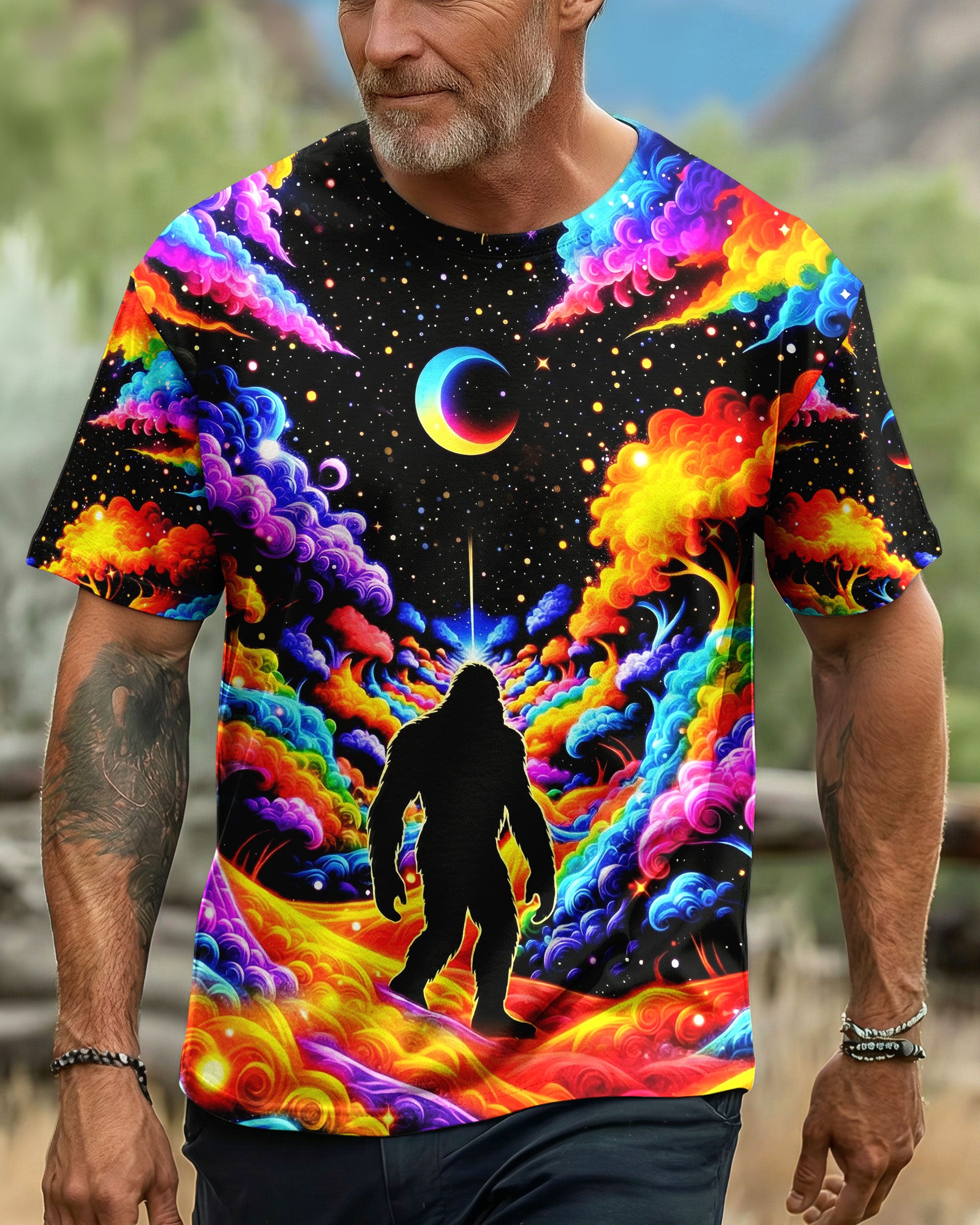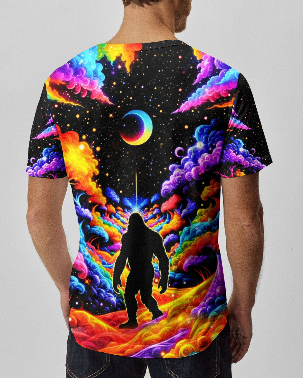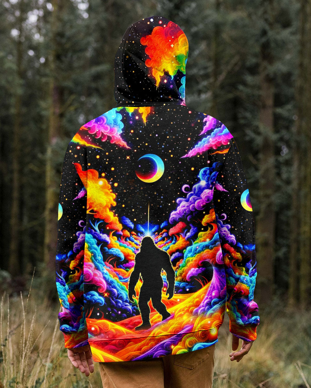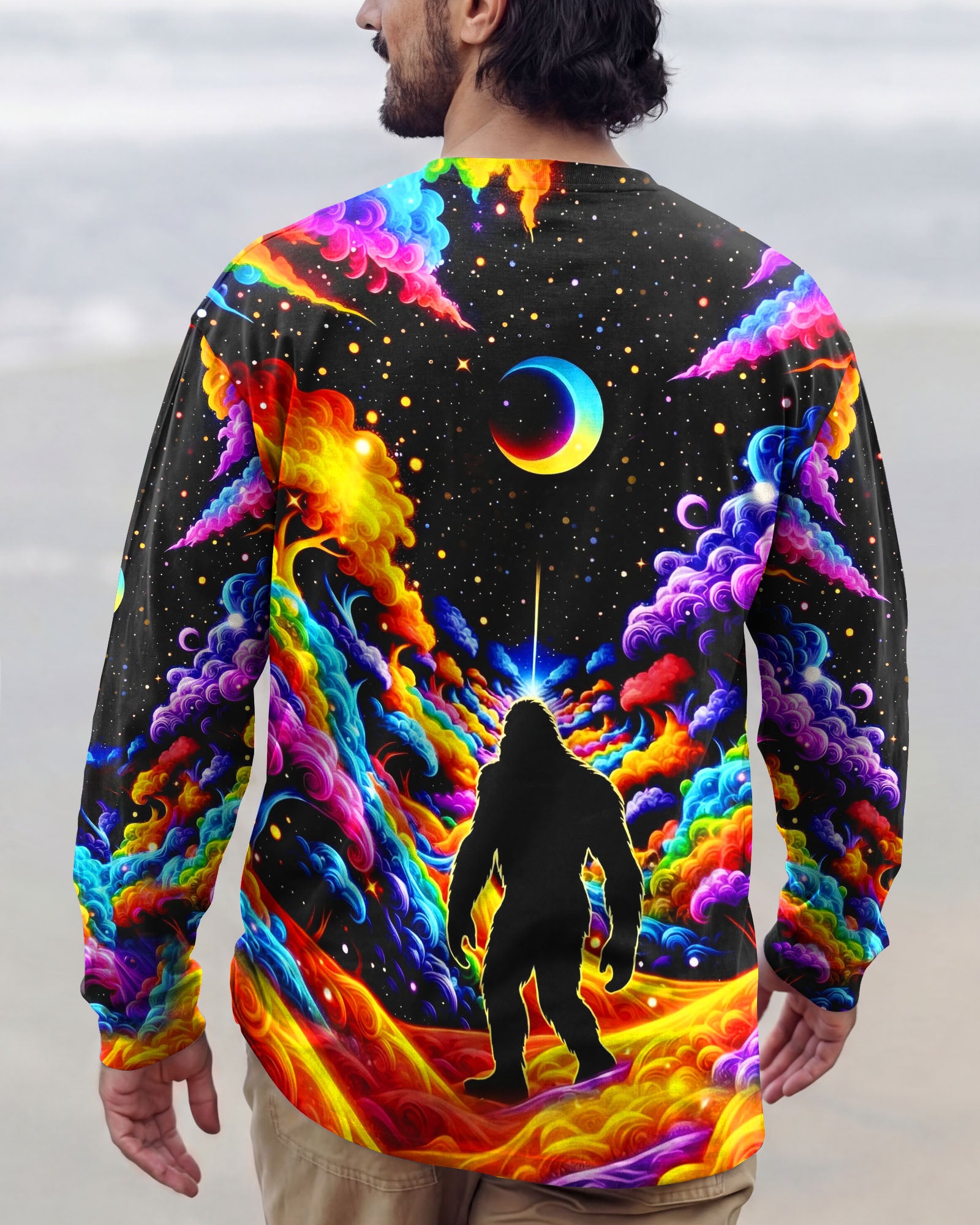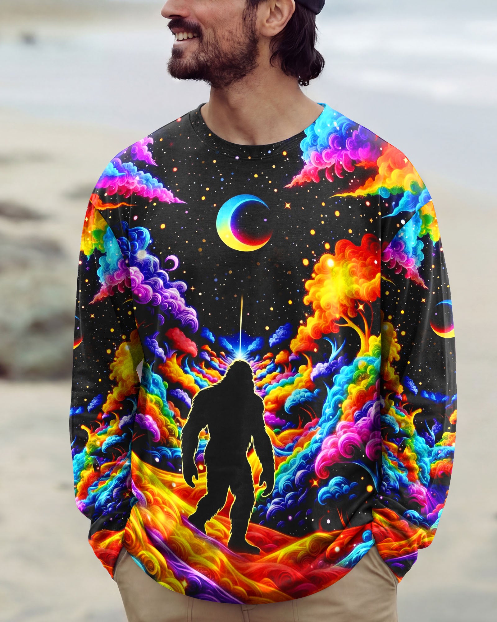 Witness the extraordinary collision of cryptid legend and cosmic wonder with this striking all-over print design. Bigfoot's iconic silhouette emerges against a kaleidoscopic backdrop of swirling galaxies, iridescent clouds, and celestial stars—a visual manifesto for the untamed explorer within. This design transcends conventional nature imagery by merging earthly mystery with infinite possibility, creating a wearable statement that celebrates boundless curiosity and fearless wanderlust. Perfect for those who embrace the unconventional and refuse to be confined by ordinary limits, this piece channels the spirit of adventure into every vibrant, psychedelic detail.