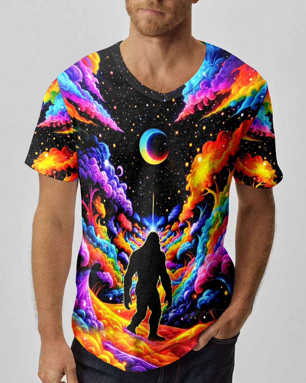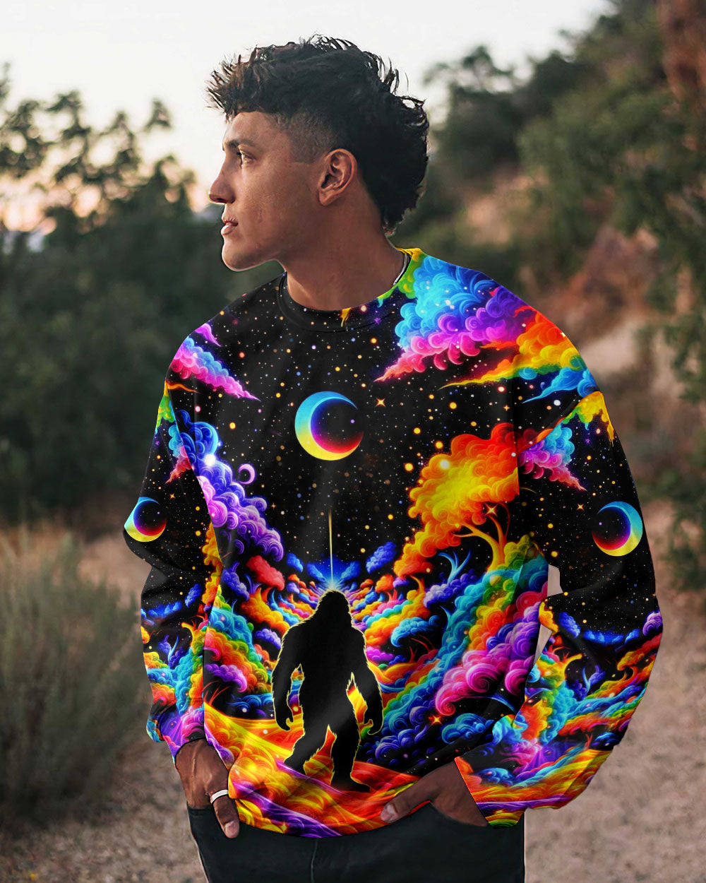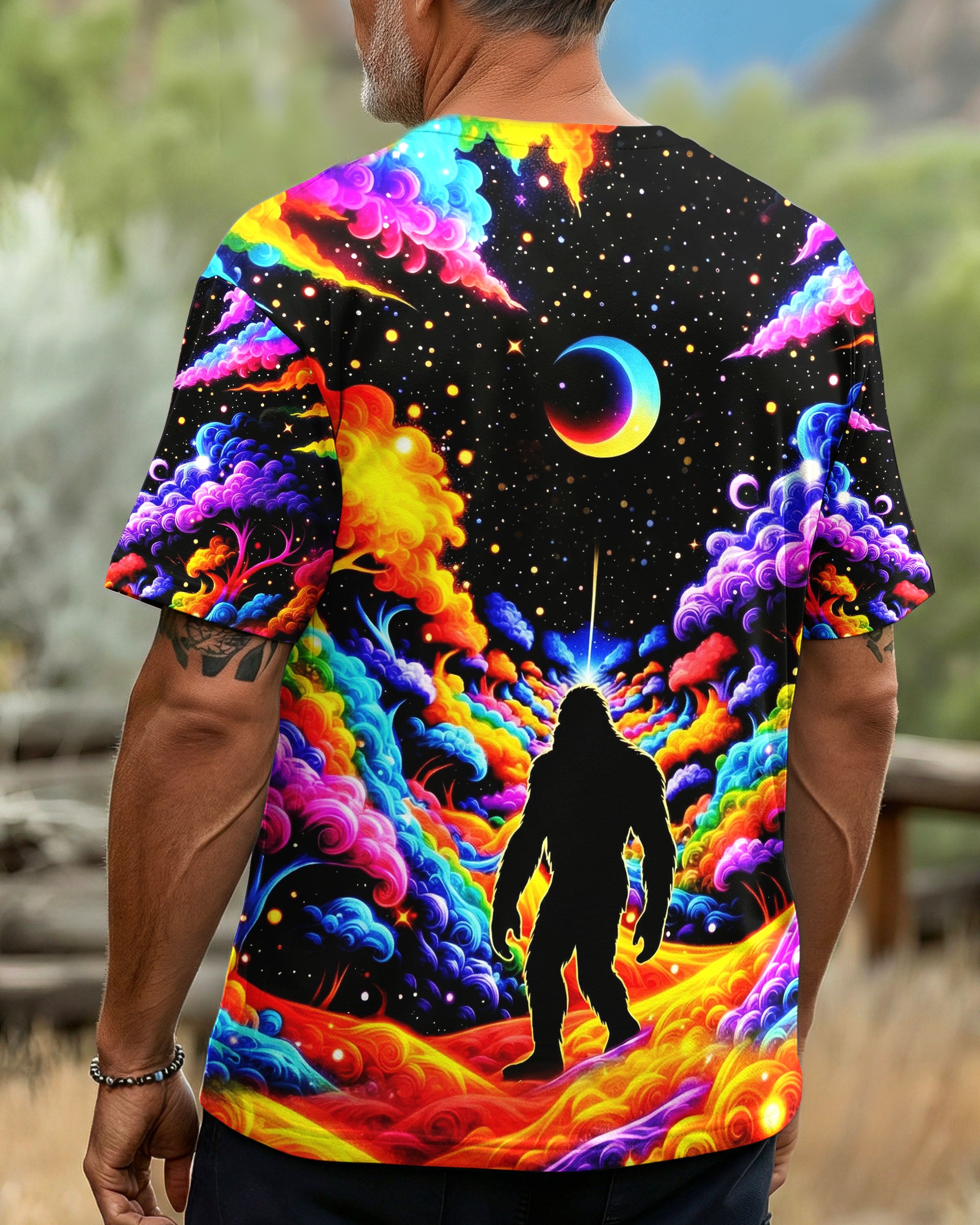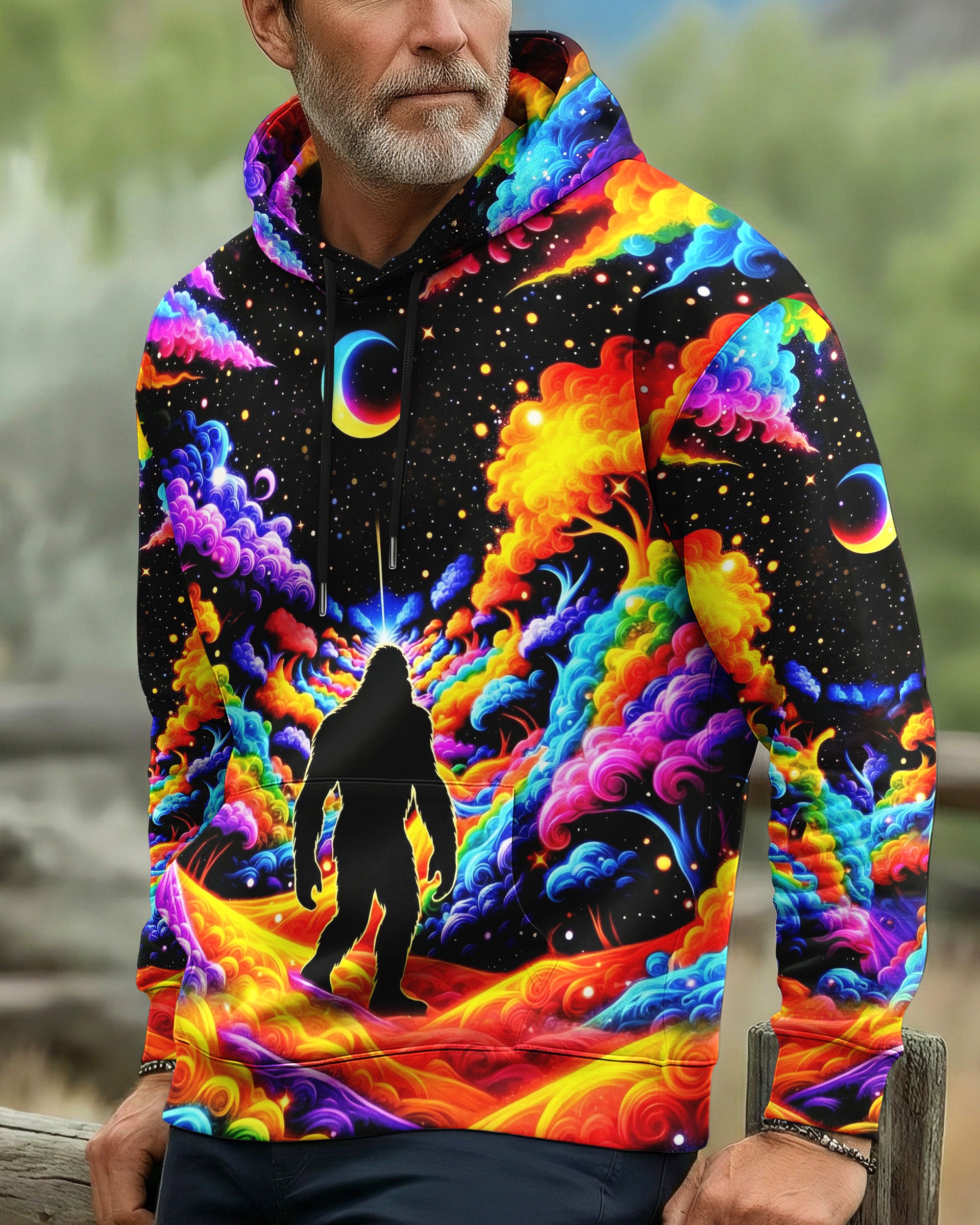 Witness the extraordinary collision of cryptid legend and cosmic wonder with this striking all-over print design. Bigfoot's iconic silhouette emerges against a kaleidoscopic backdrop of swirling galaxies, iridescent clouds, and celestial stars—a visual manifesto for the untamed explorer within. This design transcends conventional nature imagery by merging earthly mystery with infinite possibility, creating a wearable statement that celebrates boundless curiosity and fearless wanderlust. Perfect for those who embrace the unconventional and refuse to be confined by ordinary limits, this piece channels the spirit of adventure into every vibrant, psychedelic detail.