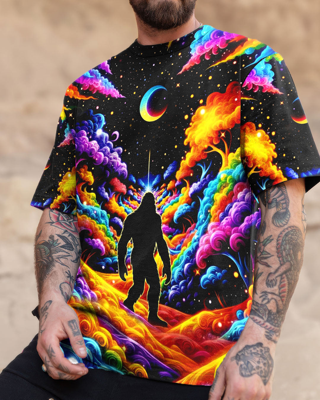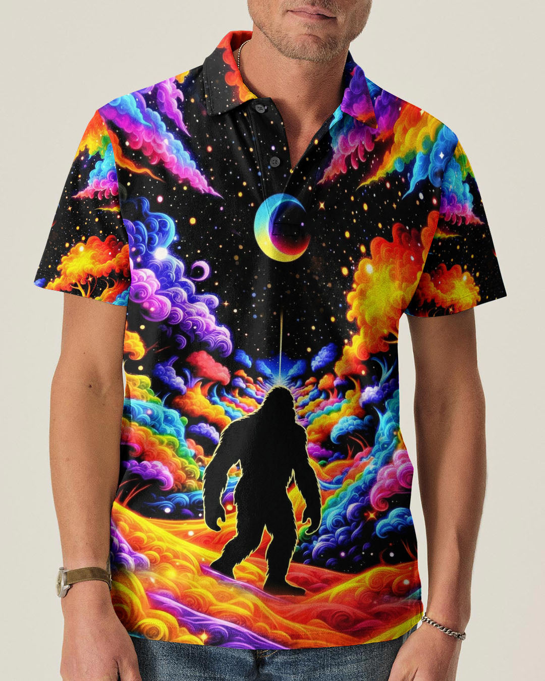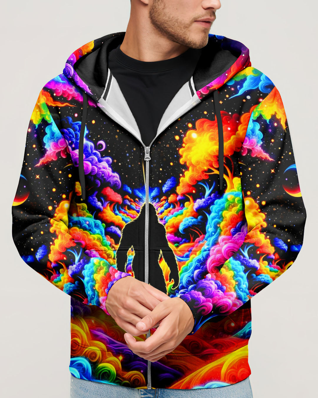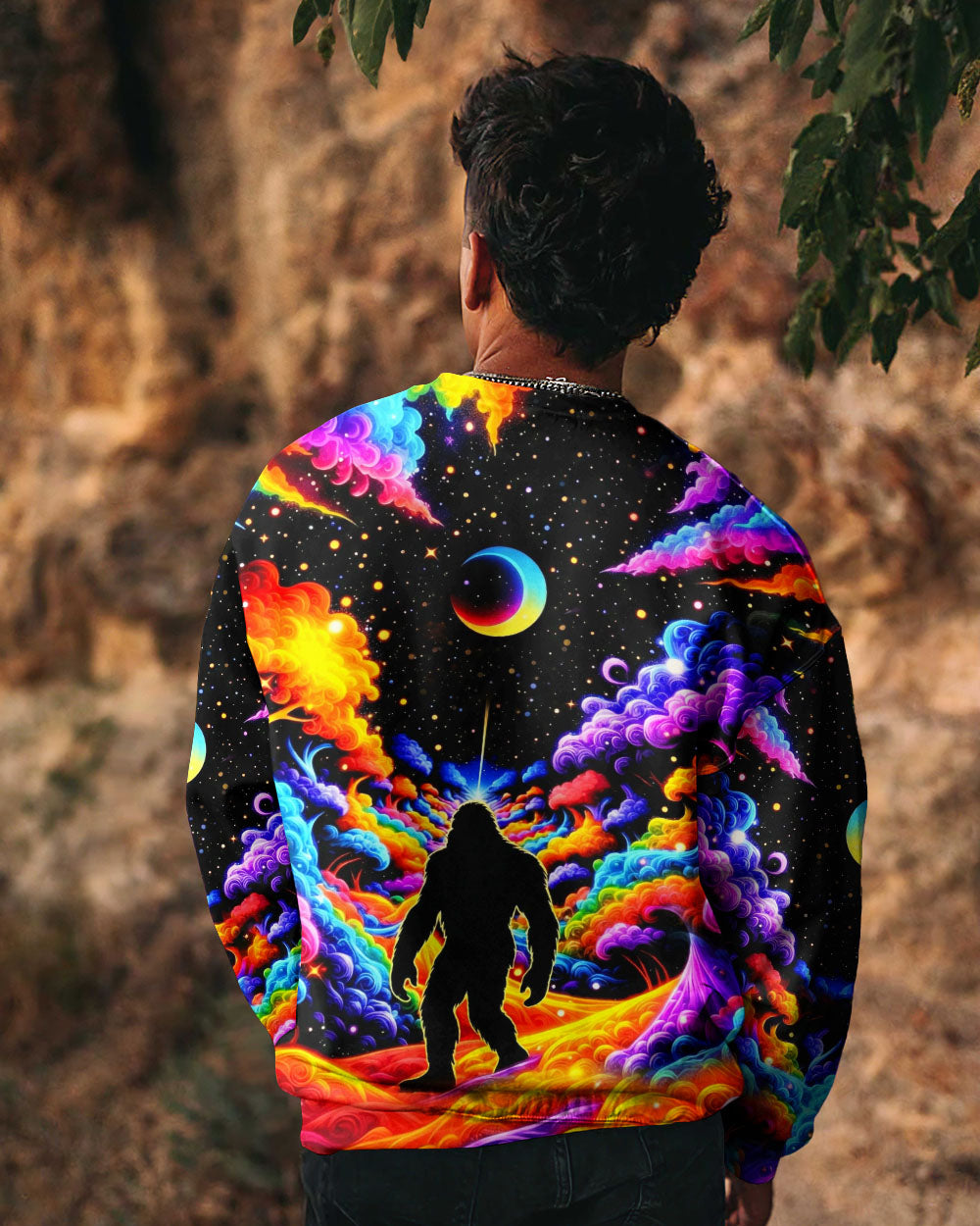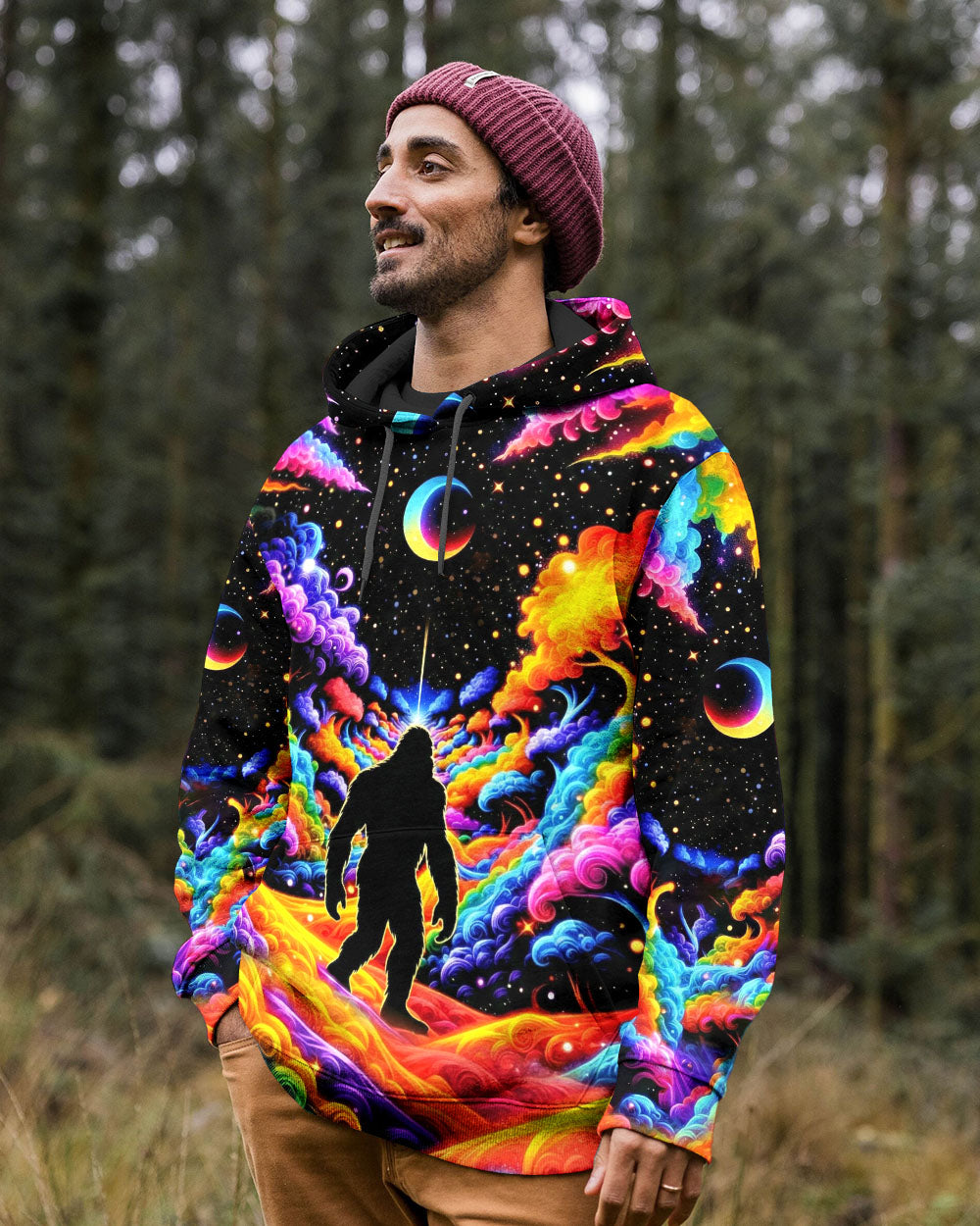 Witness the extraordinary collision of cryptid legend and cosmic wonder with this striking all-over print design. Bigfoot's iconic silhouette emerges against a kaleidoscopic backdrop of swirling galaxies, iridescent clouds, and celestial stars—a visual manifesto for the untamed explorer within. This design transcends conventional nature imagery by merging earthly mystery with infinite possibility, creating a wearable statement that celebrates boundless curiosity and fearless wanderlust. Perfect for those who embrace the unconventional and refuse to be confined by ordinary limits, this piece channels the spirit of adventure into every vibrant, psychedelic detail.