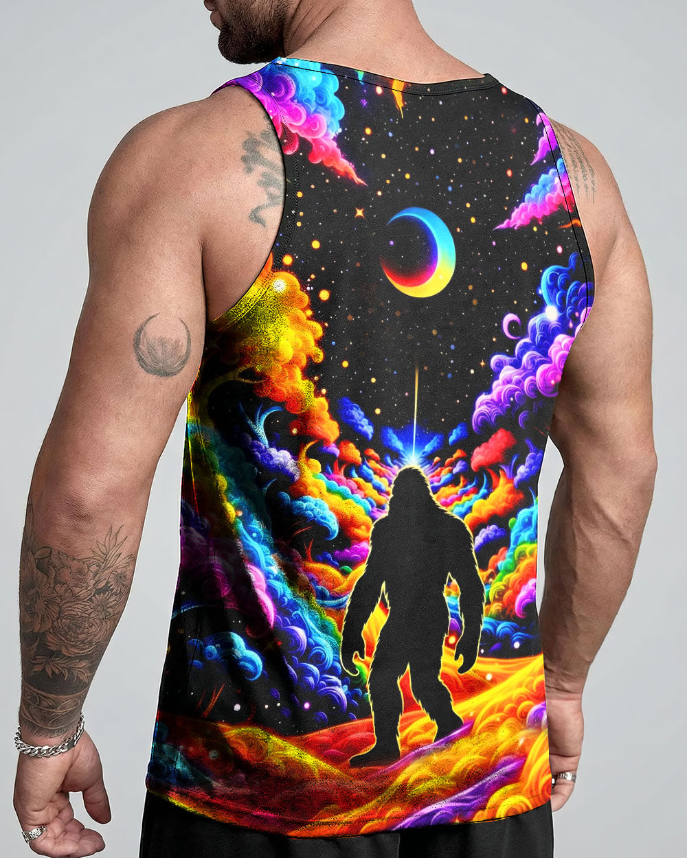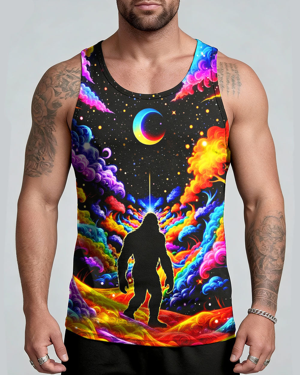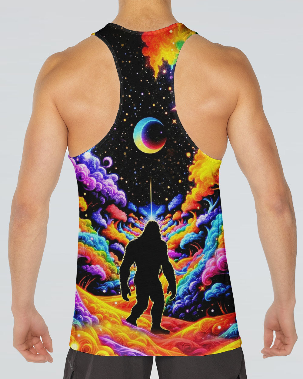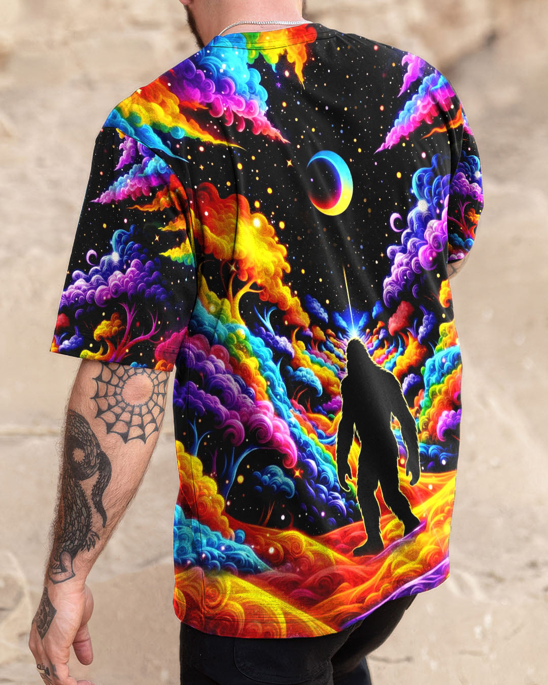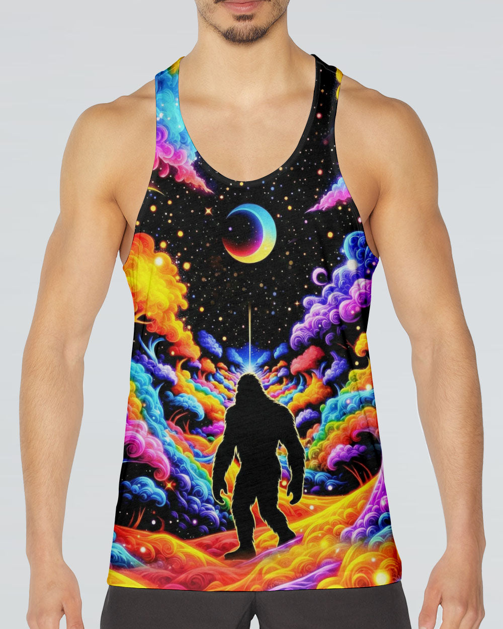 Witness the extraordinary collision of cryptid legend and cosmic wonder with this striking all-over print design. Bigfoot's iconic silhouette emerges against a kaleidoscopic backdrop of swirling galaxies, iridescent clouds, and celestial stars—a visual manifesto for the untamed explorer within. This design transcends conventional nature imagery by merging earthly mystery with infinite possibility, creating a wearable statement that celebrates boundless curiosity and fearless wanderlust. Perfect for those who embrace the unconventional and refuse to be confined by ordinary limits, this piece channels the spirit of adventure into every vibrant, psychedelic detail.