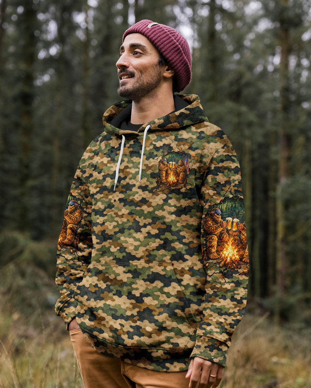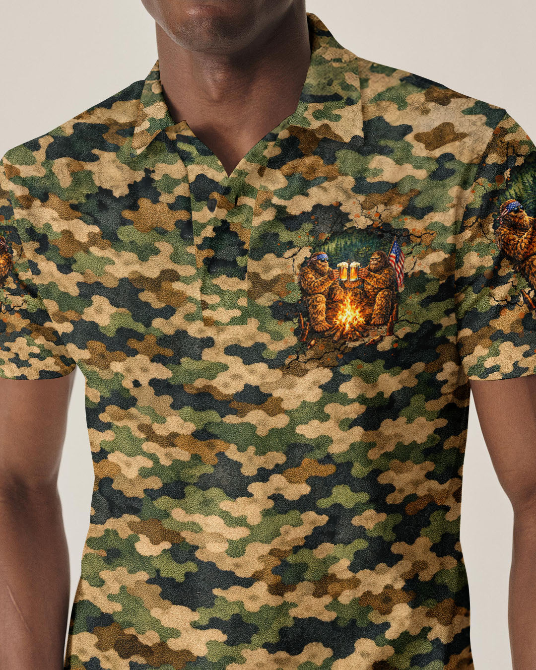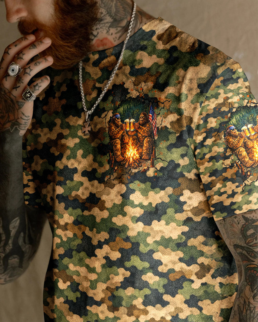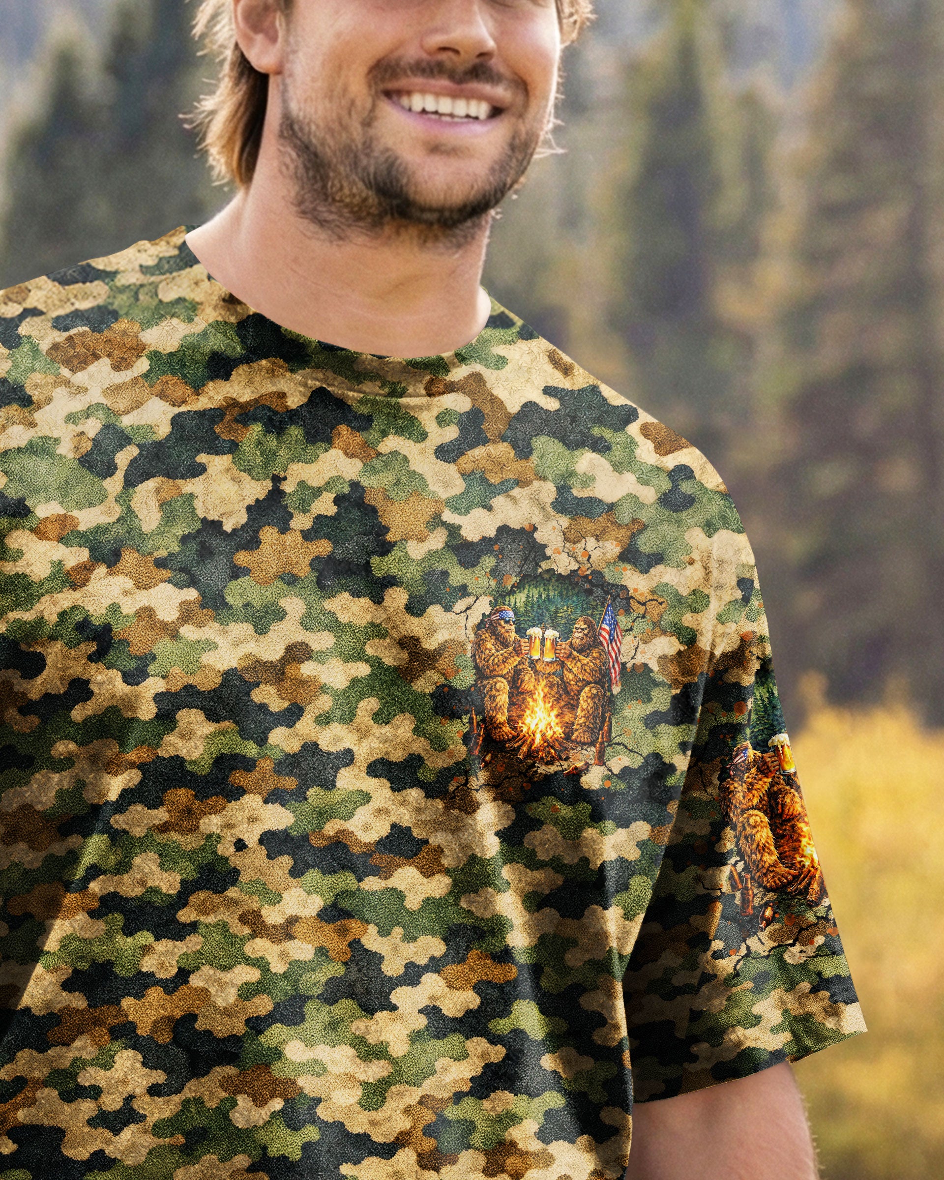 Gather around the campfire with this whimsical design celebrating friendship and outdoor adventure. Two cheerful Bigfoot companions share cold beers beneath the stars, embodying the spirit of slowing down and savoring life's best moments in nature. The camo swirl pattern merges rugged mountain aesthetics with playful charm, creating a look that feels authentically at home in the wilderness. Perfect for those who understand that the greatest memories aren't found on screens—they're built around crackling fires, genuine laughter, and the kind of nights that become legendary stories. Wear your love of the outdoors and the bonds forged in the wild.