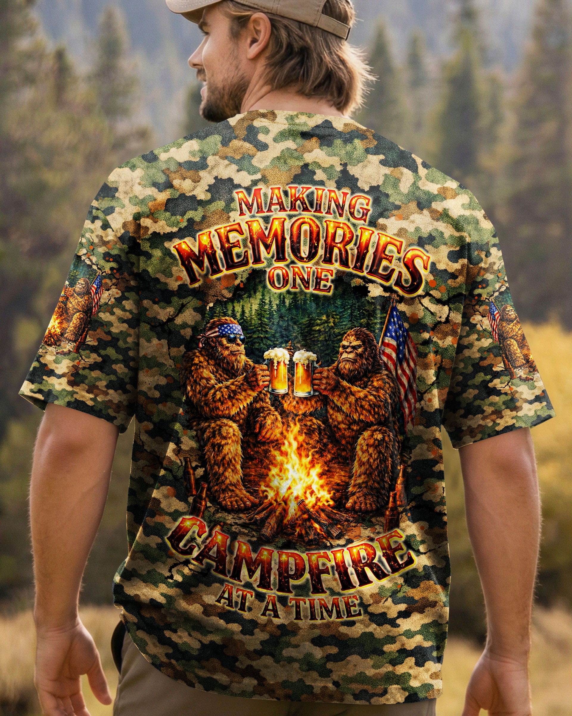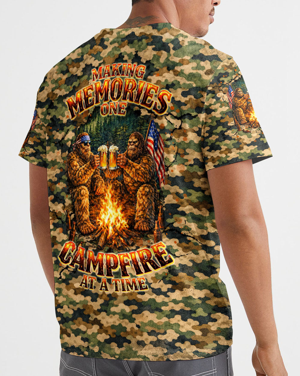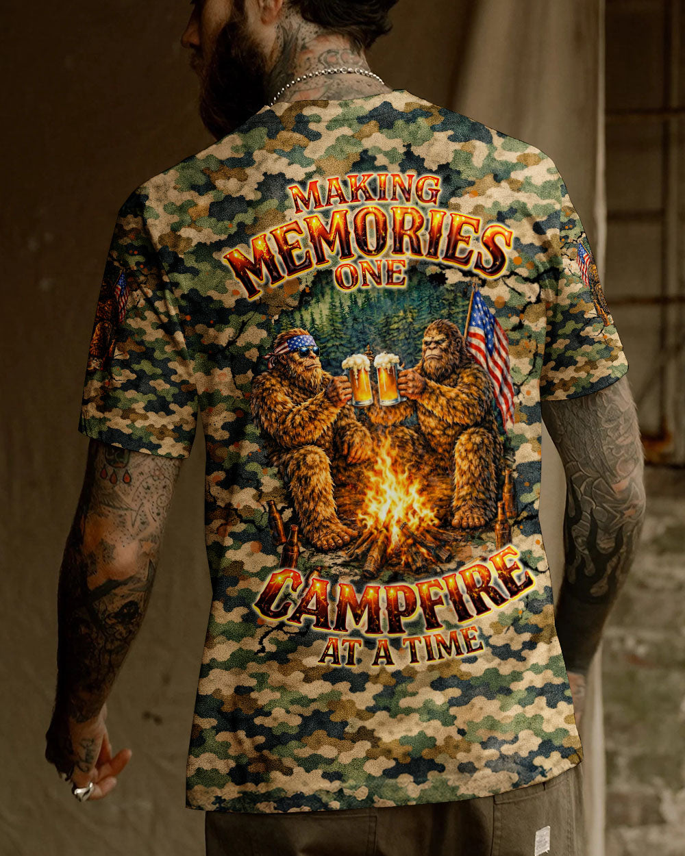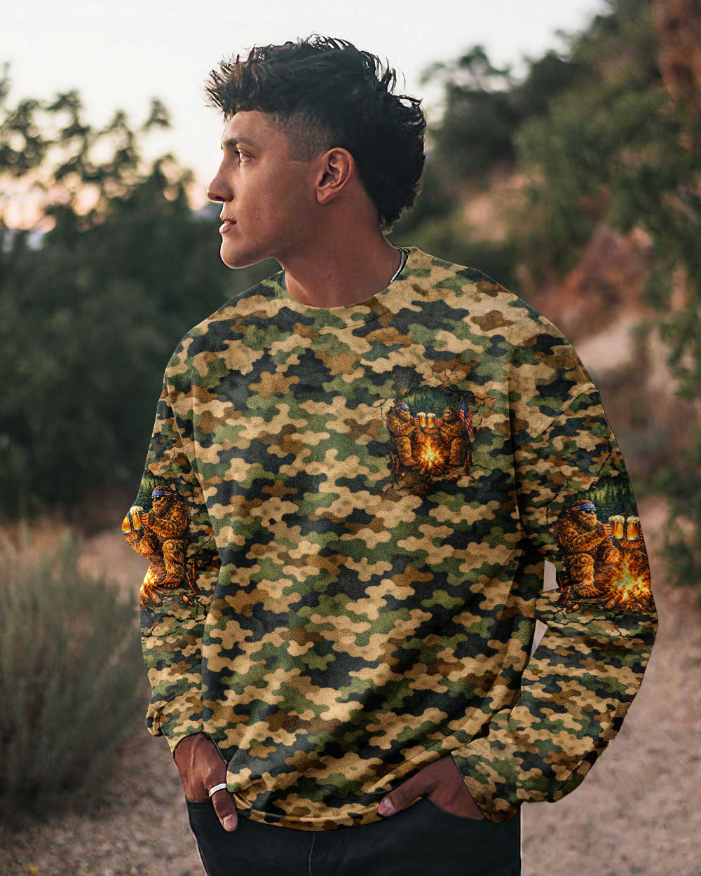 Gather around the campfire with this whimsical design celebrating friendship and outdoor adventure. Two cheerful Bigfoot companions share cold beers beneath the stars, embodying the spirit of slowing down and savoring life's best moments in nature. The camo swirl pattern merges rugged mountain aesthetics with playful charm, creating a look that feels authentically at home in the wilderness. Perfect for those who understand that the greatest memories aren't found on screens—they're built around crackling fires, genuine laughter, and the kind of nights that become legendary stories. Wear your love of the outdoors and the bonds forged in the wild.