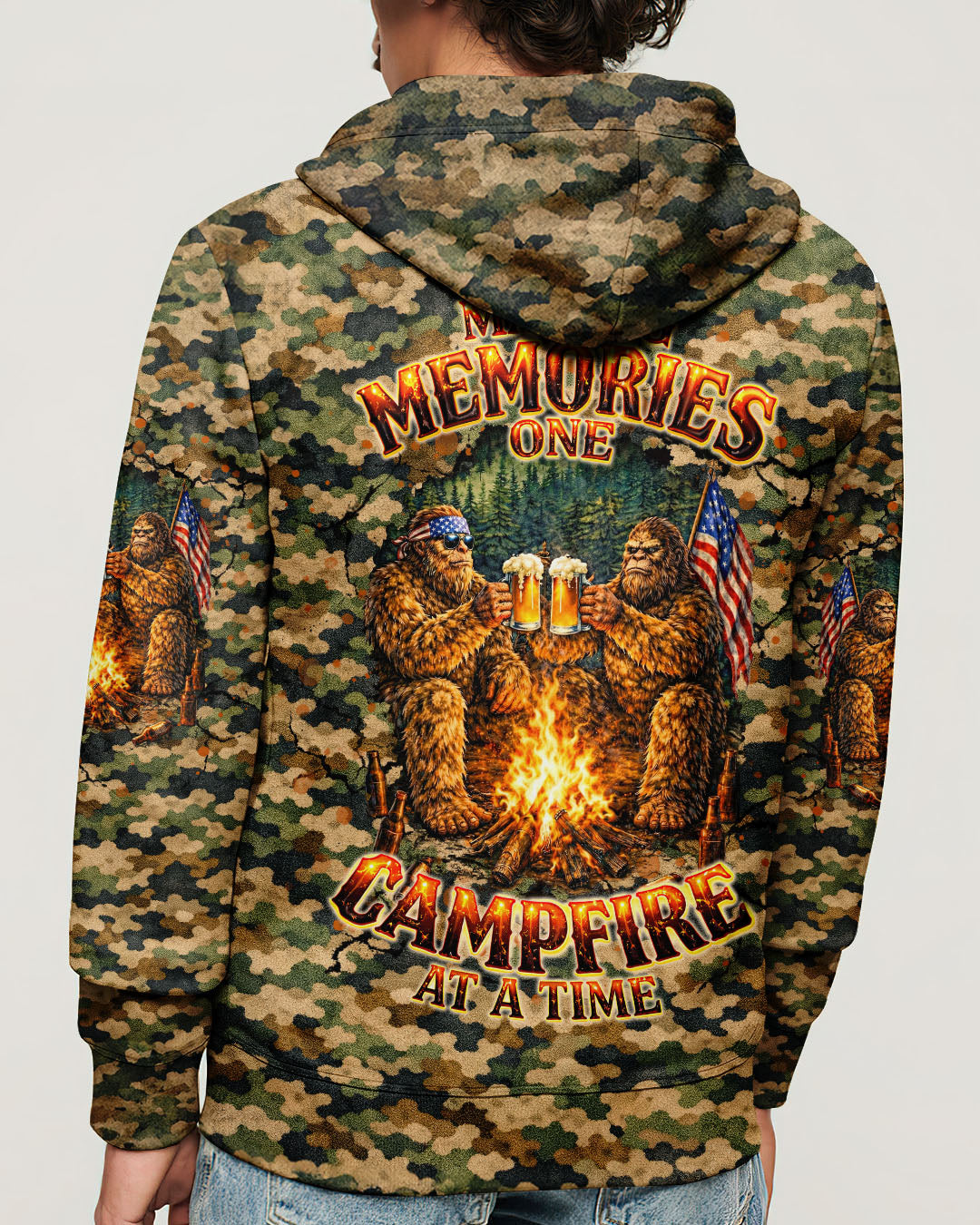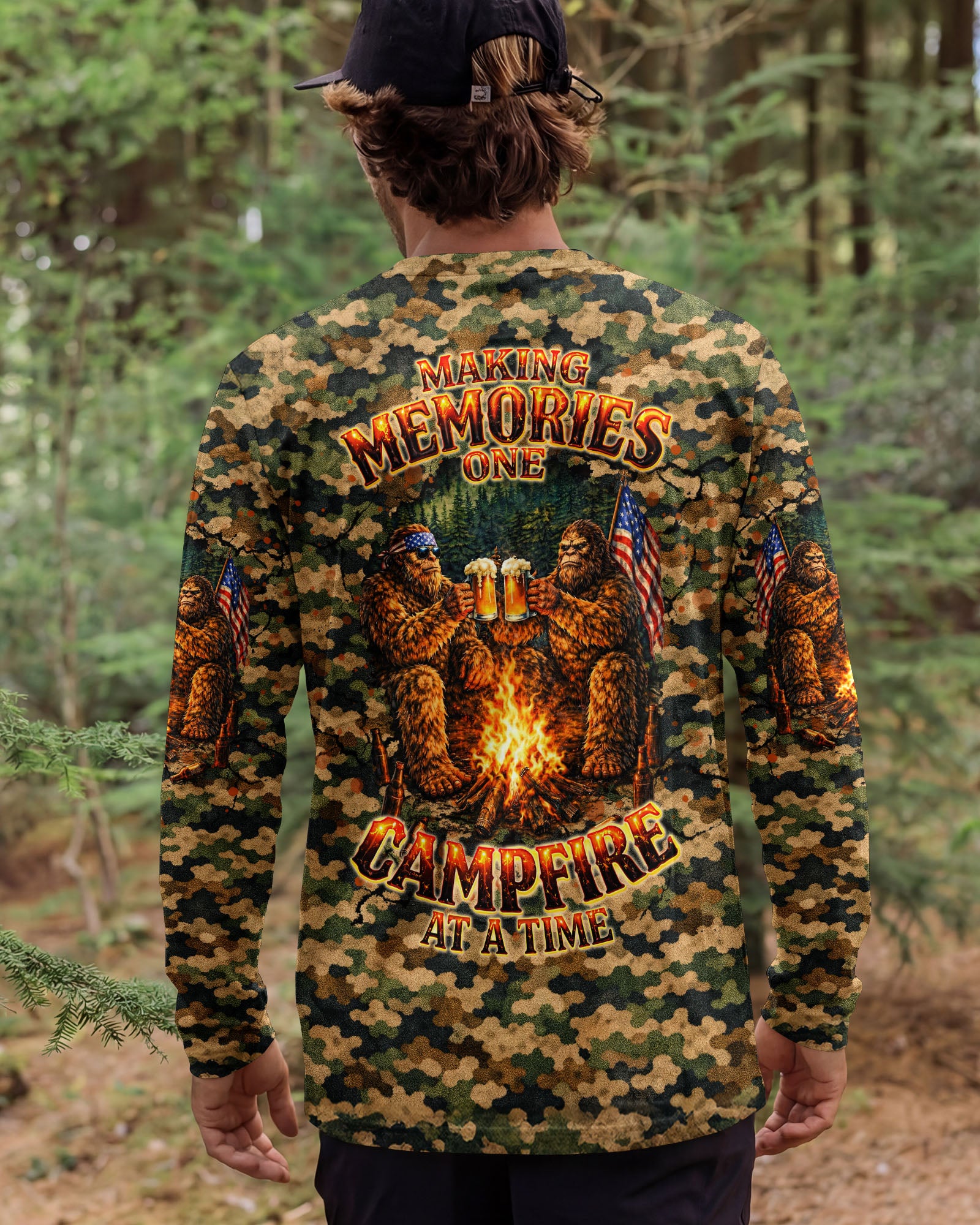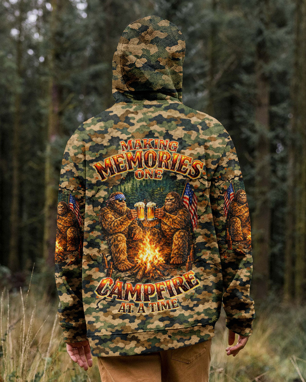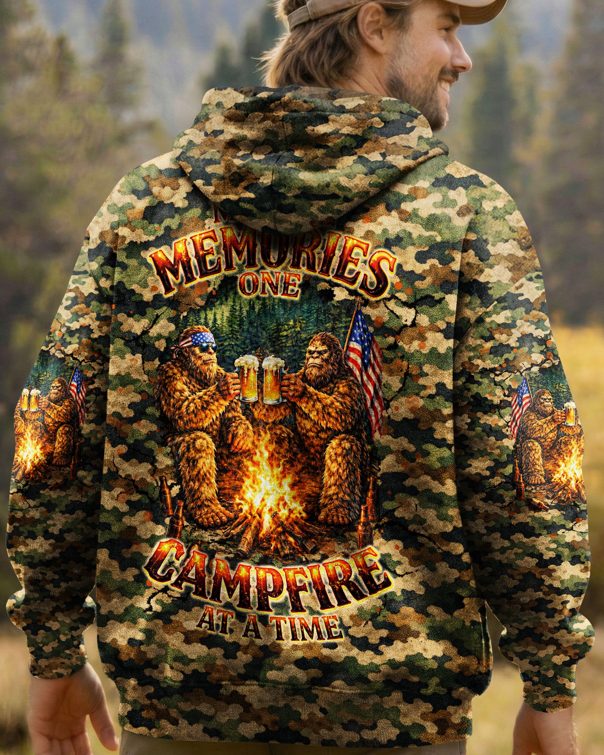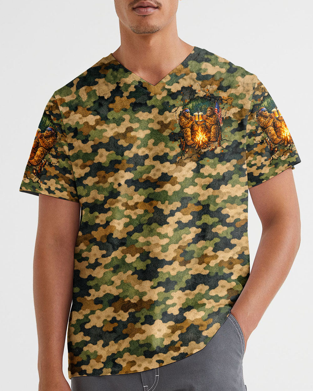 Gather around the campfire with this whimsical design celebrating friendship and outdoor adventure. Two cheerful Bigfoot companions share cold beers beneath the stars, embodying the spirit of slowing down and savoring life's best moments in nature. The camo swirl pattern merges rugged mountain aesthetics with playful charm, creating a look that feels authentically at home in the wilderness. Perfect for those who understand that the greatest memories aren't found on screens—they're built around crackling fires, genuine laughter, and the kind of nights that become legendary stories. Wear your love of the outdoors and the bonds forged in the wild.