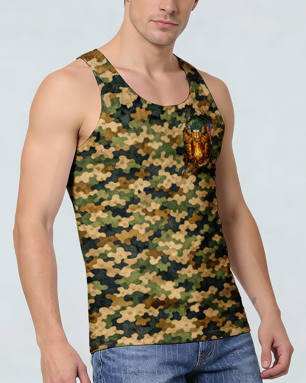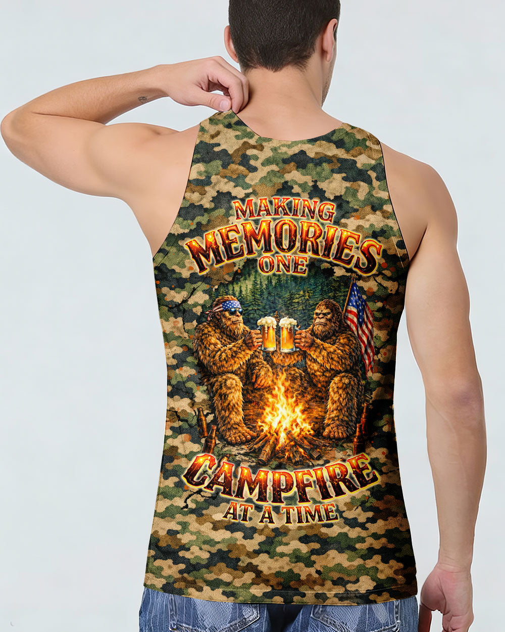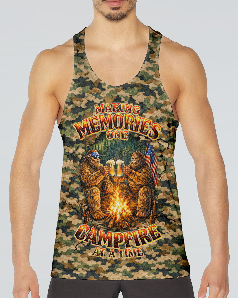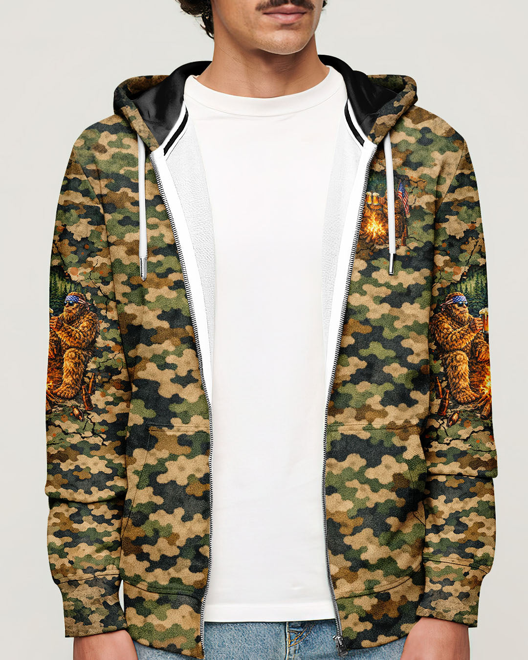 Gather around the campfire with this whimsical design celebrating friendship and outdoor adventure. Two cheerful Bigfoot companions share cold beers beneath the stars, embodying the spirit of slowing down and savoring life's best moments in nature. The camo swirl pattern merges rugged mountain aesthetics with playful charm, creating a look that feels authentically at home in the wilderness. Perfect for those who understand that the greatest memories aren't found on screens—they're built around crackling fires, genuine laughter, and the kind of nights that become legendary stories. Wear your love of the outdoors and the bonds forged in the wild.
