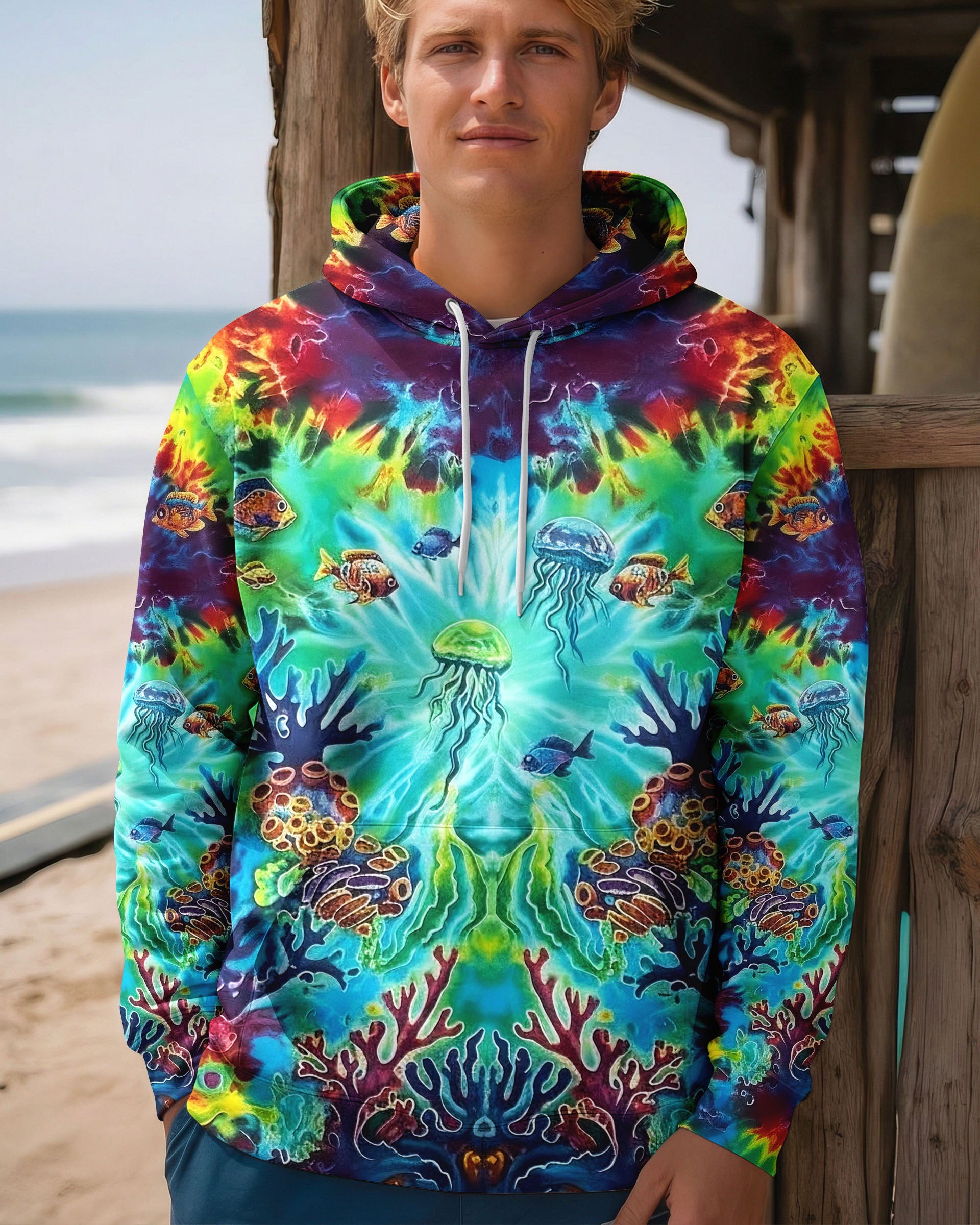Dive into an immersive underwater realm with this striking all-over print design. Luminescent jellyfish command the composition, their ethereal forms radiating against a backdrop of vibrant fish and intricately detailed coral rendered in bold, expressive brushwork. The psychedelic color palette transforms the ocean into a transcendent landscape—one that celebrates both the visual splendor and meditative essence of marine environments. This design speaks to ocean lovers, spiritual seekers, and anyone drawn to nature's most mesmerizing depths. Wear it as a reminder to embrace fluidity, cultivate inner calm, and honor the ocean's transformative power.