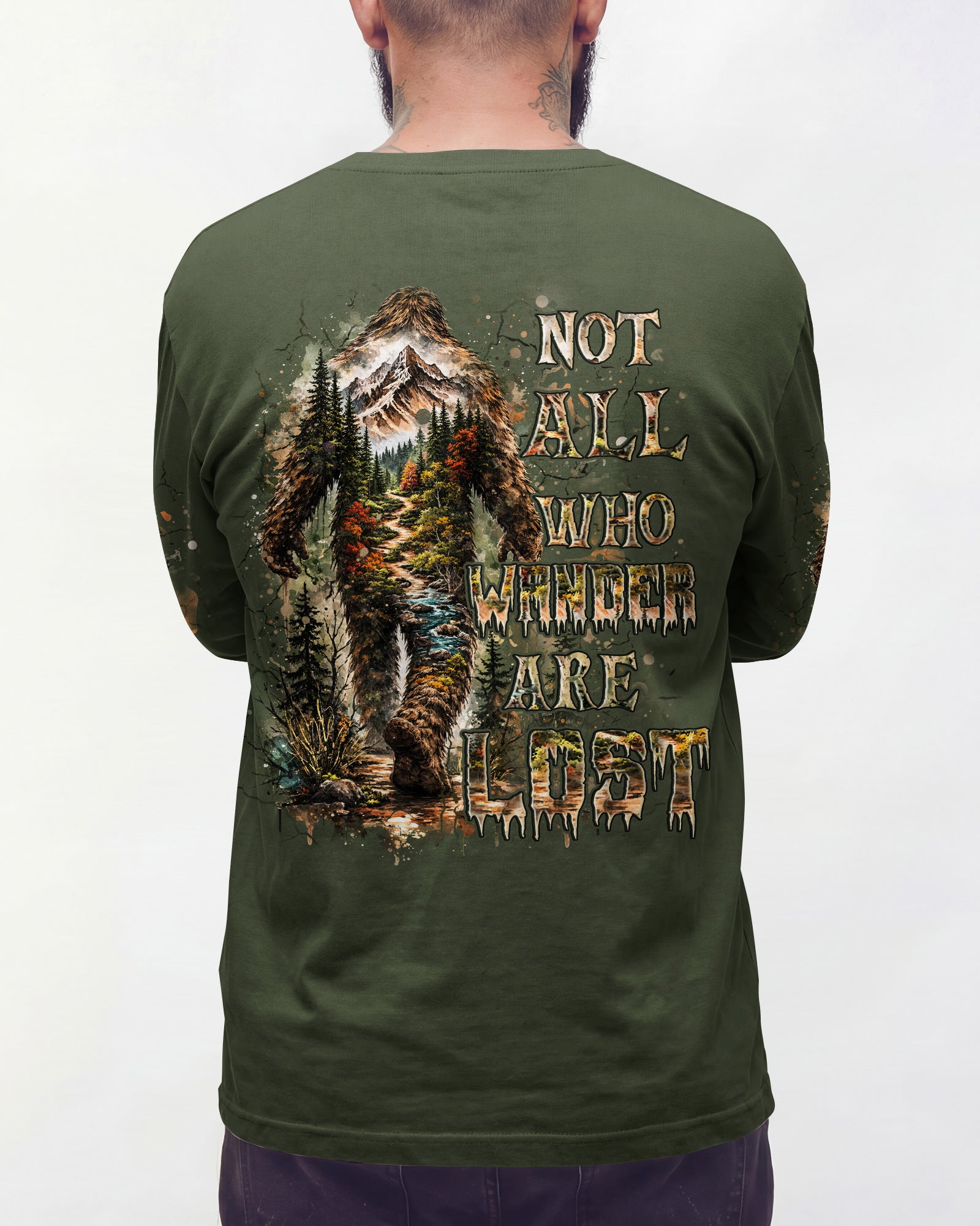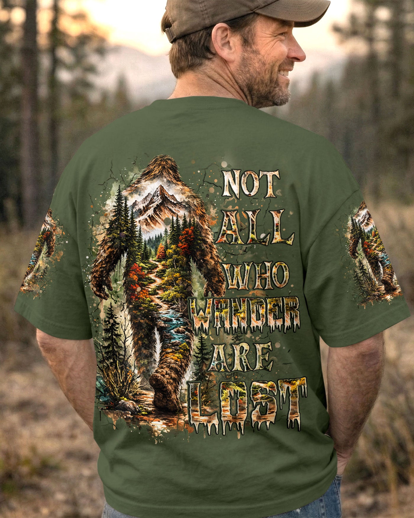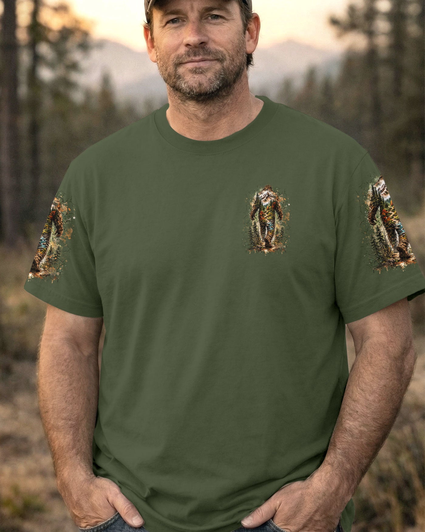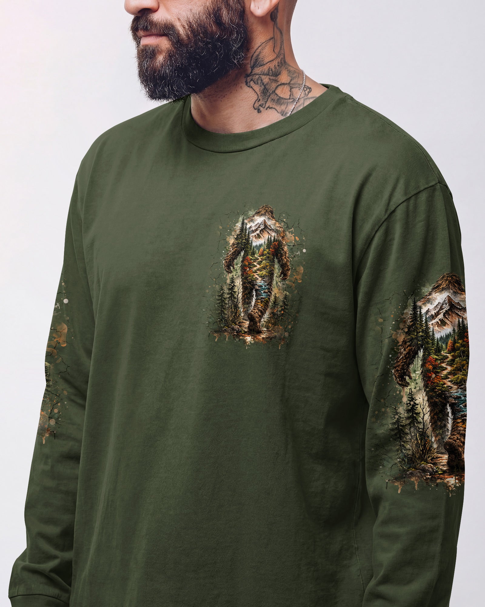 Mysterious forest vibes come alive with a wandering Bigfoot silhouette exploring the wild unknown. The adventurous design celebrates freedom, curiosity, and the joy of carving your own path through nature. Every step reflects a spirit that seeks experiences over directions and finds purpose in the journey itself. This all-over print shirt features bold, untamed style with dye-sublimation printing that delivers rich, vibrant colors across every panel. Crafted from a premium cotton/polyester and spandex blend, it's comfortable enough for everyday wear yet durable enough to withstand adventure. Each panel is individually printed, cut, and sewn for a flawless graphic with no imperfections, ensuring high-definition detail that stands out wherever you go. Embrace the call of the wild with a shirt that's as much a work of art as it is a statement of your wandering spirit.