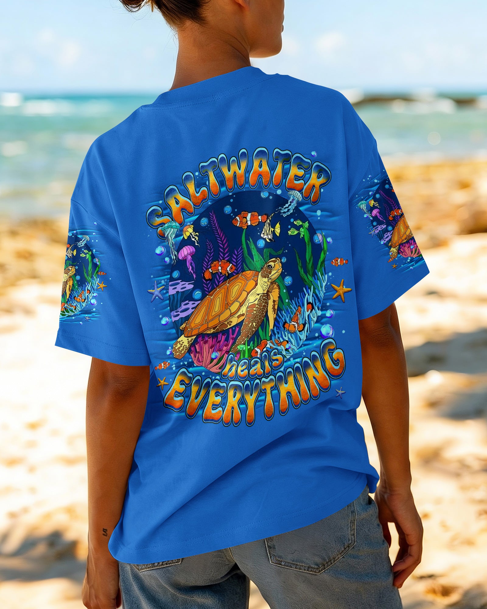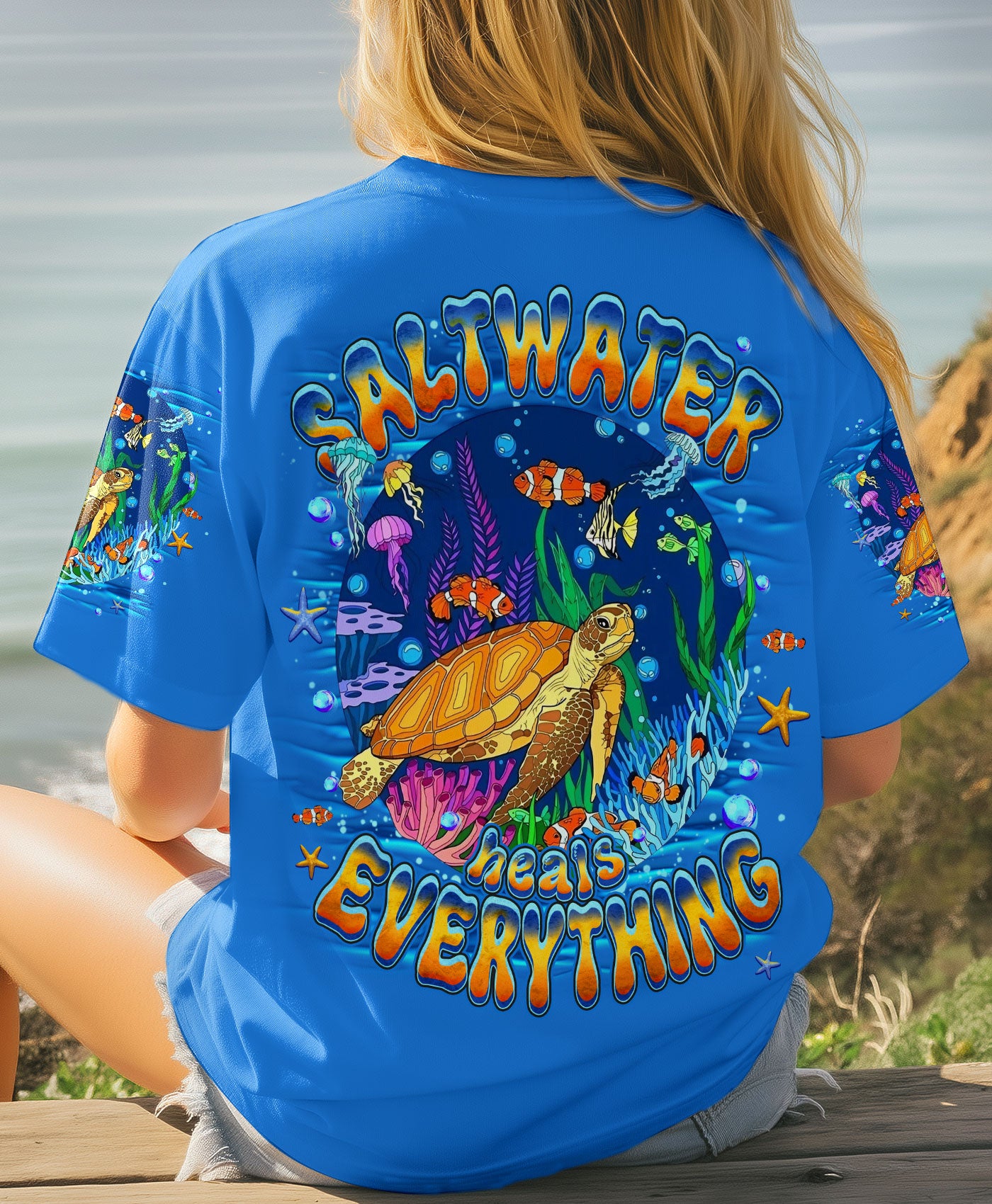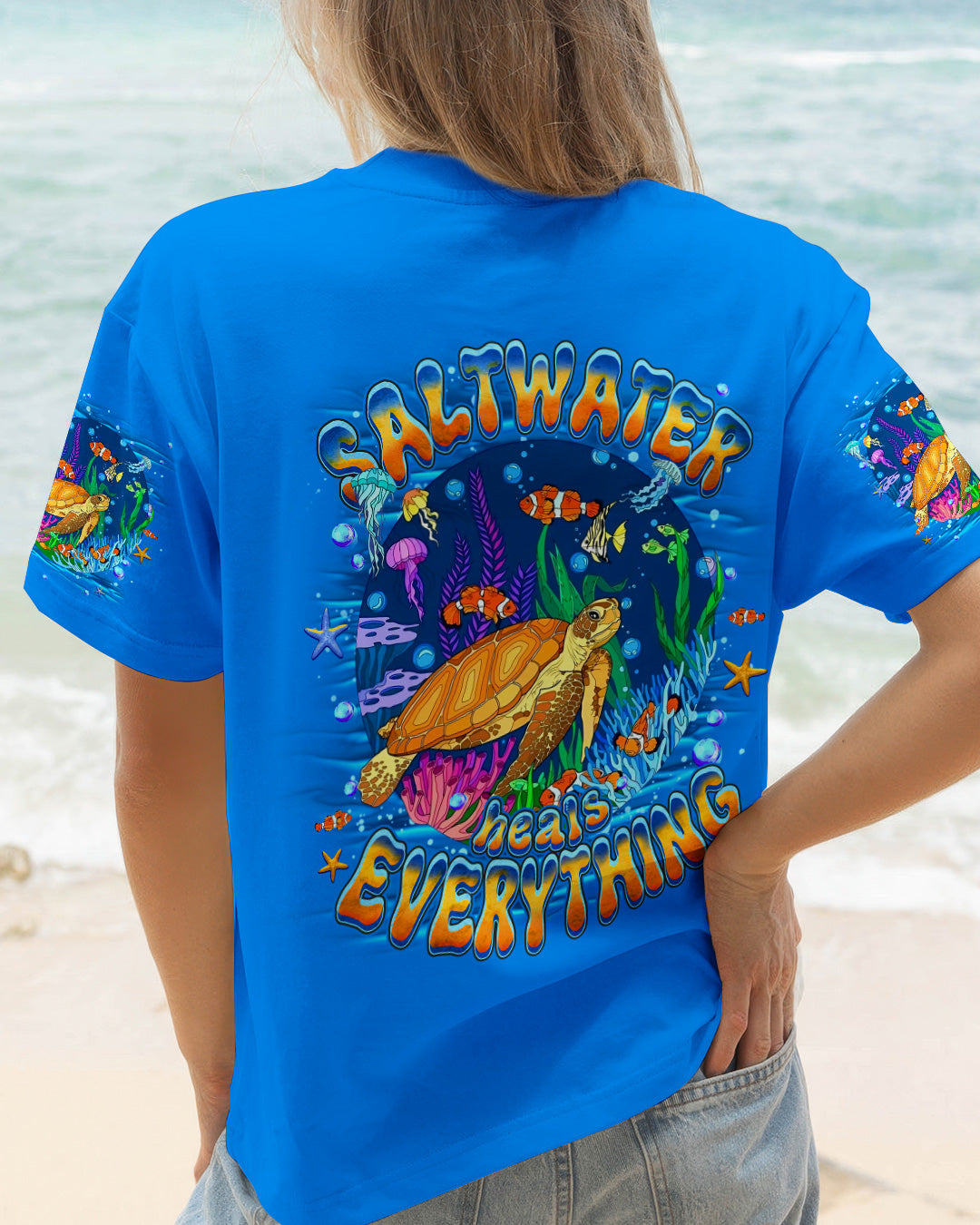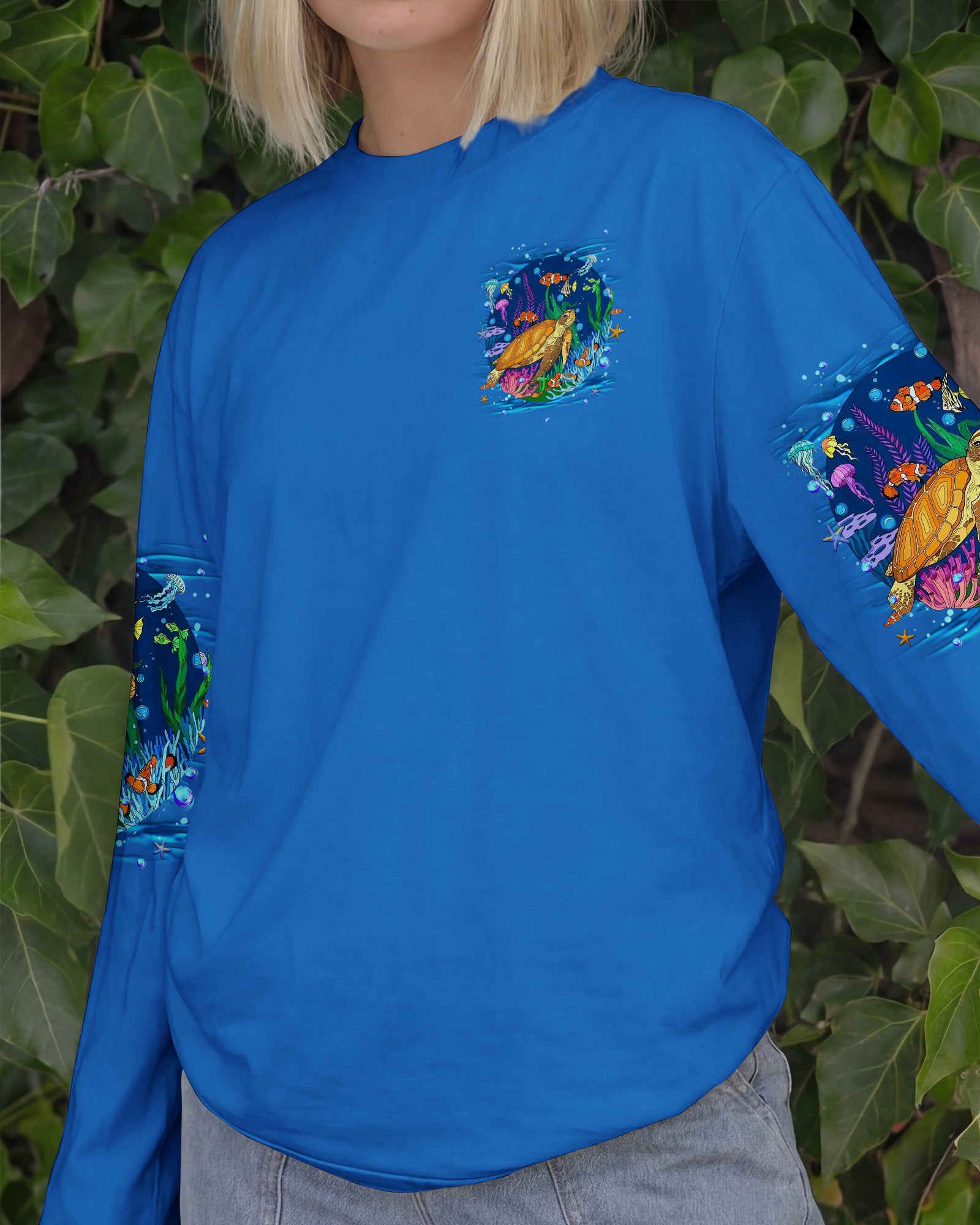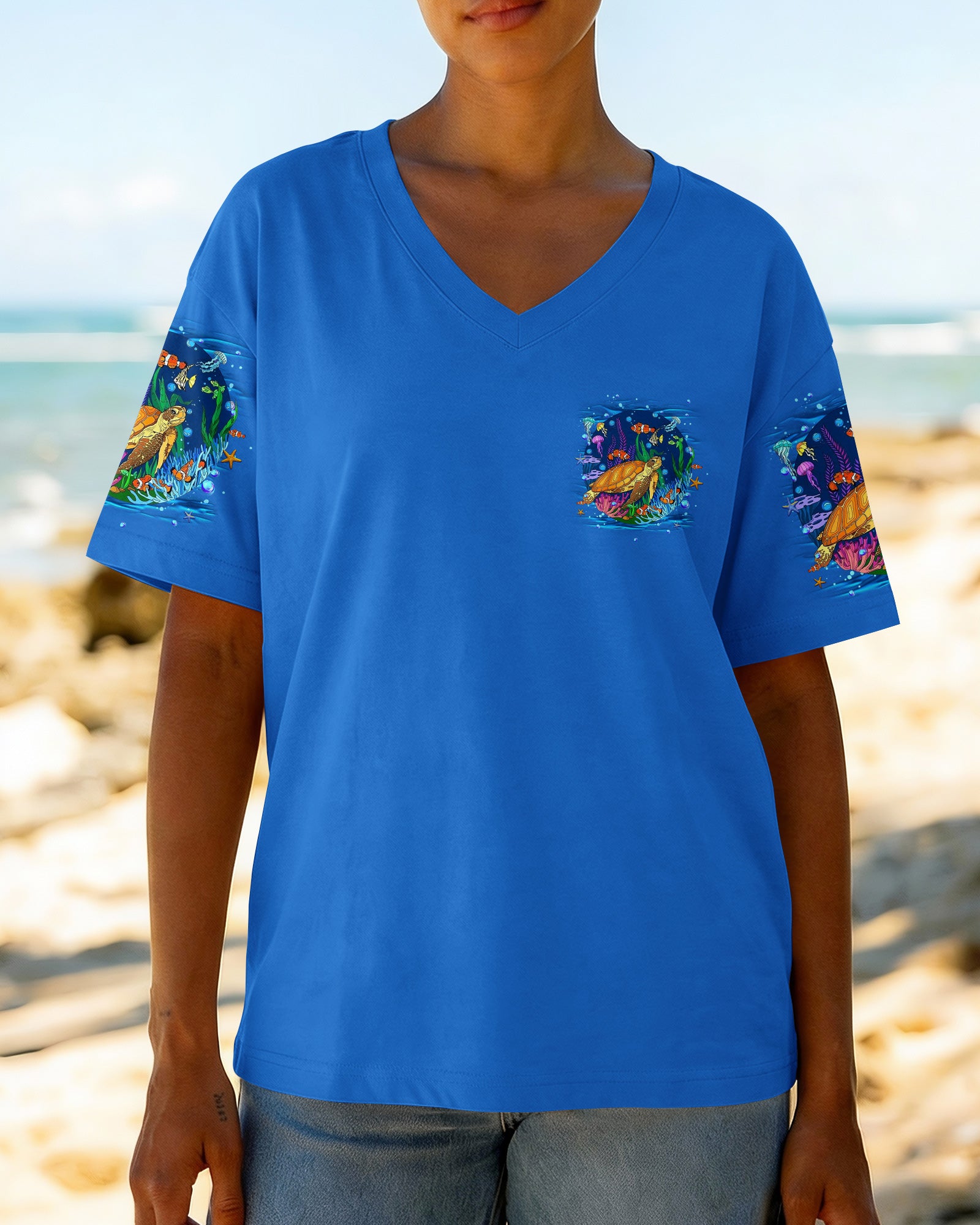 Immerse yourself in the serene beauty of the ocean with this all-over print turtle design. Featuring gentle waves and vibrant marine colors, this shirt captures the calming essence of the sea and the quiet strength of nature's most graceful creatures. The design celebrates the healing power of saltwater and the restorative energy of ocean moments. Crafted from a premium cotton/polyester and spandex blend, each panel is individually printed, cut, and sewn using advanced dye-sublimation techniques for flawless, high-definition graphics. The result is a wearable work of art with intricate color combinations and sharp details that stand out from every angle. Perfect for ocean lovers seeking comfort, durability, and meaningful style that reflects their connection to the sea.
