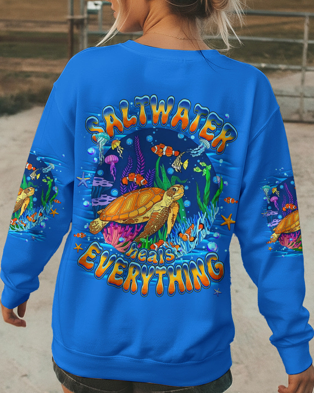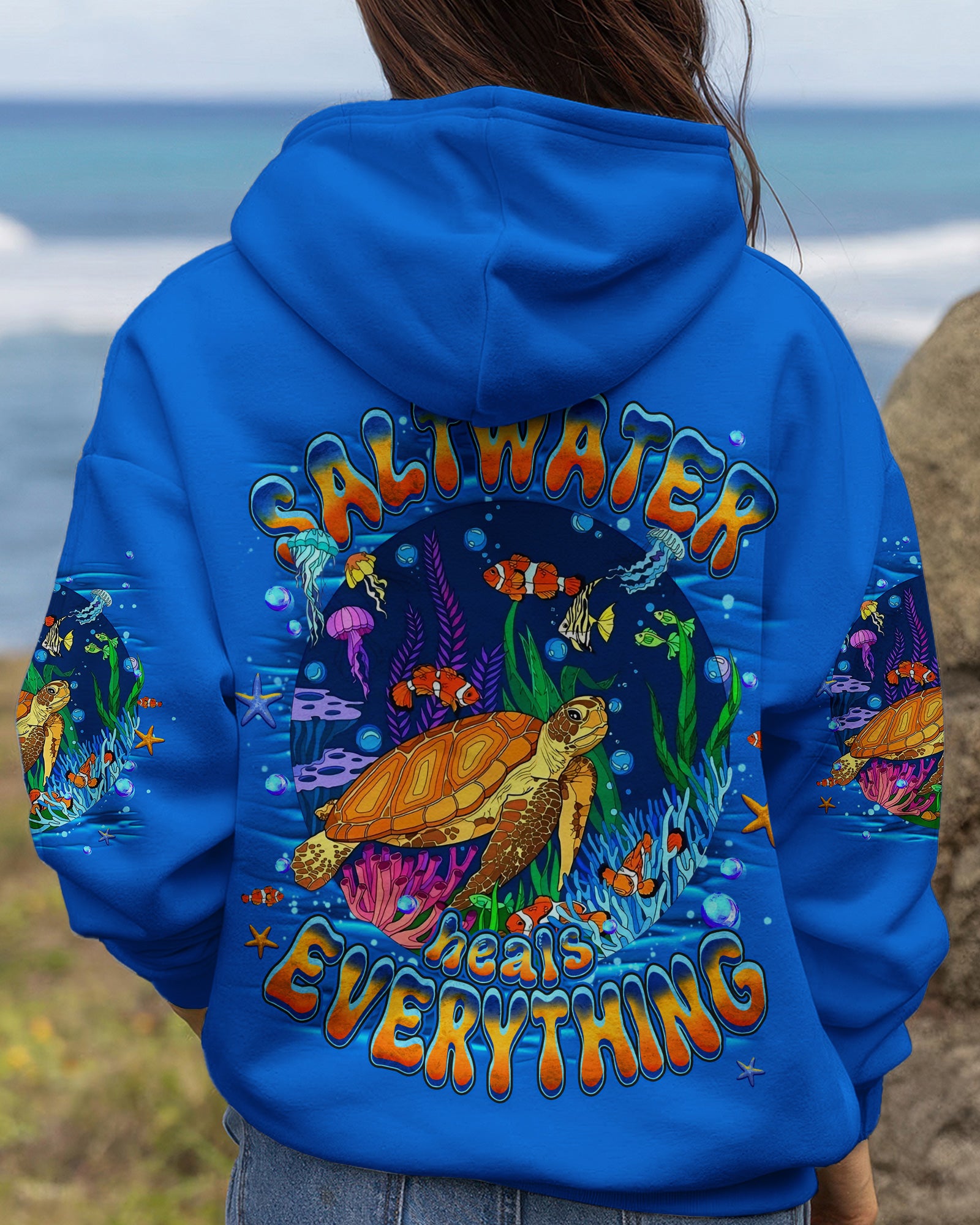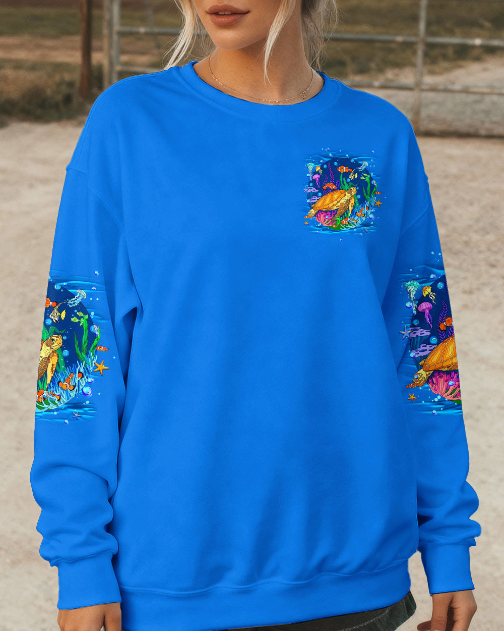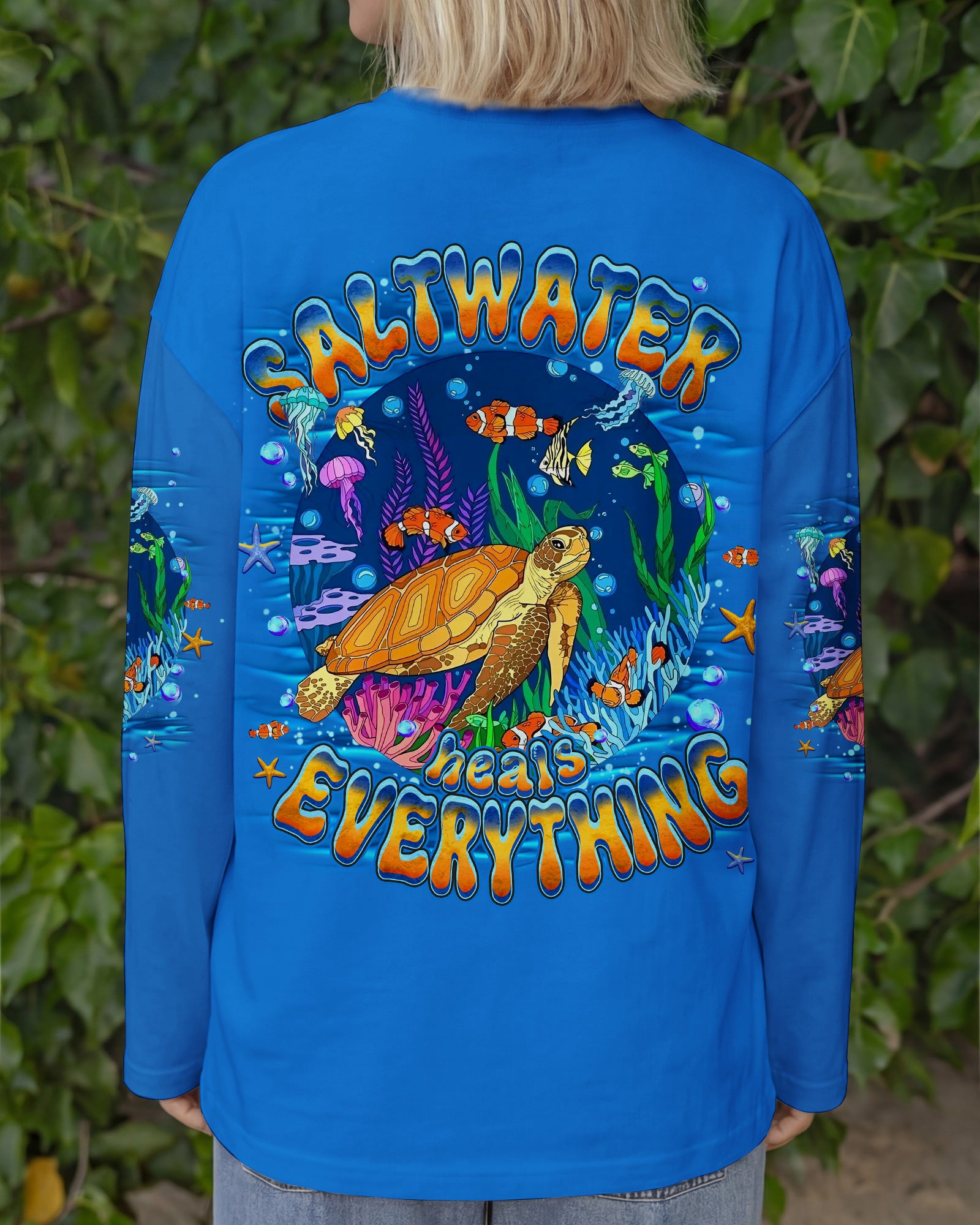 Immerse yourself in the serene beauty of the ocean with this all-over print turtle design. Featuring gentle waves and vibrant marine colors, this shirt captures the calming essence of the sea and the quiet strength of nature's most graceful creatures. The design celebrates the healing power of saltwater and the restorative energy of ocean moments. Crafted from a premium cotton/polyester and spandex blend, each panel is individually printed, cut, and sewn using advanced dye-sublimation techniques for flawless, high-definition graphics. The result is a wearable work of art with intricate color combinations and sharp details that stand out from every angle. Perfect for ocean lovers seeking comfort, durability, and meaningful style that reflects their connection to the sea.