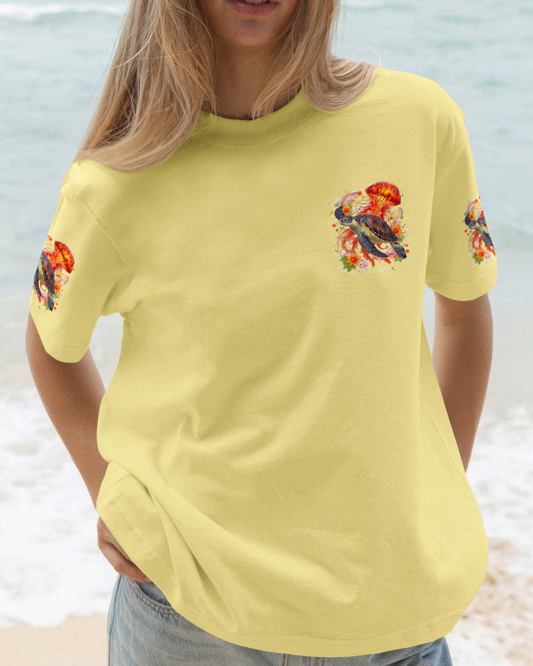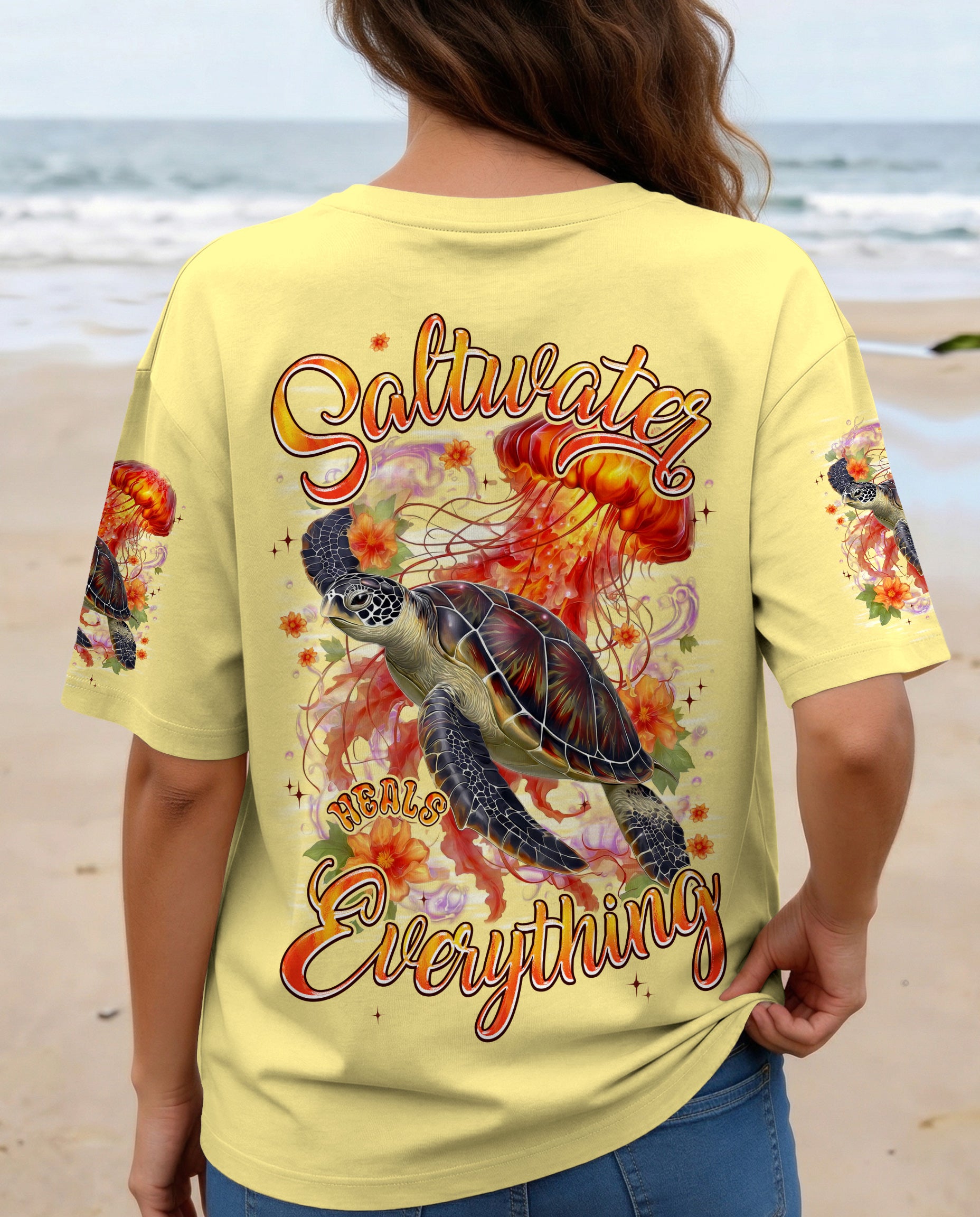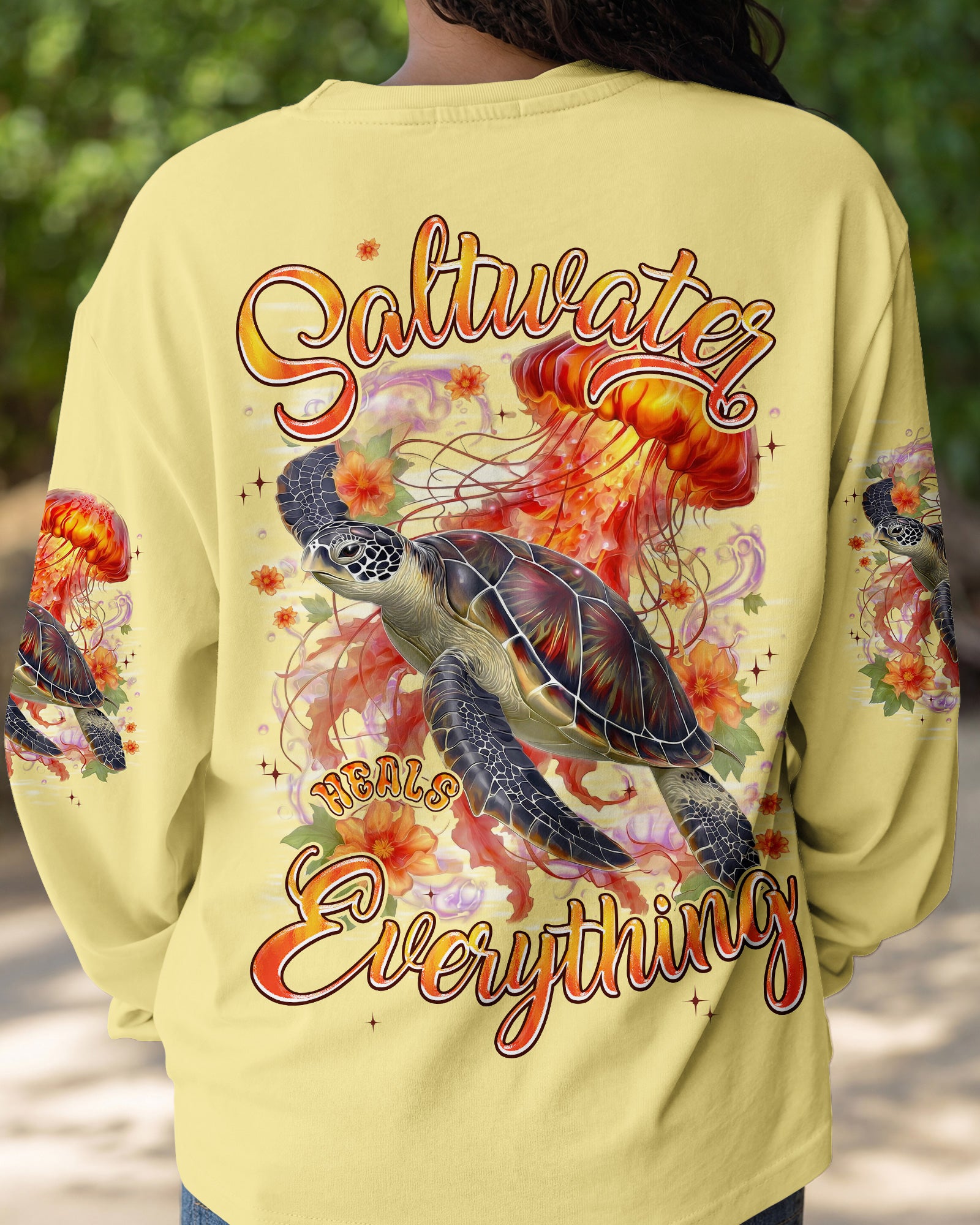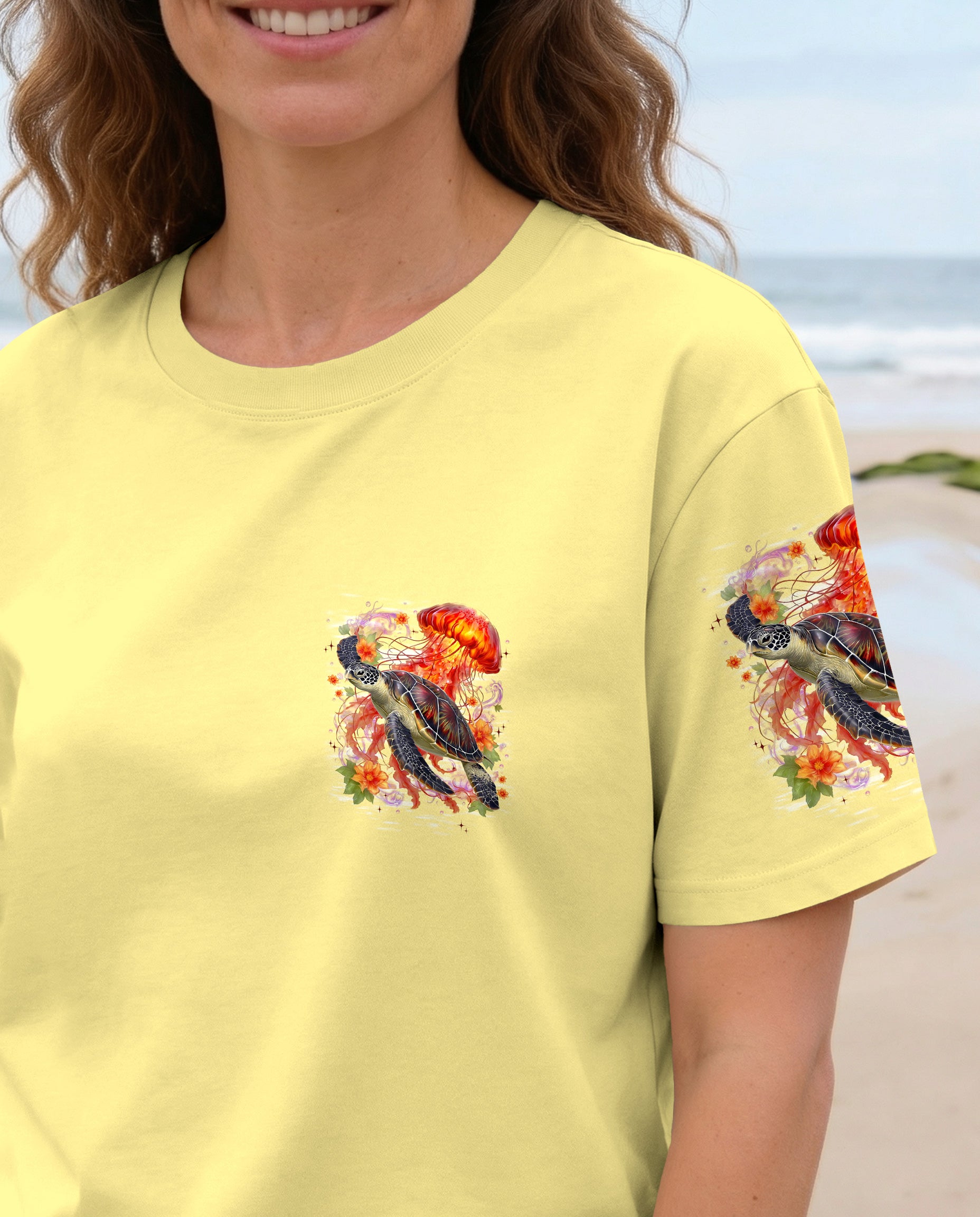 Drift into serenity with this all-over print shirt, where a gentle sea turtle and glowing jellyfish dance gracefully among blooming flowers. Each design element carries meaning—the turtle symbolizes steady healing, the jellyfish embodies softness and flow, while saltwater becomes a soothing force washing away worries. Flowers whisper hope and renewal, reminding us that life blooms even in the deepest waters. Crafted from a premium cotton/polyester and spandex blend, this shirt combines comfort with durability. Advanced dye-sublimation printing delivers vibrant, high-definition color across every panel, with each piece individually printed, cut, and sewn for flawless results. The intricate design showcases delicate color combinations and perfect edges—a wearable work of art that turns heads wherever you go. In this tranquil ocean world, healing feels natural, gentle, and complete. 🌊🐢🪼
