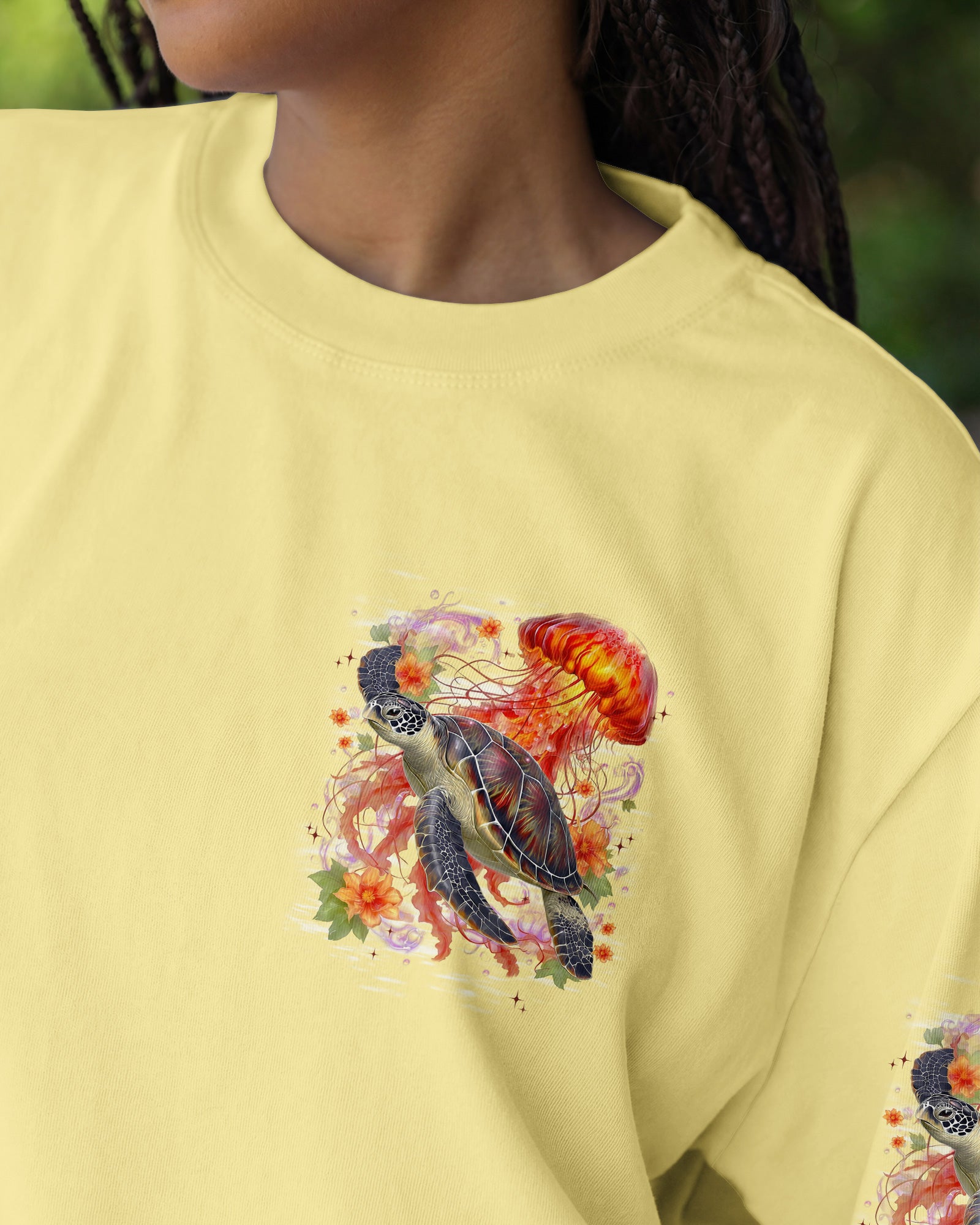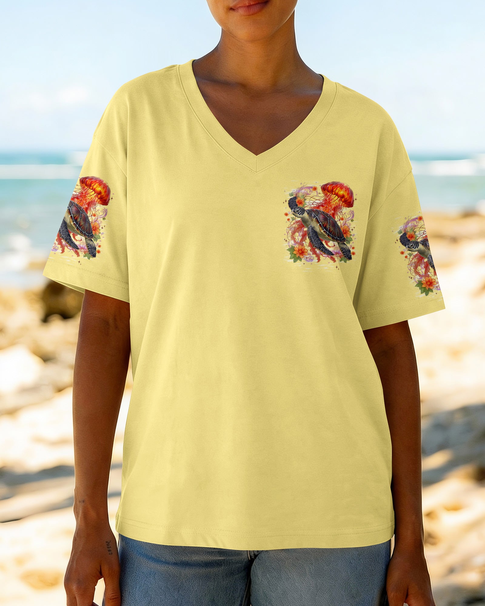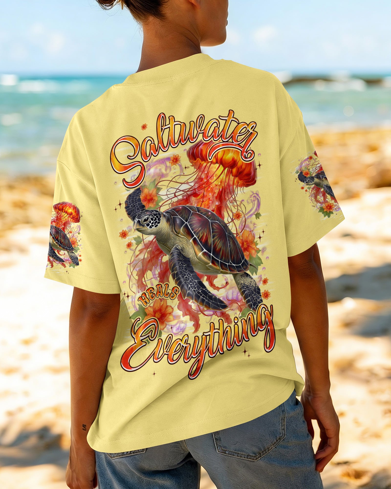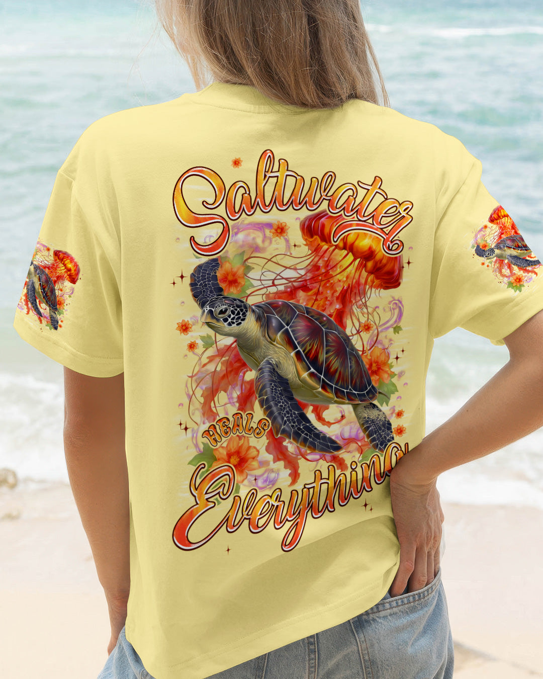 Drift into serenity with this all-over print shirt, where a gentle sea turtle and glowing jellyfish dance gracefully among blooming flowers. Each design element carries meaning—the turtle symbolizes steady healing, the jellyfish embodies softness and flow, while saltwater becomes a soothing force washing away worries. Flowers whisper hope and renewal, reminding us that life blooms even in the deepest waters. Crafted from a premium cotton/polyester and spandex blend, this shirt combines comfort with durability. Advanced dye-sublimation printing delivers vibrant, high-definition color across every panel, with each piece individually printed, cut, and sewn for flawless results. The intricate design showcases delicate color combinations and perfect edges—a wearable work of art that turns heads wherever you go. In this tranquil ocean world, healing feels natural, gentle, and complete. 🌊🐢🪼