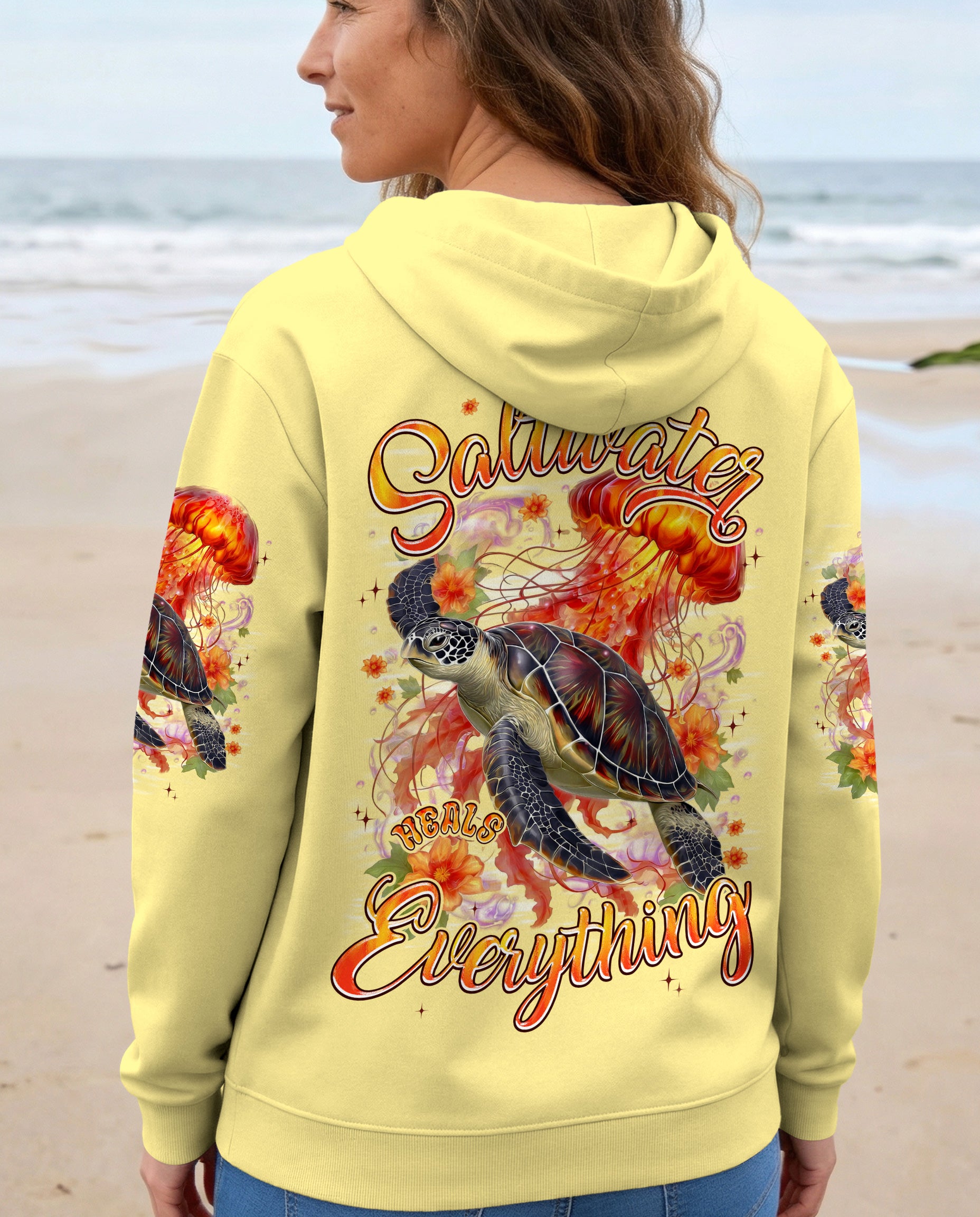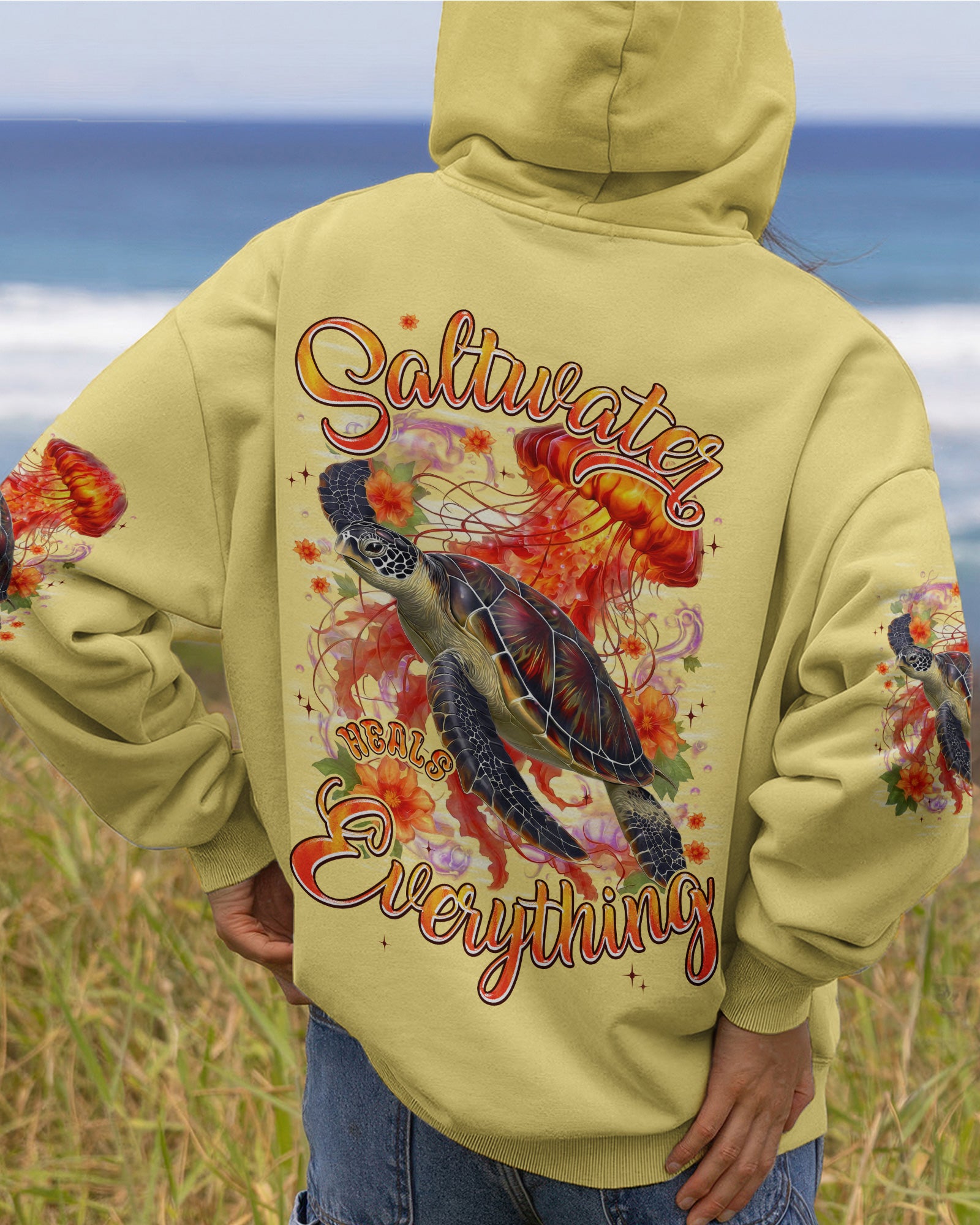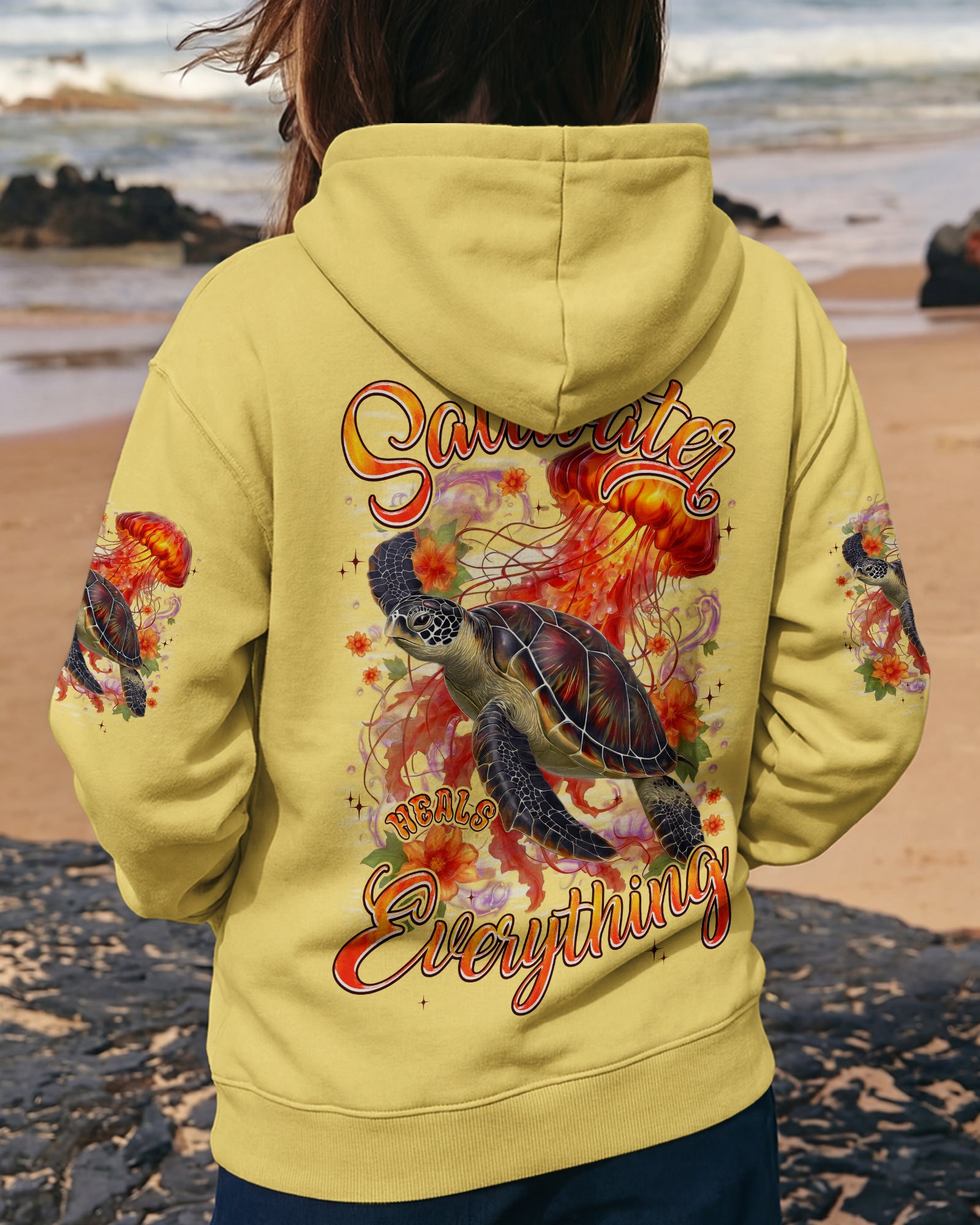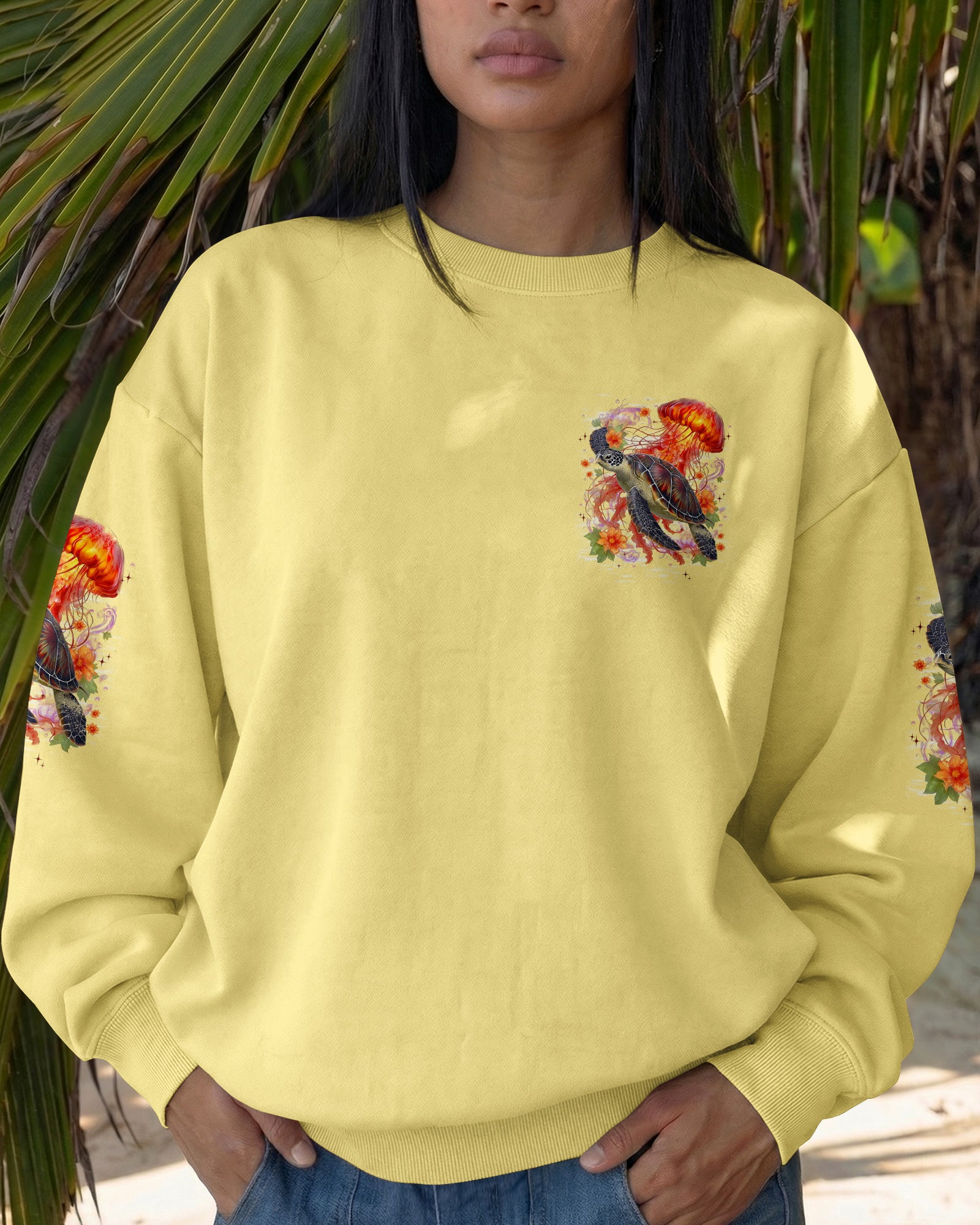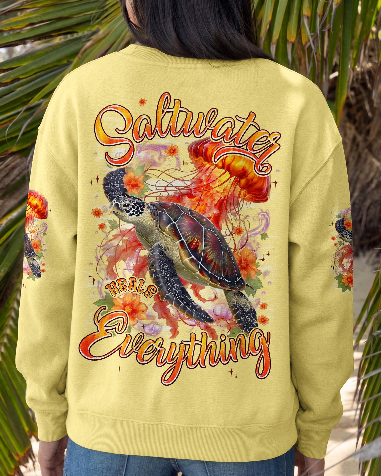 Drift into serenity with this all-over print shirt, where a gentle sea turtle and glowing jellyfish dance gracefully among blooming flowers. Each design element carries meaning—the turtle symbolizes steady healing, the jellyfish embodies softness and flow, while saltwater becomes a soothing force washing away worries. Flowers whisper hope and renewal, reminding us that life blooms even in the deepest waters. Crafted from a premium cotton/polyester and spandex blend, this shirt combines comfort with durability. Advanced dye-sublimation printing delivers vibrant, high-definition color across every panel, with each piece individually printed, cut, and sewn for flawless results. The intricate design showcases delicate color combinations and perfect edges—a wearable work of art that turns heads wherever you go. In this tranquil ocean world, healing feels natural, gentle, and complete. 🌊🐢🪼