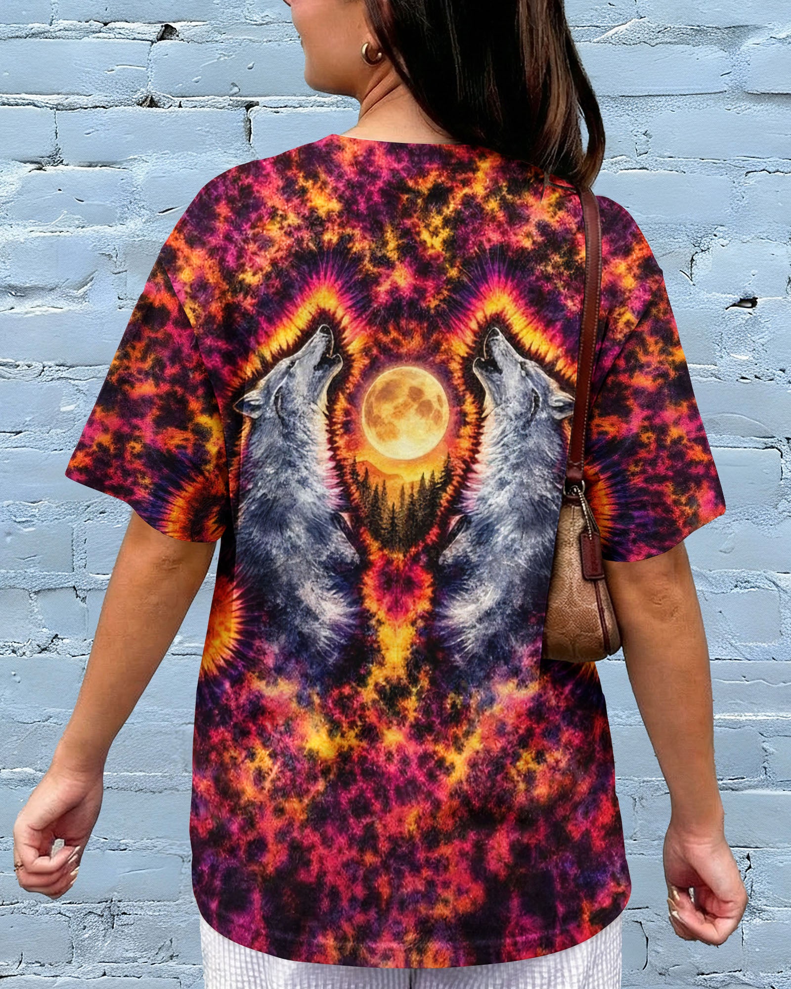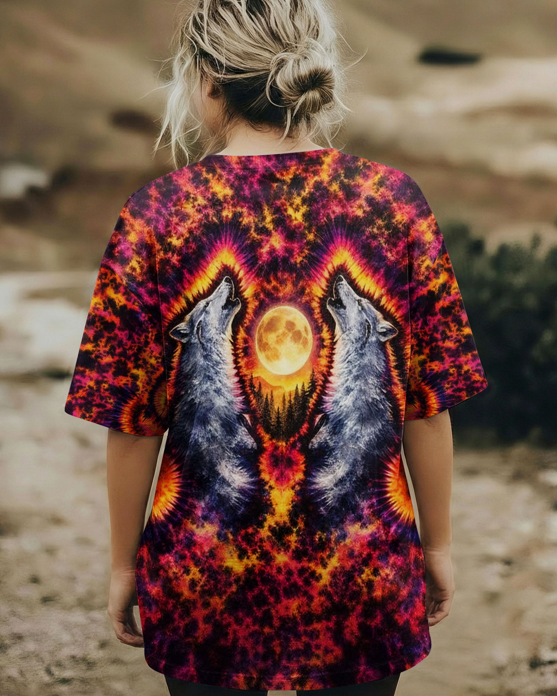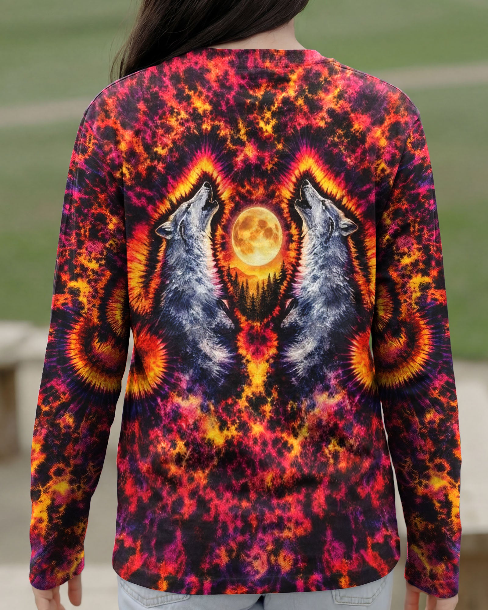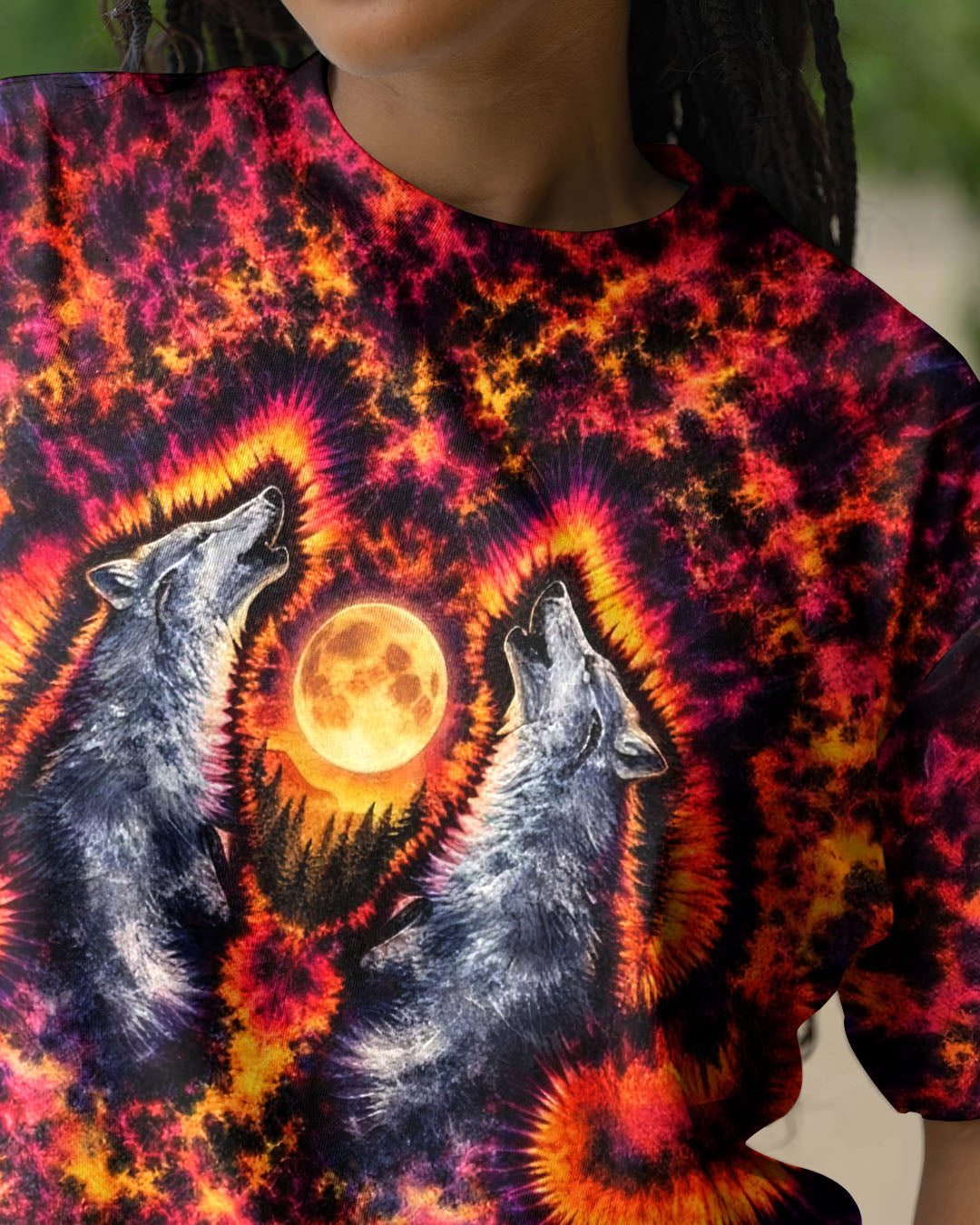Beneath a starlit sky, two wolves unite in primal song, their voices carrying across untamed peaks. This all-over print design weaves together swirling colors and dynamic imagery to capture the essence of wilderness—freedom, connection, and raw natural power. The hypnotic pattern evokes the mystery and majesty of mountain nights, while the intricate detail work showcases the bond between these magnificent creatures and their rugged domain. Perfect for those who embrace the wild spirit within and carry the mountains in their soul.