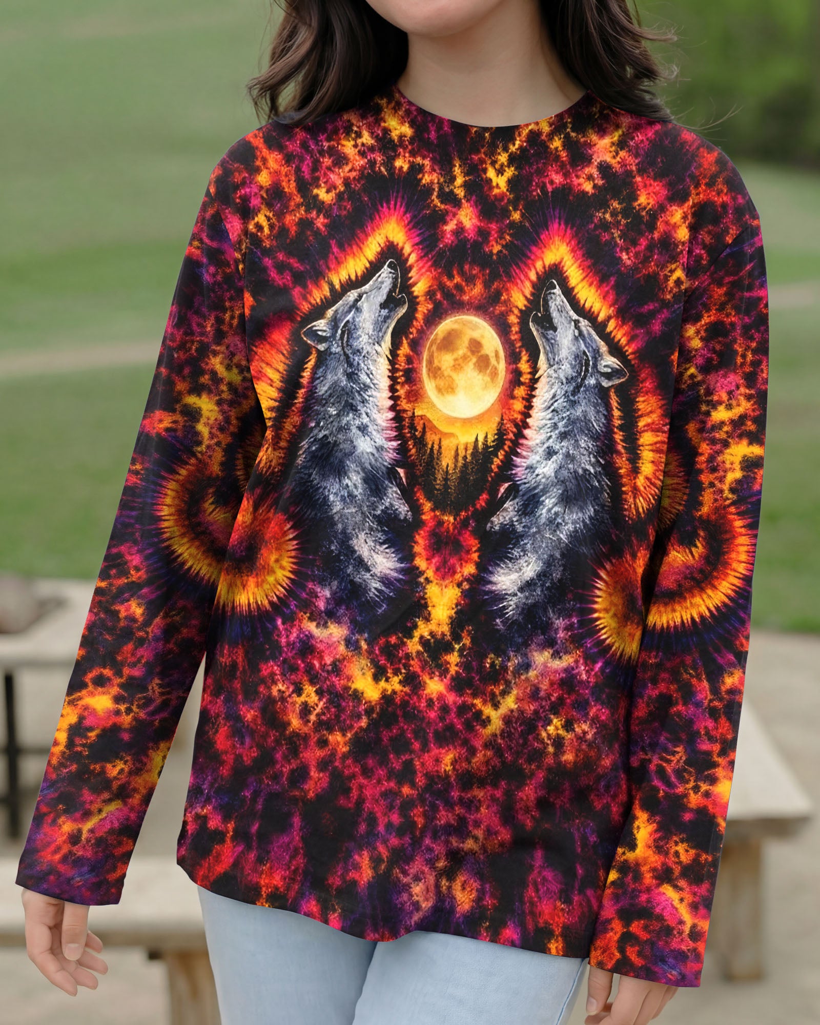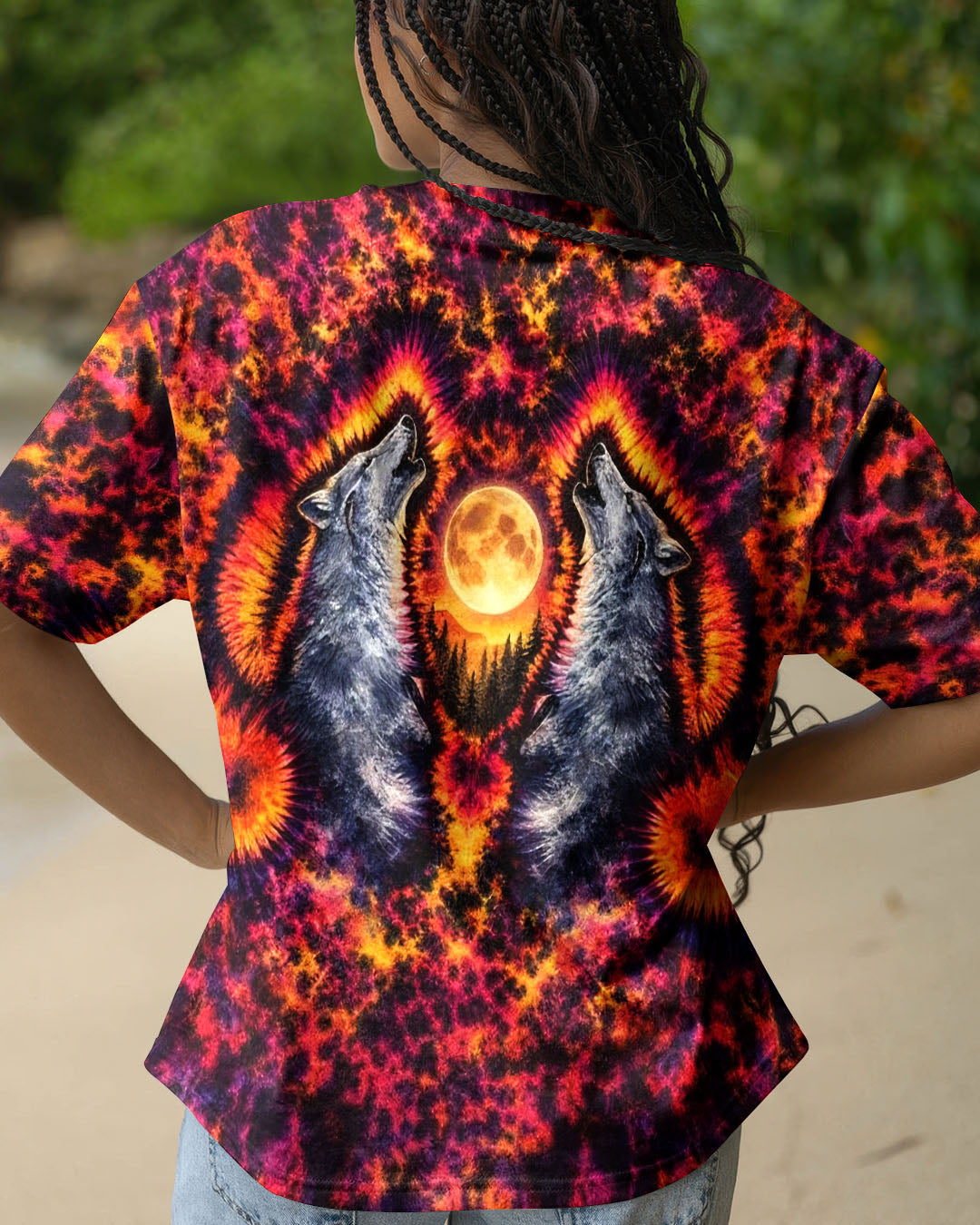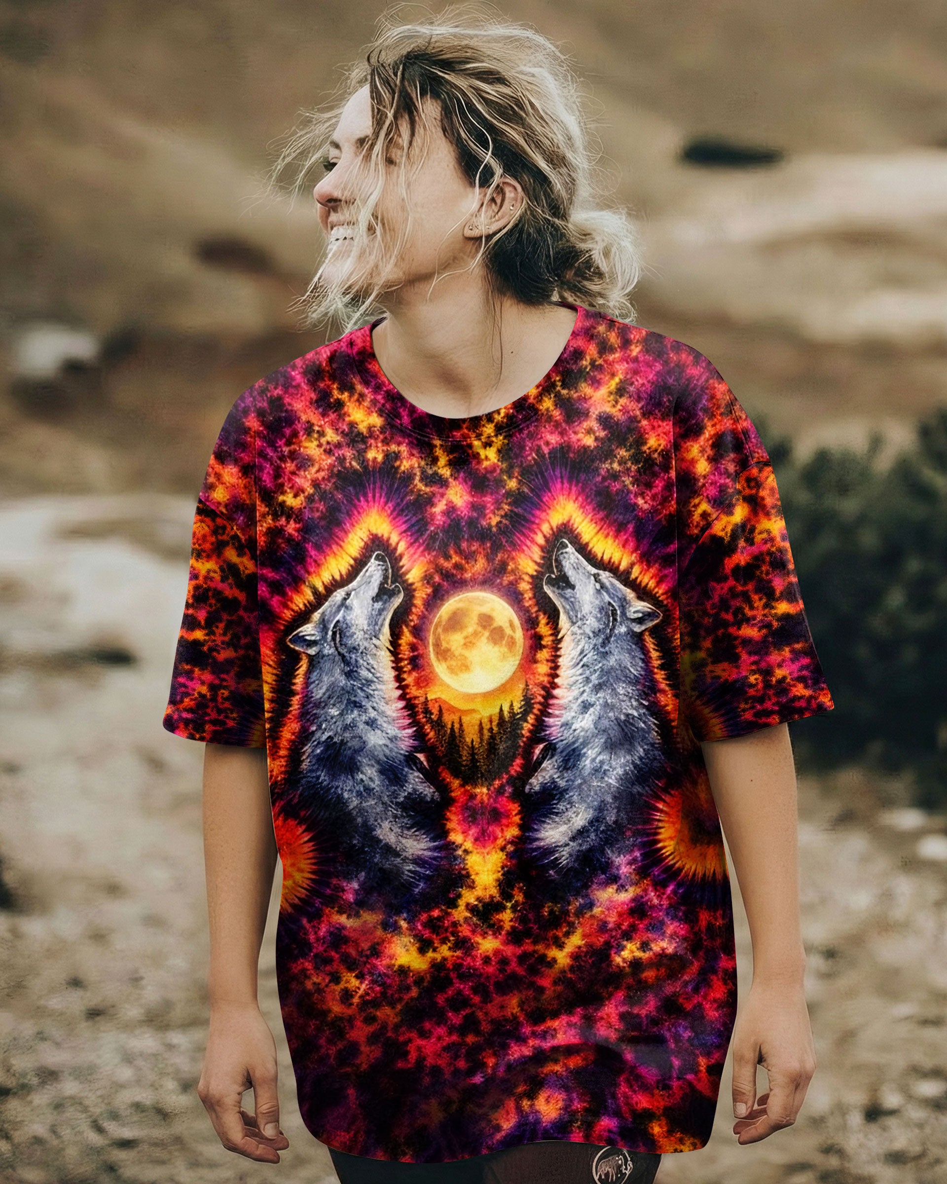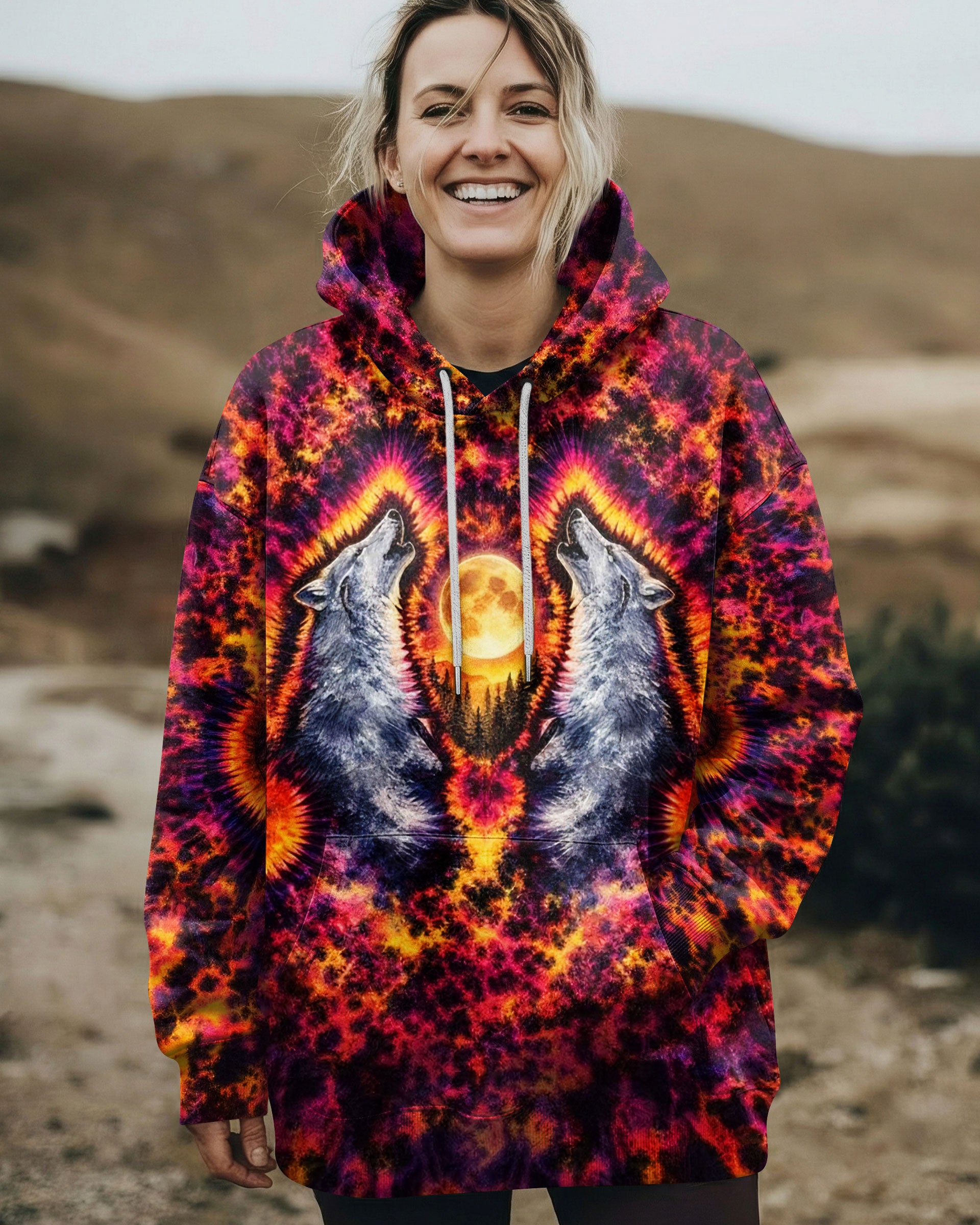 Beneath a starlit sky, two wolves unite in primal song, their voices carrying across untamed peaks. This all-over print design weaves together swirling colors and dynamic imagery to capture the essence of wilderness—freedom, connection, and raw natural power. The hypnotic pattern evokes the mystery and majesty of mountain nights, while the intricate detail work showcases the bond between these magnificent creatures and their rugged domain. Perfect for those who embrace the wild spirit within and carry the mountains in their soul.