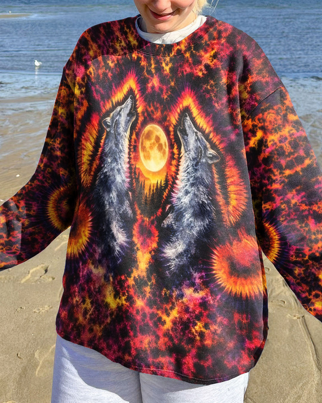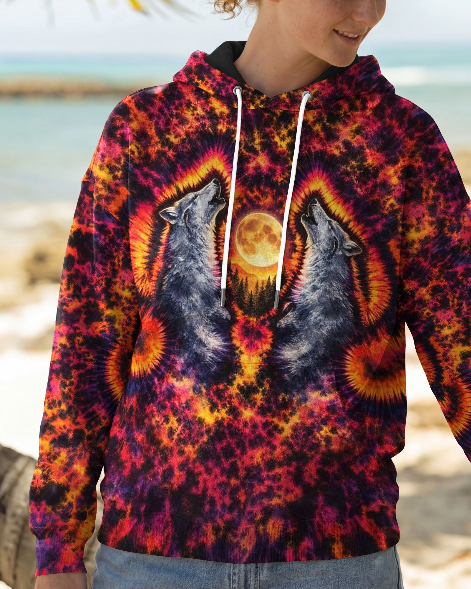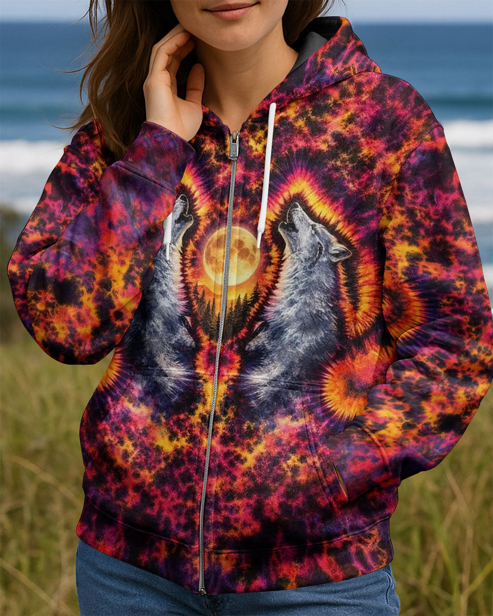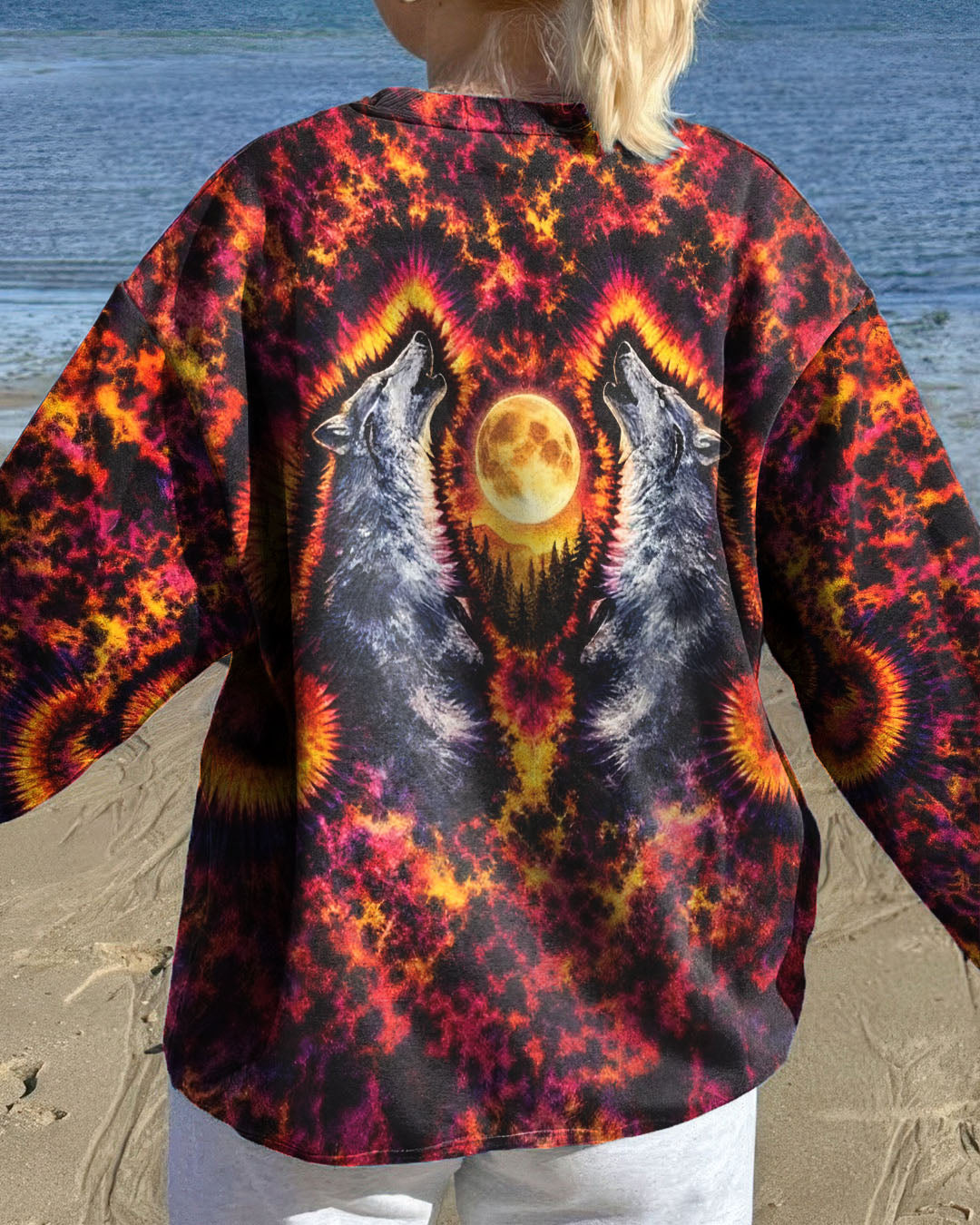 Beneath a starlit sky, two wolves unite in primal song, their voices carrying across untamed peaks. This all-over print design weaves together swirling colors and dynamic imagery to capture the essence of wilderness—freedom, connection, and raw natural power. The hypnotic pattern evokes the mystery and majesty of mountain nights, while the intricate detail work showcases the bond between these magnificent creatures and their rugged domain. Perfect for those who embrace the wild spirit within and carry the mountains in their soul.