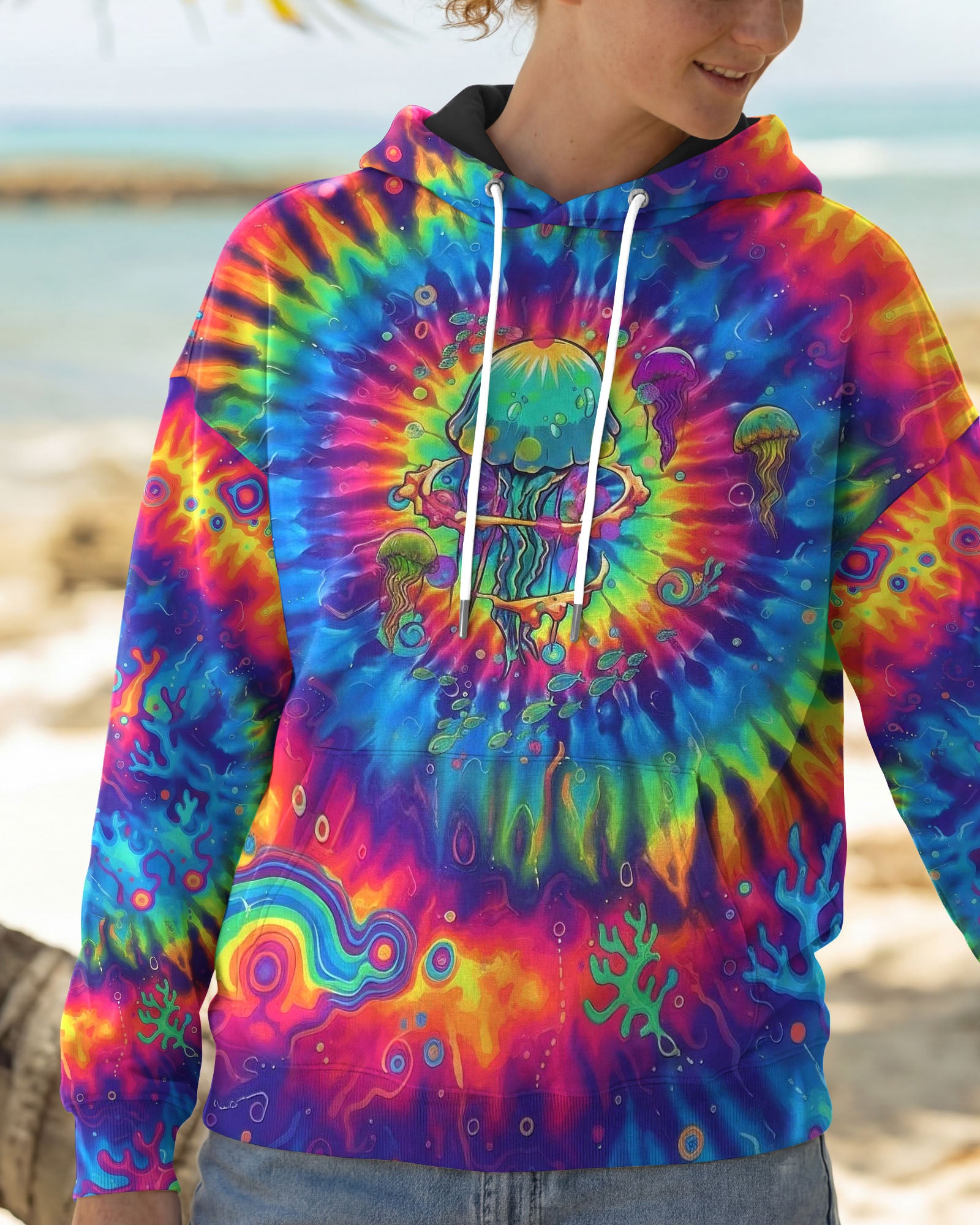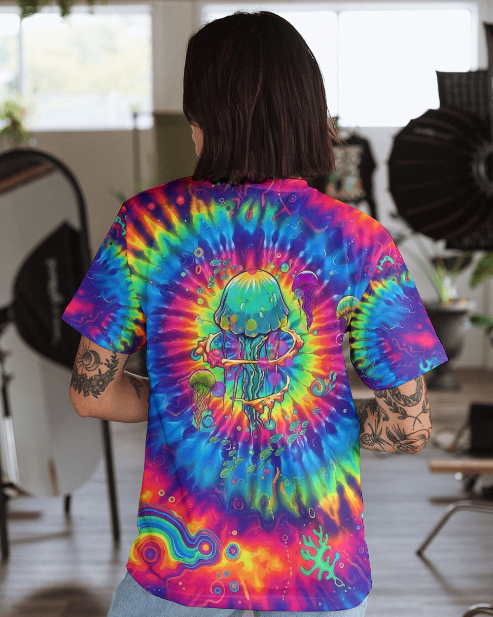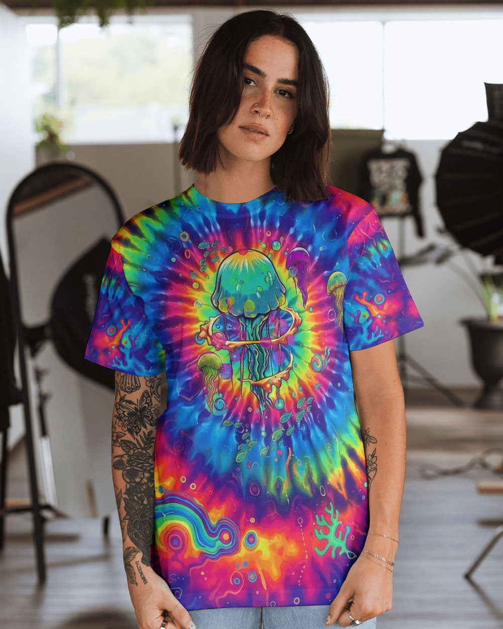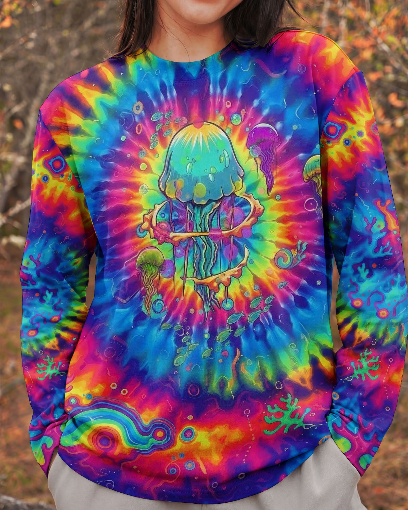 This all-over print design captures a mesmerizing jellyfish suspended within a radiant vortex of neon psychedelic hues and swirling ocean energy. The hypnotic composition evokes the sensation of drifting through a dreamlike seascape—mystical, boundless, and vibrantly alive. Beyond its visual impact, the design carries a deeper message: surrender to the current, trust the natural flow of life, and recognize the inherent magic within your own journey. Perfect for those drawn to ocean-inspired aesthetics and transformative symbolism.