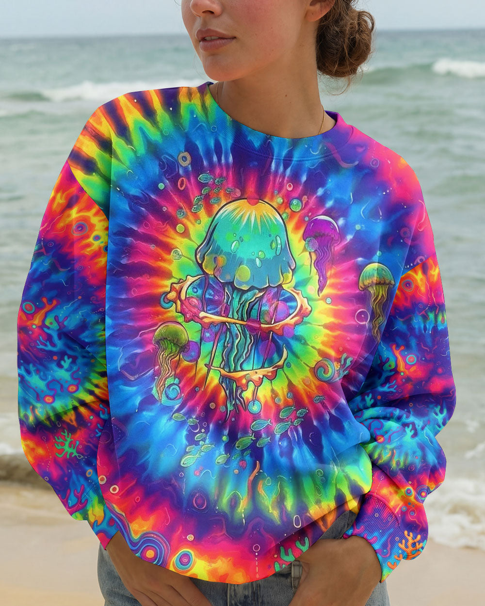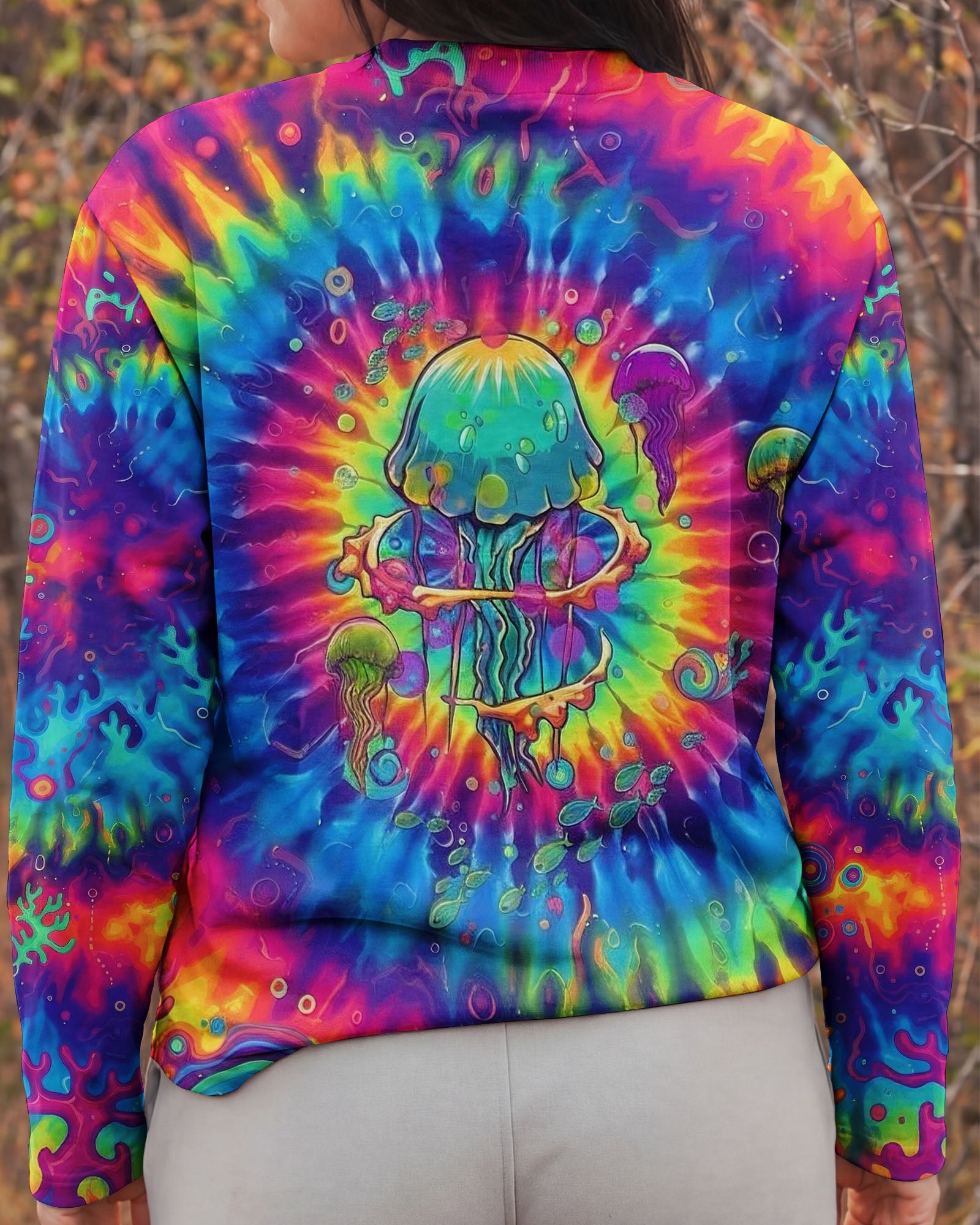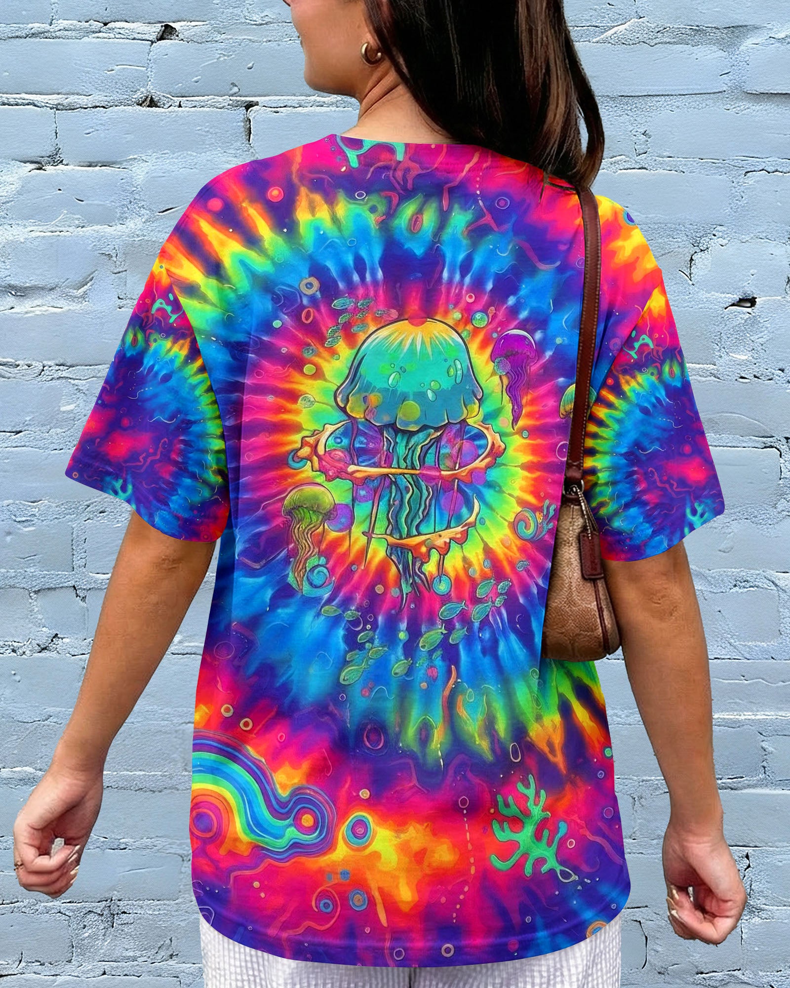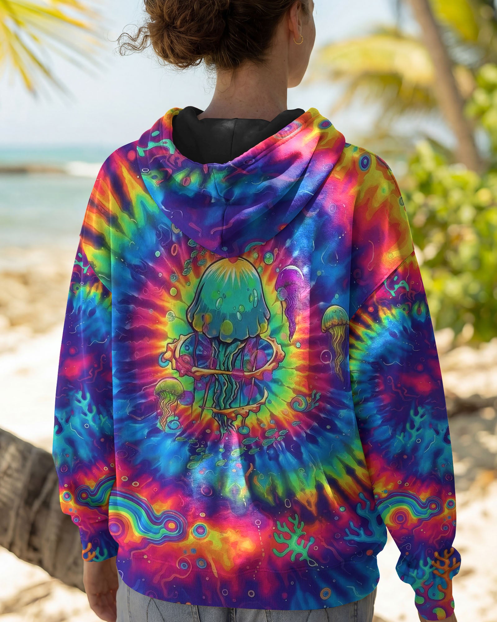 This all-over print design captures a mesmerizing jellyfish suspended within a radiant vortex of neon psychedelic hues and swirling ocean energy. The hypnotic composition evokes the sensation of drifting through a dreamlike seascape—mystical, boundless, and vibrantly alive. Beyond its visual impact, the design carries a deeper message: surrender to the current, trust the natural flow of life, and recognize the inherent magic within your own journey. Perfect for those drawn to ocean-inspired aesthetics and transformative symbolism.