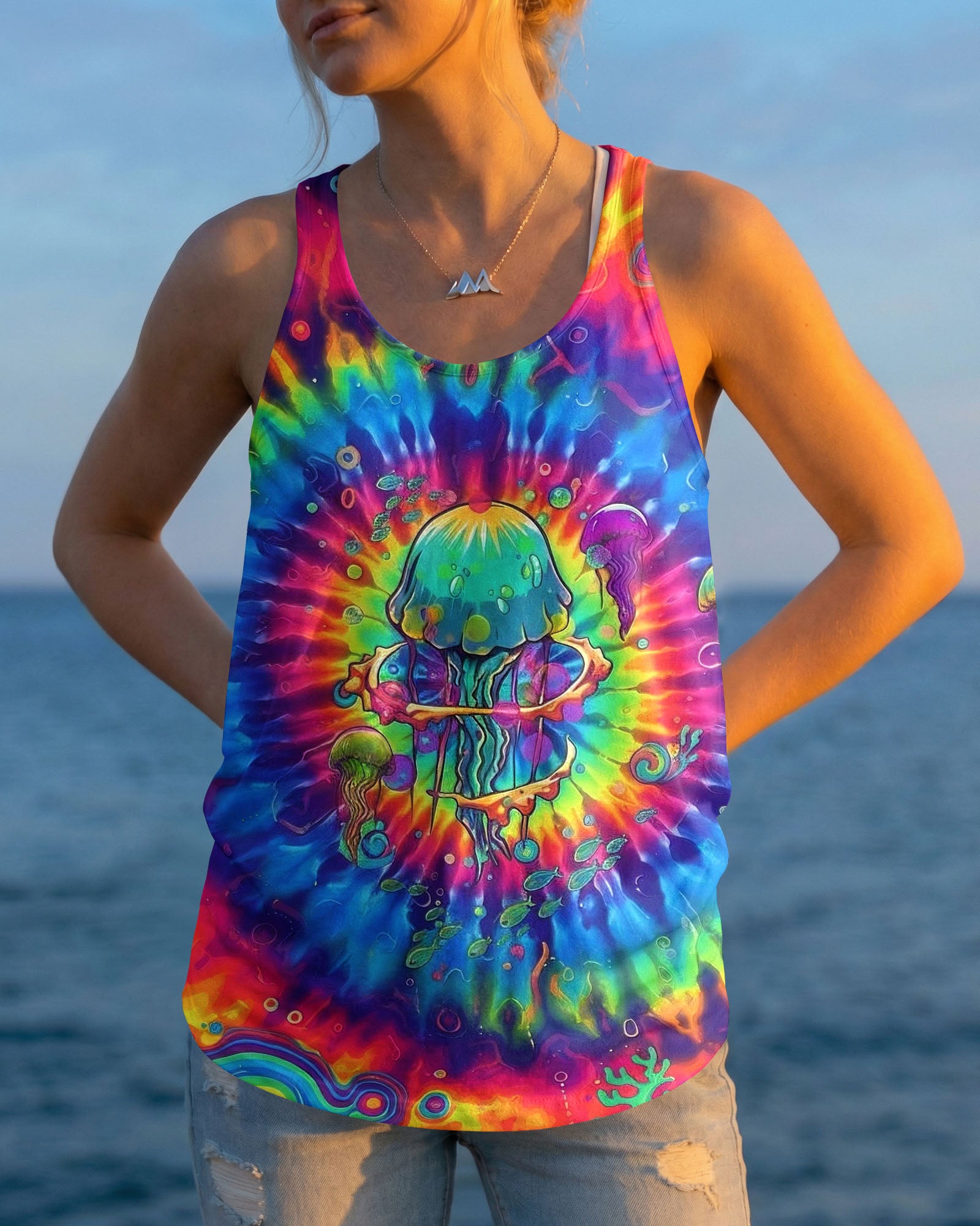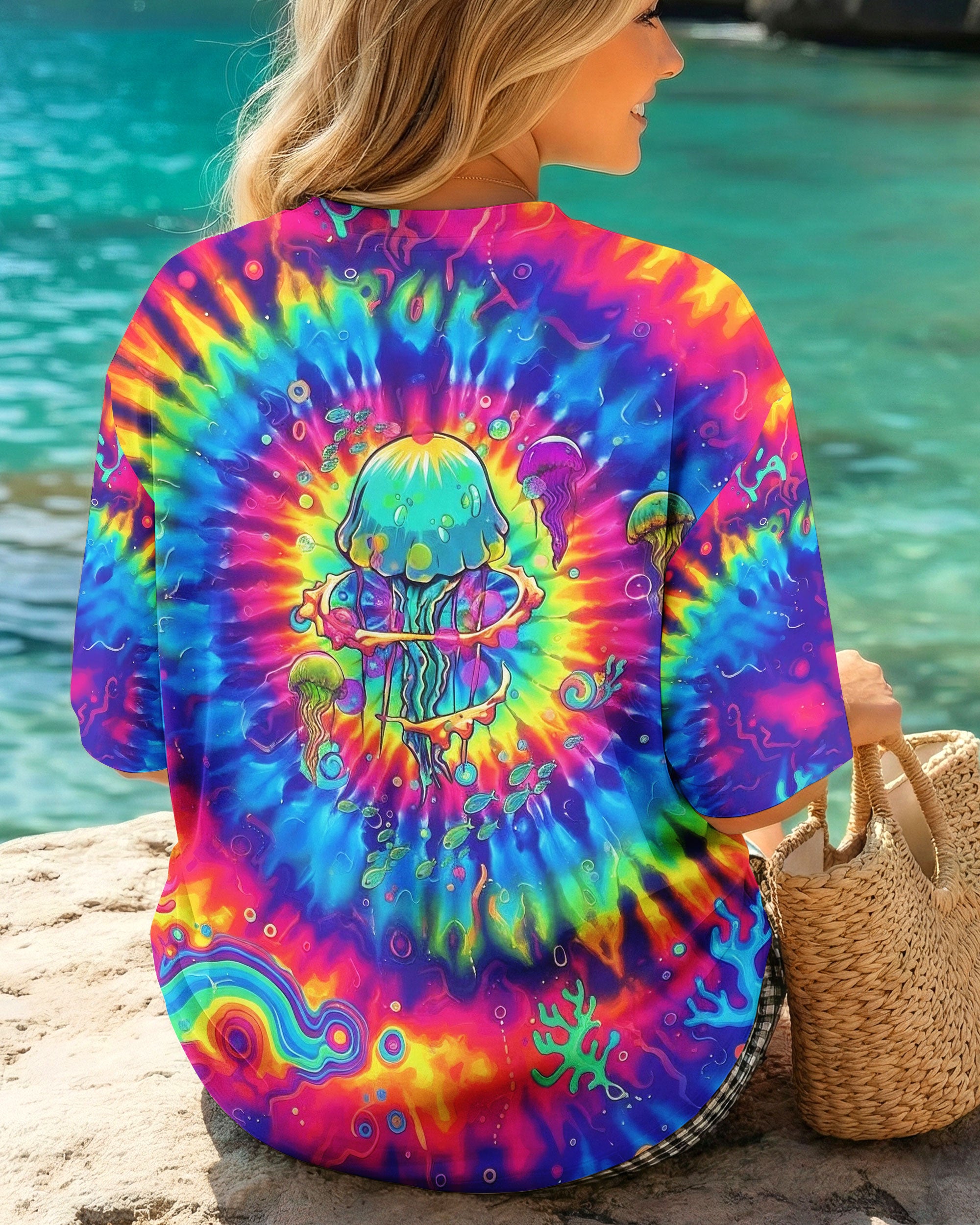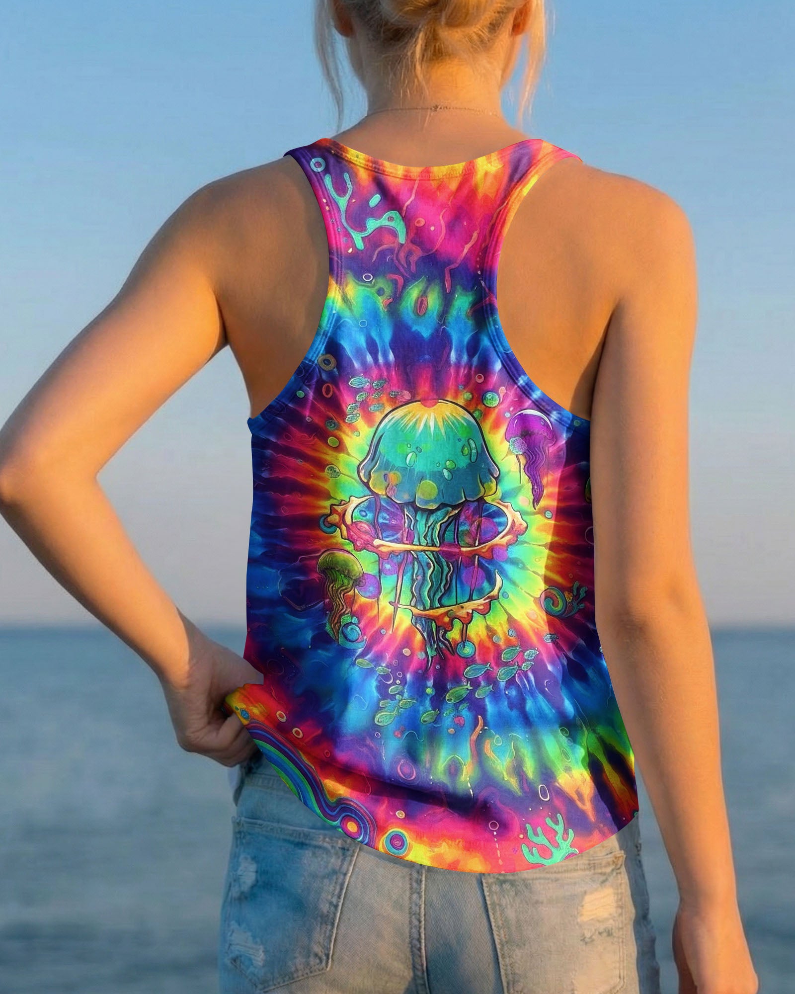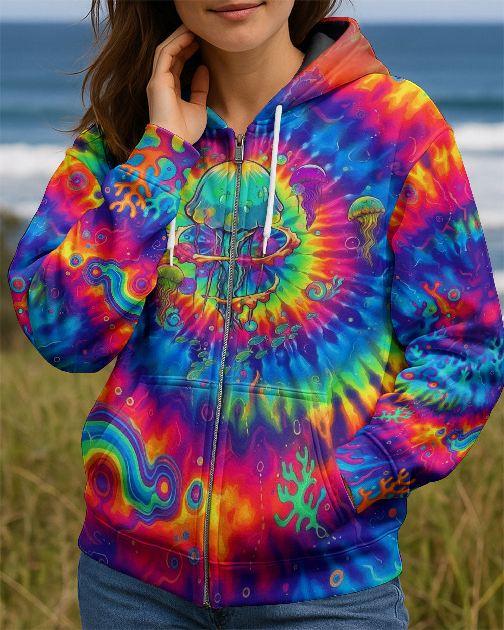 This all-over print design captures a mesmerizing jellyfish suspended within a radiant vortex of neon psychedelic hues and swirling ocean energy. The hypnotic composition evokes the sensation of drifting through a dreamlike seascape—mystical, boundless, and vibrantly alive. Beyond its visual impact, the design carries a deeper message: surrender to the current, trust the natural flow of life, and recognize the inherent magic within your own journey. Perfect for those drawn to ocean-inspired aesthetics and transformative symbolism.