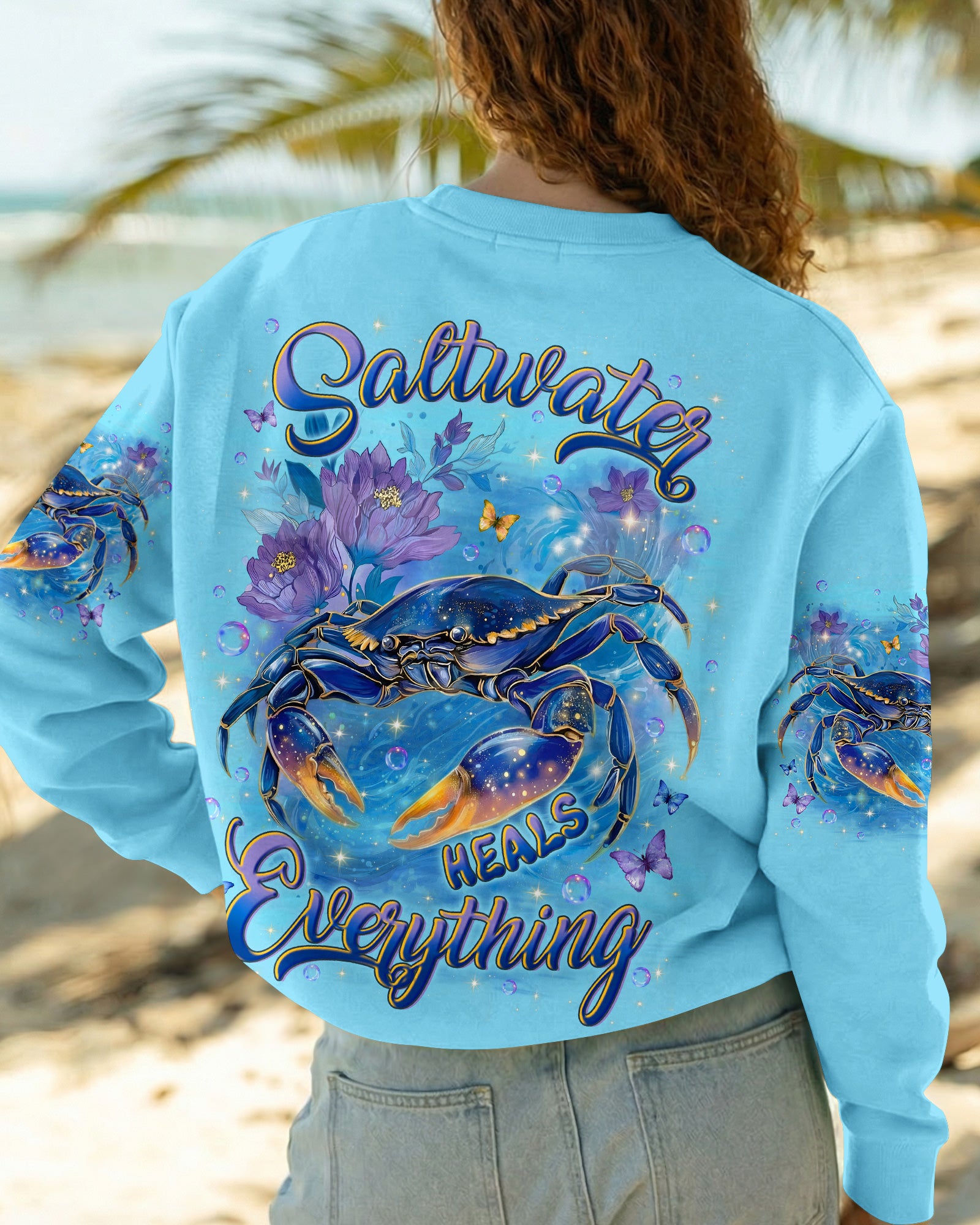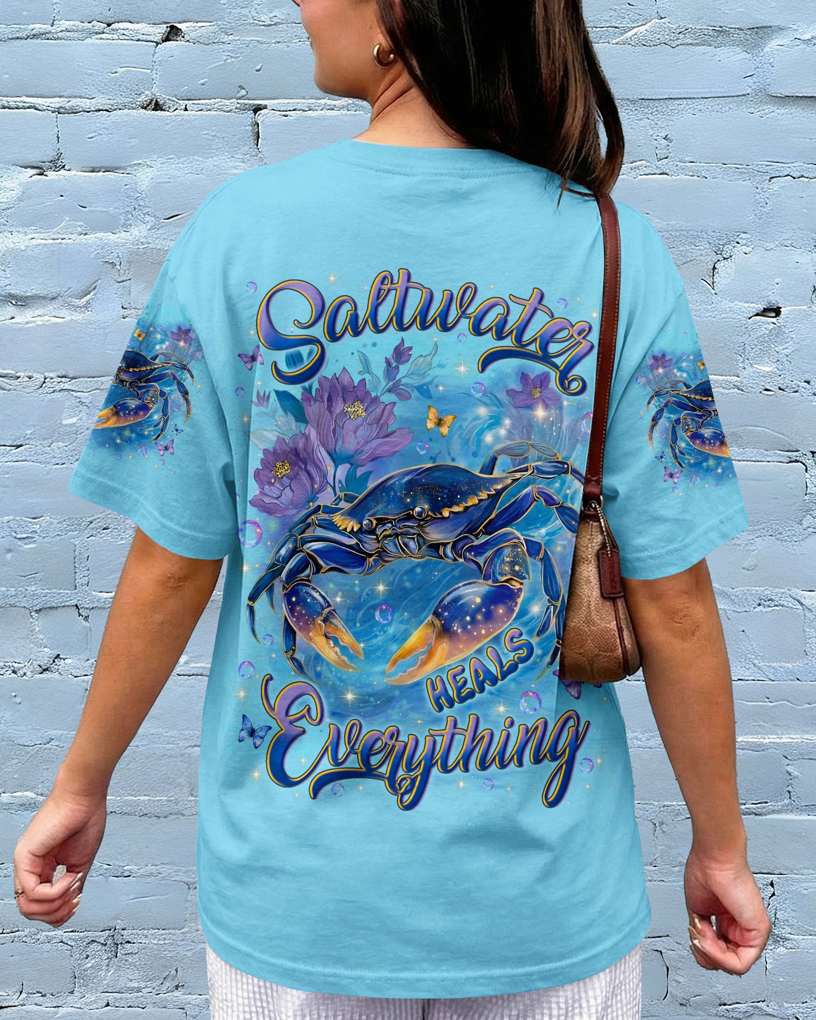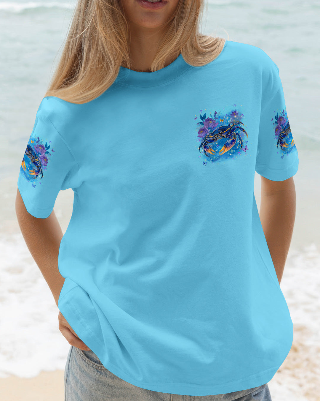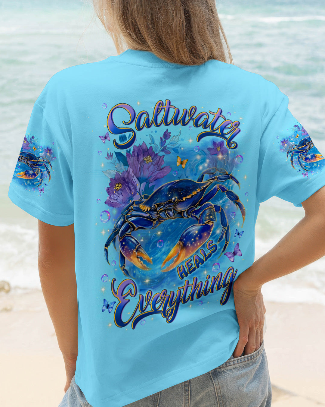 Along the shoreline where waves gently roll in, a cheerful crab moves through blooming seaside flowers, capturing the charm of coastal life. The ocean's saltwater becomes a natural remedy, washing away stress and restoring a sense of calm and clarity. With each wave, worries drift away, replaced by the soothing rhythm of the sea. The flowers add softness and beauty, reminding us that healing can be both gentle and vibrant. In this peaceful blend of ocean, life, and color, the heart finds balance and the soul feels renewed. This all-over print shirt brings that coastal serenity to your everyday wardrobe. Crafted from a premium cotton/polyester and spandex blend, it delivers comfort and durability with every wear. Using advanced dye-sublimation printing, each panel is individually printed, cut, and sewn for flawless graphics and vibrant, high-definition color that won't fade. The delicate combination of patterns and perfect cutting edges transforms this into wearable art—a piece that stands out wherever you go.