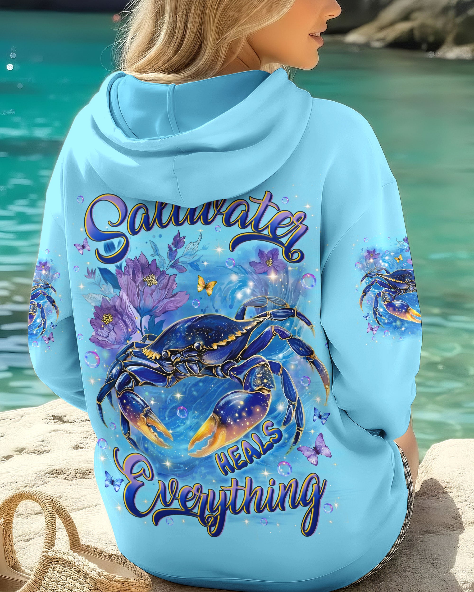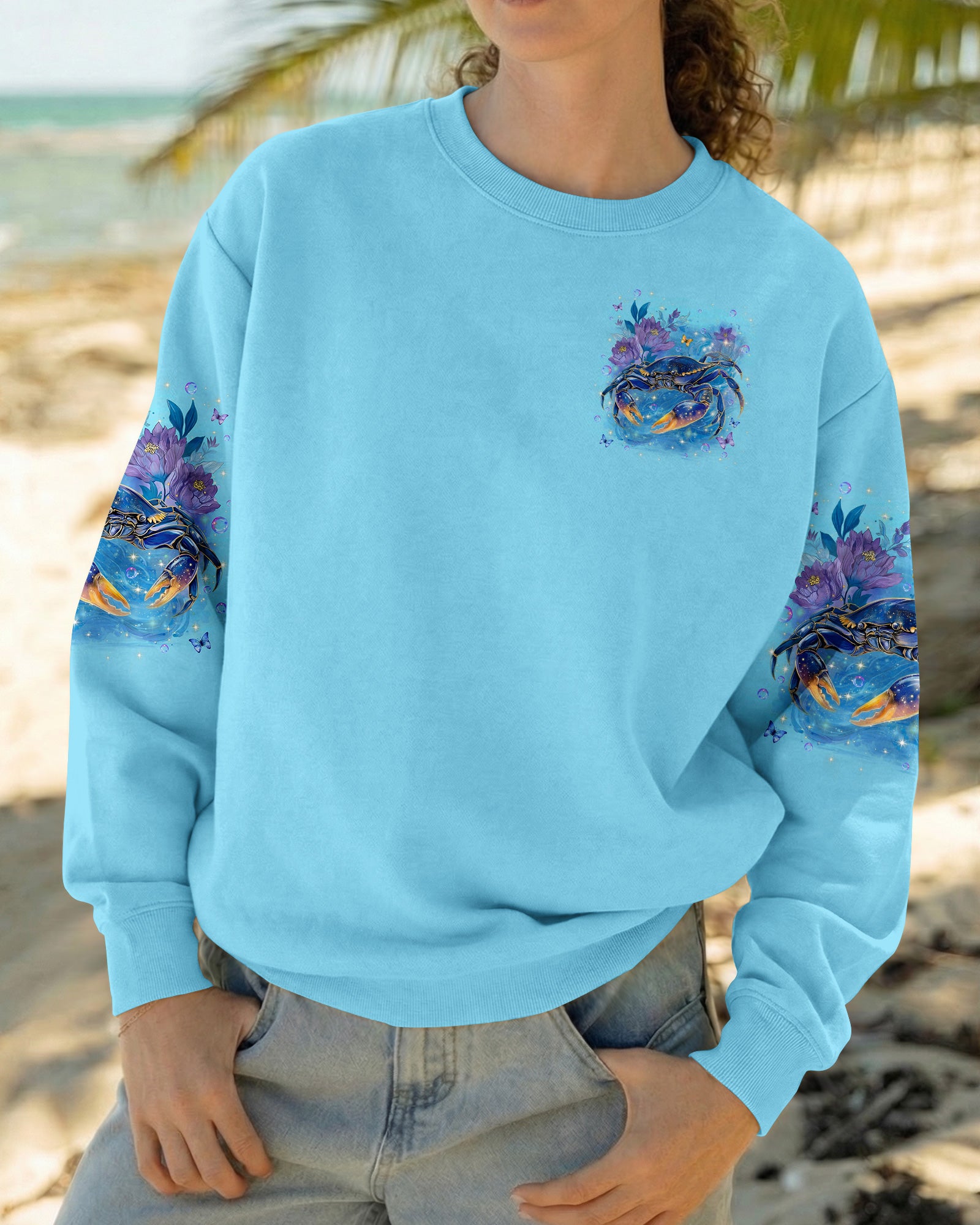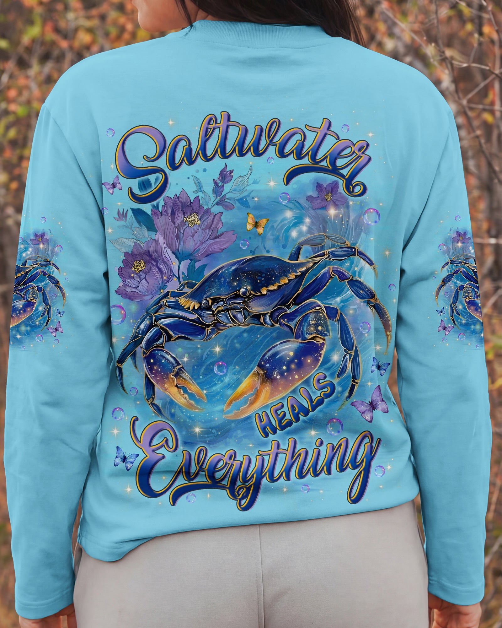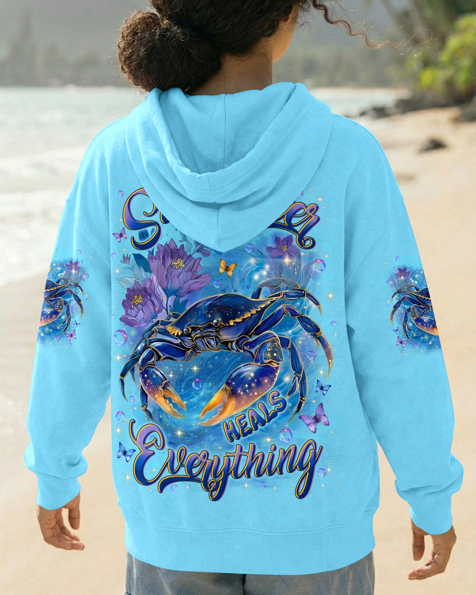 Along the shoreline where waves gently roll in, a cheerful crab moves through blooming seaside flowers, capturing the charm of coastal life. The ocean's saltwater becomes a natural remedy, washing away stress and restoring a sense of calm and clarity. With each wave, worries drift away, replaced by the soothing rhythm of the sea. The flowers add softness and beauty, reminding us that healing can be both gentle and vibrant. In this peaceful blend of ocean, life, and color, the heart finds balance and the soul feels renewed. This all-over print shirt brings that coastal serenity to your everyday wardrobe. Crafted from a premium cotton/polyester and spandex blend, it delivers comfort and durability with every wear. Using advanced dye-sublimation printing, each panel is individually printed, cut, and sewn for flawless graphics and vibrant, high-definition color that won't fade. The delicate combination of patterns and perfect cutting edges transforms this into wearable art—a piece that stands out wherever you go.