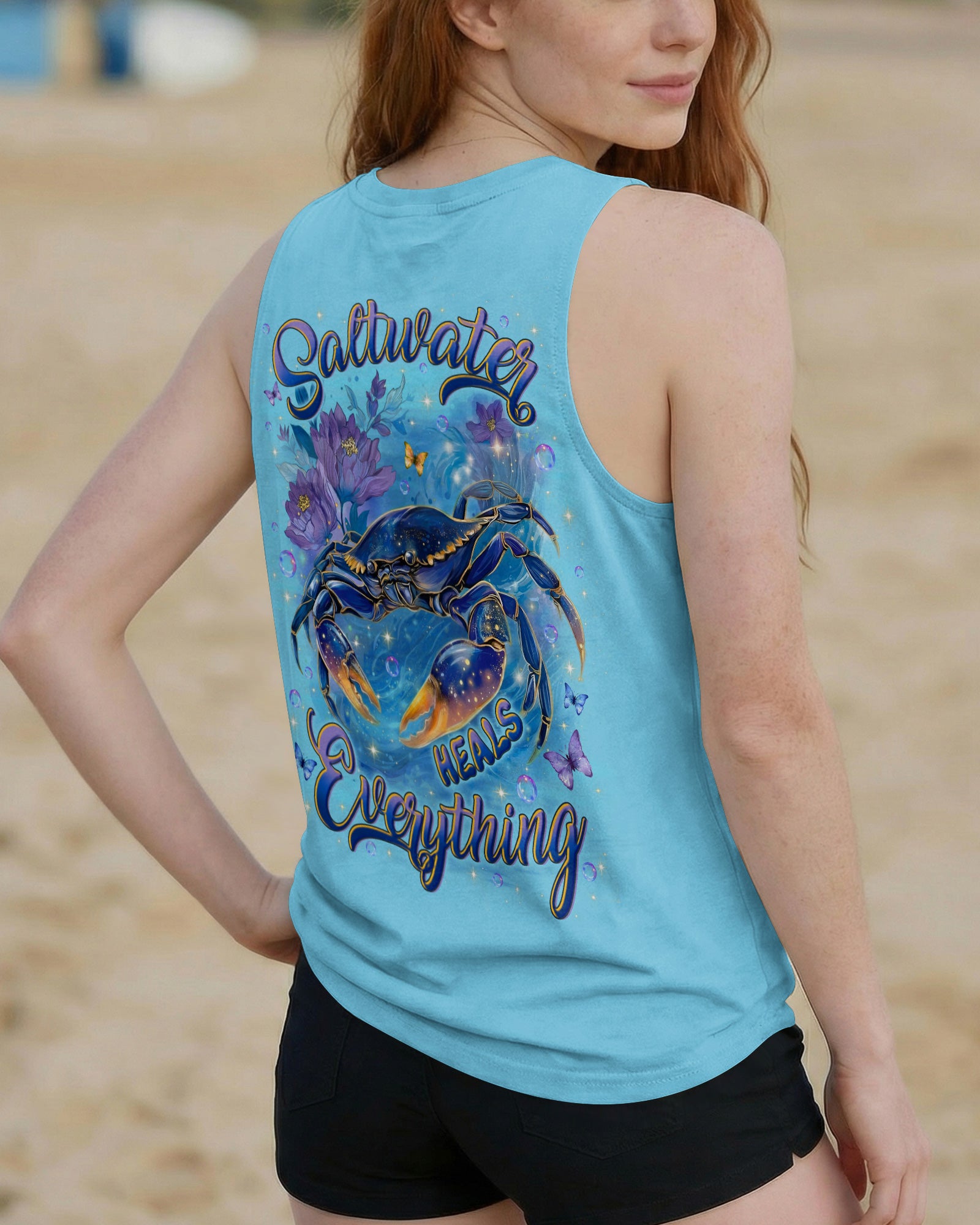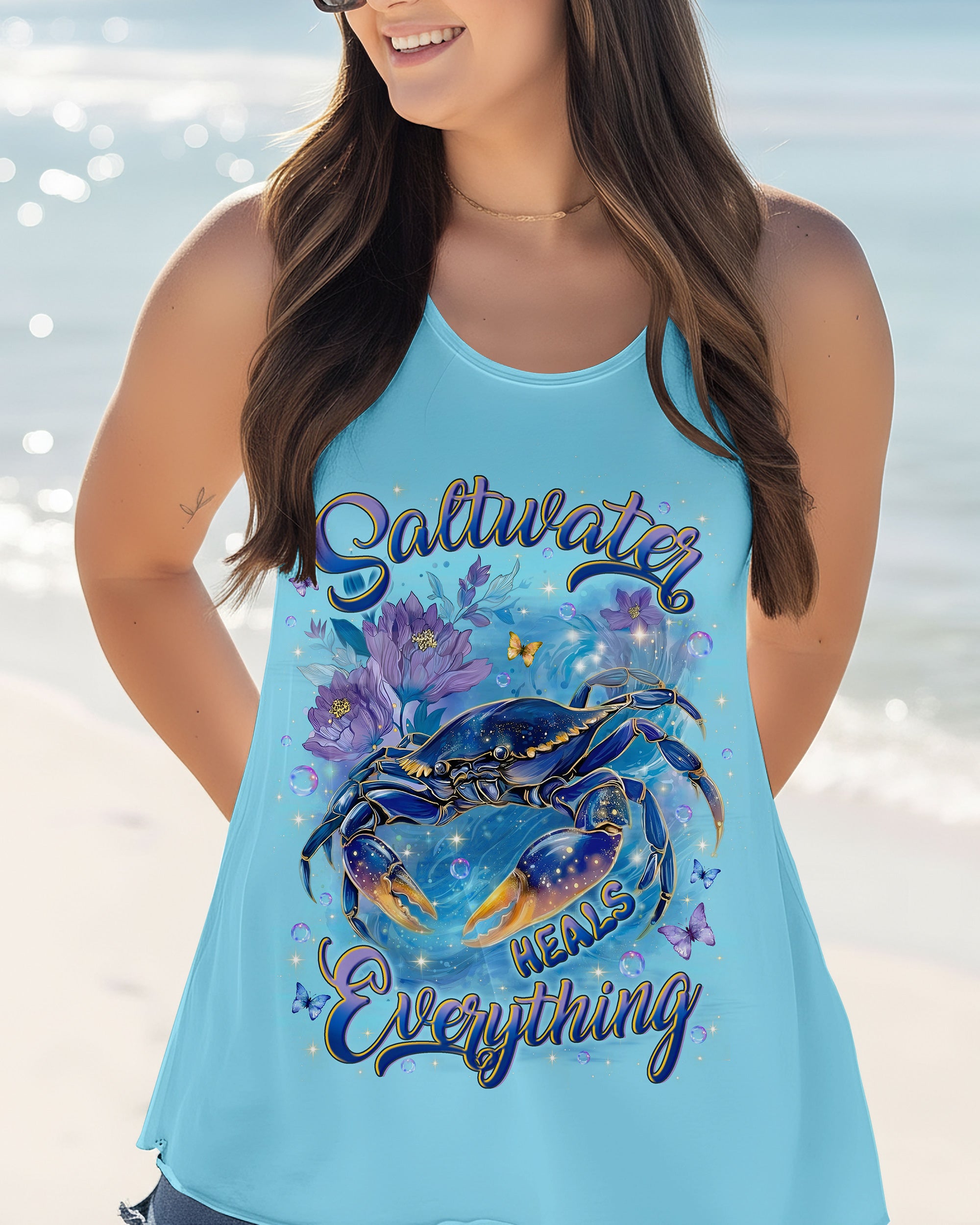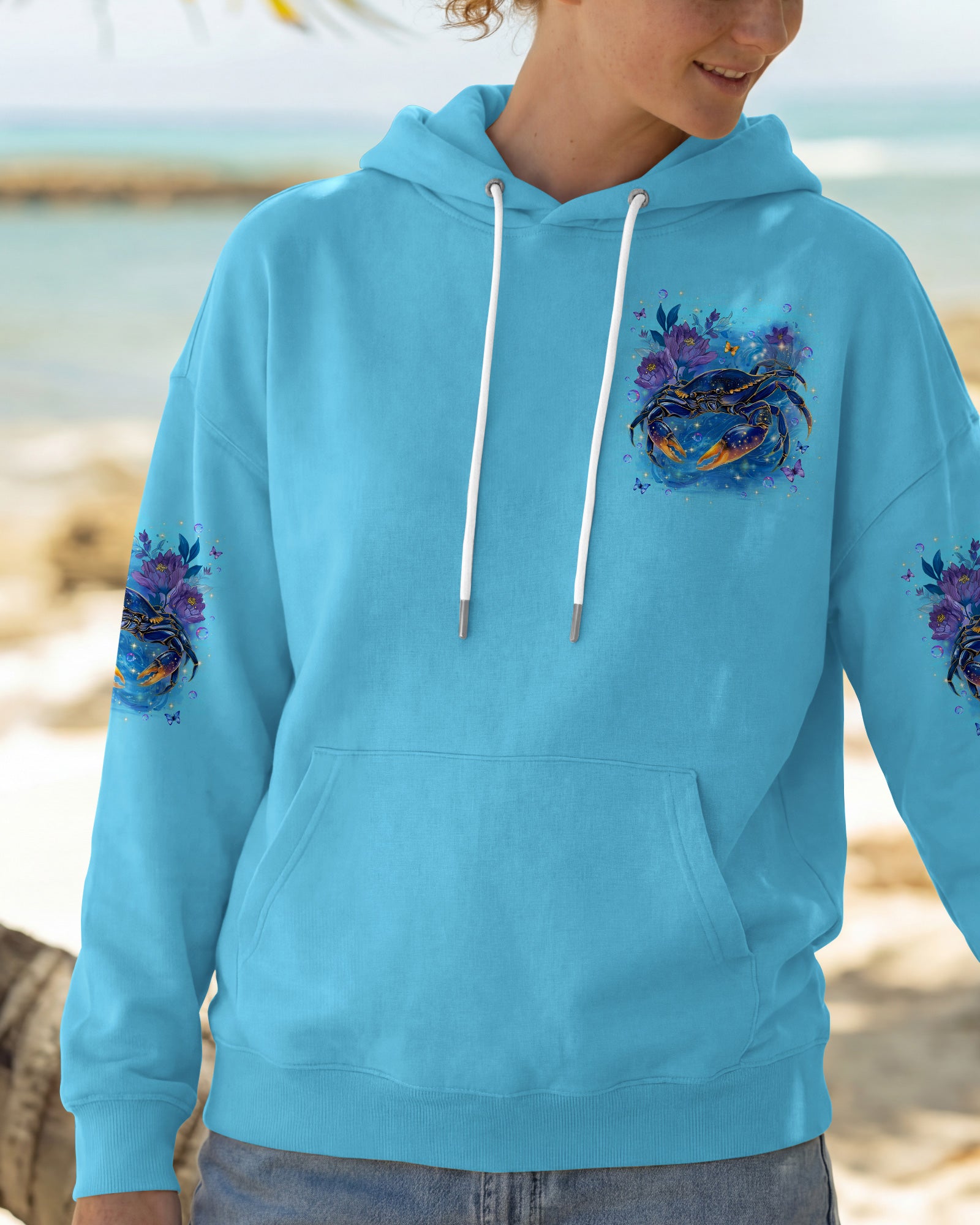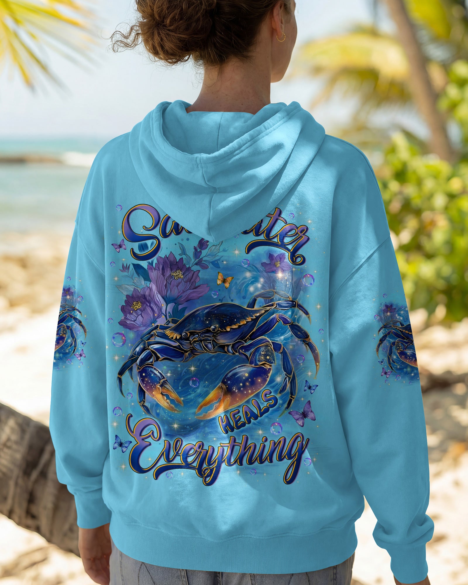 Along the shoreline where waves gently roll in, a cheerful crab moves through blooming seaside flowers, capturing the charm of coastal life. The ocean's saltwater becomes a natural remedy, washing away stress and restoring a sense of calm and clarity. With each wave, worries drift away, replaced by the soothing rhythm of the sea. The flowers add softness and beauty, reminding us that healing can be both gentle and vibrant. In this peaceful blend of ocean, life, and color, the heart finds balance and the soul feels renewed. This all-over print shirt brings that coastal serenity to your everyday wardrobe. Crafted from a premium cotton/polyester and spandex blend, it delivers comfort and durability with every wear. Using advanced dye-sublimation printing, each panel is individually printed, cut, and sewn for flawless graphics and vibrant, high-definition color that won't fade. The delicate combination of patterns and perfect cutting edges transforms this into wearable art—a piece that stands out wherever you go.