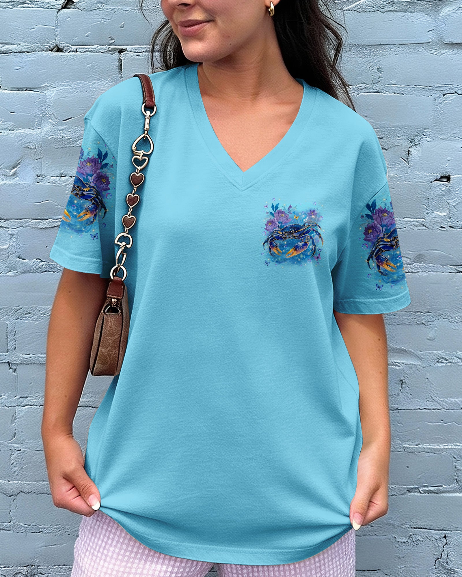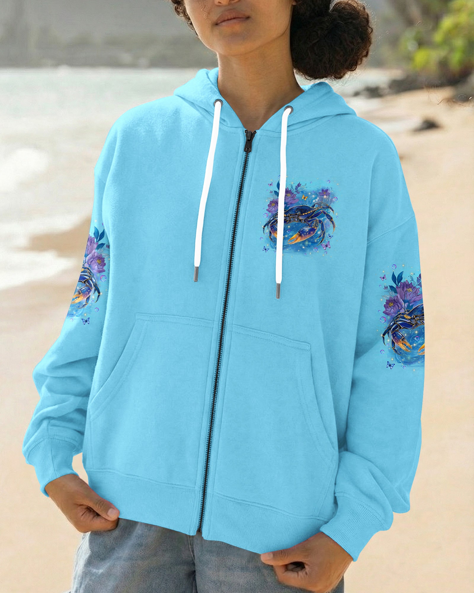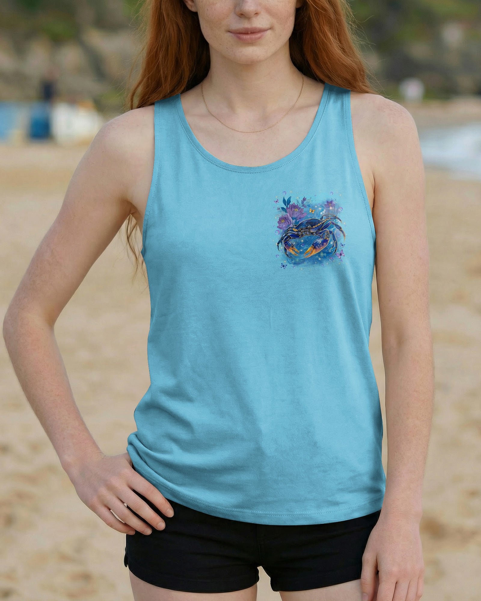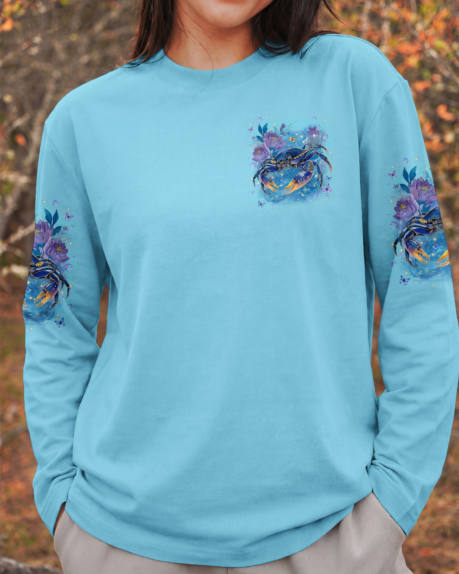 Along the shoreline where waves gently roll in, a cheerful crab moves through blooming seaside flowers, capturing the charm of coastal life. The ocean's saltwater becomes a natural remedy, washing away stress and restoring a sense of calm and clarity. With each wave, worries drift away, replaced by the soothing rhythm of the sea. The flowers add softness and beauty, reminding us that healing can be both gentle and vibrant. In this peaceful blend of ocean, life, and color, the heart finds balance and the soul feels renewed. This all-over print shirt brings that coastal serenity to your everyday wardrobe. Crafted from a premium cotton/polyester and spandex blend, it delivers comfort and durability with every wear. Using advanced dye-sublimation printing, each panel is individually printed, cut, and sewn for flawless graphics and vibrant, high-definition color that won't fade. The delicate combination of patterns and perfect cutting edges transforms this into wearable art—a piece that stands out wherever you go.