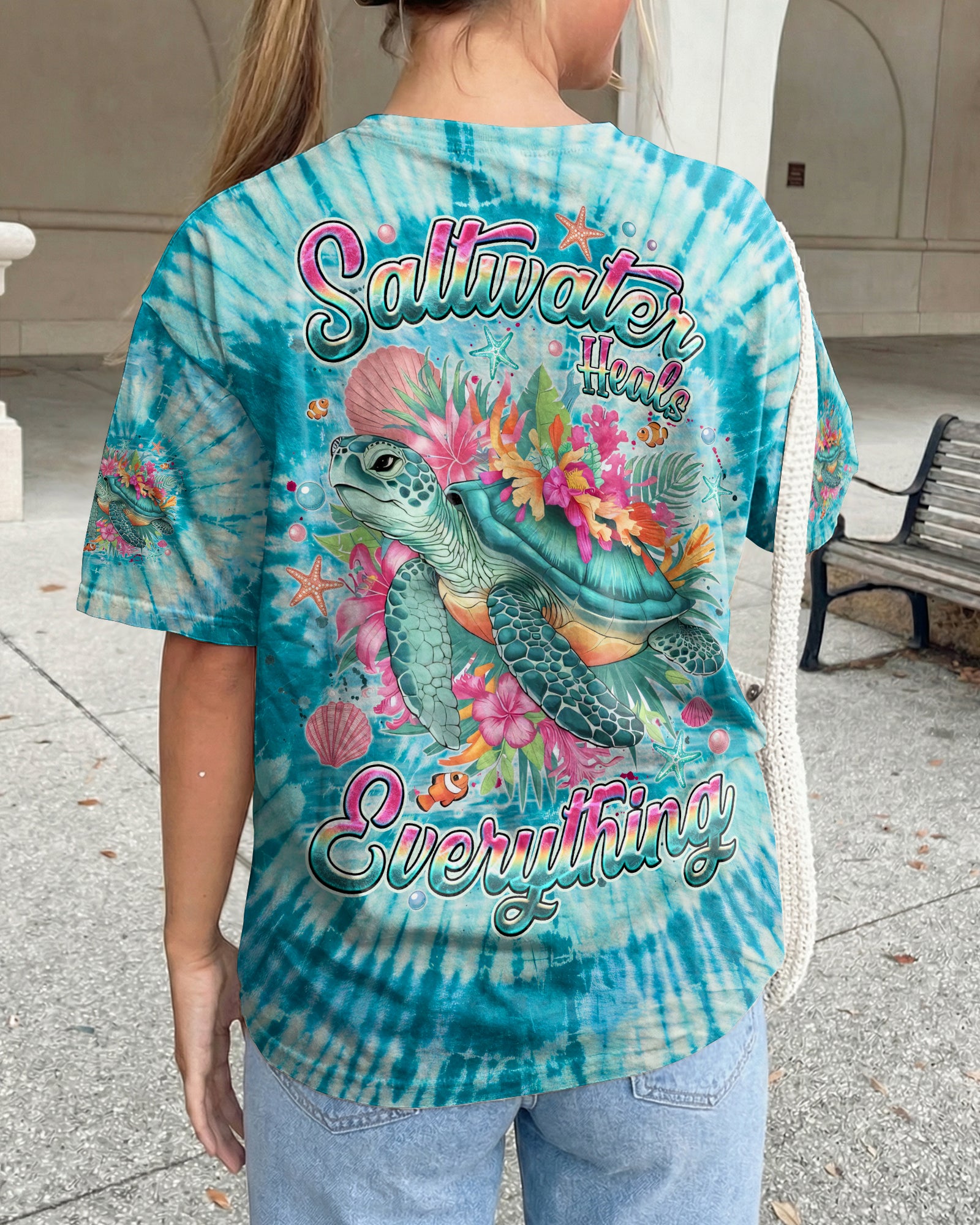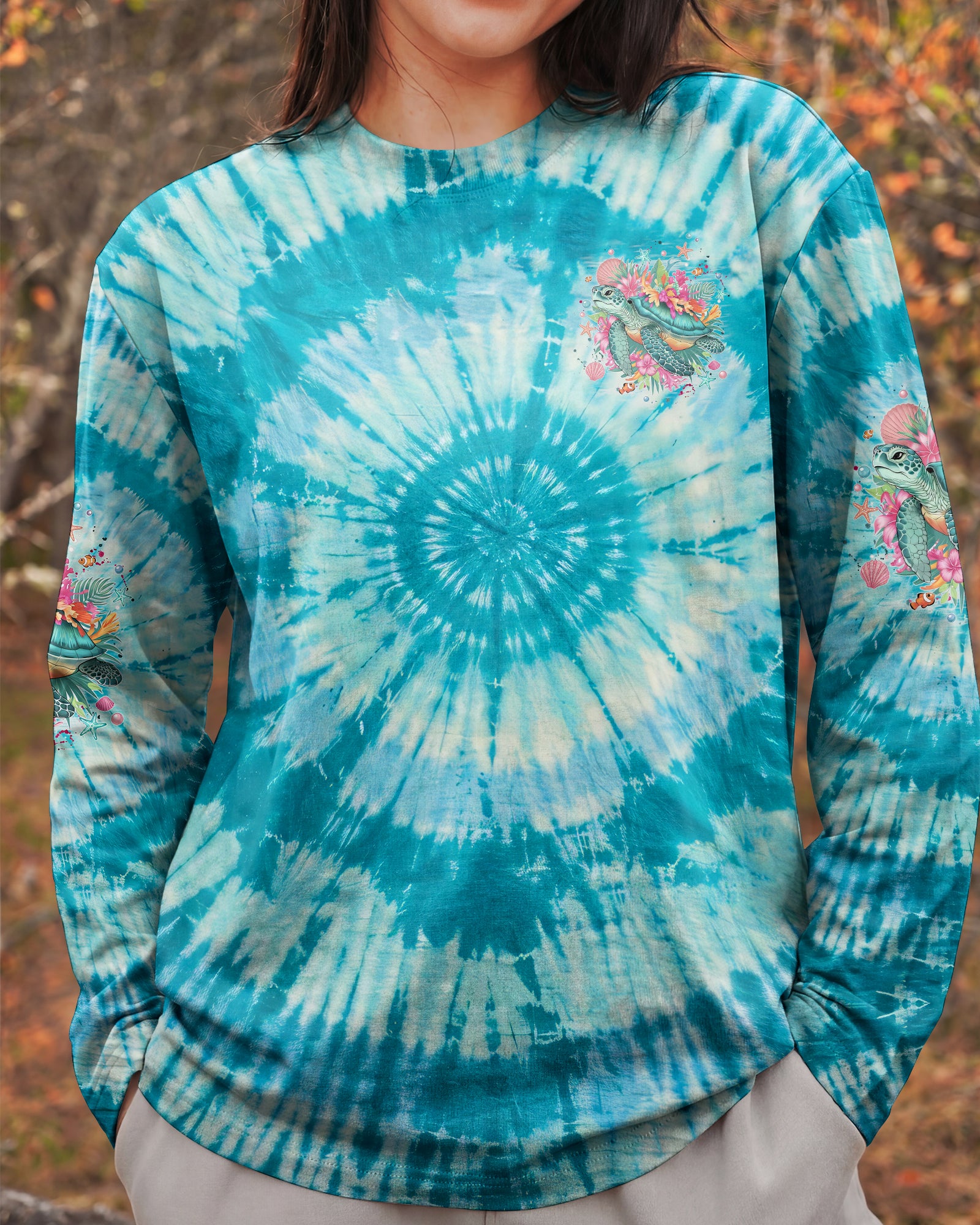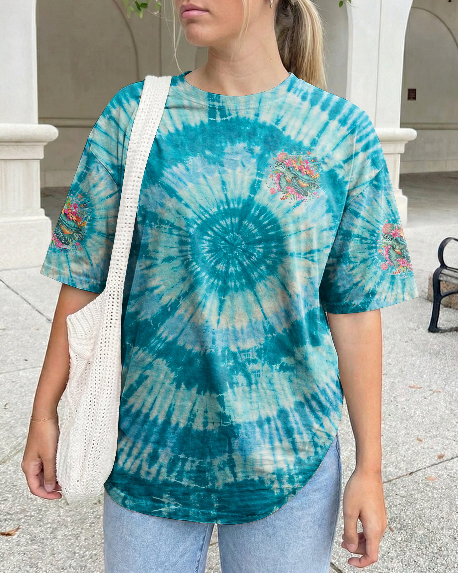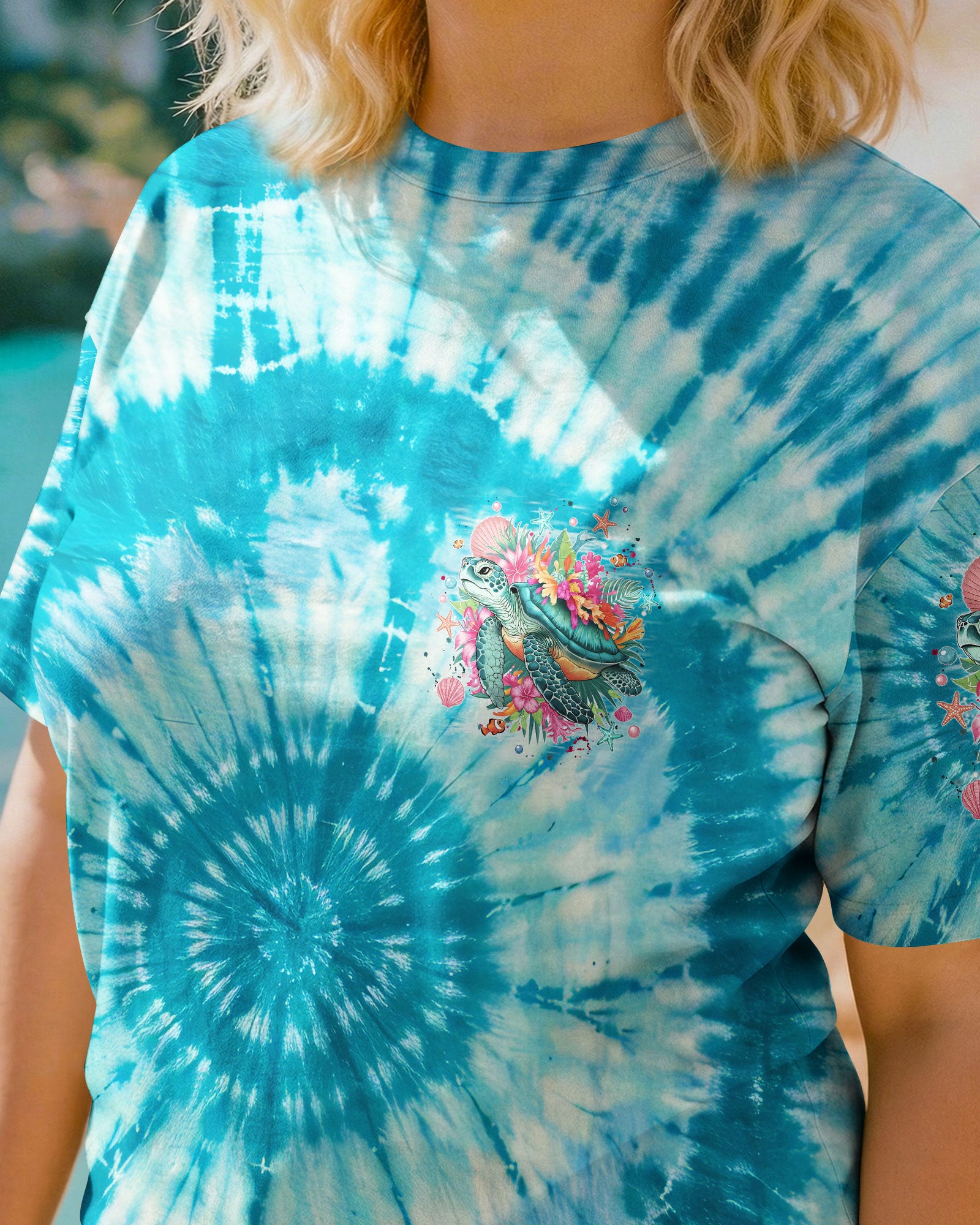 A serene escape wrapped around you—this all-over print shirt brings the healing power of the ocean to life. Aqua blue and teal tones create a calming backdrop where a graceful sea turtle glides among blooming flowers, symbolizing patience, wisdom, and gentle renewal. The cool palette evokes tranquility and depth, while soft florals remind us that growth continues even in quiet moments. Crafted from a premium cotton/polyester and spandex blend, this shirt combines comfort with durability. Advanced dye-sublimation printing delivers vibrant, high-definition color across every panel—each individually printed, cut, and sewn for a flawless finish. The result is wearable art that draws admiration wherever you go, with delicate color combinations and perfect edges that feel as refined as they look. Let saltwater healing wash away stress and renew your spirit with every wear. Balance and wholeness, one shirt at a time. 🌊🐢🌸