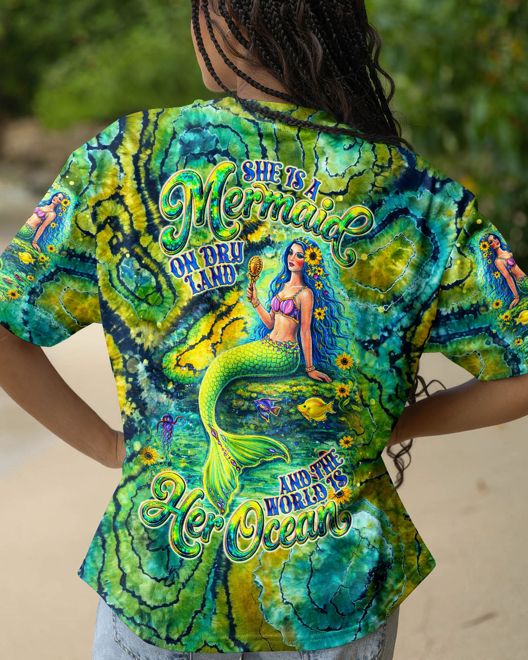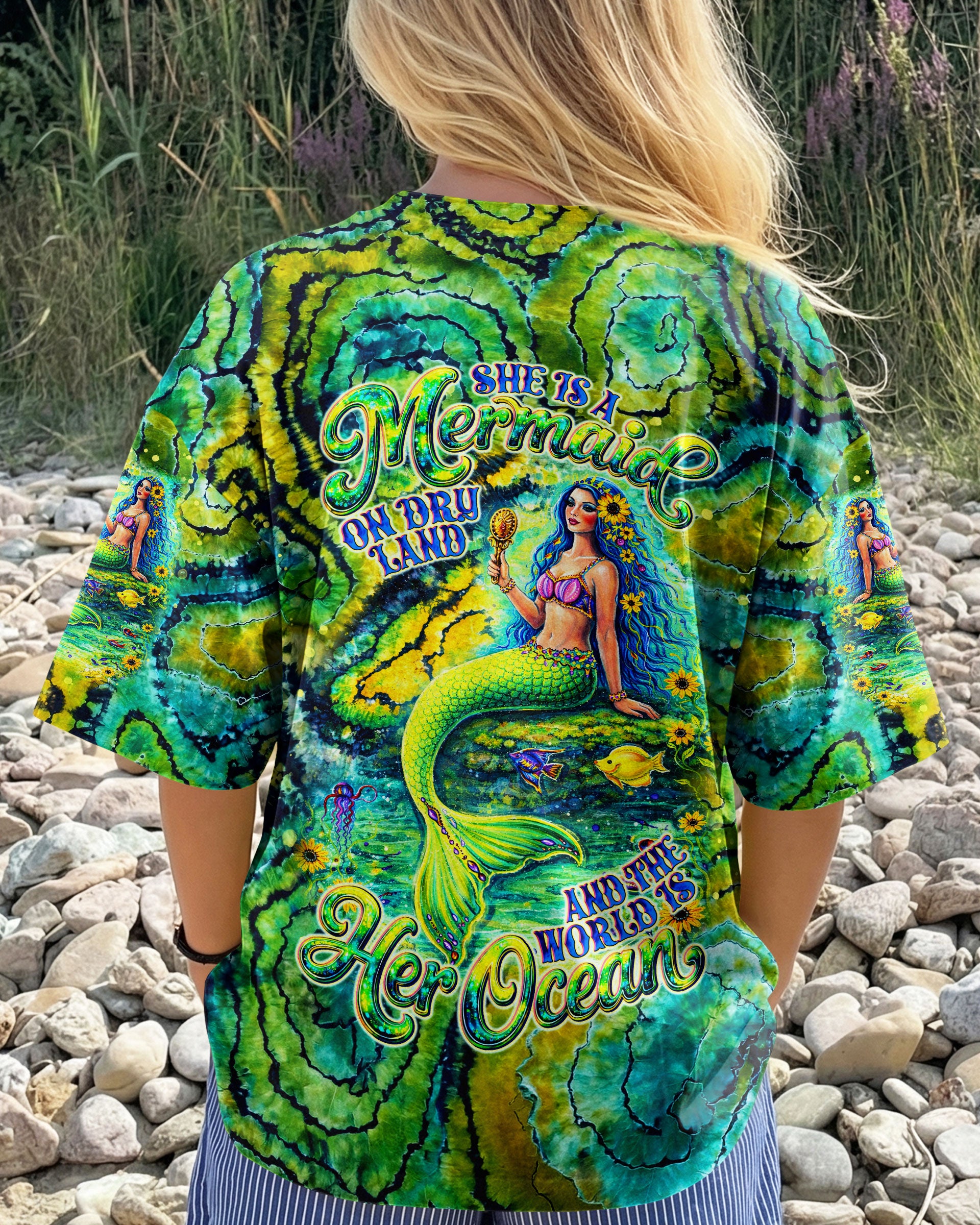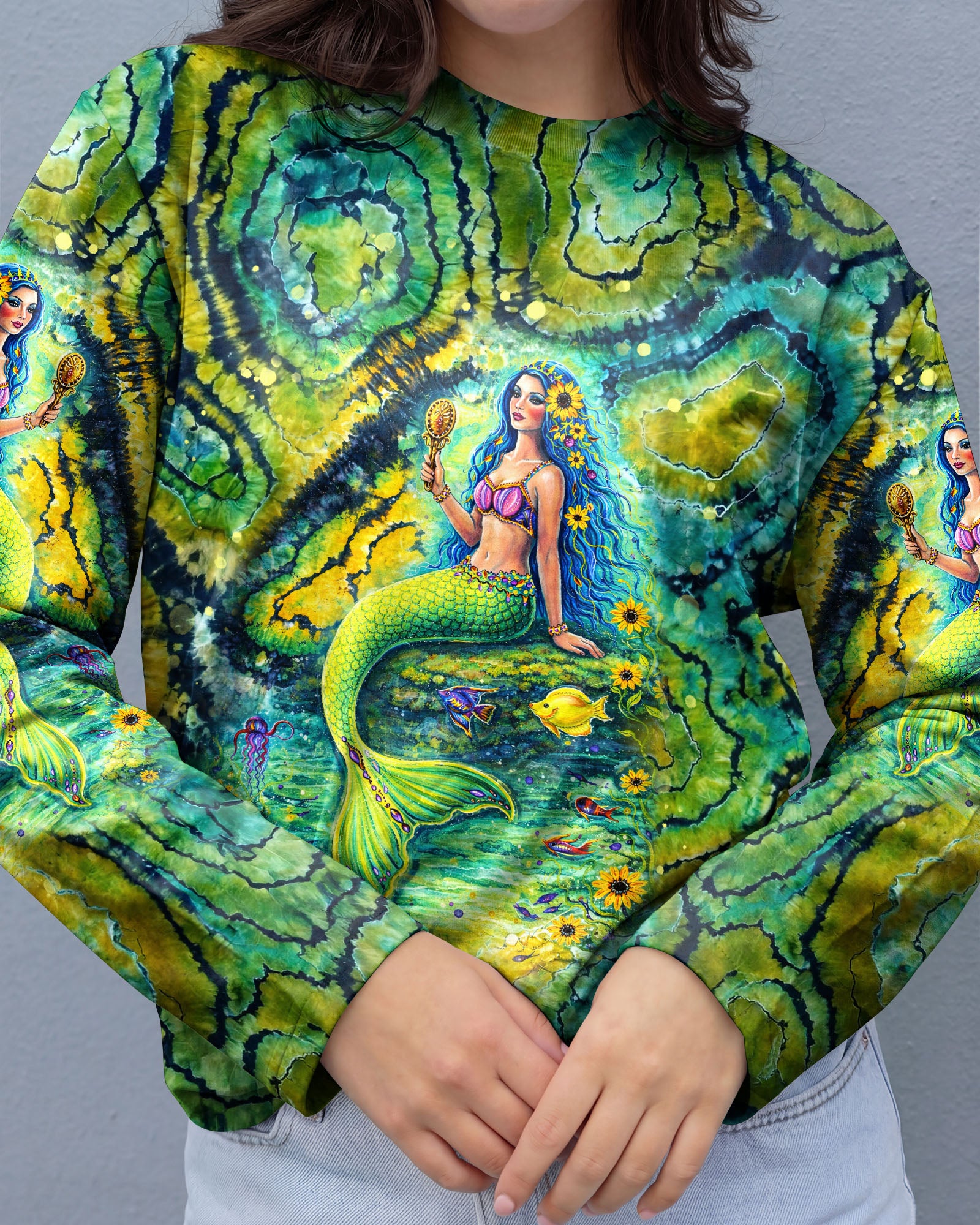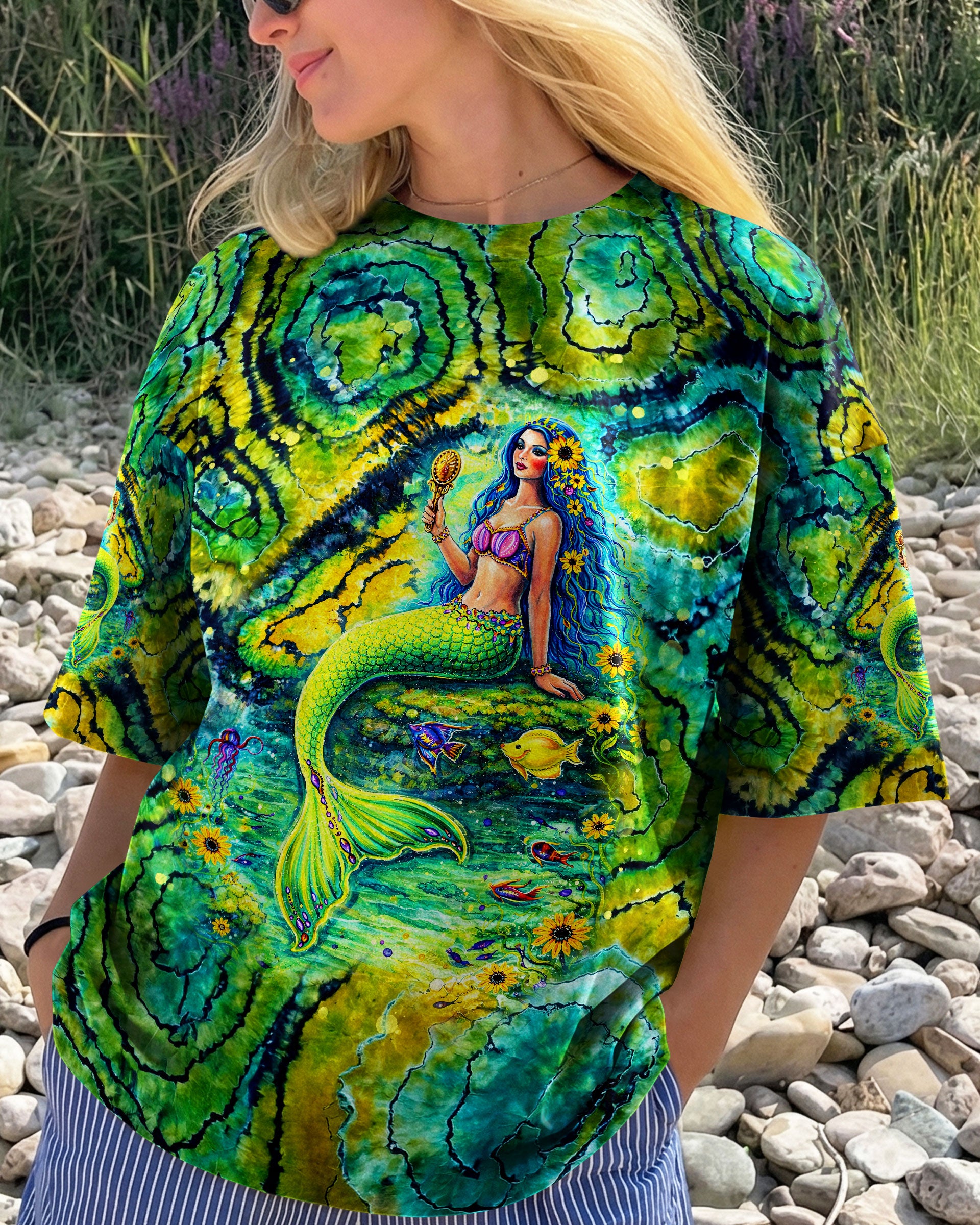 SHE IS A MERMAID SWIRL ALL OVER PRINT - TLNT0904262 Dive into a dreamy underwater world with this enchanting all-over print shirt. A whimsical mermaid rests on rocky shores, surrounded by blooming sea flowers and playful fish rendered in soft watercolor tones. The magical, flowing design captures the essence of a free spirit who belongs everywhere—carrying ocean energy beyond the waves. A poetic reminder that your world is as vast and beautiful as you dare to imagine. Crafted from a premium cotton/polyester and spandex blend, this shirt combines comfort with durability. Each panel is individually printed, cut, and sewn using advanced dye-sublimation 3D printing technology, ensuring flawless graphics with no imperfections. High-definition printing brings the delicate color combinations and intricate patterns to life, making this wearable art stand out wherever you go.