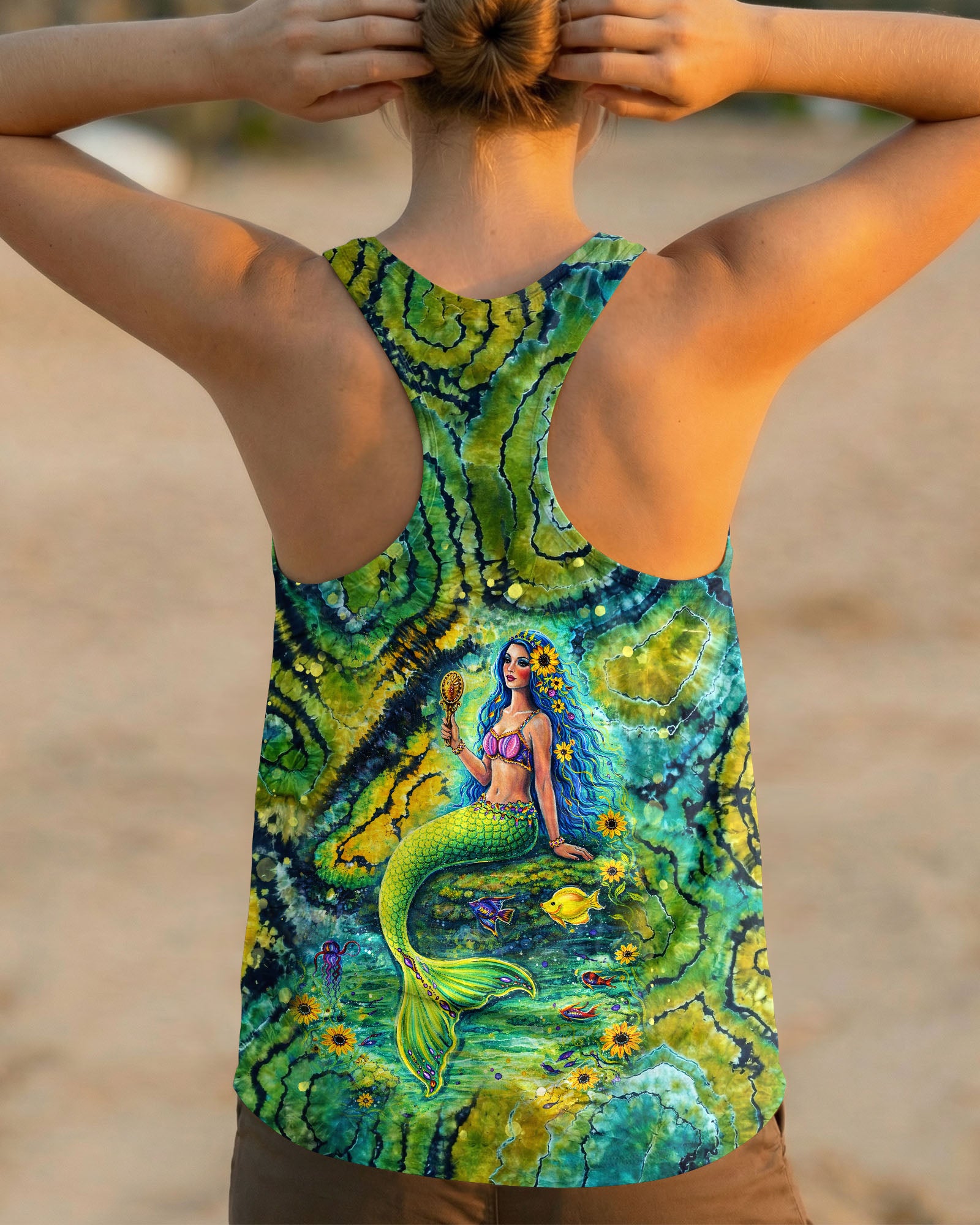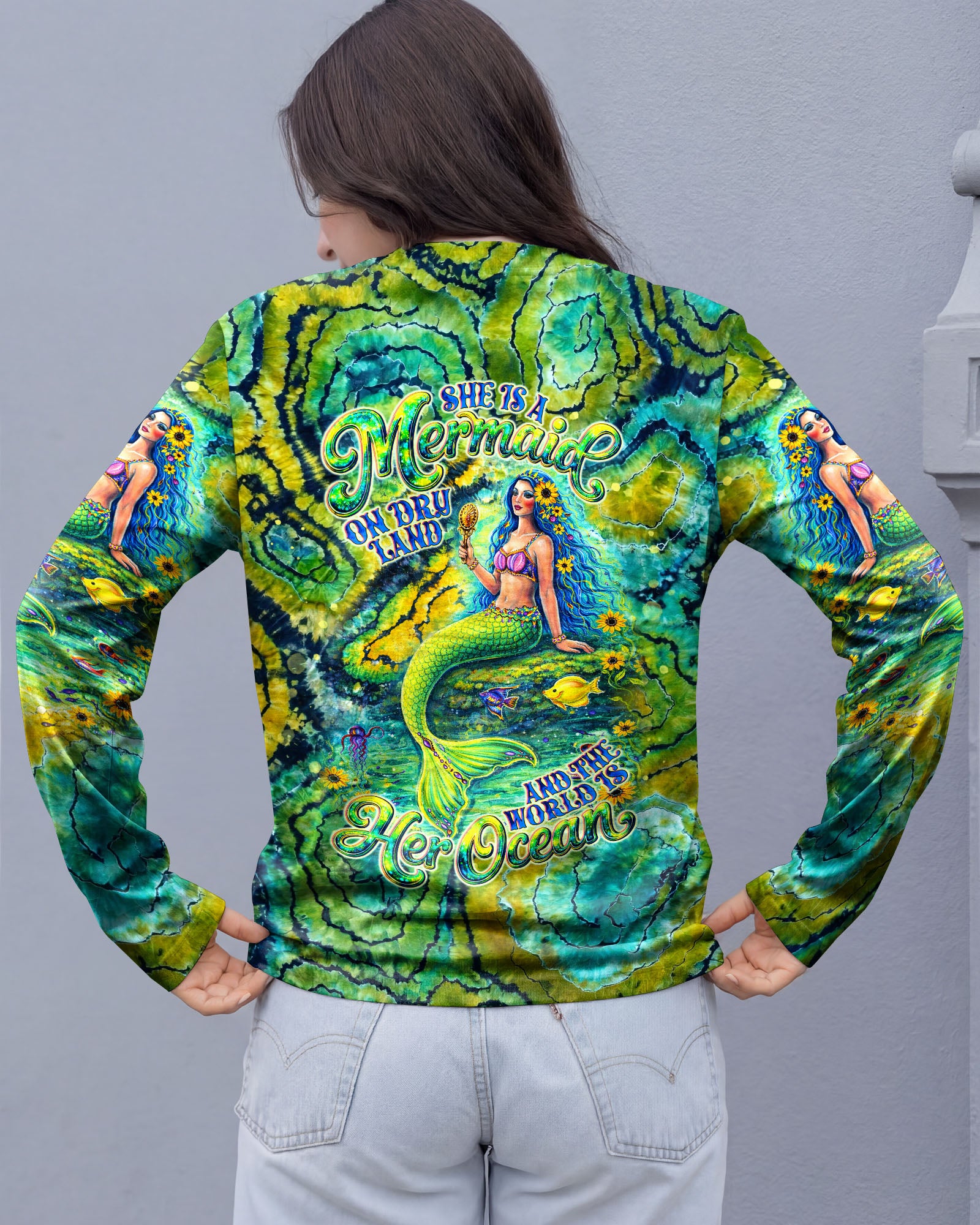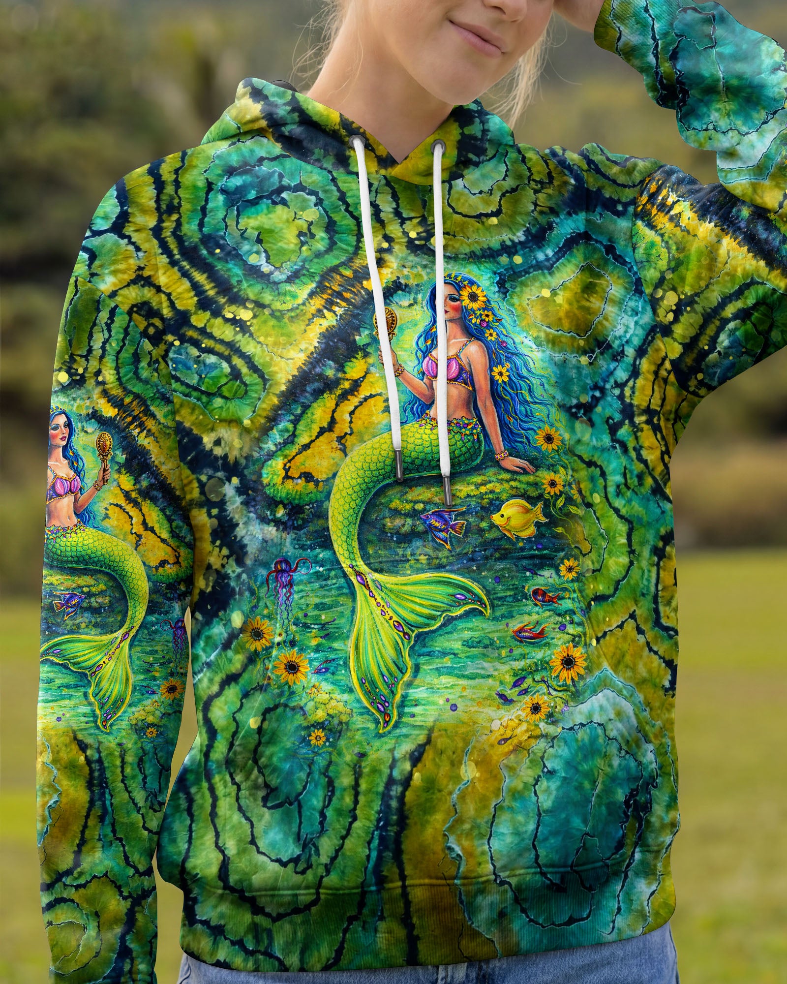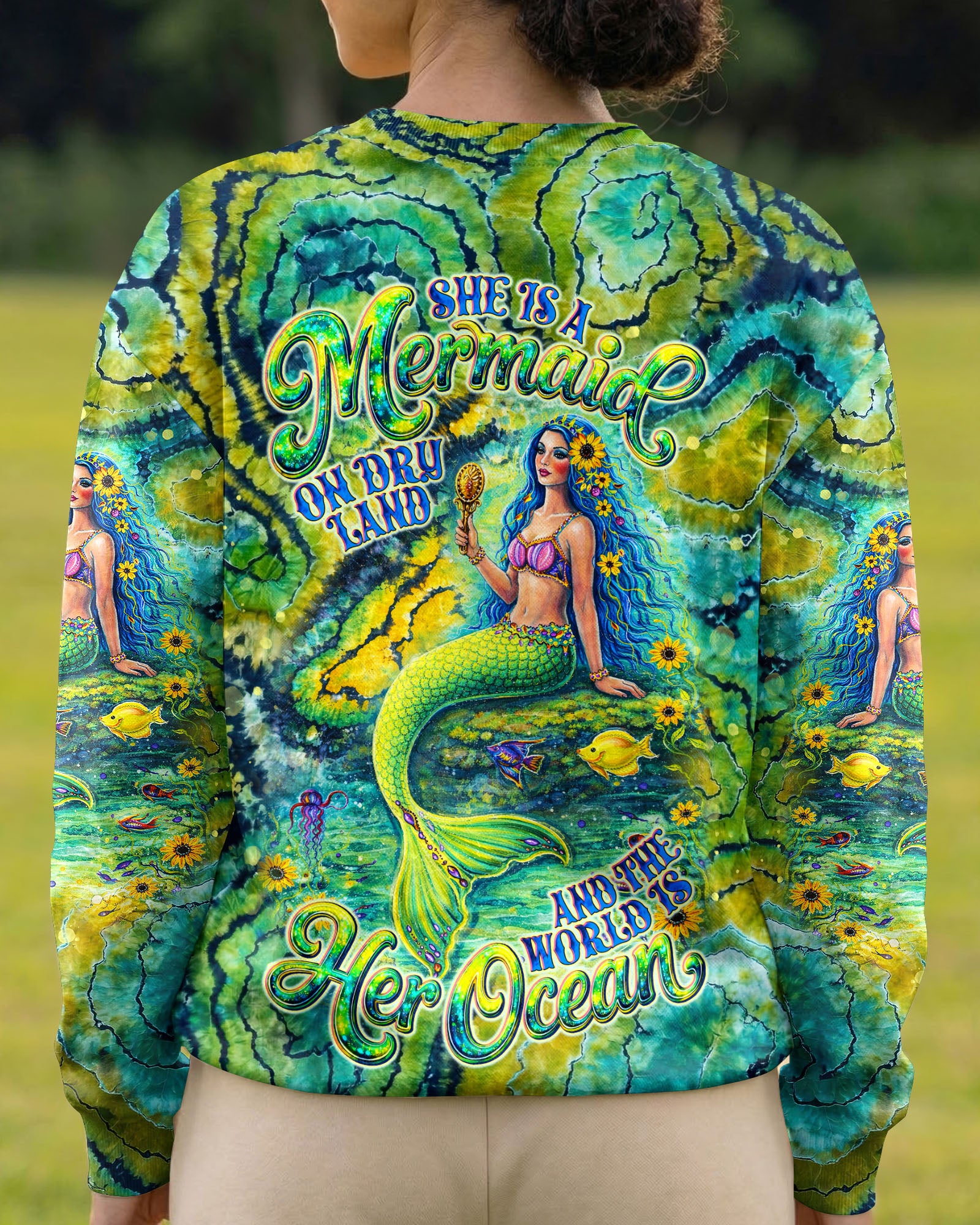 SHE IS A MERMAID SWIRL ALL OVER PRINT - TLNT0904262 Dive into a dreamy underwater world with this enchanting all-over print shirt. A whimsical mermaid rests on rocky shores, surrounded by blooming sea flowers and playful fish rendered in soft watercolor tones. The magical, flowing design captures the essence of a free spirit who belongs everywhere—carrying ocean energy beyond the waves. A poetic reminder that your world is as vast and beautiful as you dare to imagine. Crafted from a premium cotton/polyester and spandex blend, this shirt combines comfort with durability. Each panel is individually printed, cut, and sewn using advanced dye-sublimation 3D printing technology, ensuring flawless graphics with no imperfections. High-definition printing brings the delicate color combinations and intricate patterns to life, making this wearable art stand out wherever you go.