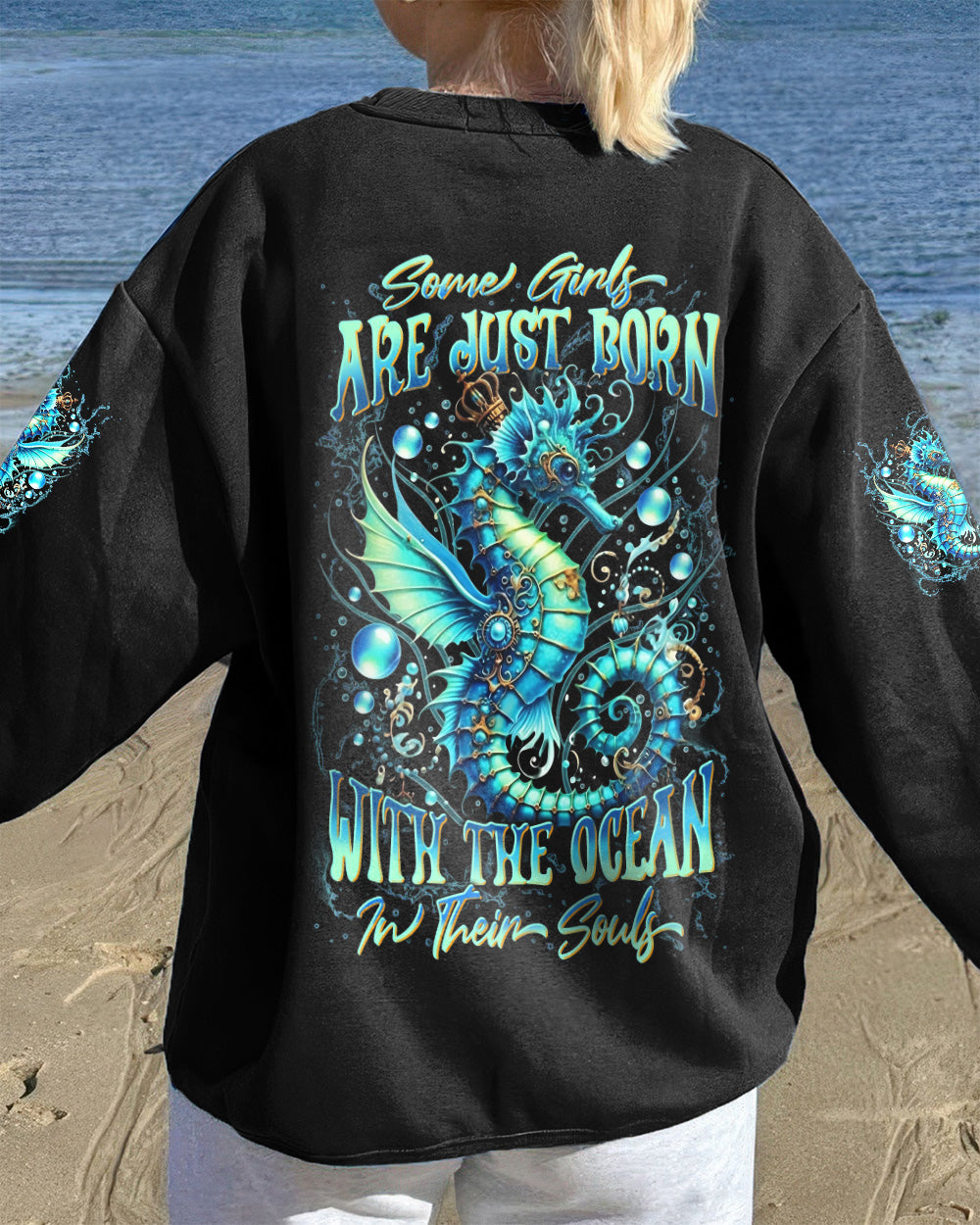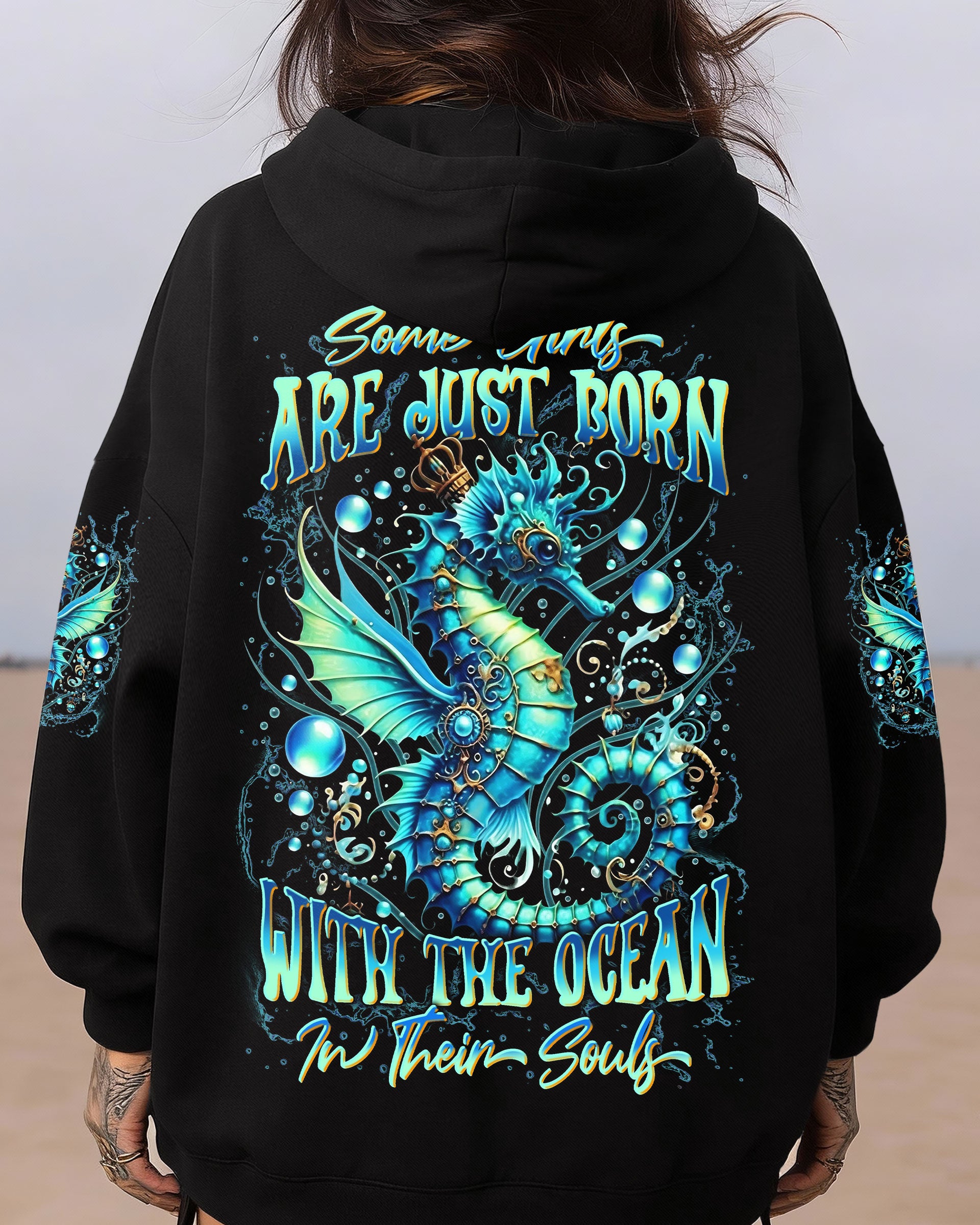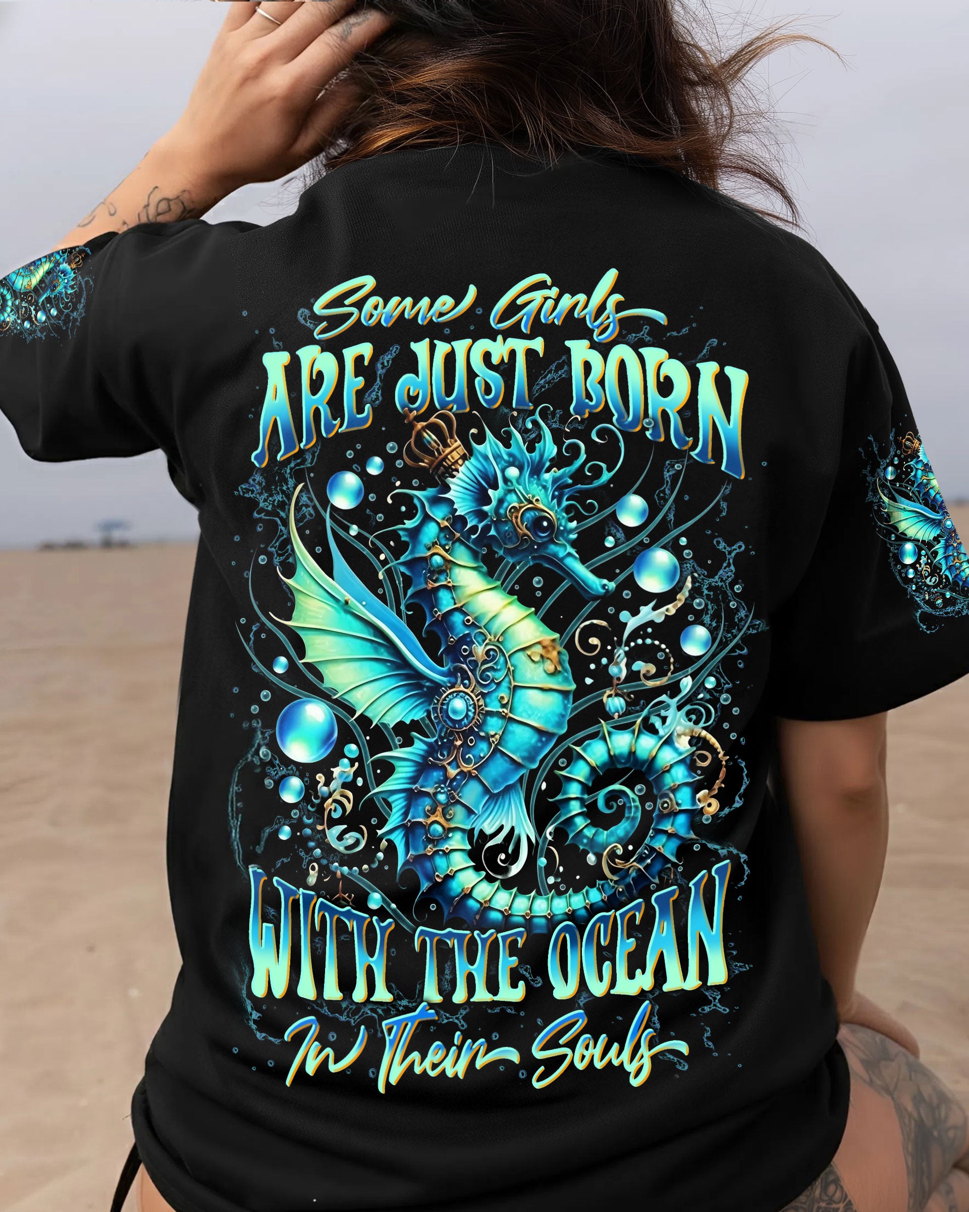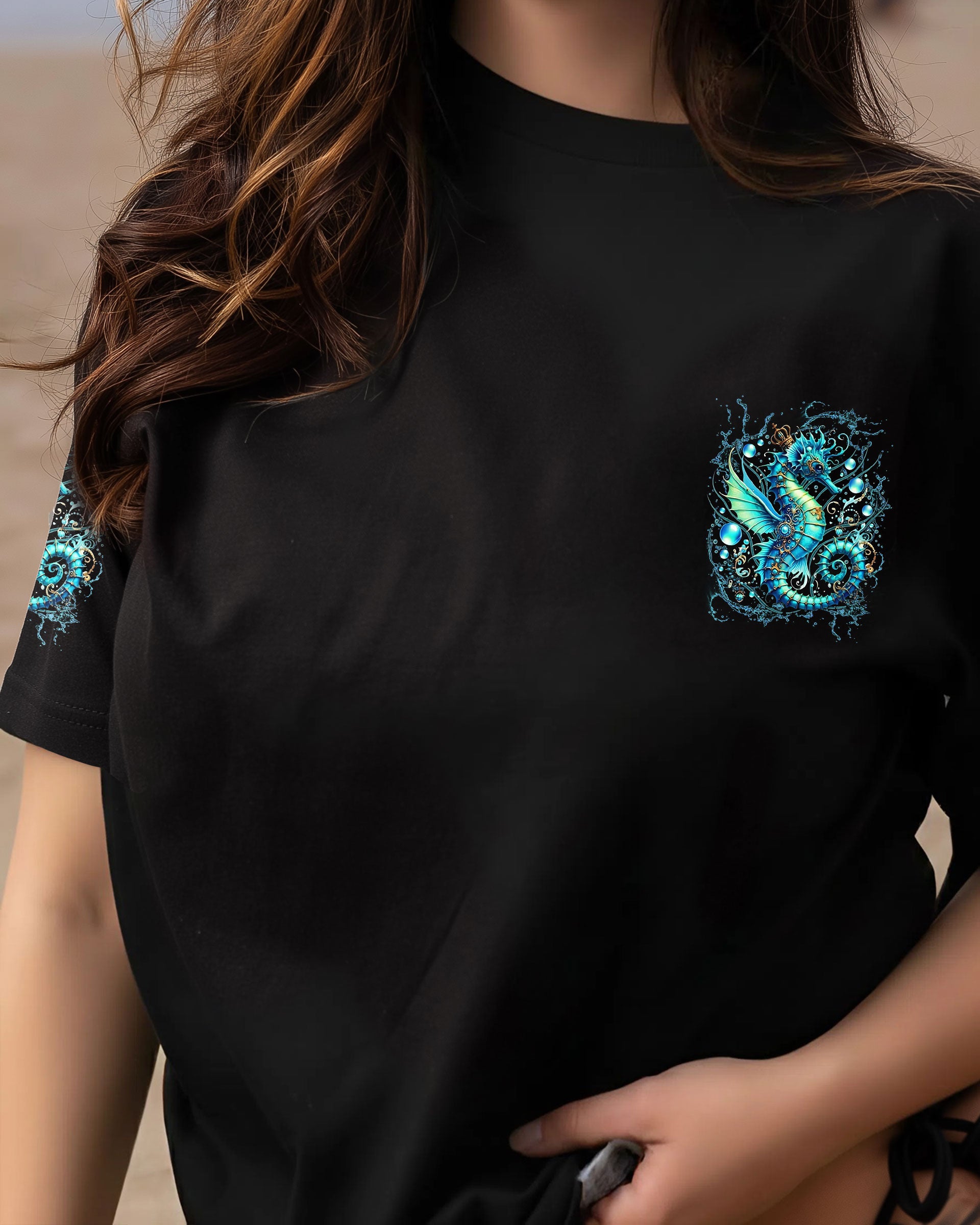 Dive into oceanic wonder with this enchanting all-over print design. A luminous turquoise seahorse takes center stage, surrounded by delicate bubbles and ethereal underwater light, creating a mesmerizing fantasy seascape. The accompanying quote honors women whose spirits flow with the ocean's rhythm—embodying its tranquility, resilience, and mystique. Perfect for those who feel the call of the sea and carry its magic within them, this design merges artistic sophistication with meaningful symbolism, transforming everyday wear into a wearable celebration of inner strength and natural grace.