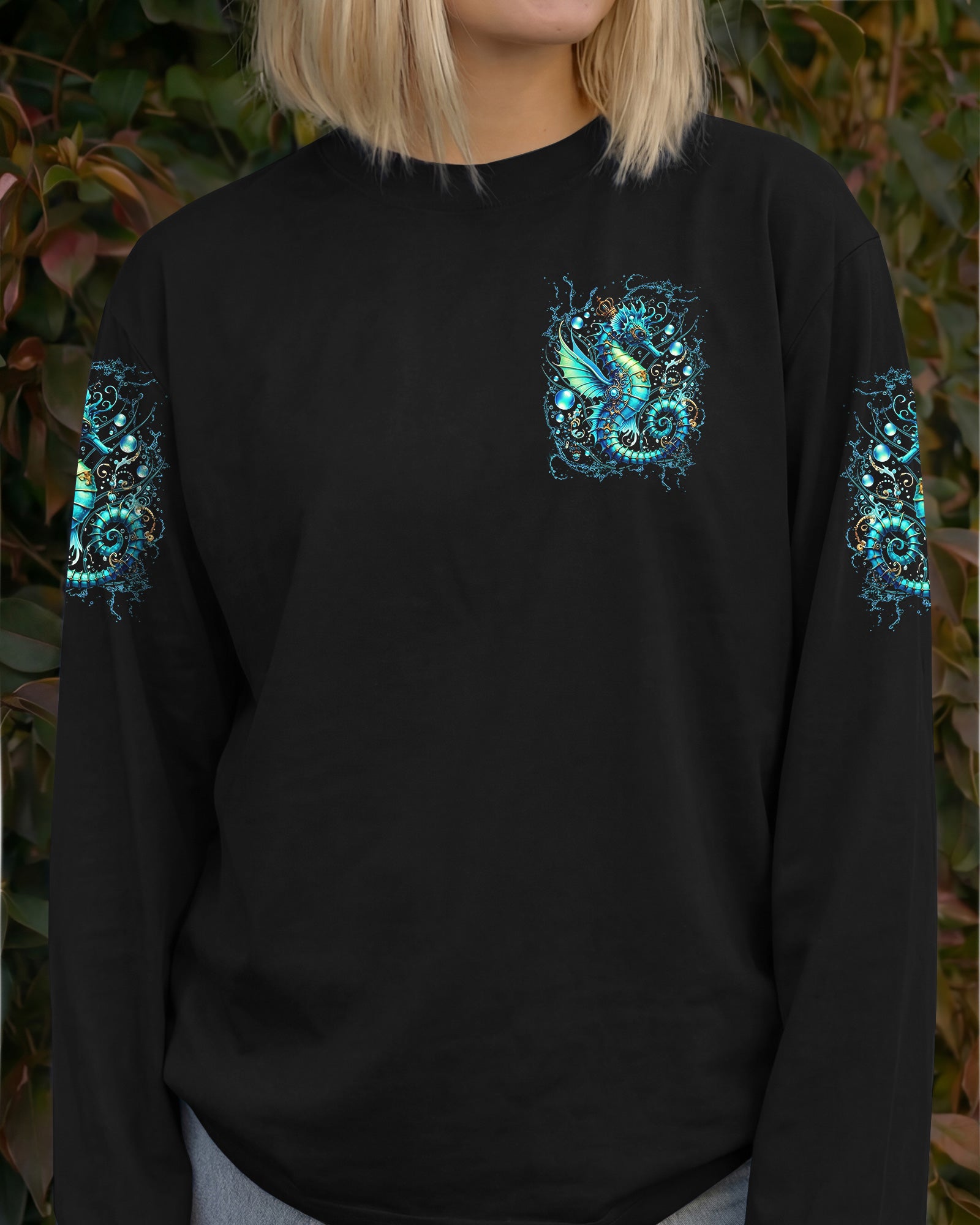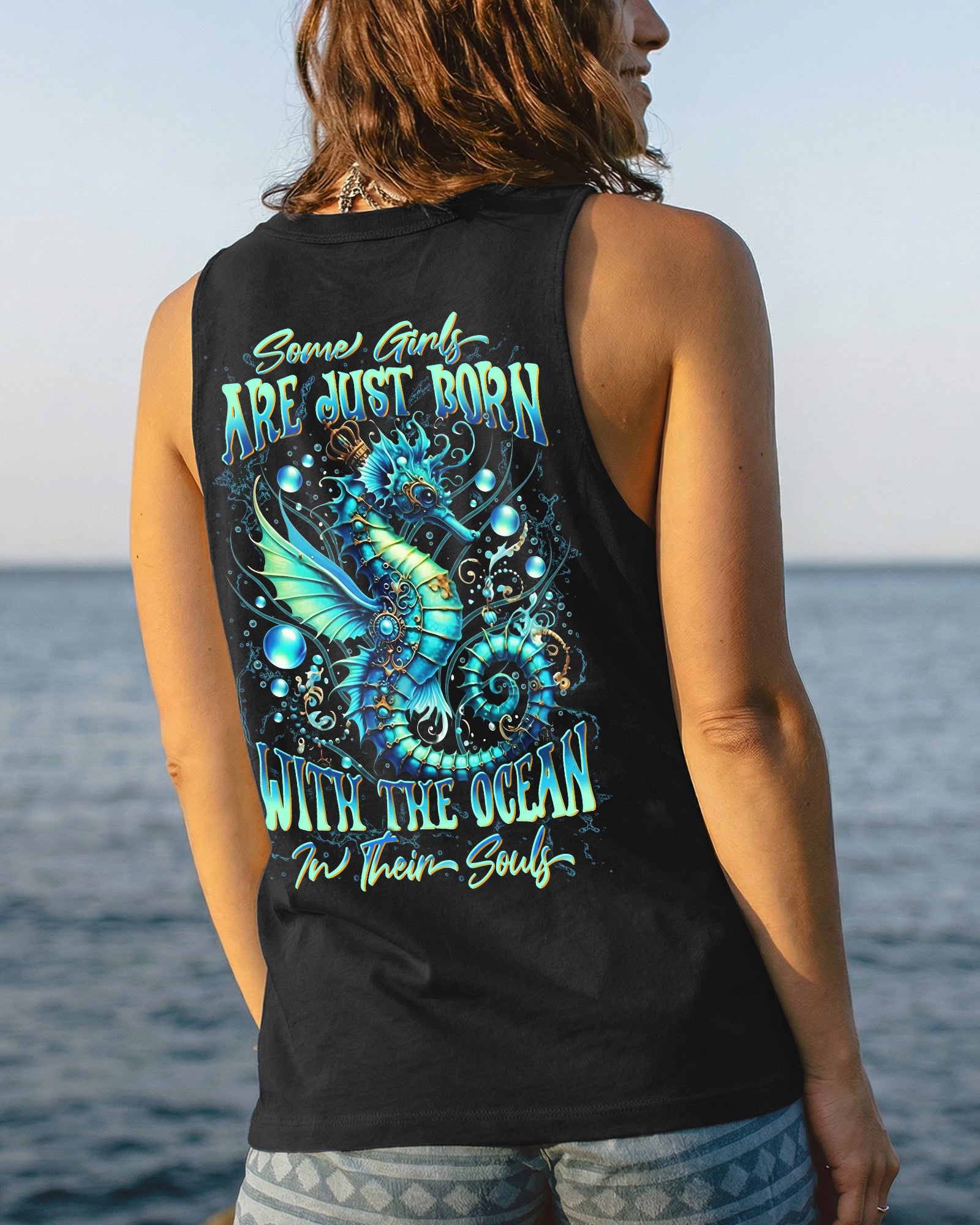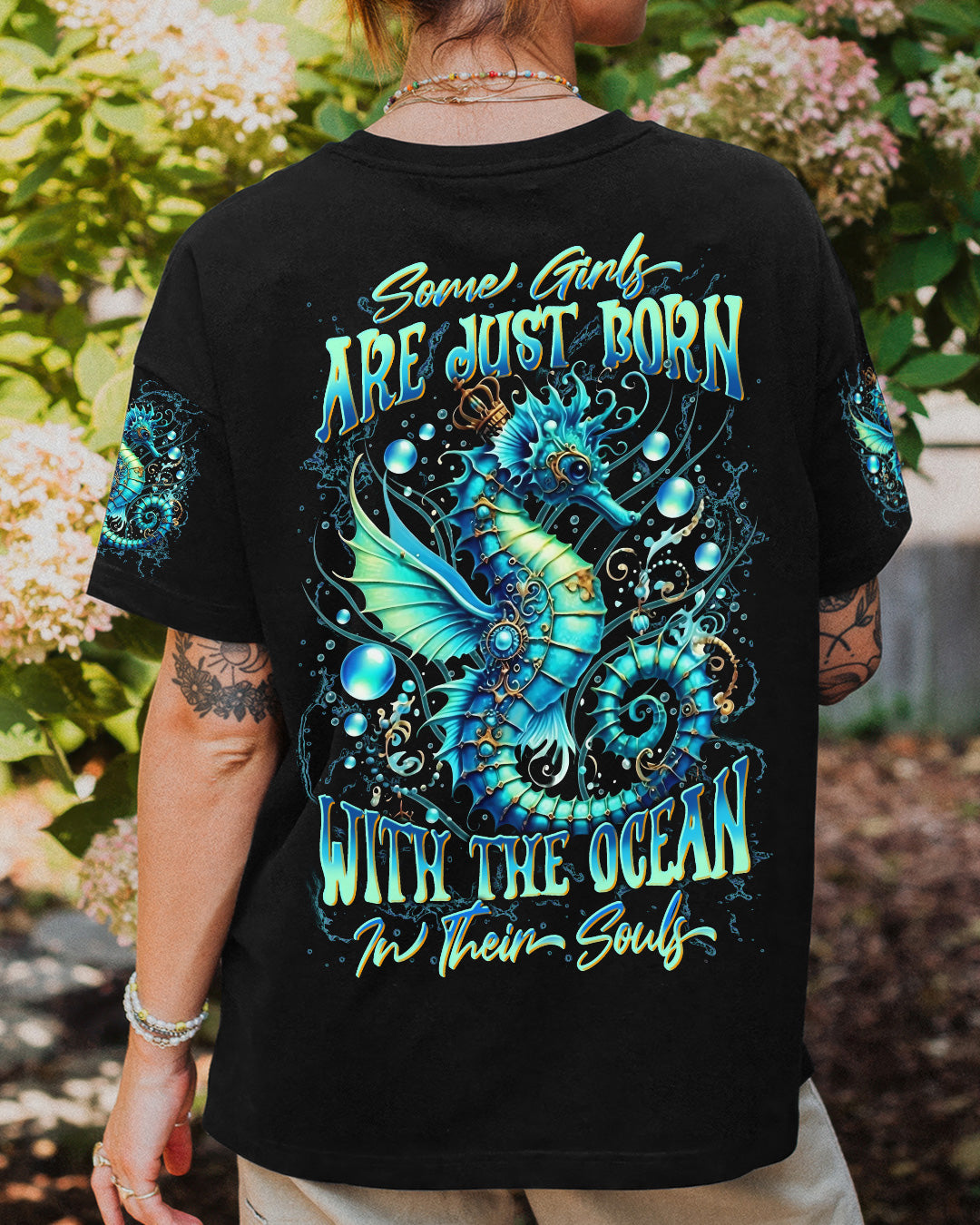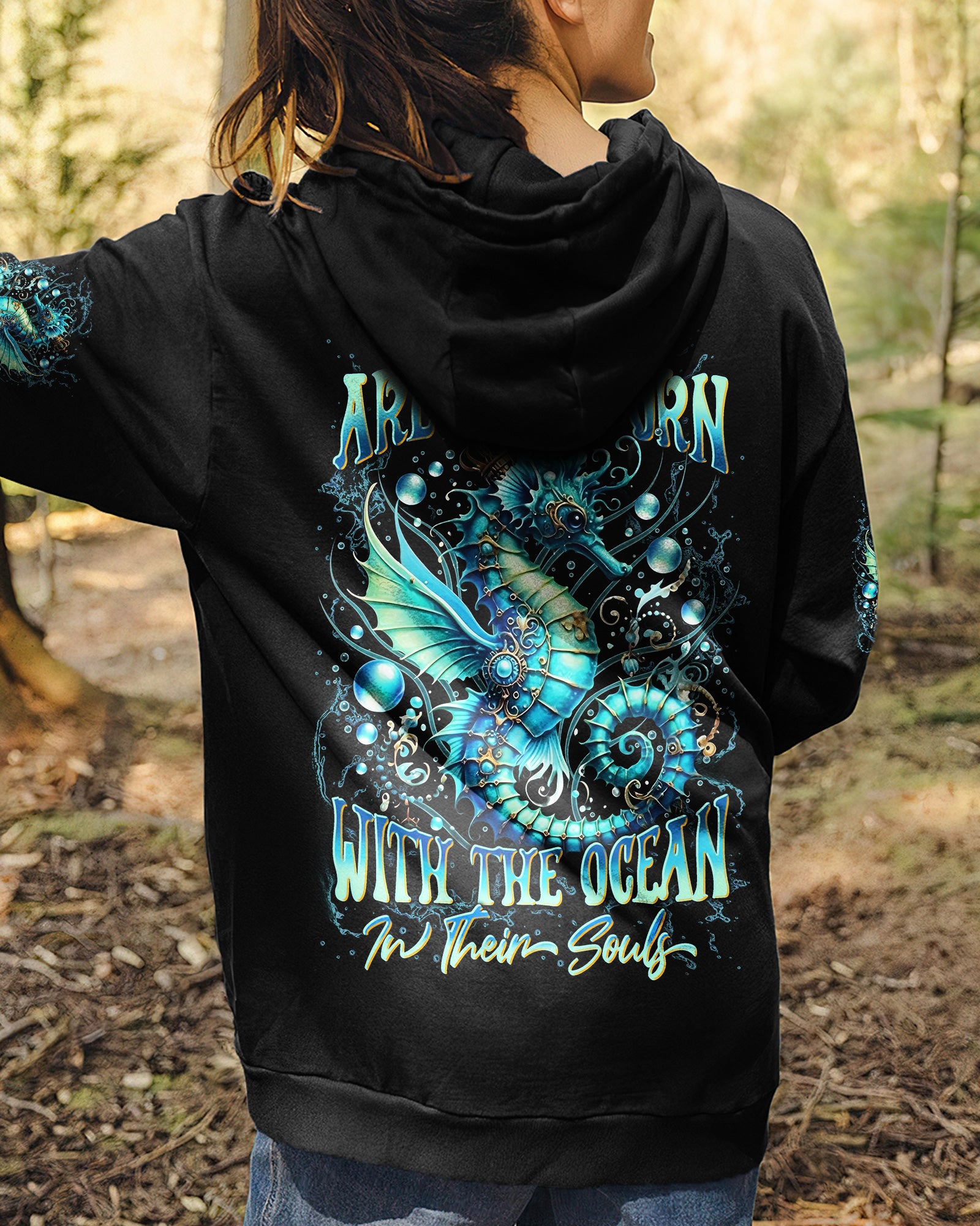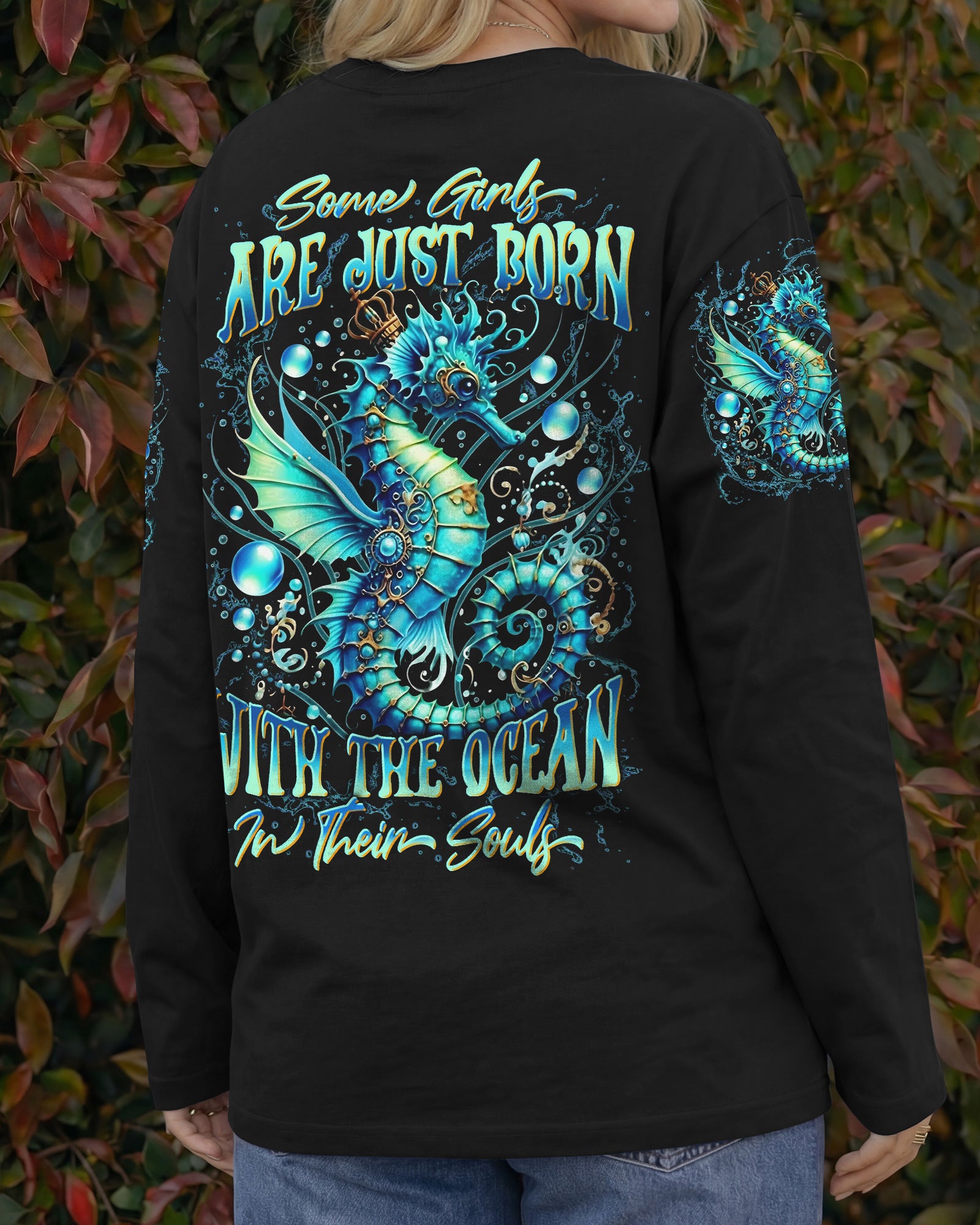 Dive into oceanic wonder with this enchanting all-over print design. A luminous turquoise seahorse takes center stage, surrounded by delicate bubbles and ethereal underwater light, creating a mesmerizing fantasy seascape. The accompanying quote honors women whose spirits flow with the ocean's rhythm—embodying its tranquility, resilience, and mystique. Perfect for those who feel the call of the sea and carry its magic within them, this design merges artistic sophistication with meaningful symbolism, transforming everyday wear into a wearable celebration of inner strength and natural grace.