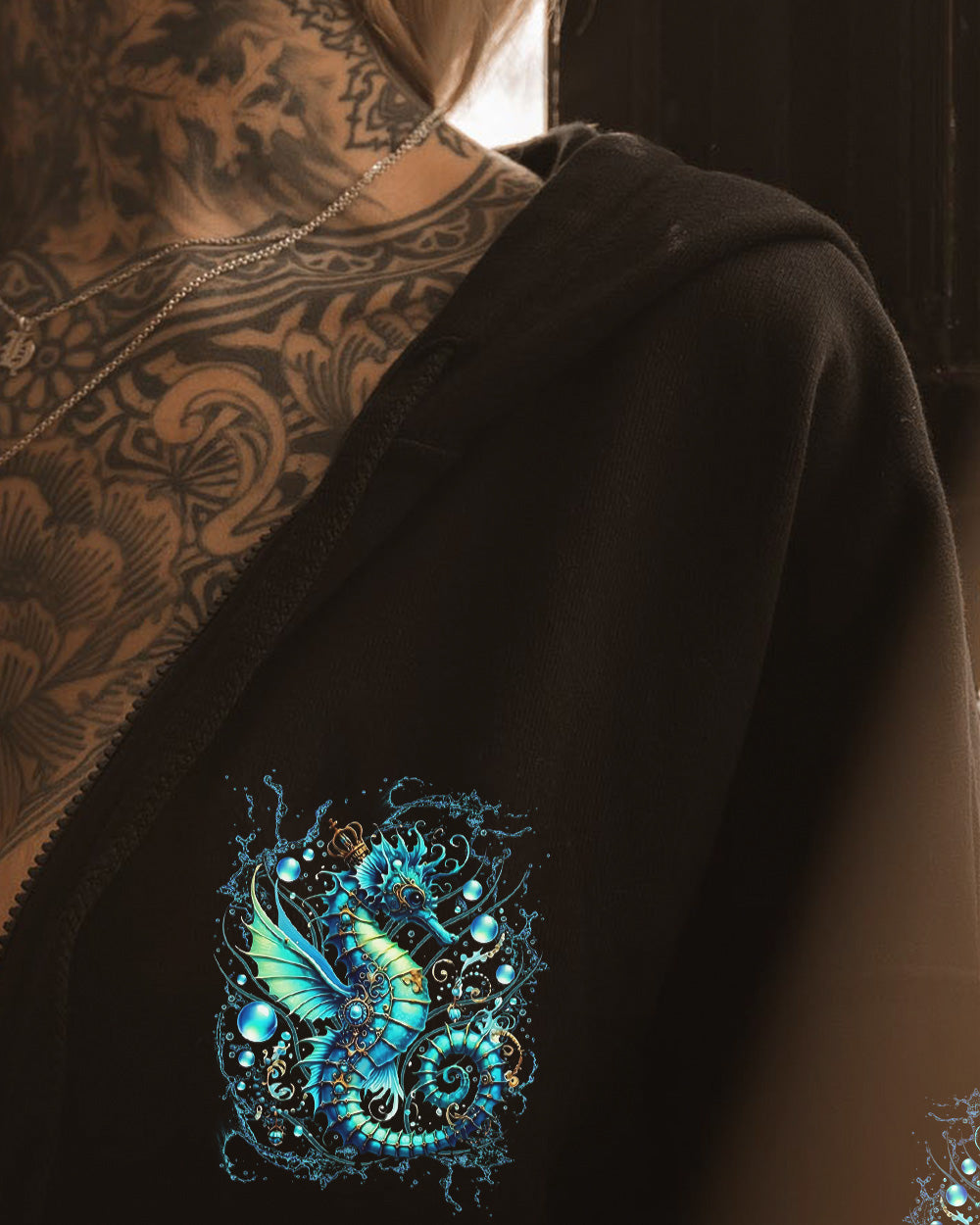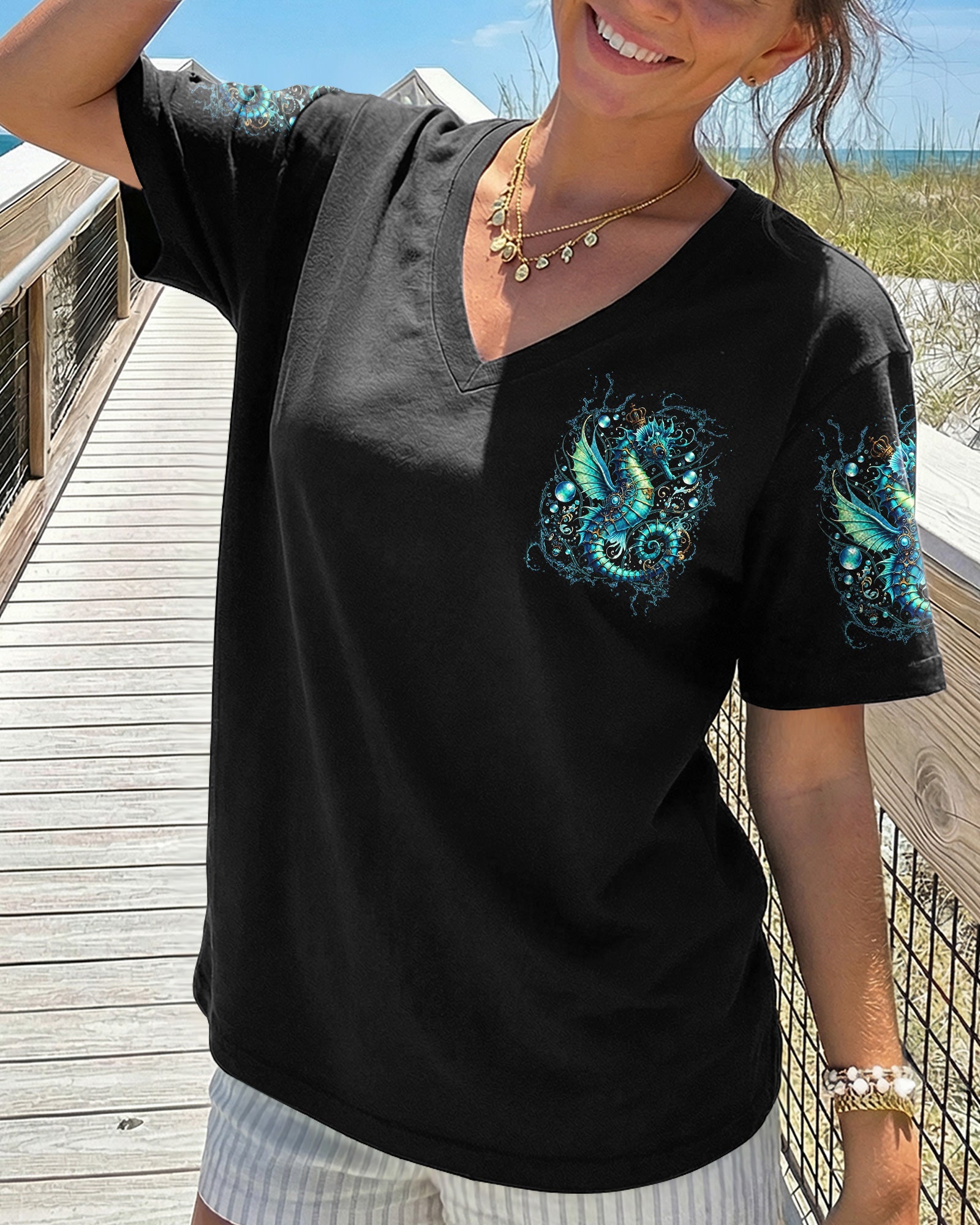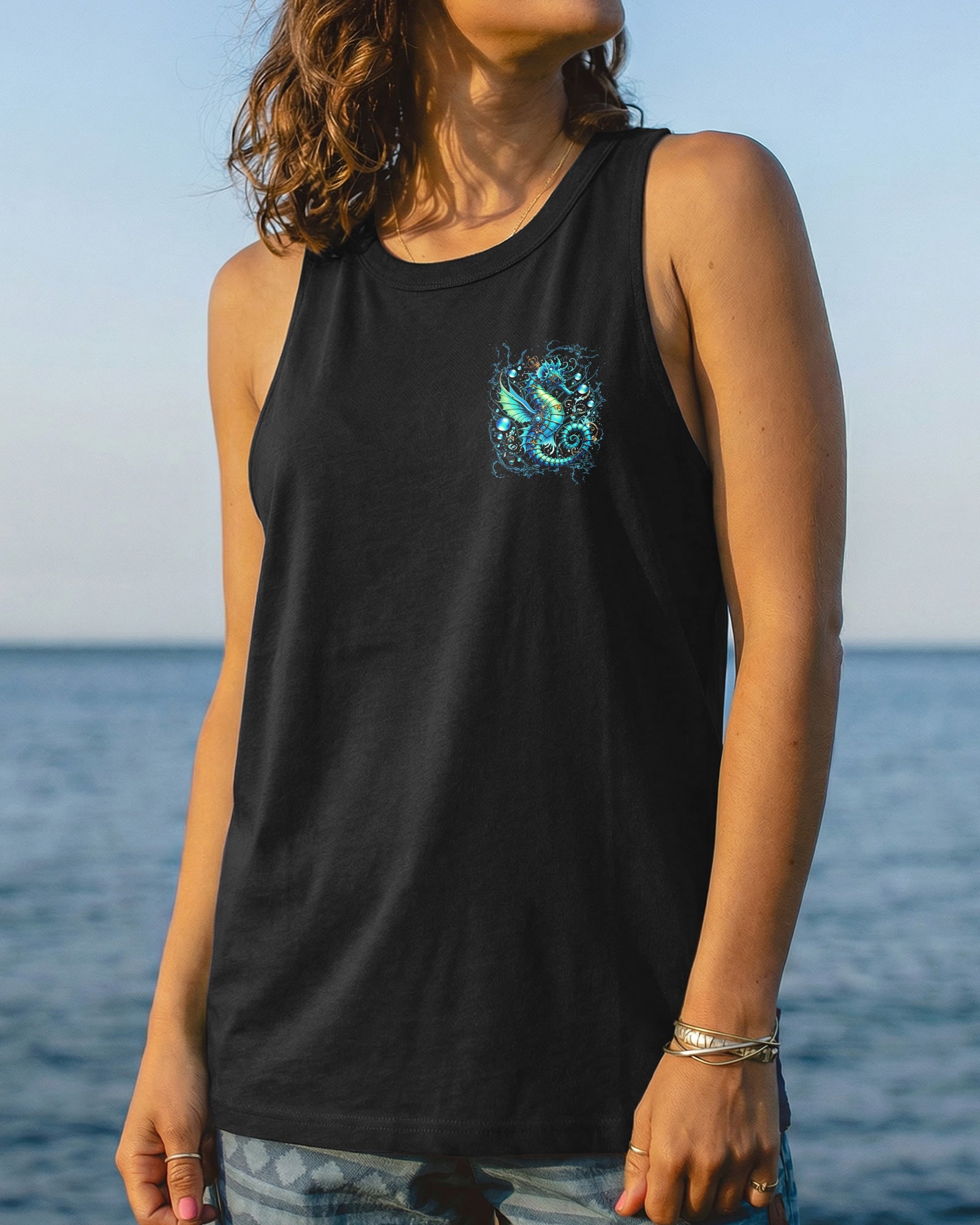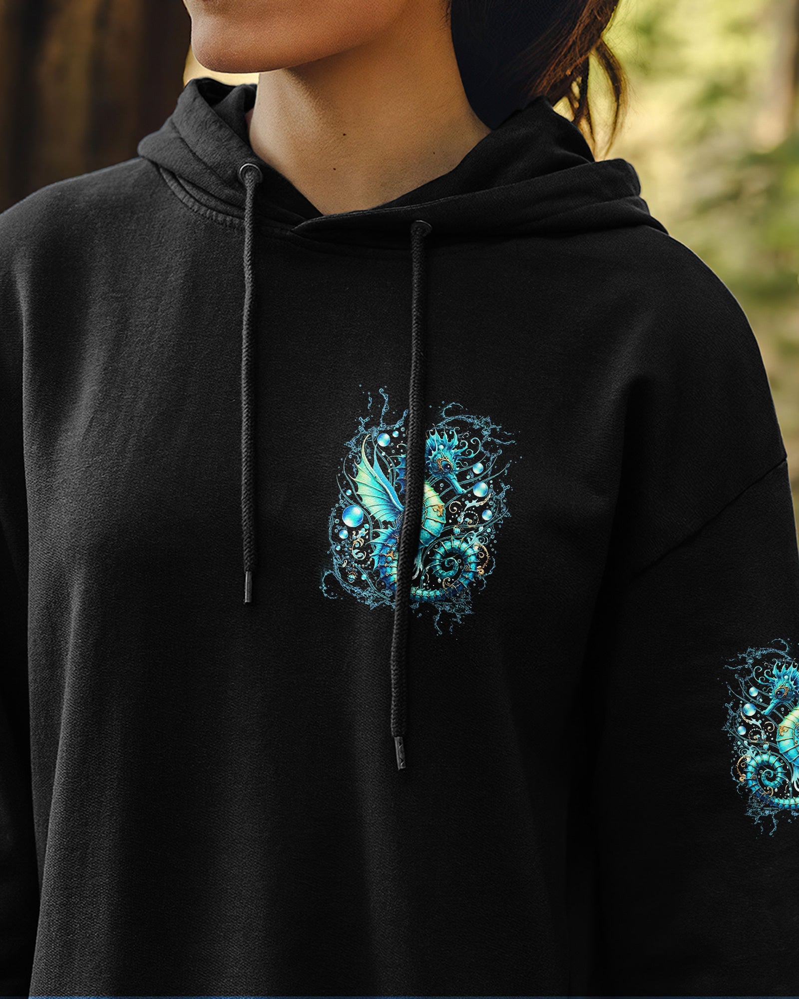 Dive into oceanic wonder with this enchanting all-over print design. A luminous turquoise seahorse takes center stage, surrounded by delicate bubbles and ethereal underwater light, creating a mesmerizing fantasy seascape. The accompanying quote honors women whose spirits flow with the ocean's rhythm—embodying its tranquility, resilience, and mystique. Perfect for those who feel the call of the sea and carry its magic within them, this design merges artistic sophistication with meaningful symbolism, transforming everyday wear into a wearable celebration of inner strength and natural grace.