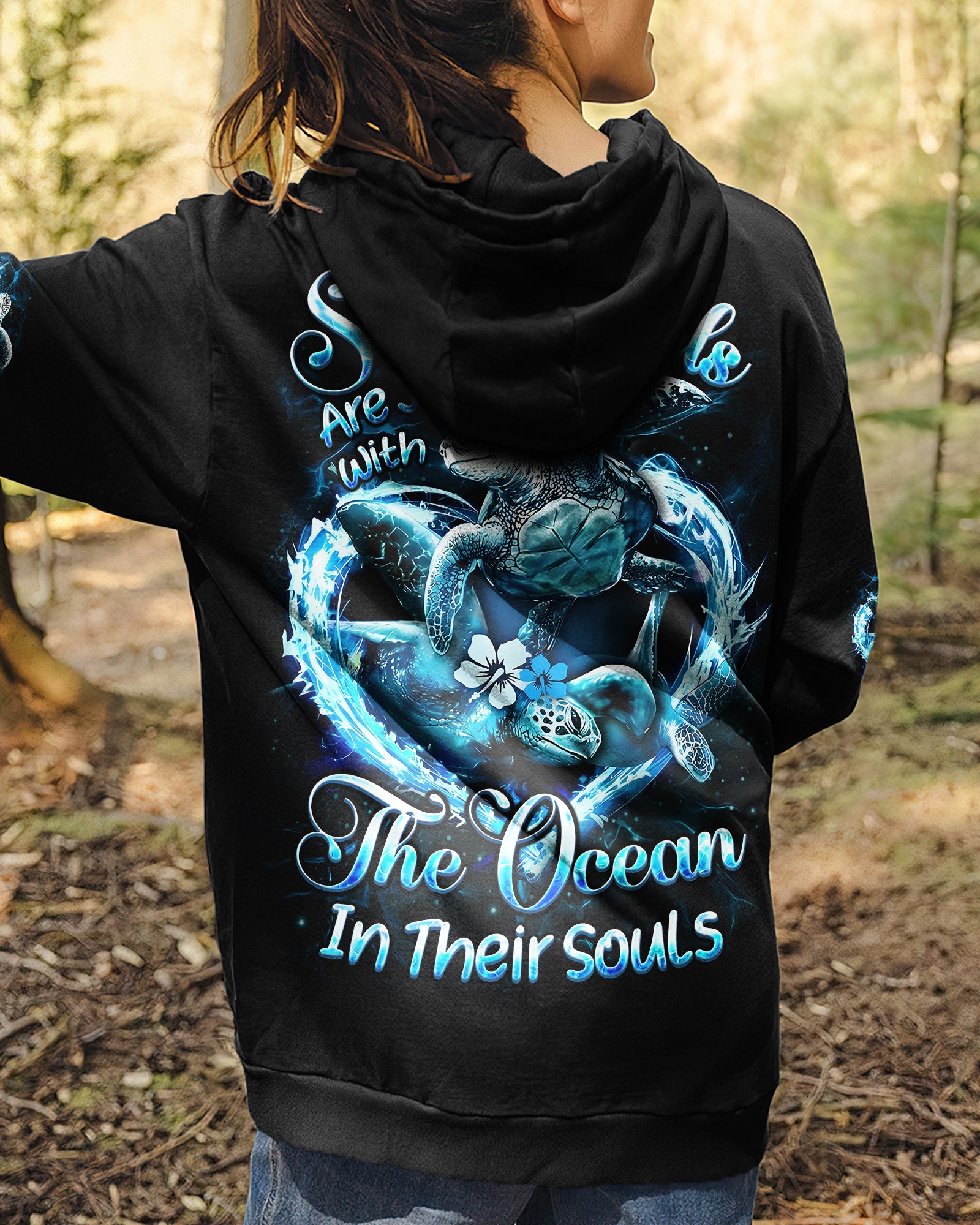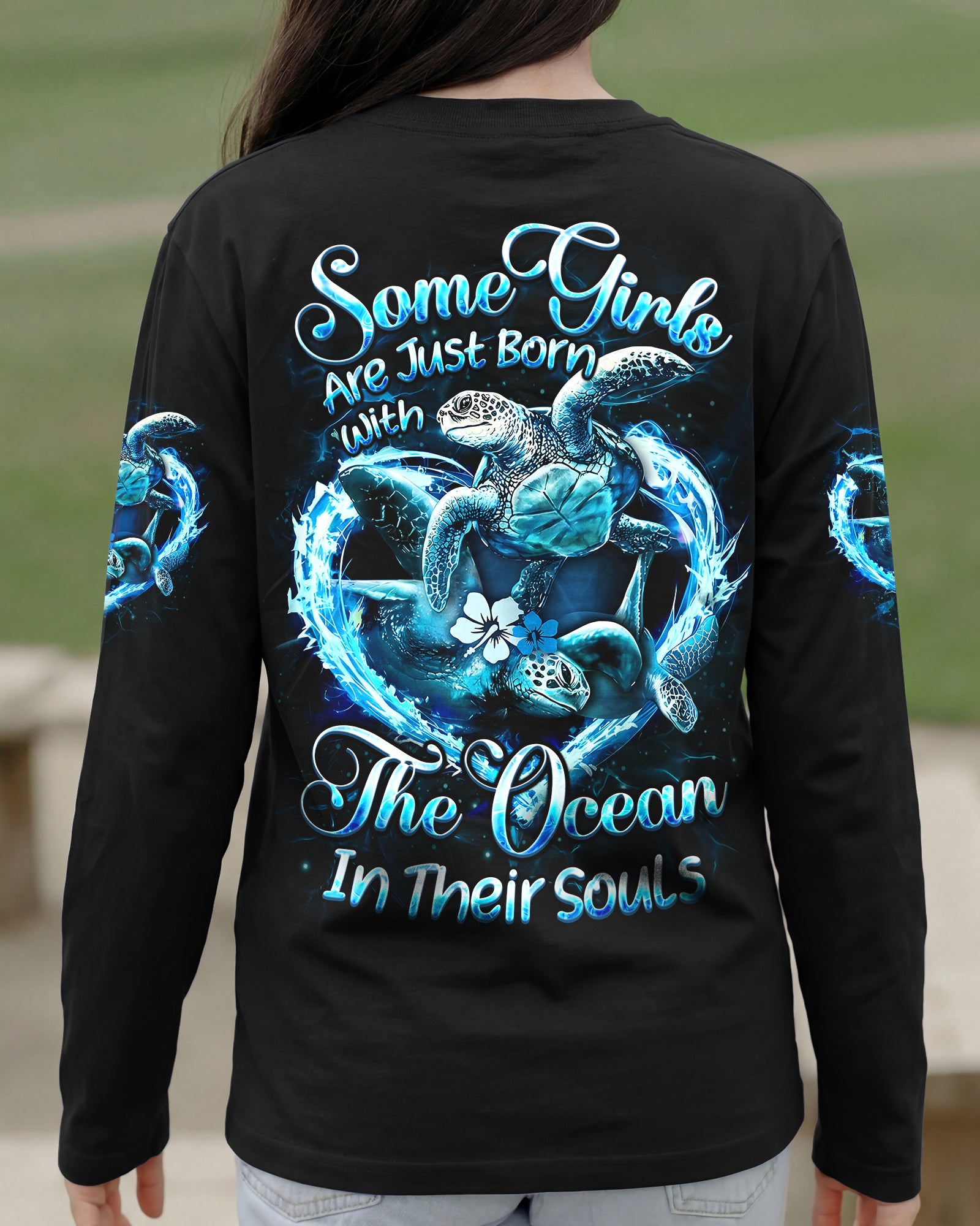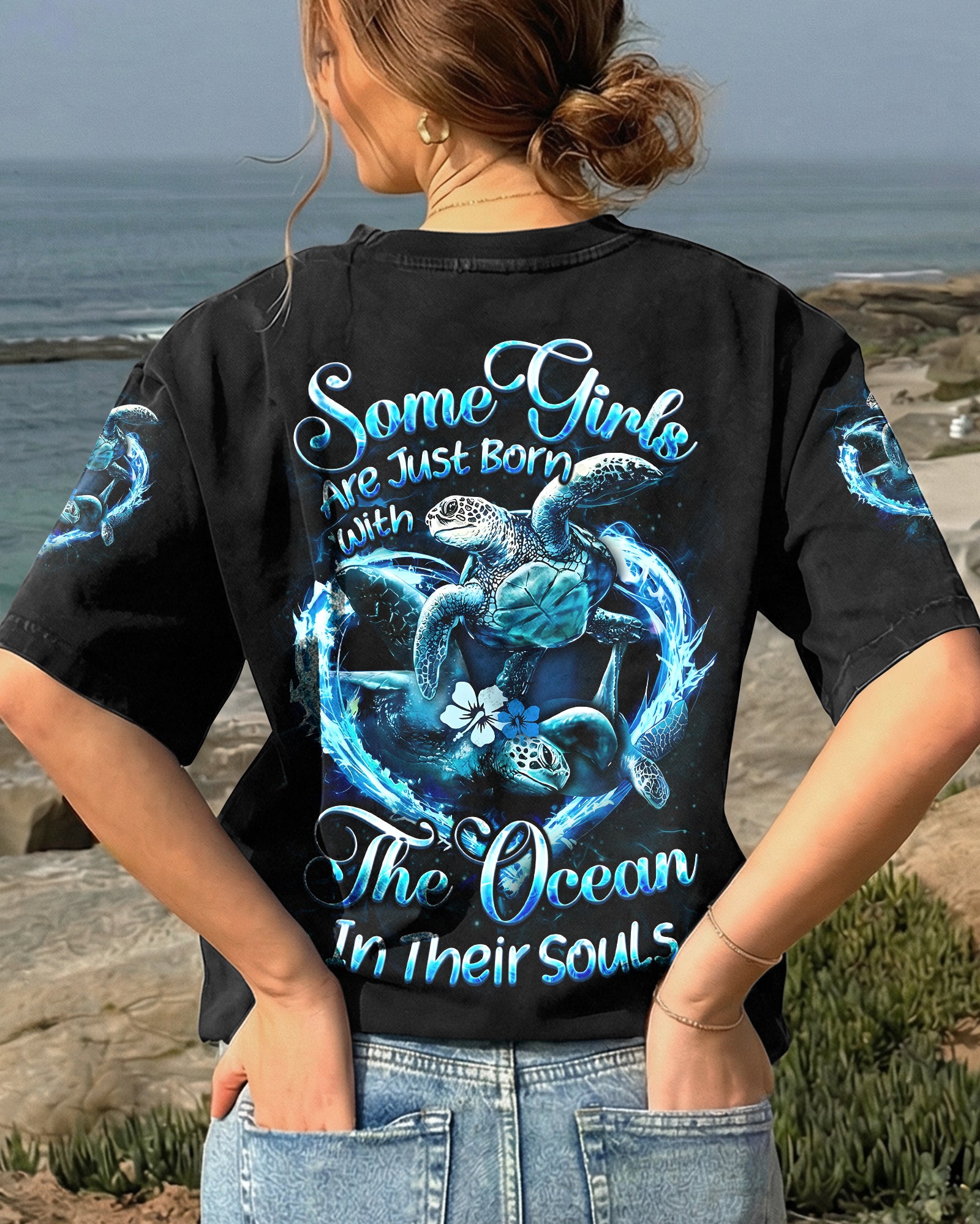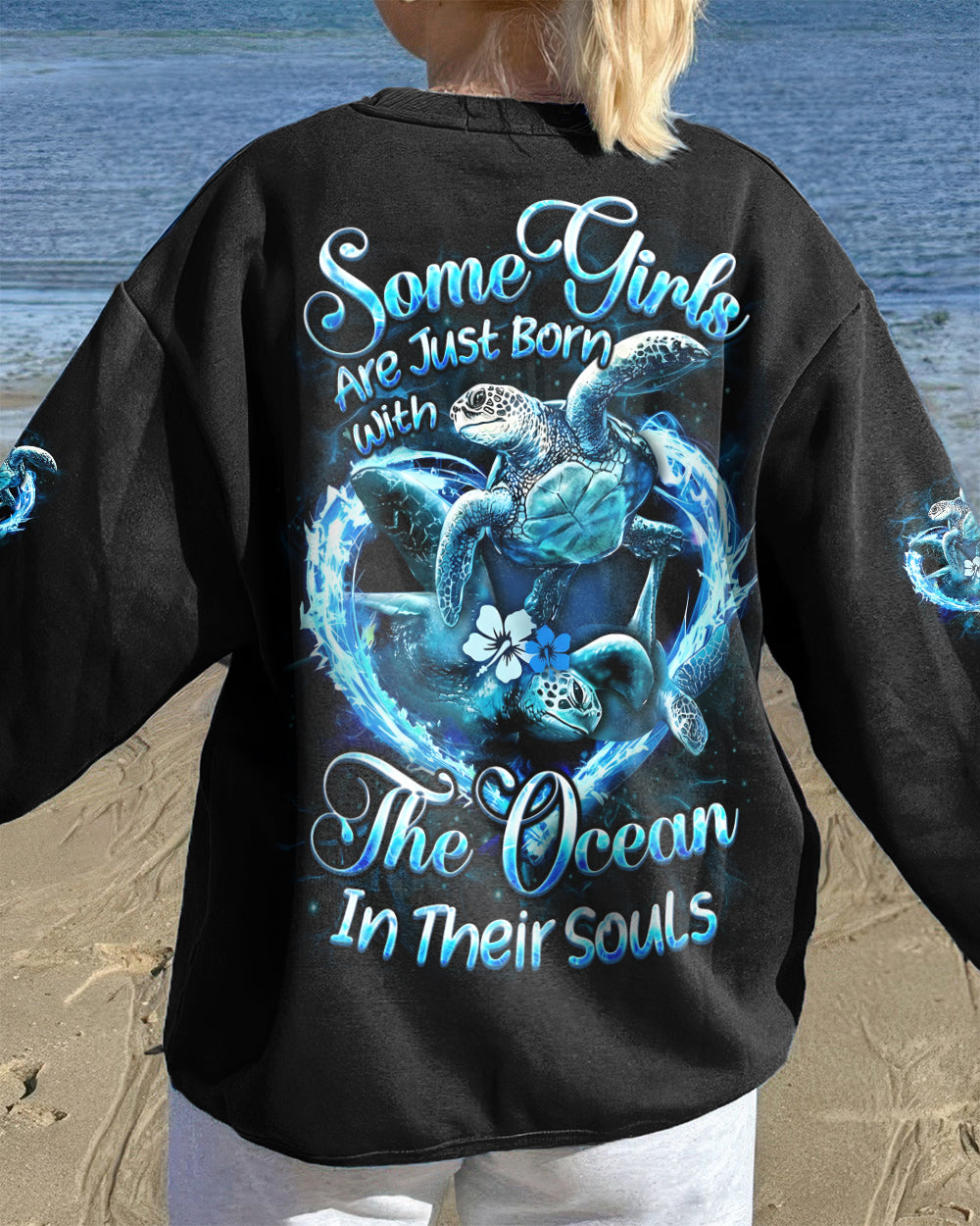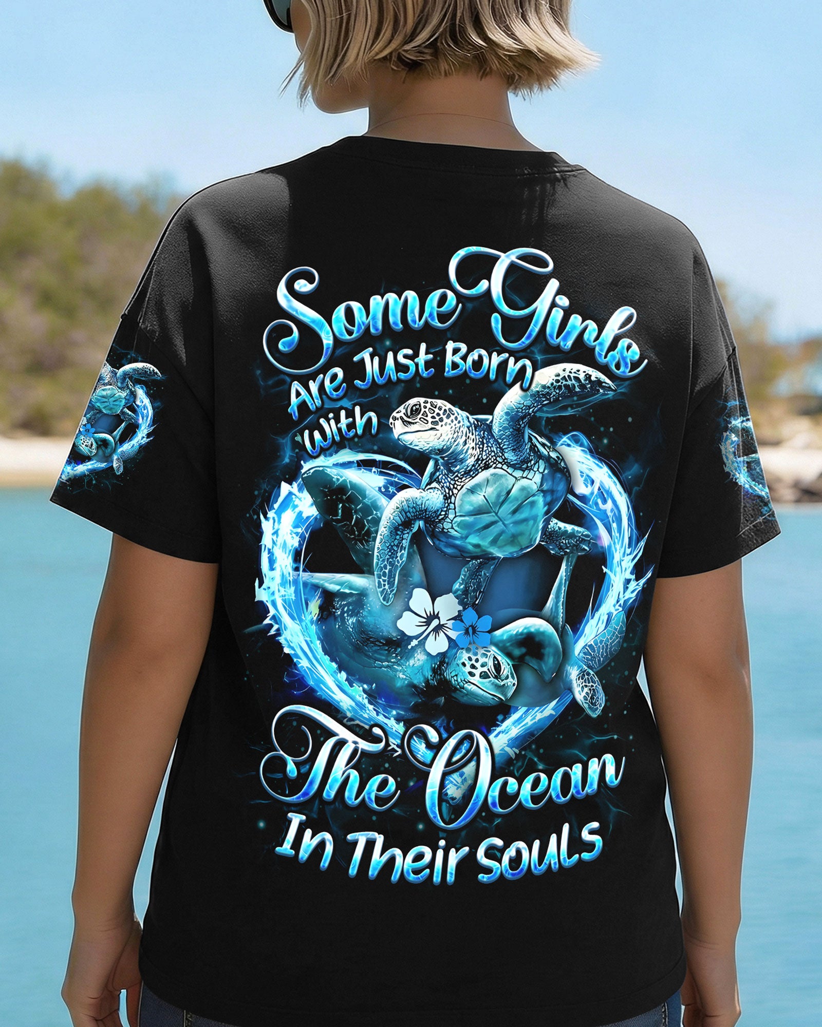 Embrace the spirit of the ocean with this all-over print design celebrating those who find their truest selves by the sea. Featuring graceful sea turtles, this piece honors patience, wisdom, and an intuitive connection to nature's rhythms. The design captures the duality of ocean souls—serene on the surface yet profoundly powerful within. Perfect for anyone whose heart belongs to the waves and whose spirit resonates with the endless blue. A wearable tribute to those born with the ocean in their soul.
