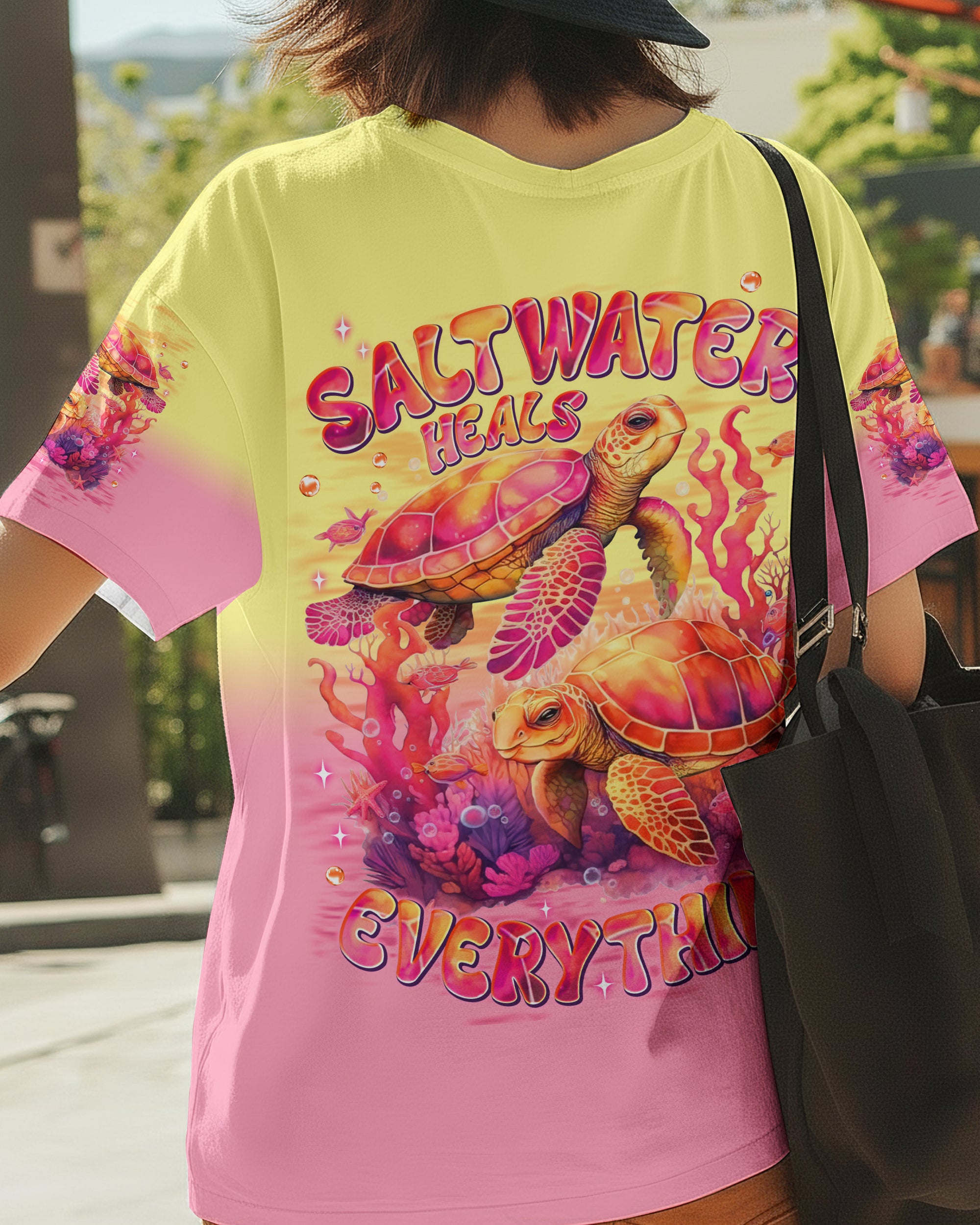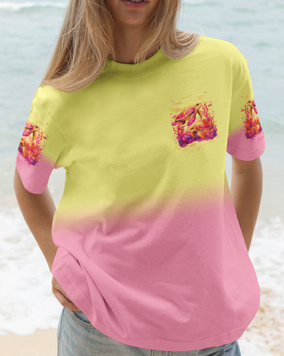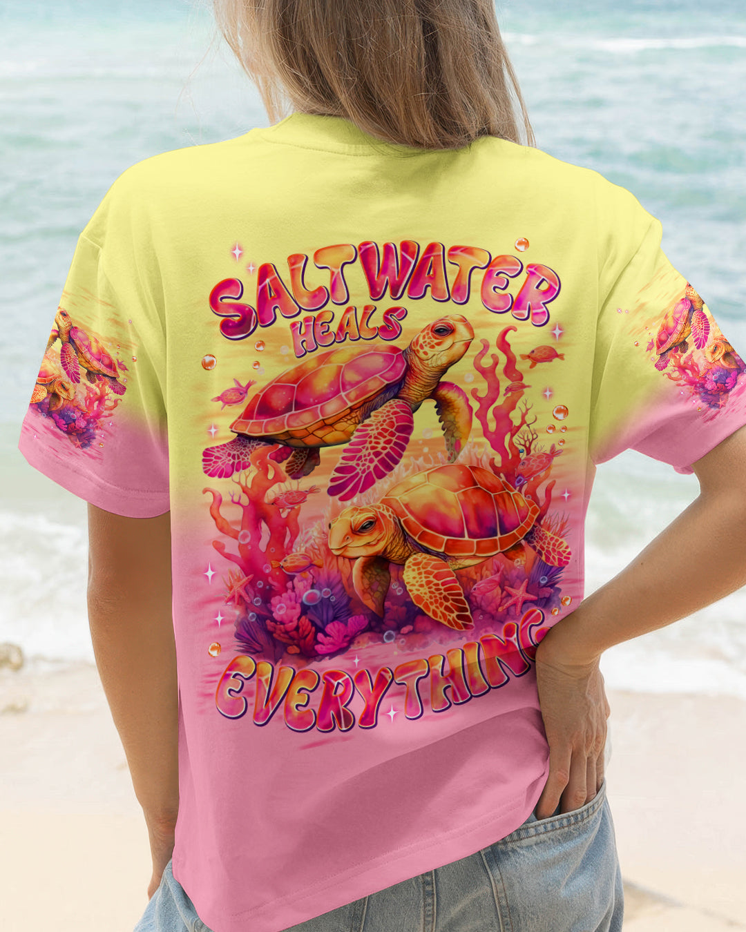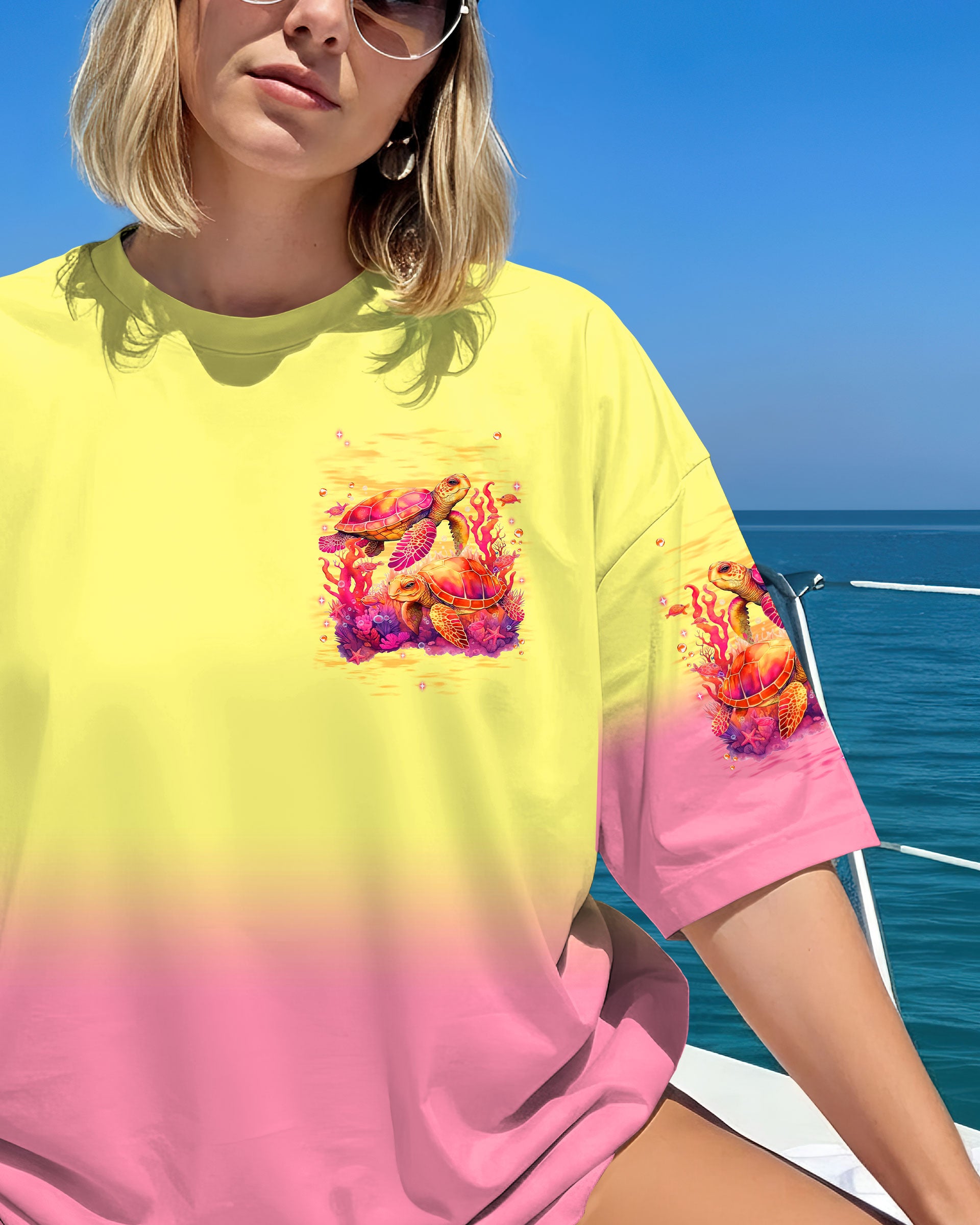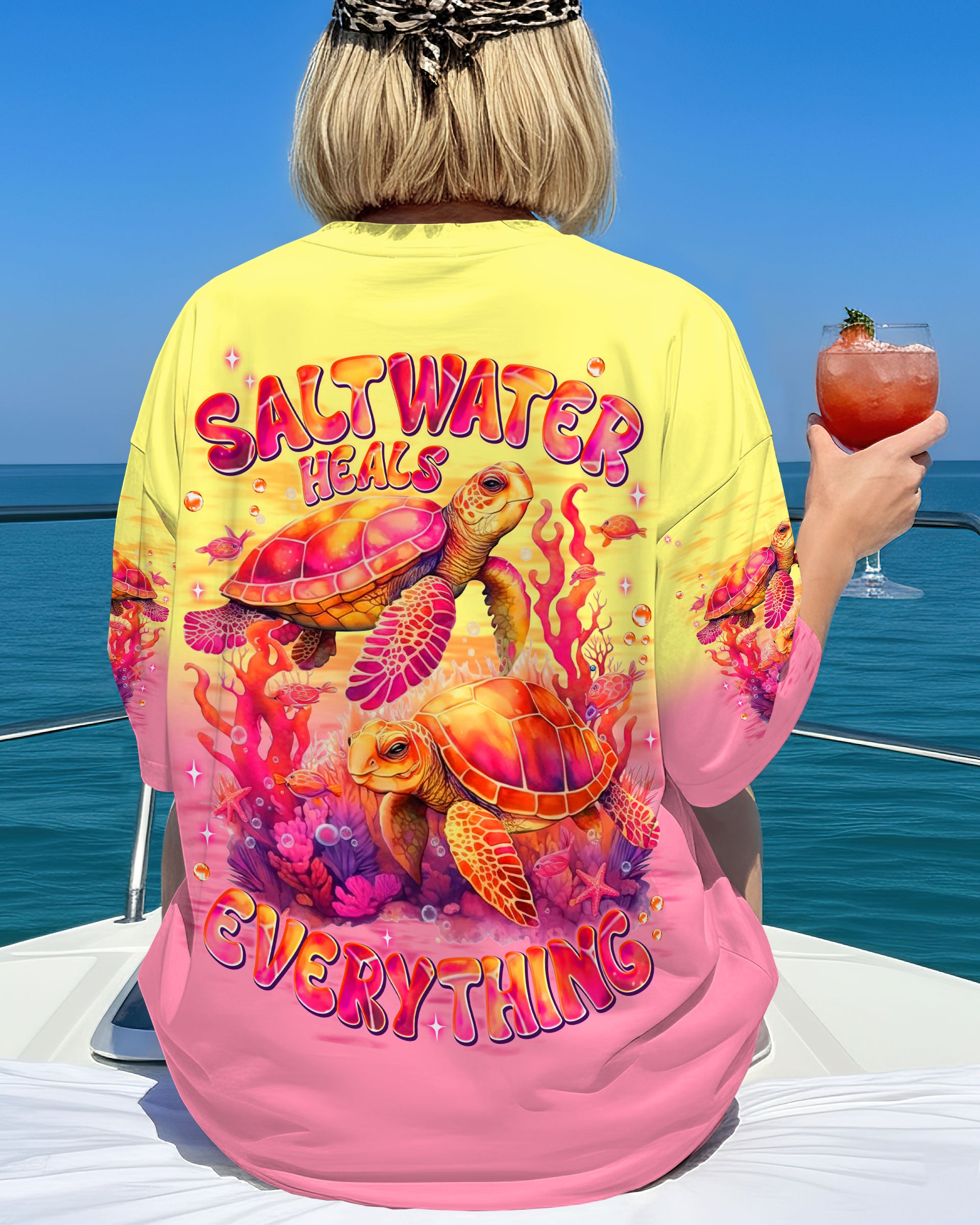 Immerse yourself in the therapeutic essence of the ocean with this all-over print design featuring two graceful turtles gliding through vibrant coral reefs. Rendered in soft marine hues with flowing, dynamic motion, this piece captures the restorative power of saltwater and coastal living. The composition evokes a profound sense of calm and balance, reminding wearers that the sea possesses an innate ability to dissolve stress, facilitate healing, and awaken inner peace. Ideal for those who draw strength and solace from ocean environments, this design celebrates the transformative connection between salt air, endless horizons, and personal renewal.