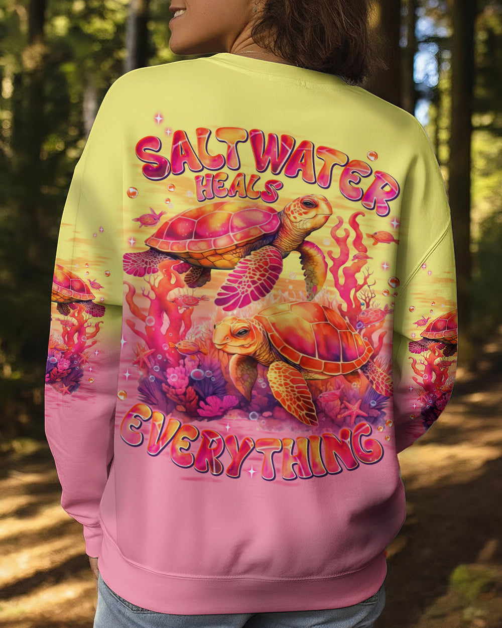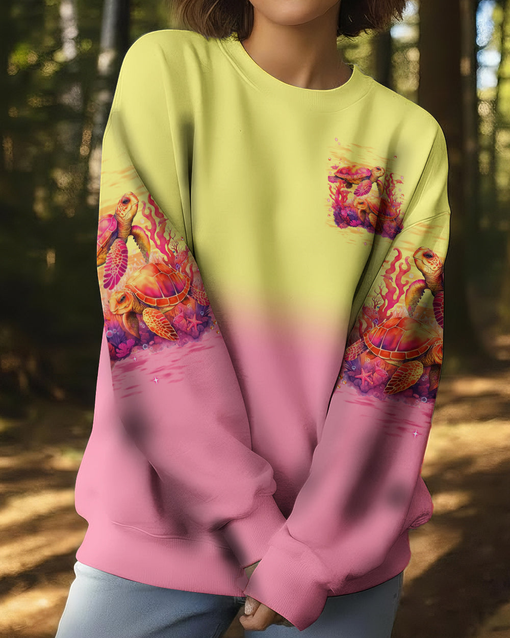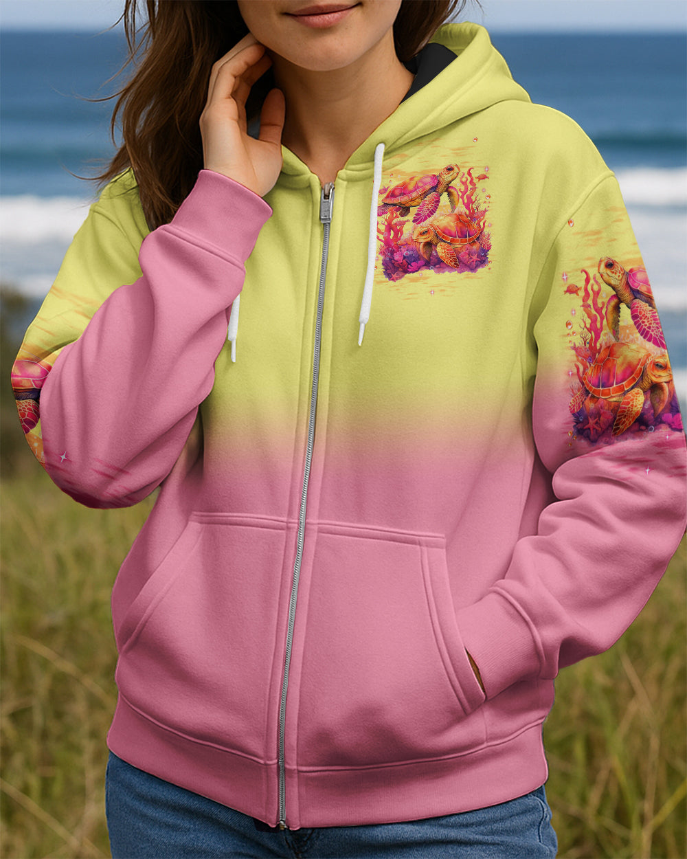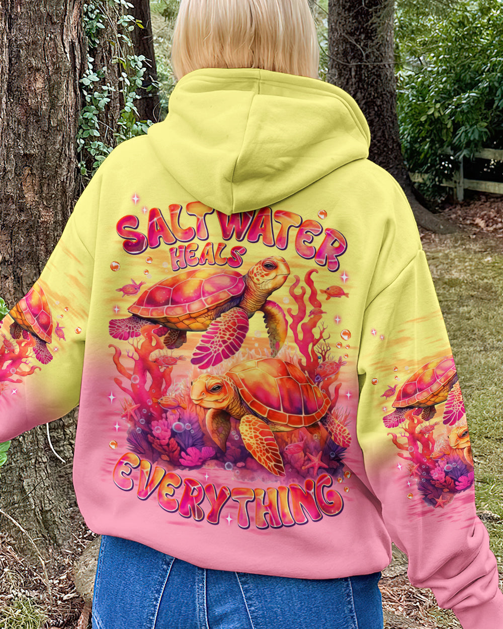 Immerse yourself in the therapeutic essence of the ocean with this all-over print design featuring two graceful turtles gliding through vibrant coral reefs. Rendered in soft marine hues with flowing, dynamic motion, this piece captures the restorative power of saltwater and coastal living. The composition evokes a profound sense of calm and balance, reminding wearers that the sea possesses an innate ability to dissolve stress, facilitate healing, and awaken inner peace. Ideal for those who draw strength and solace from ocean environments, this design celebrates the transformative connection between salt air, endless horizons, and personal renewal.